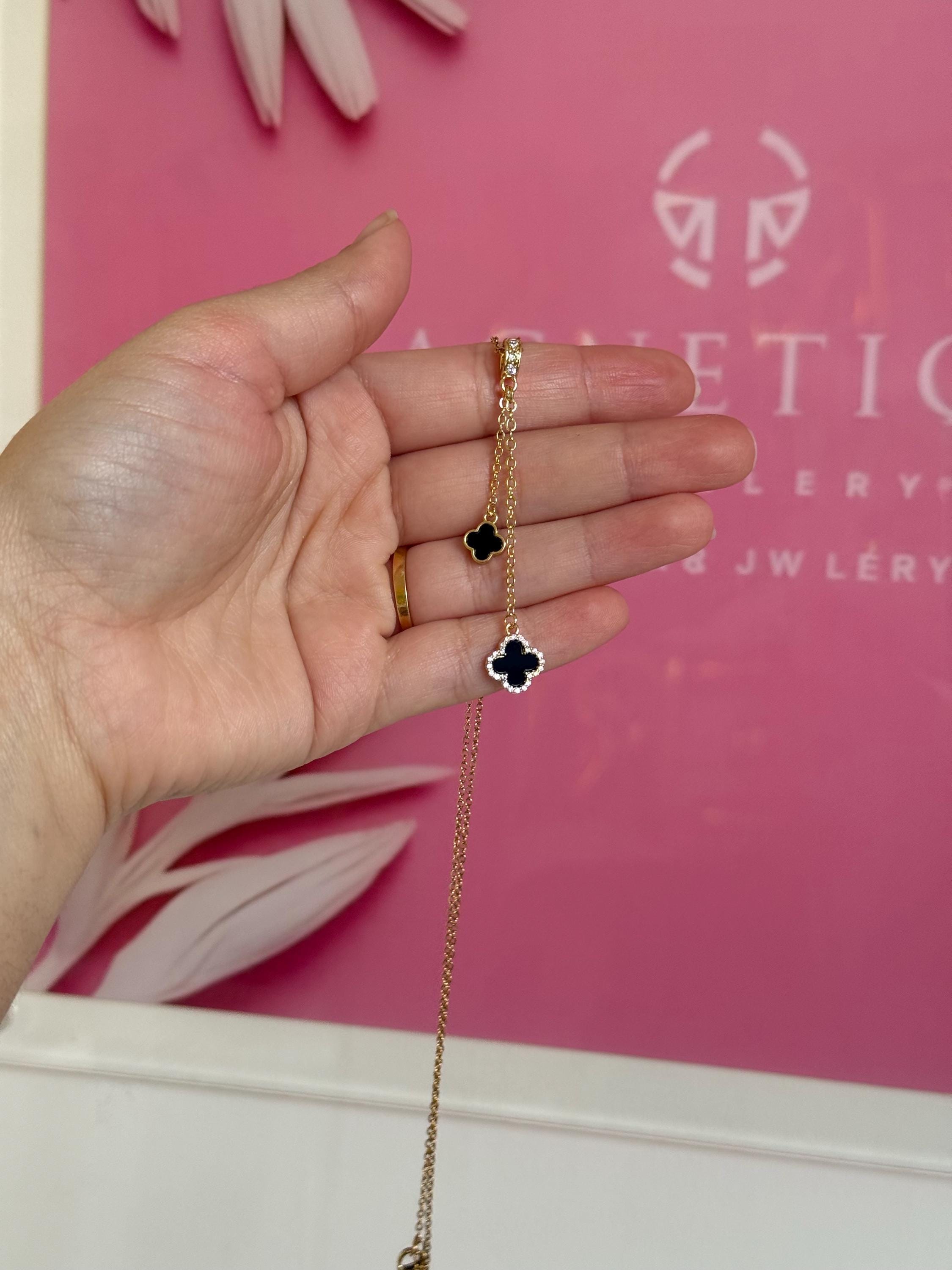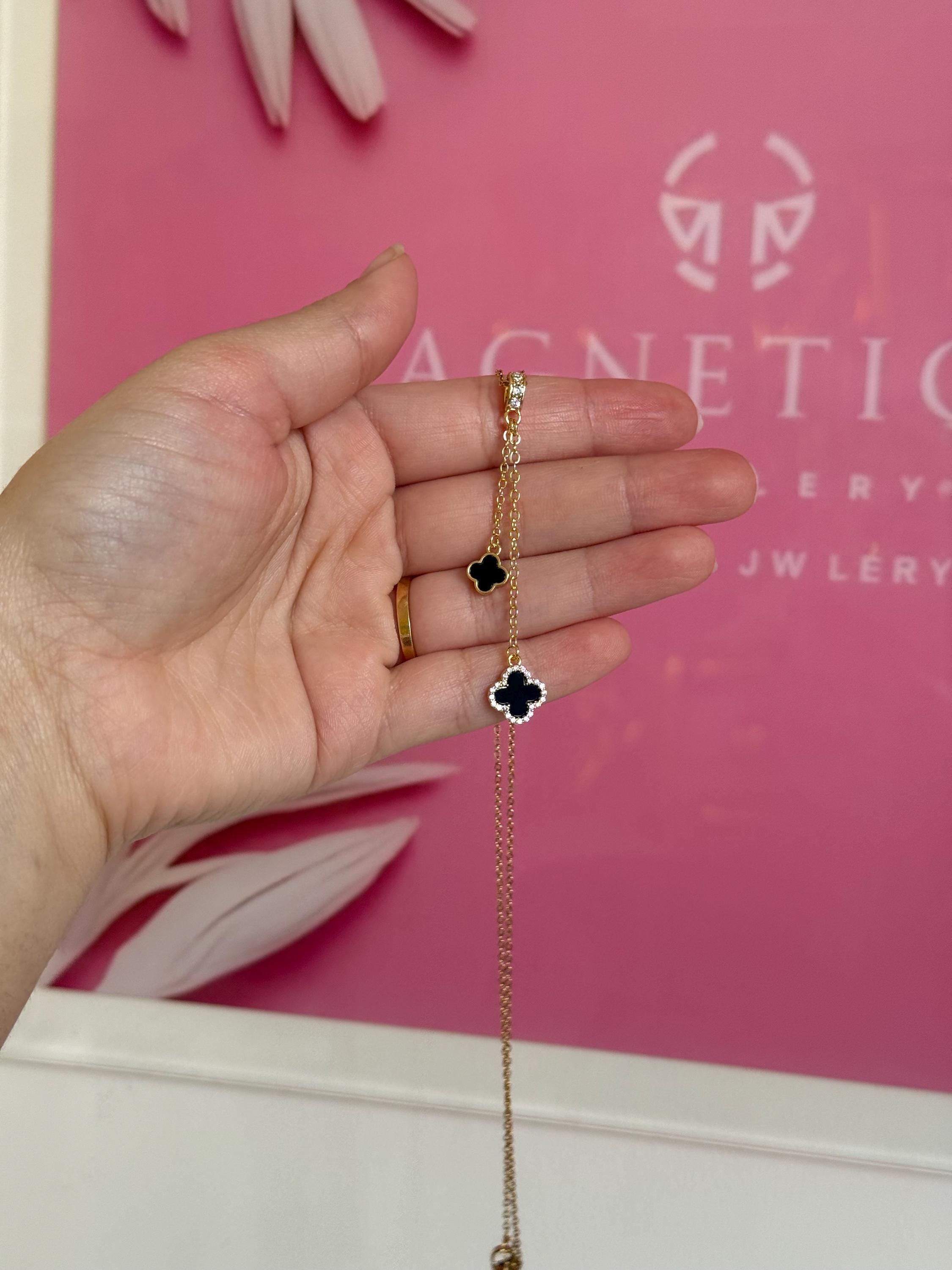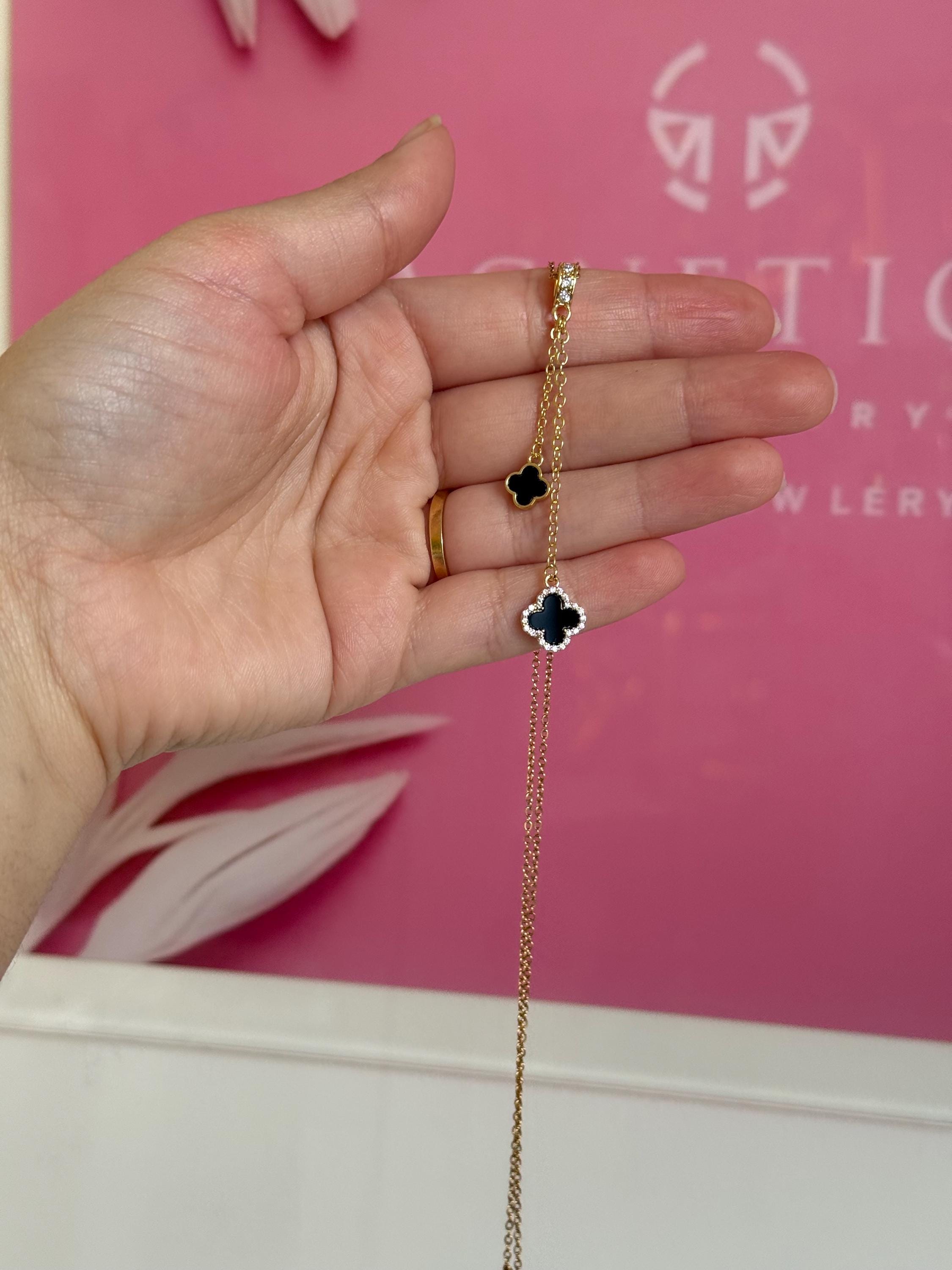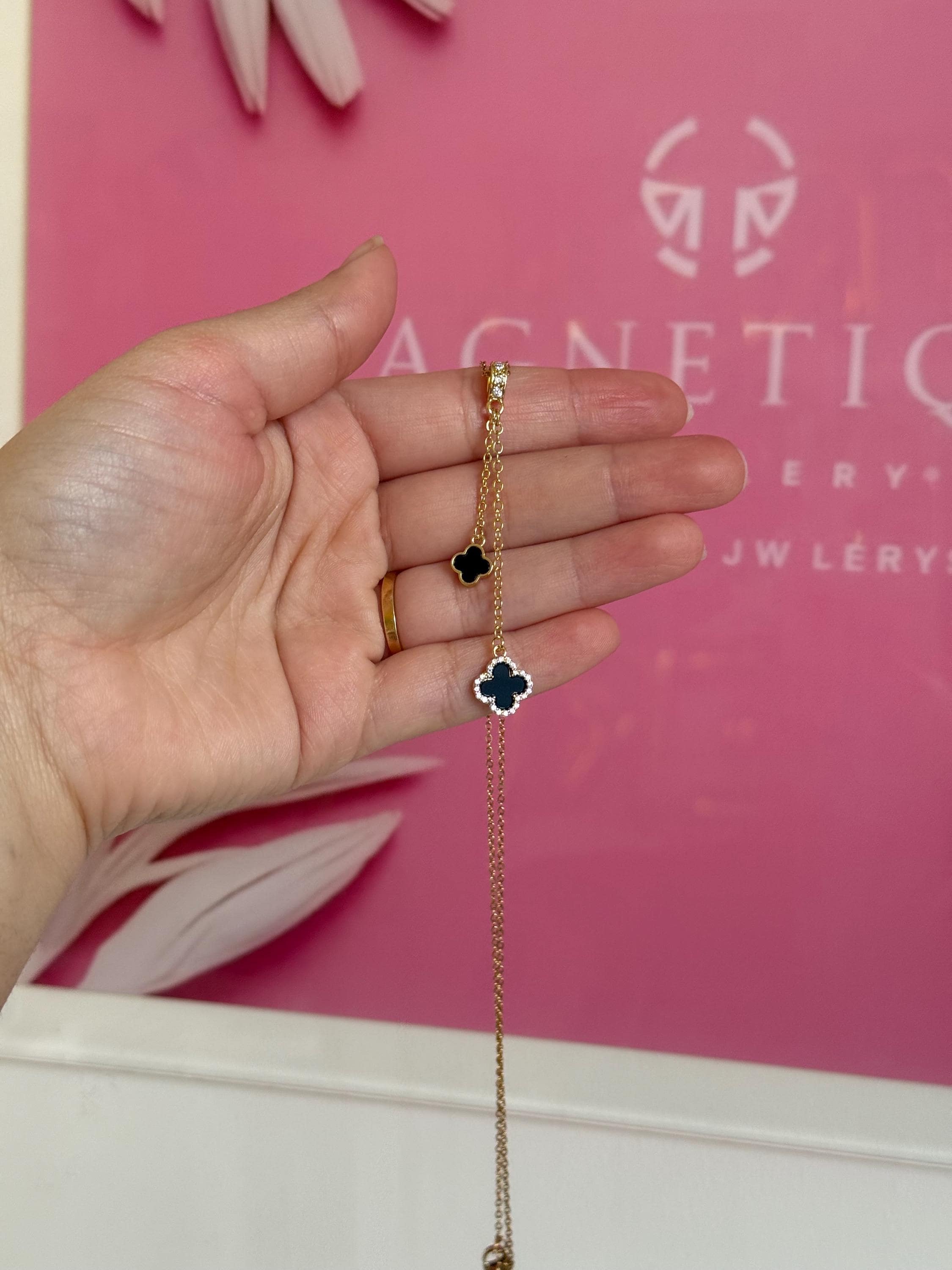 Discover the elegance of the Gold Tone Stainless Steel Double Clover Necklace with a Black Enamel Pendant, a perfect lucky charm jewel to elevate any outfit. This stunning necklace features two delicate four-leaf clovers suspended on a sleek gold-tone stainless steel chain, blending modern minimalism with timeless sophistication. The black enamel inlay adds a touch of bold contrast, making it a versatile piece for both everyday wear and special occasions.