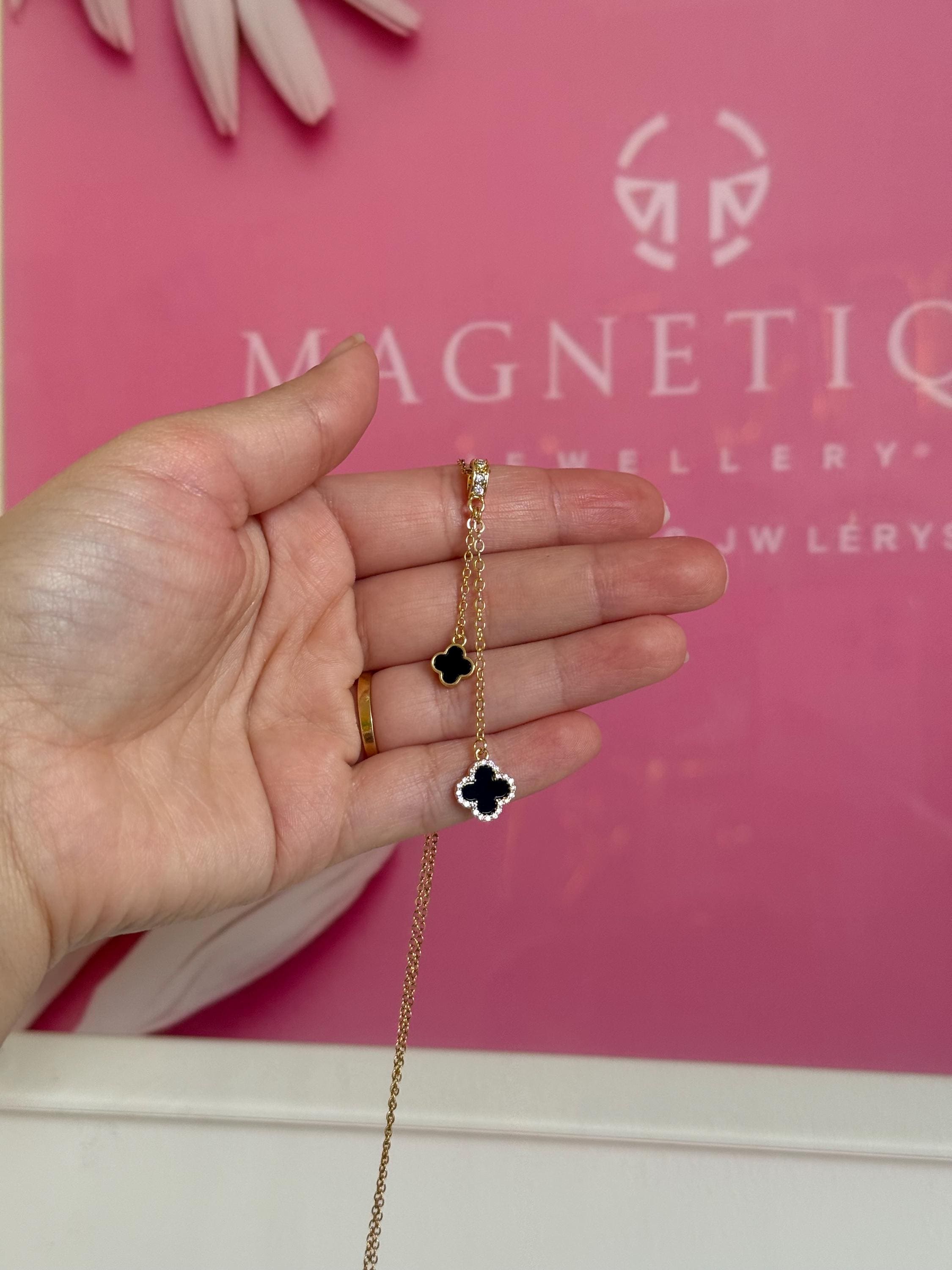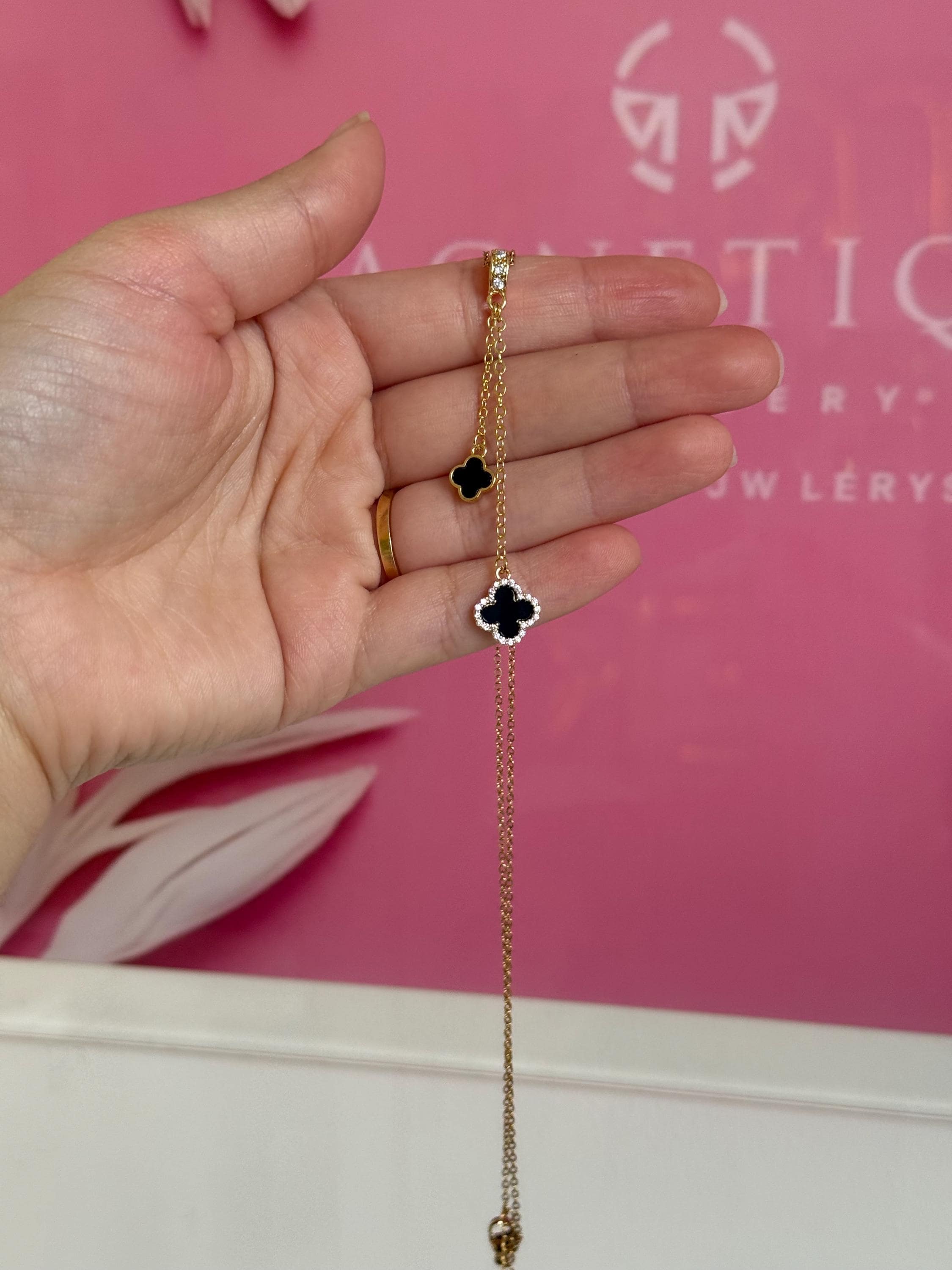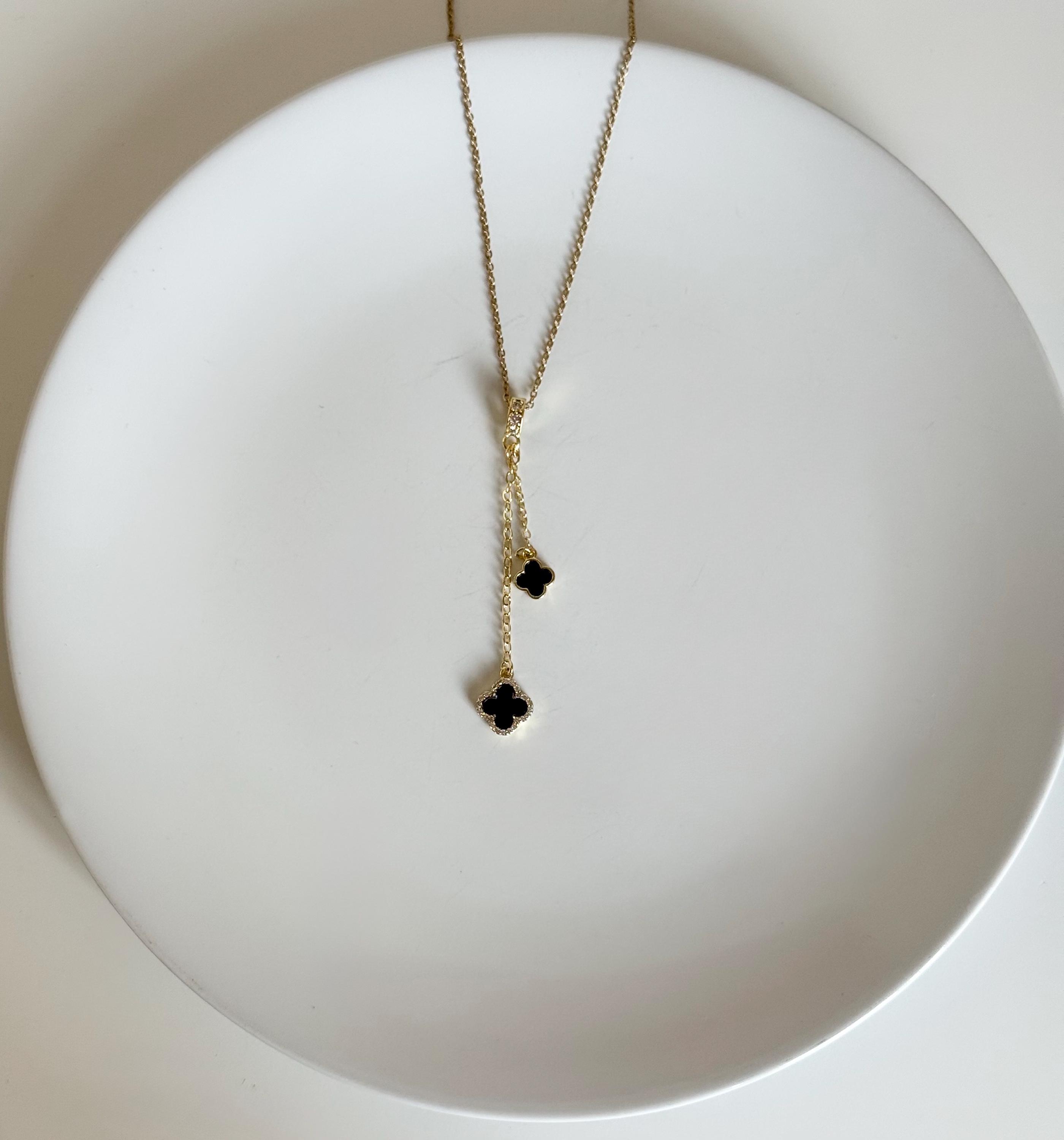 Key features: - Style: Double clover pendant necklace with black enamel inlay - Material: Stainless steel with gold-tone plating - Length: Adjustable chain, ideal for layering or wearing alone - Dimensions: Pendant size approximately [insert size], chain length adjustable - Care: Avoid harsh chemicals, store in a dry place, and clean gently with a soft cloth