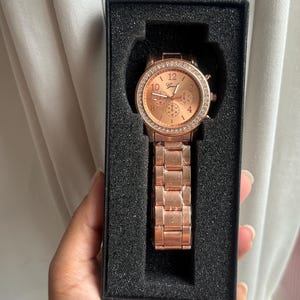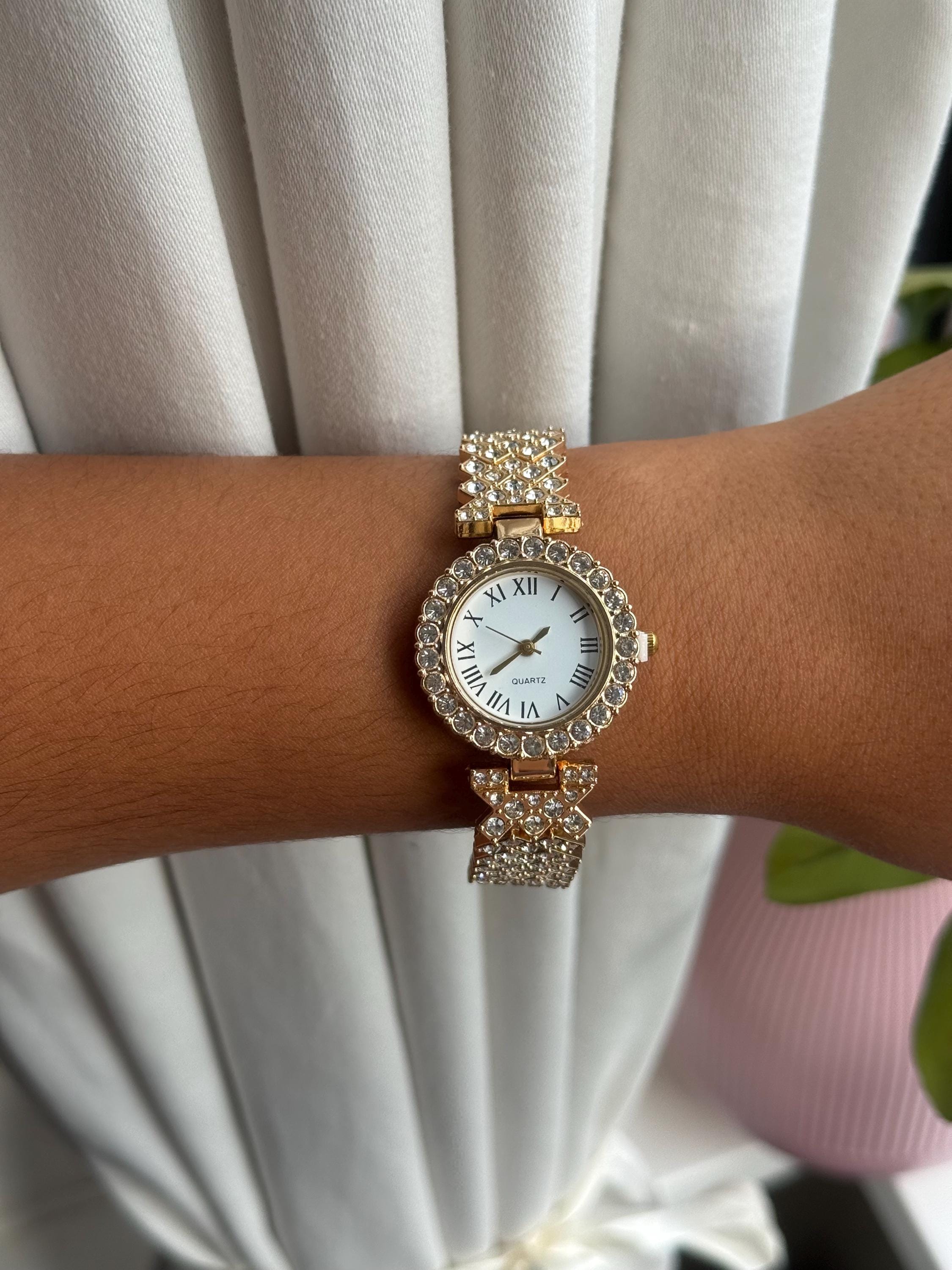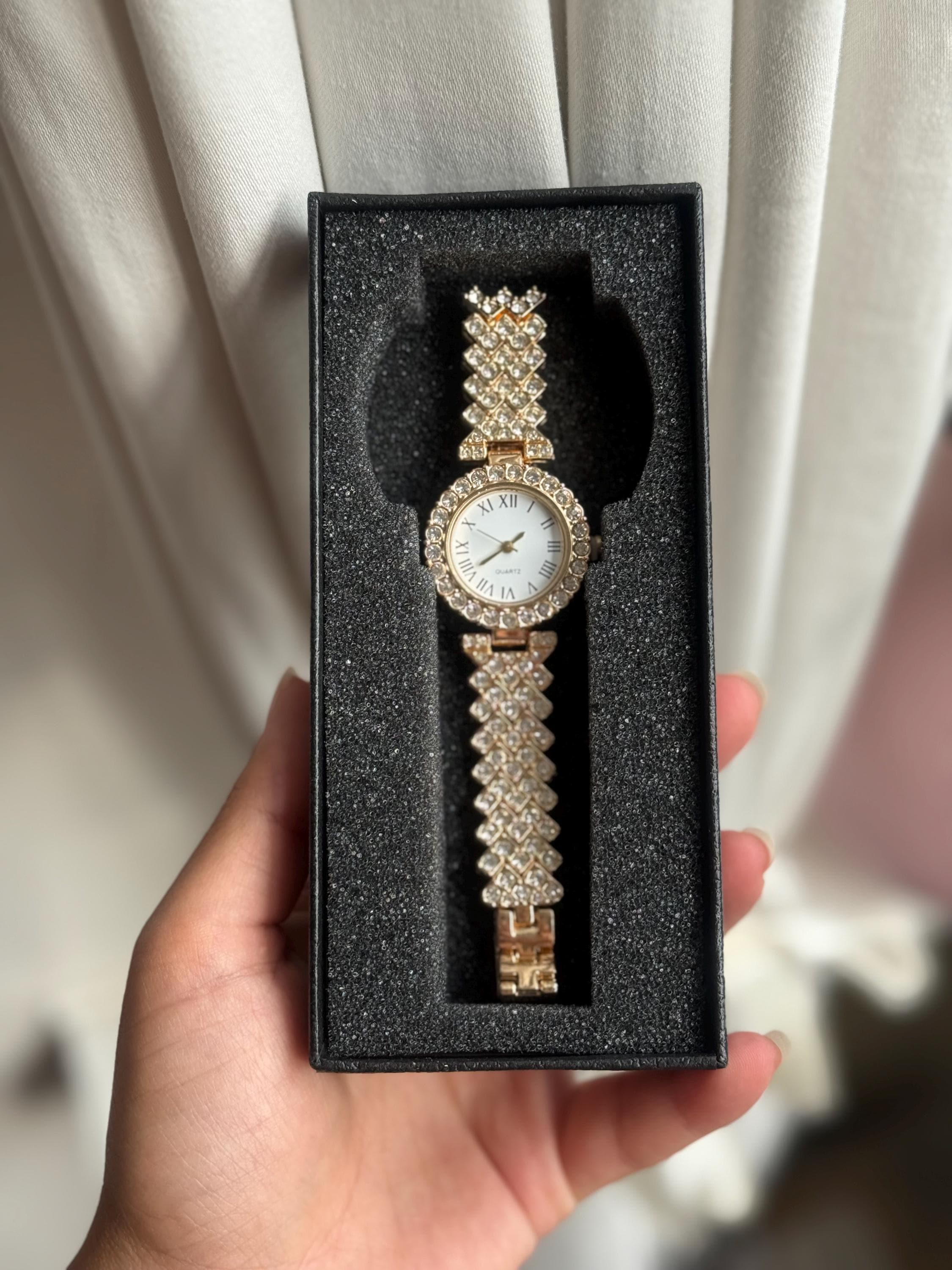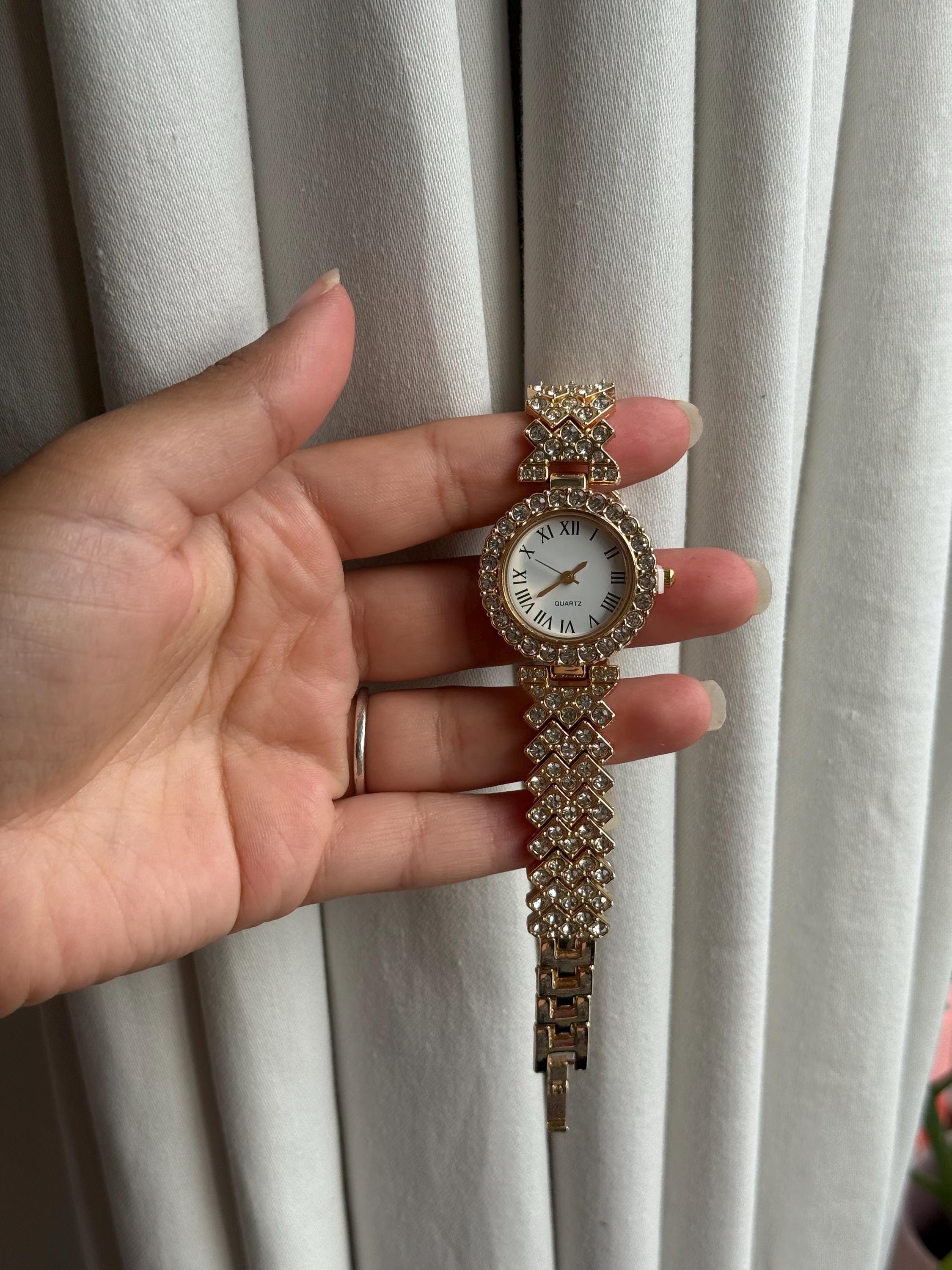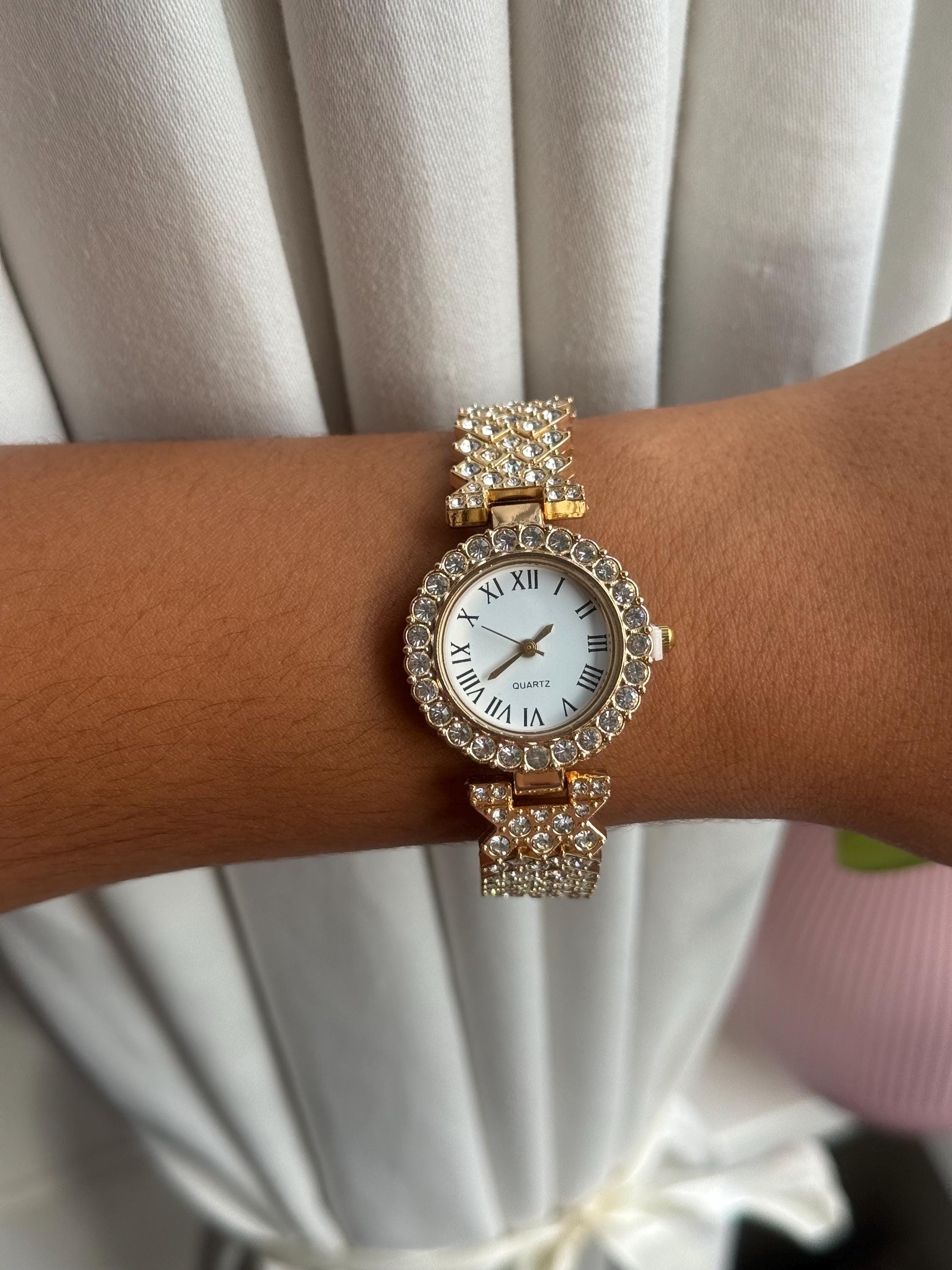 Add instant glamour to your look with this stunning women’s gold Crystal bracelet-style quartz watch in a radiant gold tone. The entire strap is beautifully encrusted with sparkling clear crystals, paired with a classic white round dial featuring elegant Roman numerals.