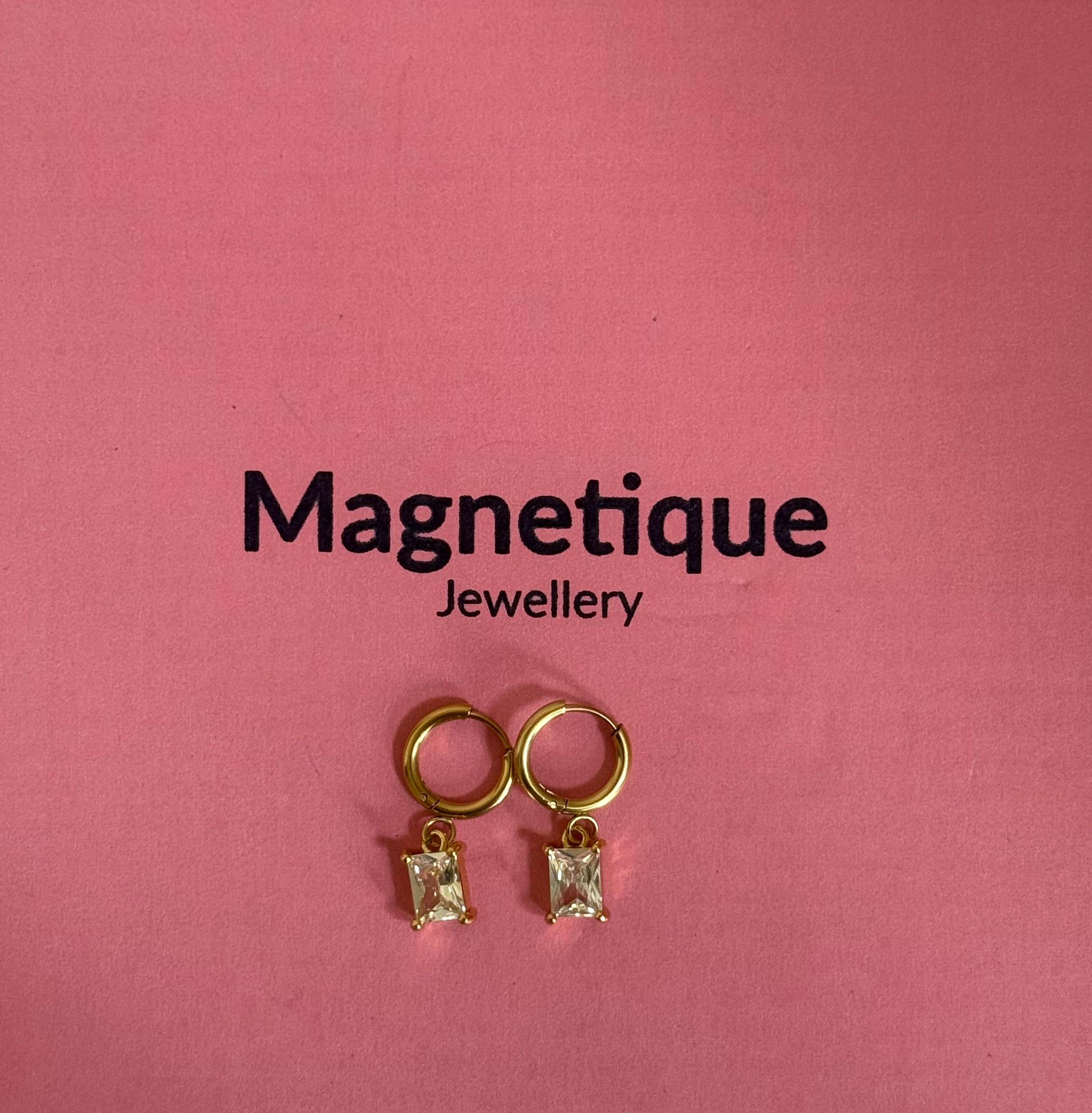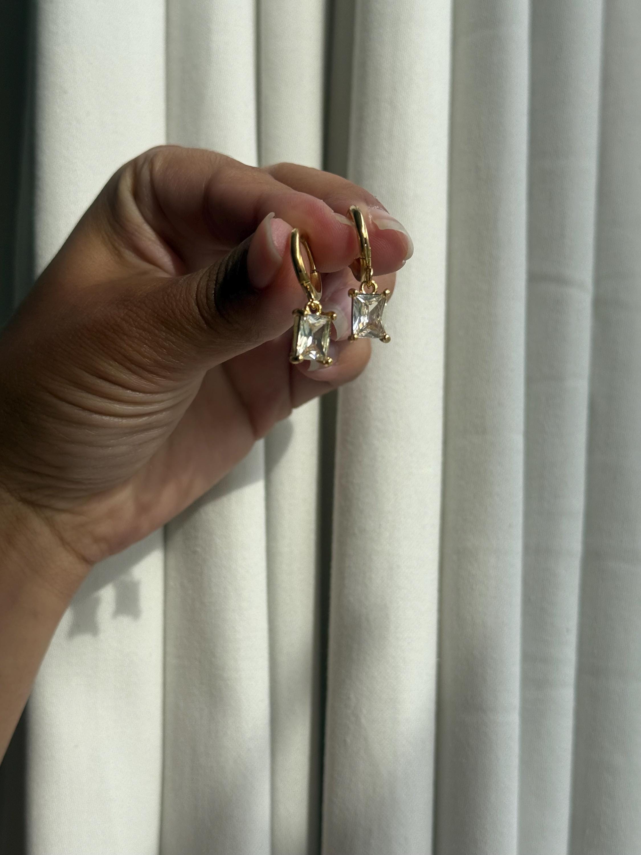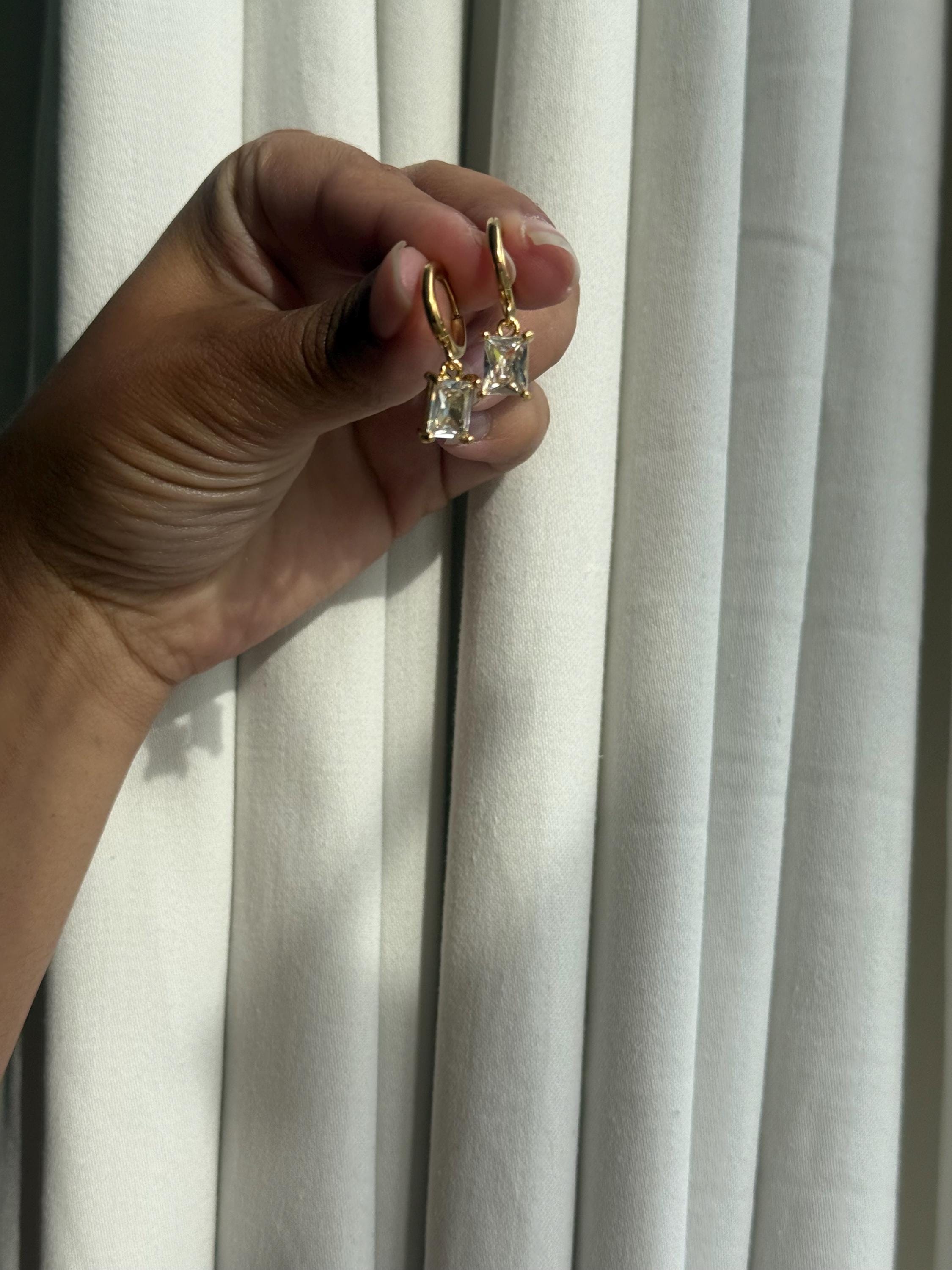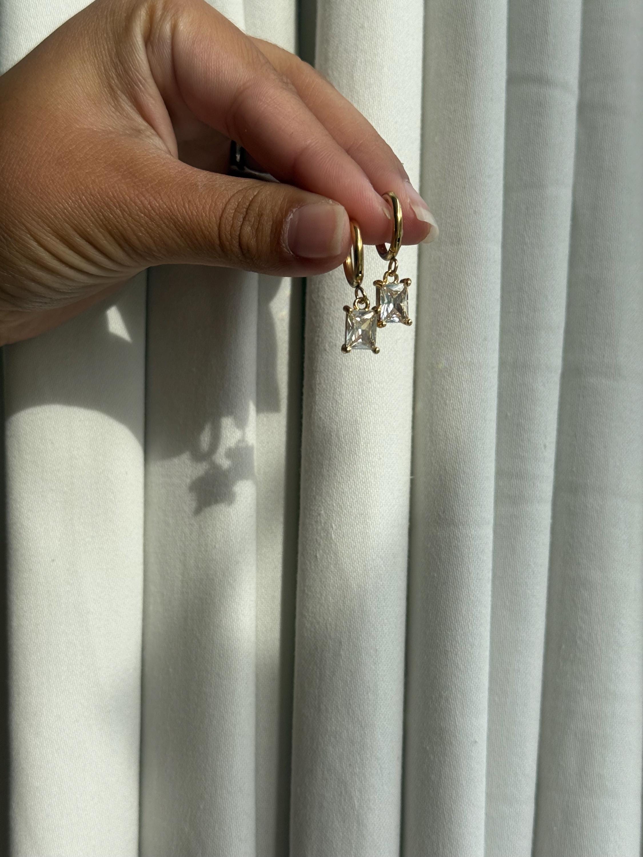✔ Features • Gold-tone metal huggie hoops • Clear square zircon drop charms • Minimalist & stylish design • Lightweight and easy to wear • Perfect for gifting or daily wear