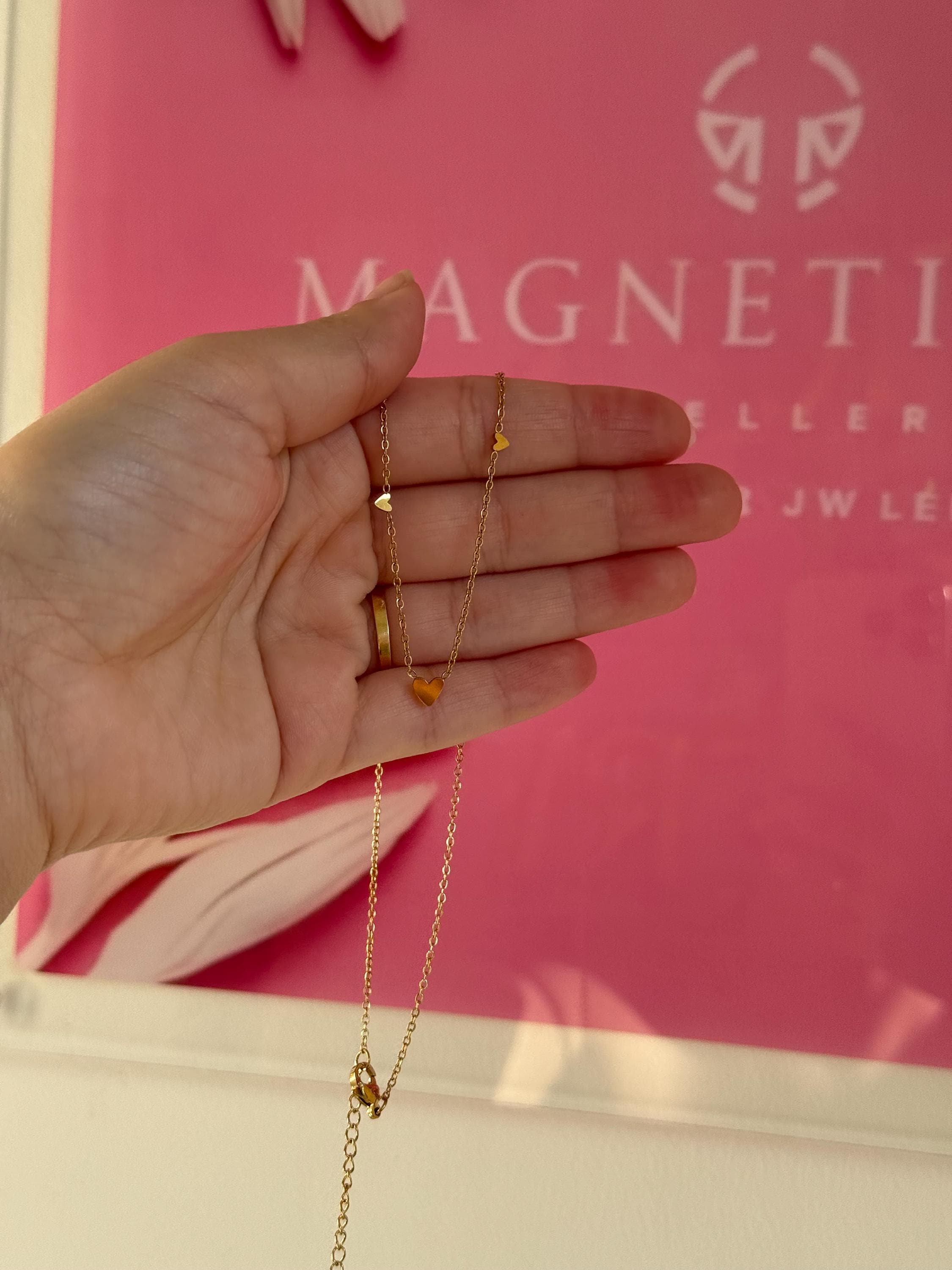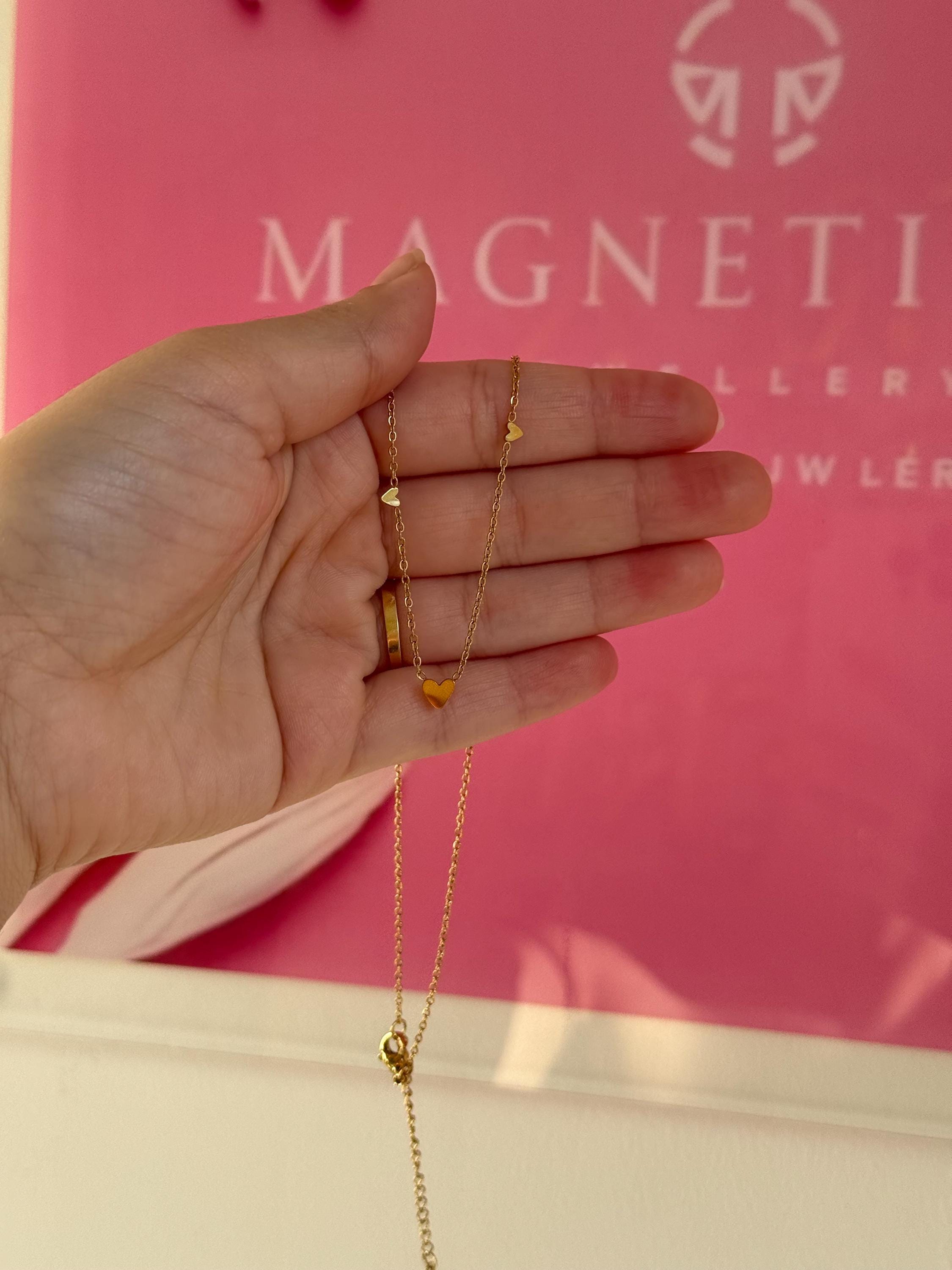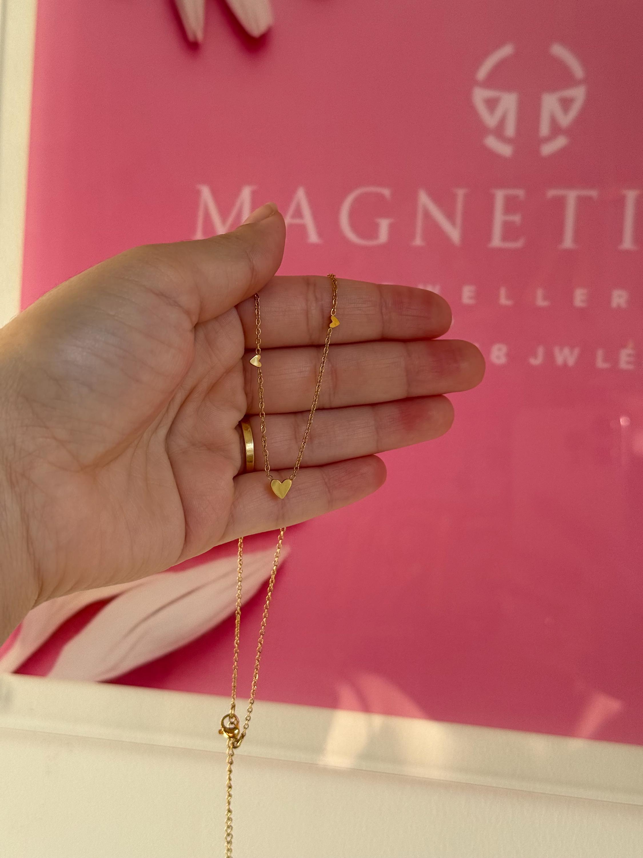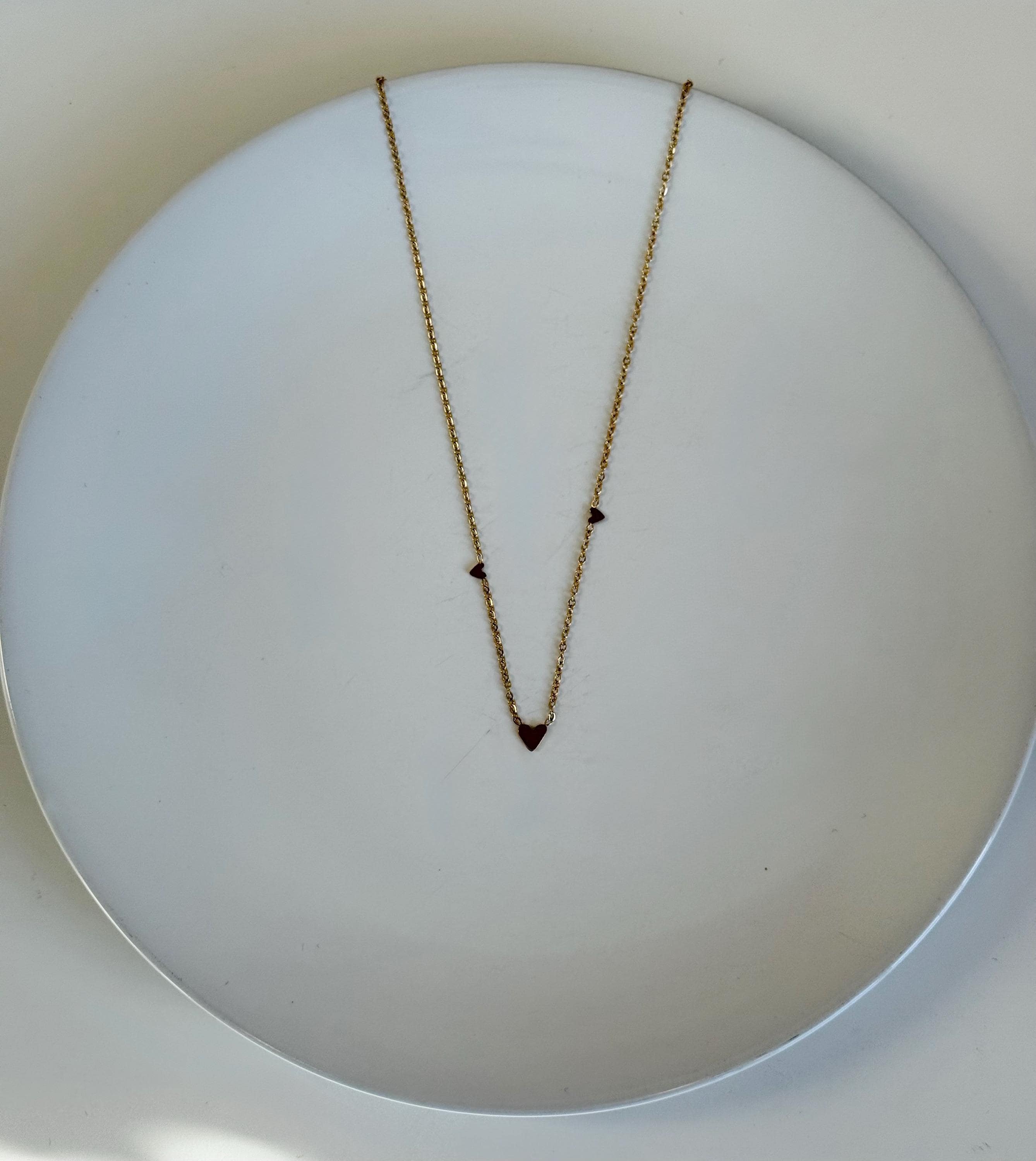 Features: - 18K gold plated stainless steel for lasting beauty - Three tiny heart charms for a romantic, minimalist aesthetic - Perfect for everyday wear, layering, or gifting - Hypoallergenic and tarnish-resistant - Dimensions: Chain length approximately [insert length], hearts size approximately [insert size]