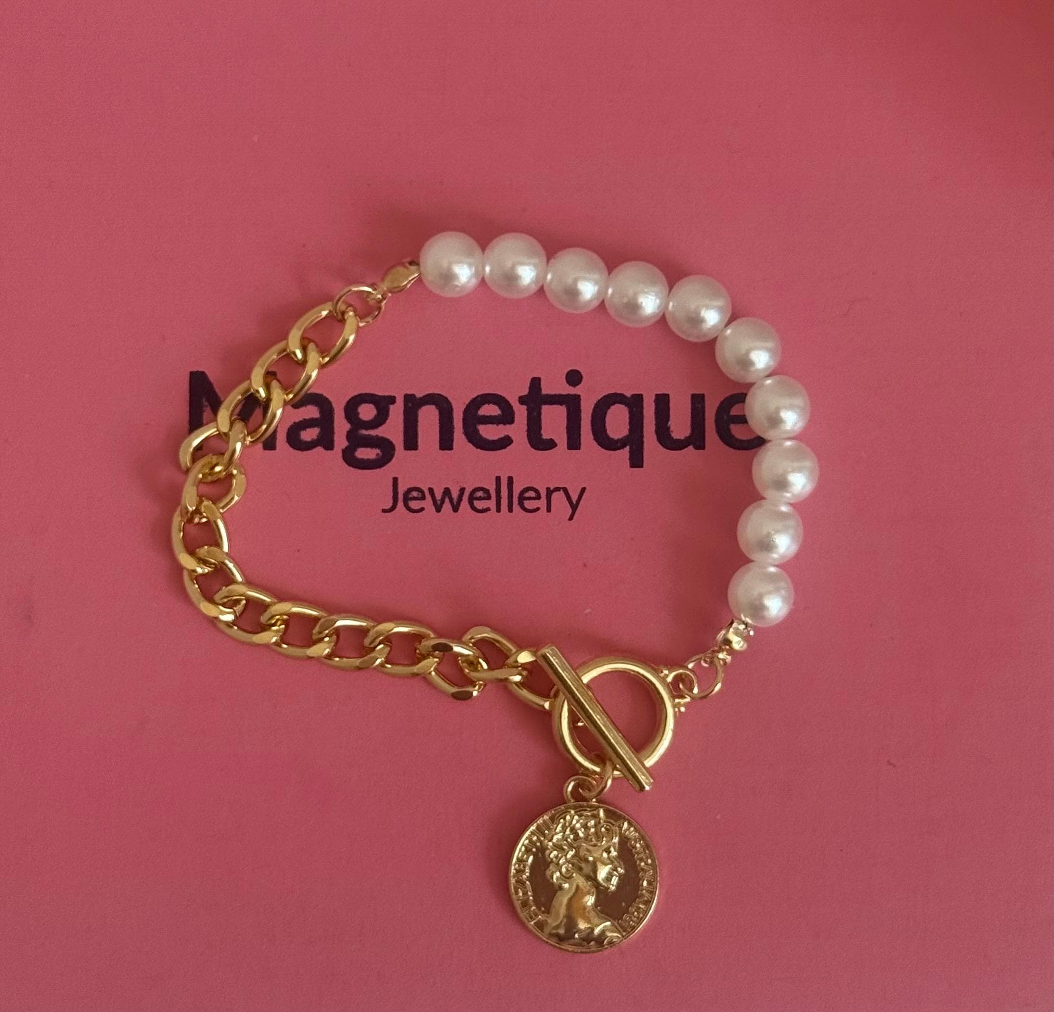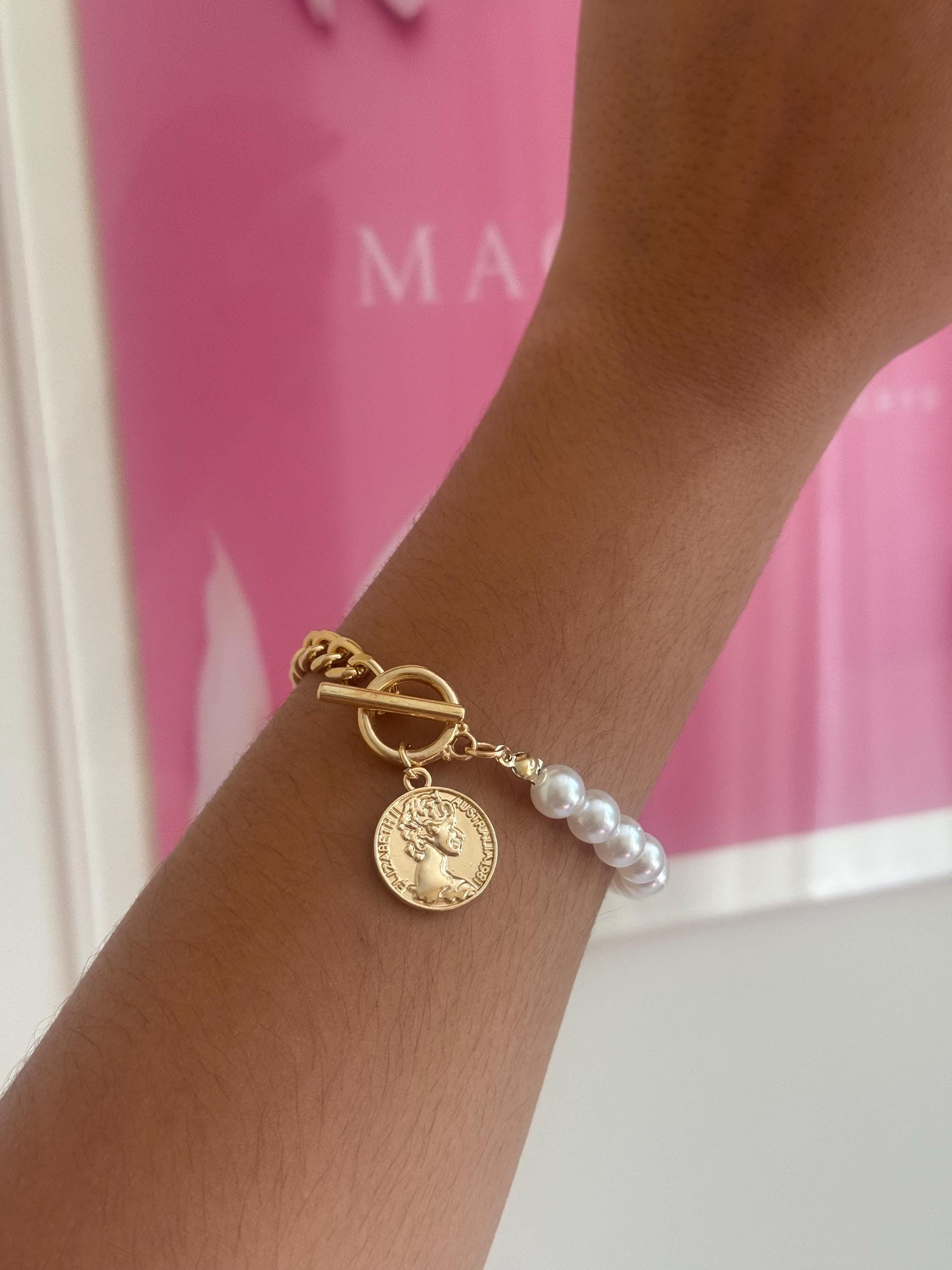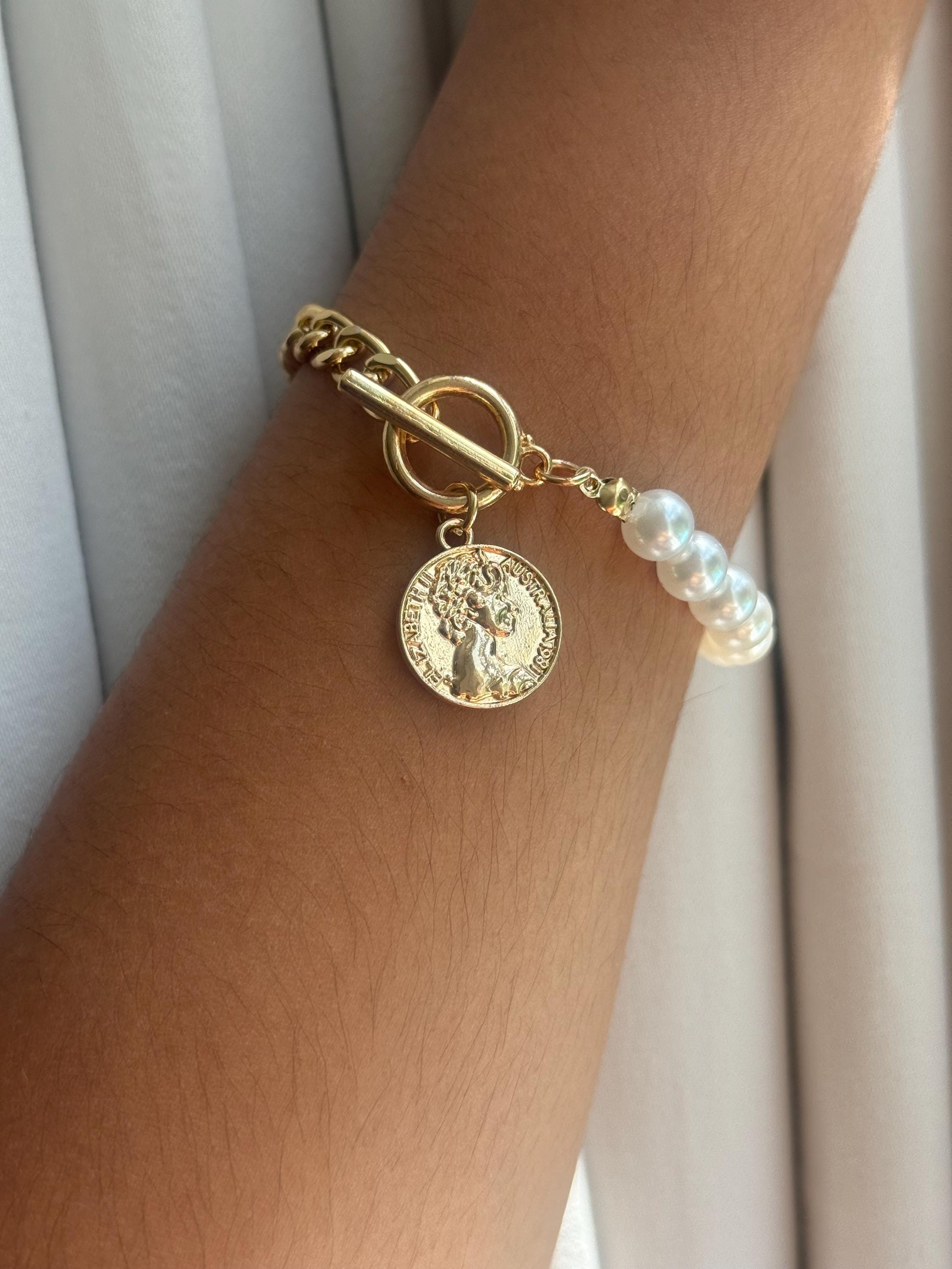 Elevate your jewelry collection with this stunning Pearl & Gold Bracelet featuring a vintage-inspired coin charm and toggle clasp. Perfect for adding a touch of elegance and sophistication to any outfit, this statement bracelet seamlessly combines timeless charm with modern style.