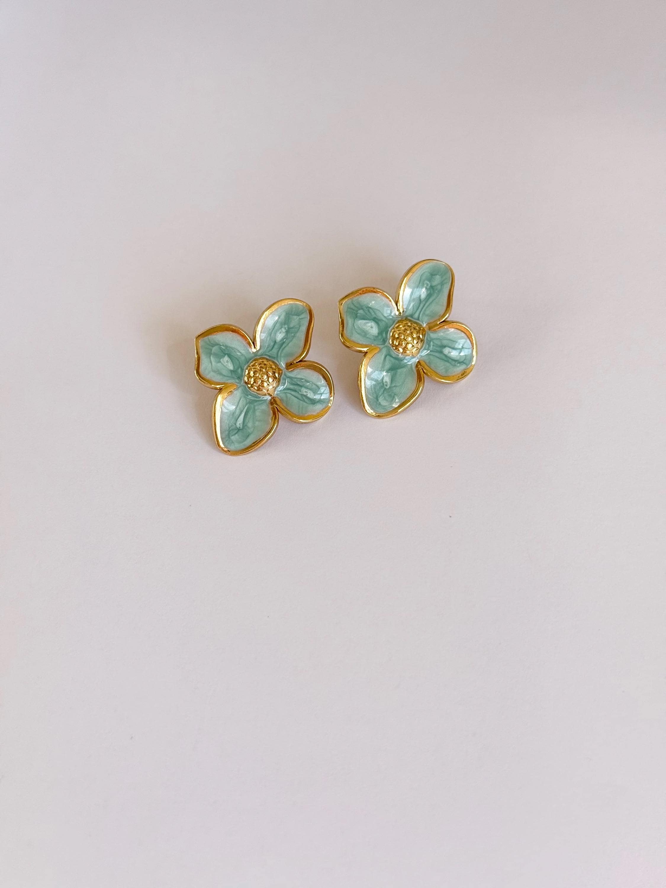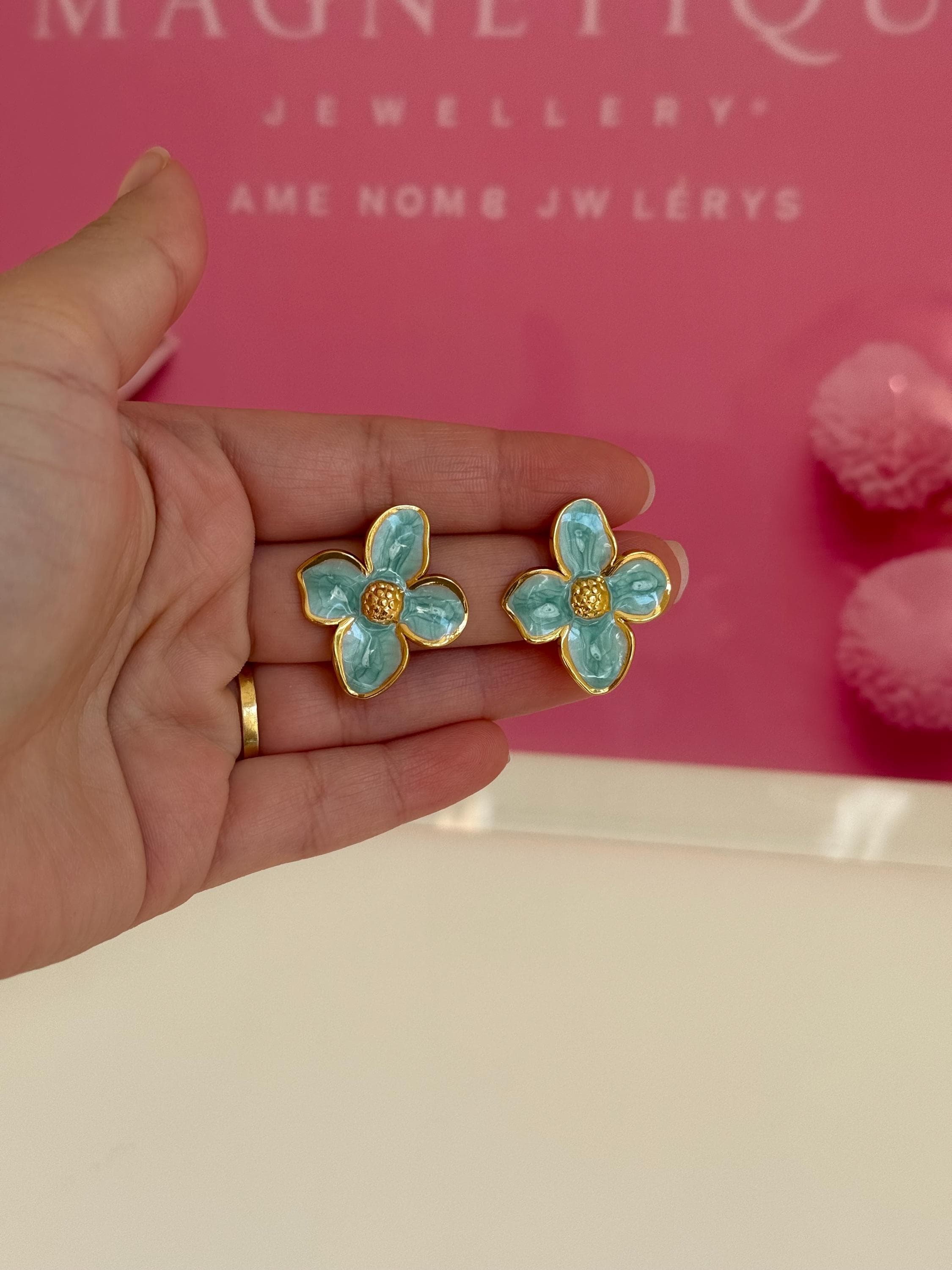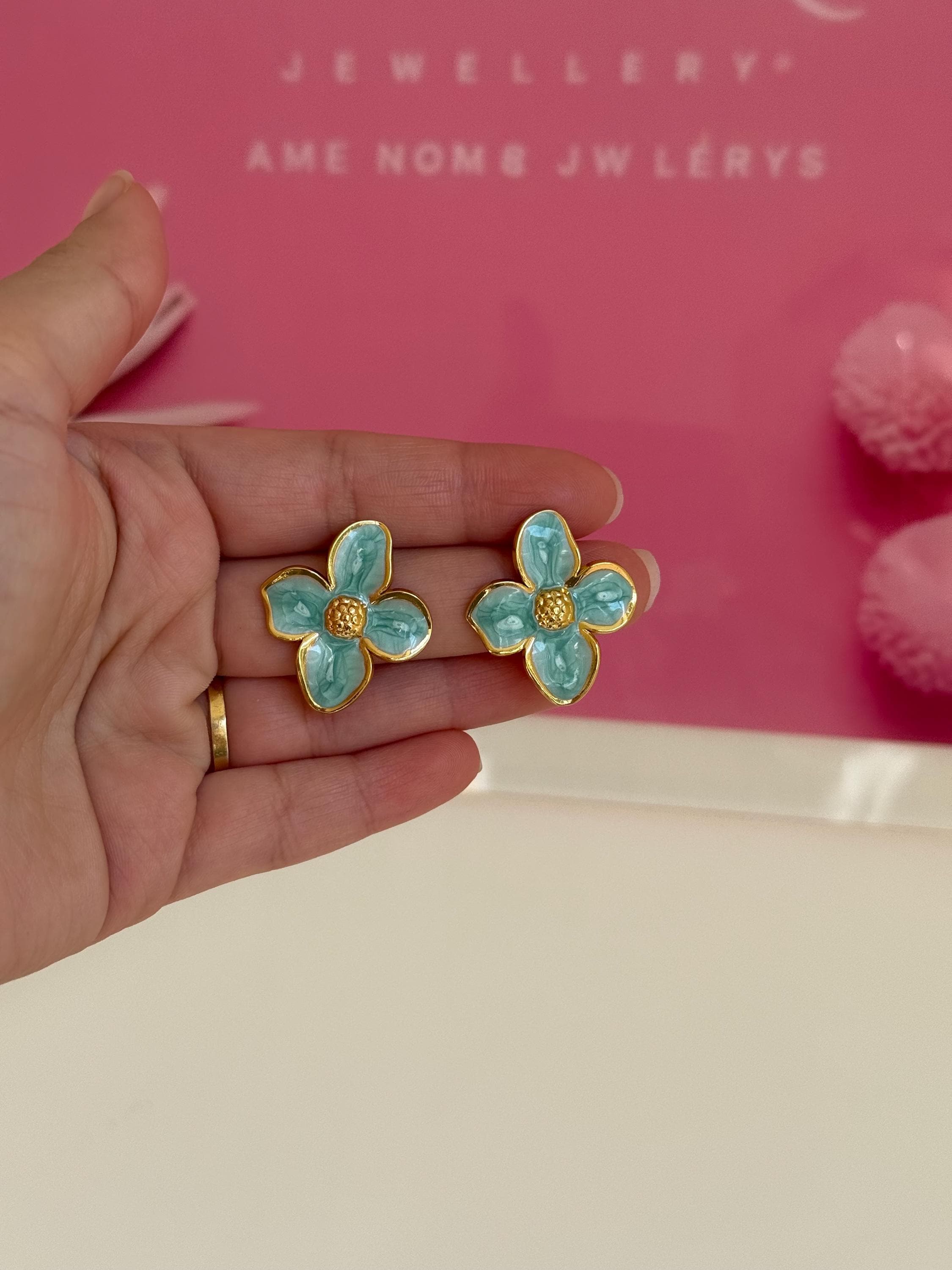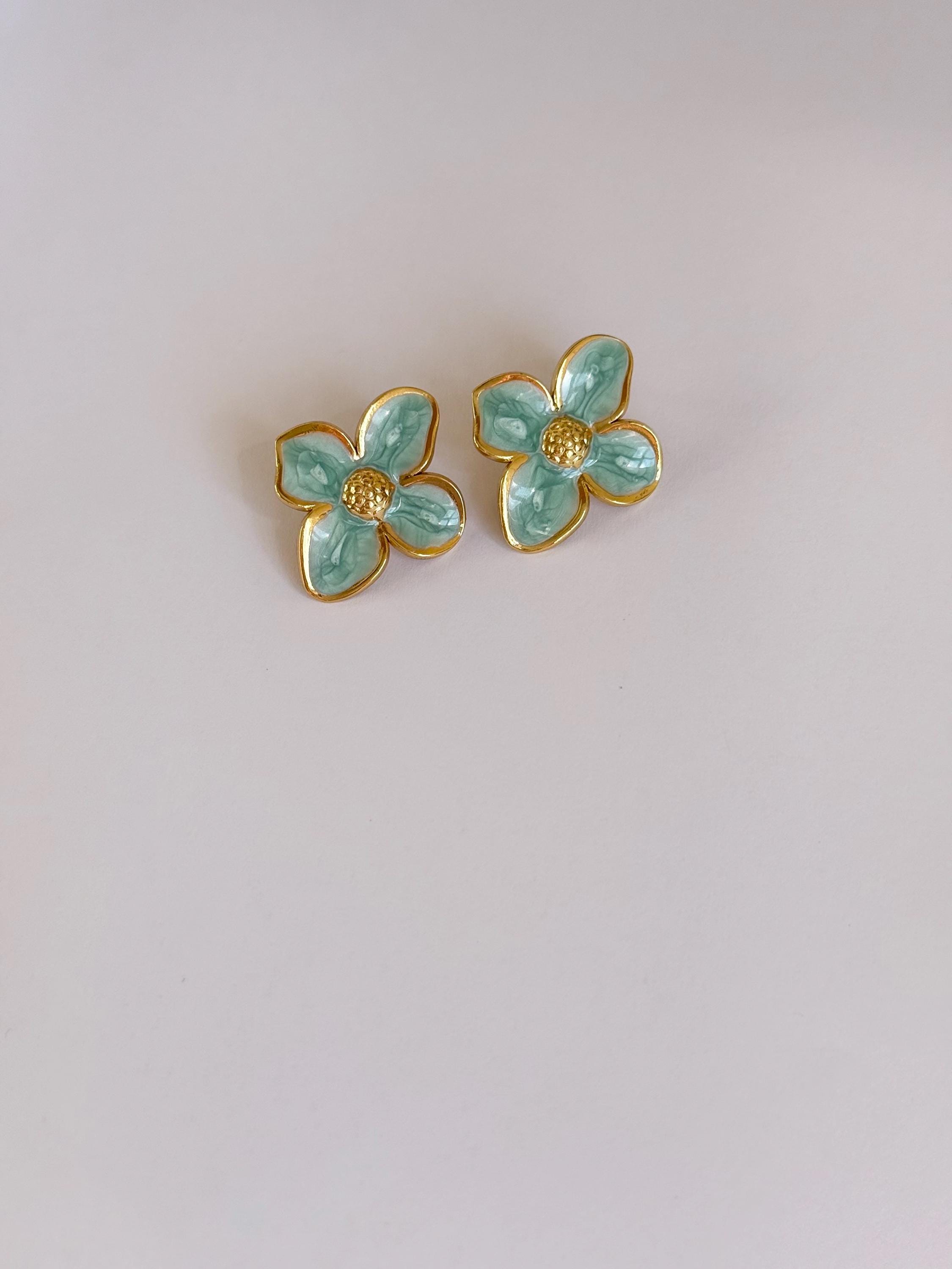 Key features: - Materials: Stainless steel with turquoise enamel finish - Care instructions: Wipe with a soft cloth; avoid harsh chemicals - Perfect for: Everyday wear, gift for her, jewelry gift, birthday gift, women’s jewelry, statement studs, enamel jewelry, boutique jewelry, flower stud earrings, turquoise earrings