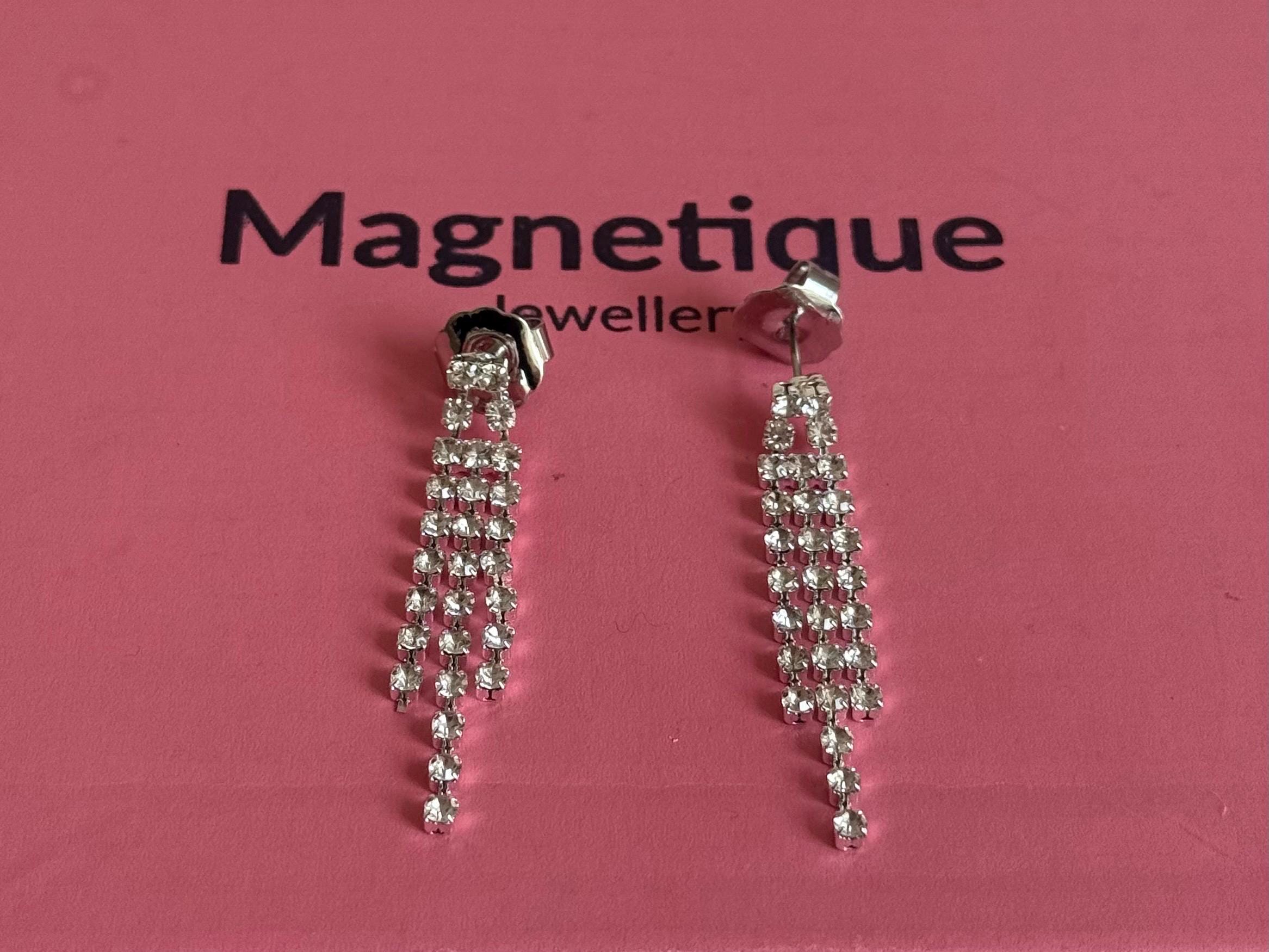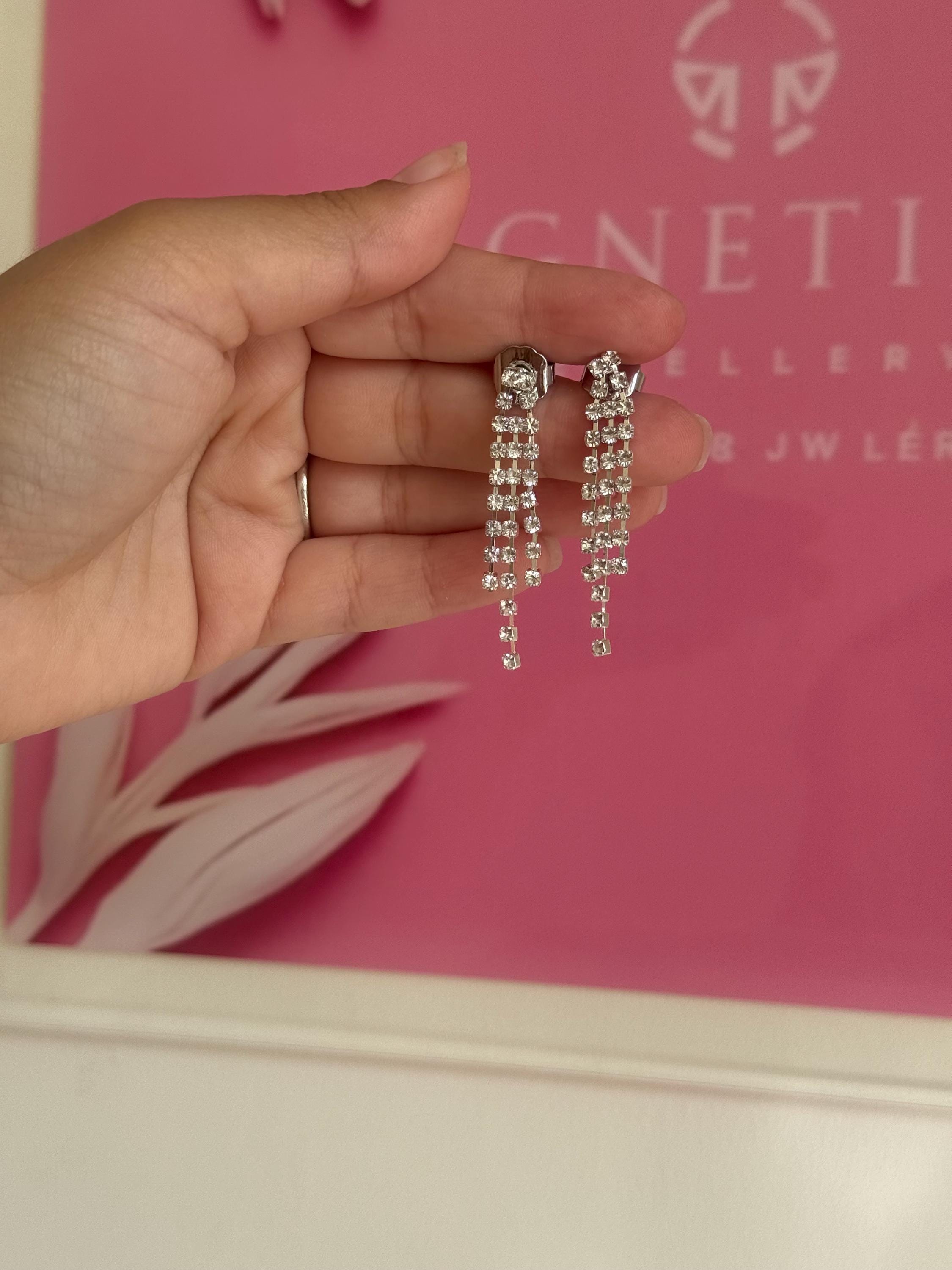 Add instant glamour to your look with these stunning Drop Tassel Earrings by Magnetique Jewellery. Featuring three cascading rows of shimmering rhinestones, these crystal jewellery earrings effortlessly elevate any outfit. Perfect for evening wear, special occasions, or adding a bold touch to your everyday style, they are designed to make you feel elegant and confident.