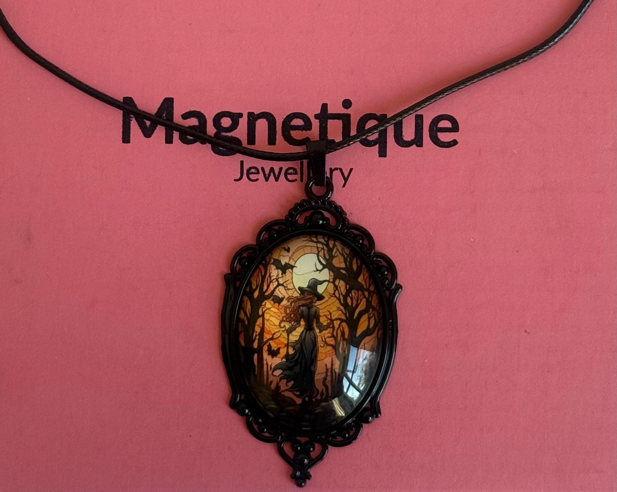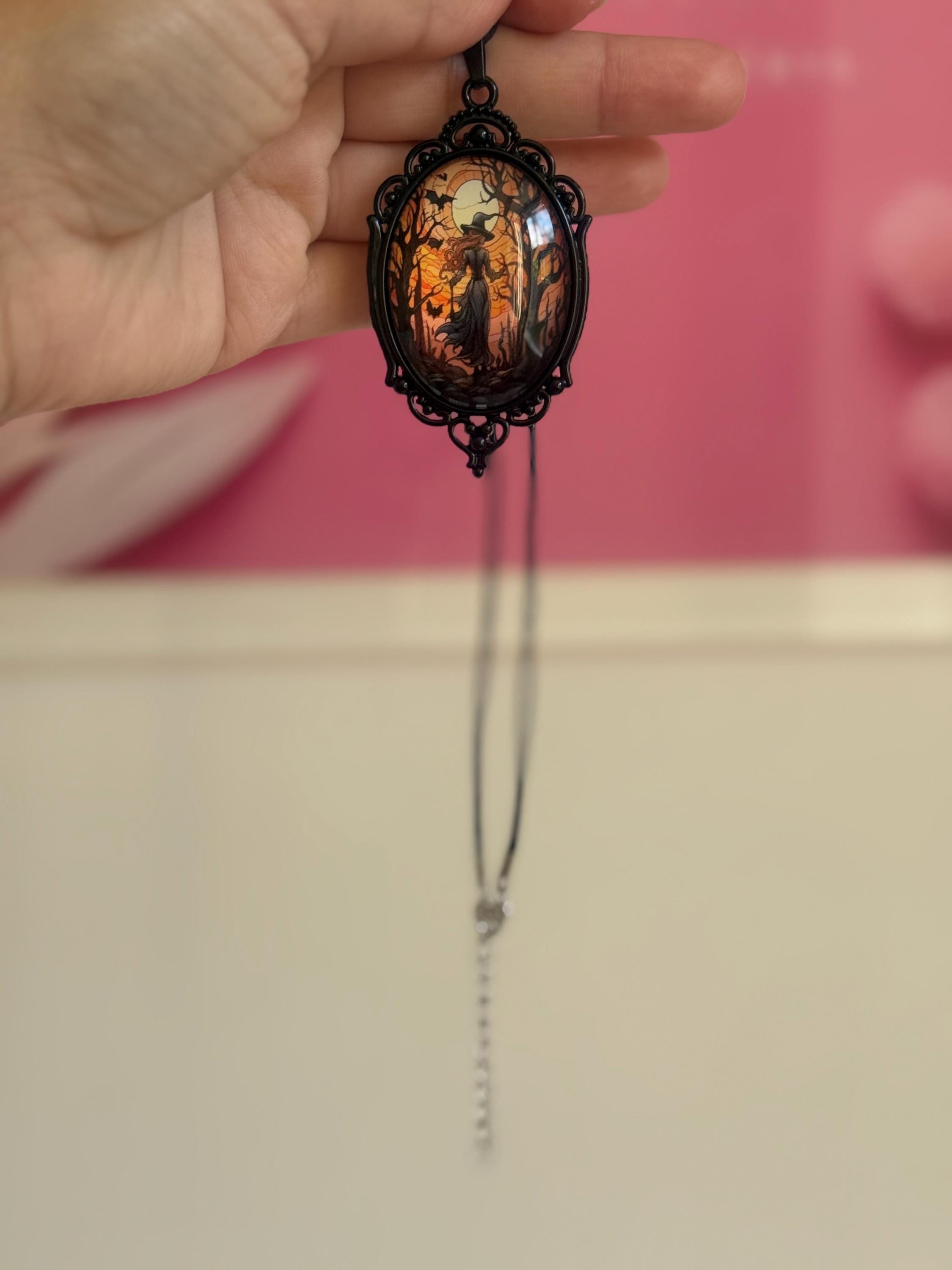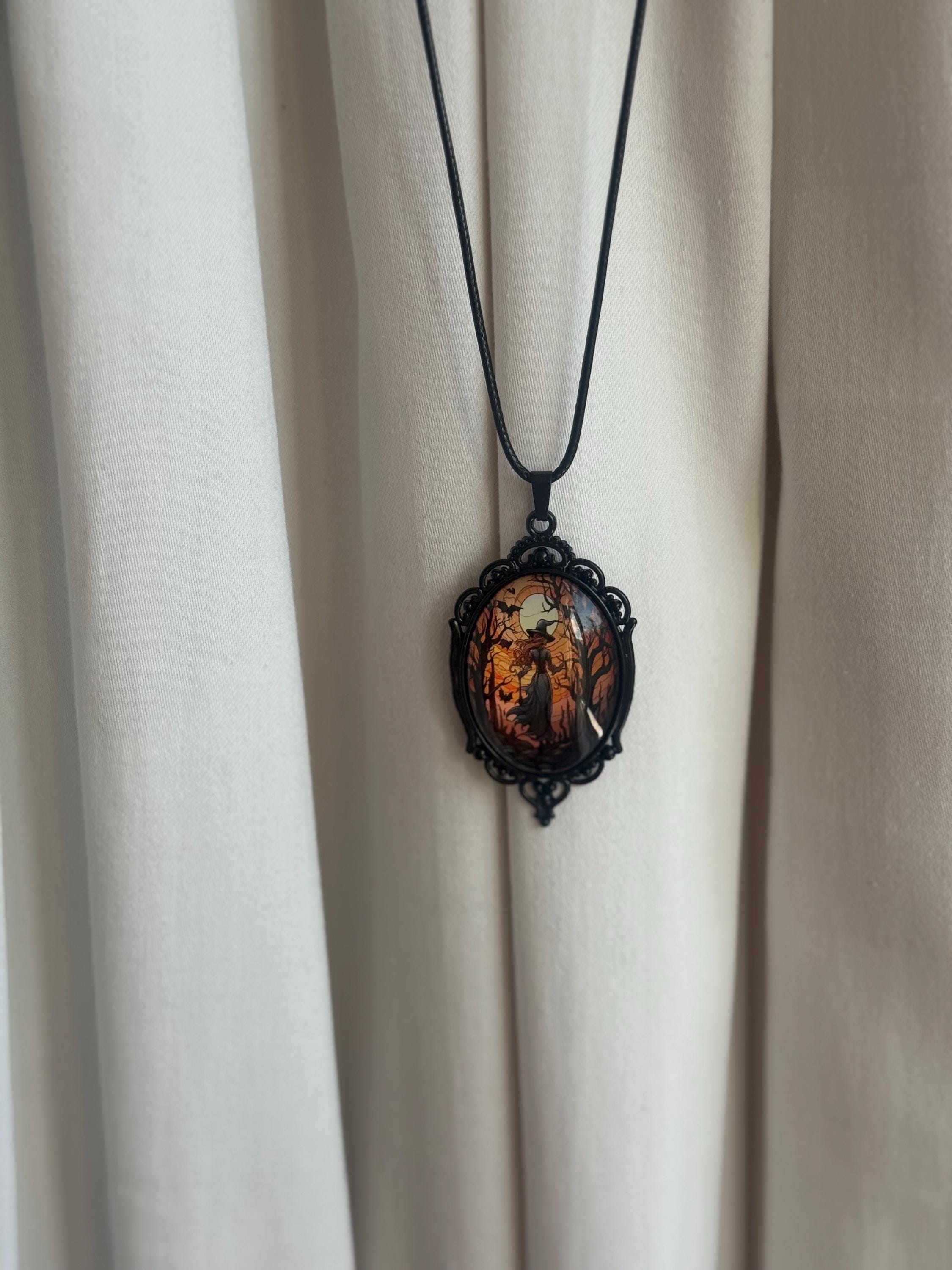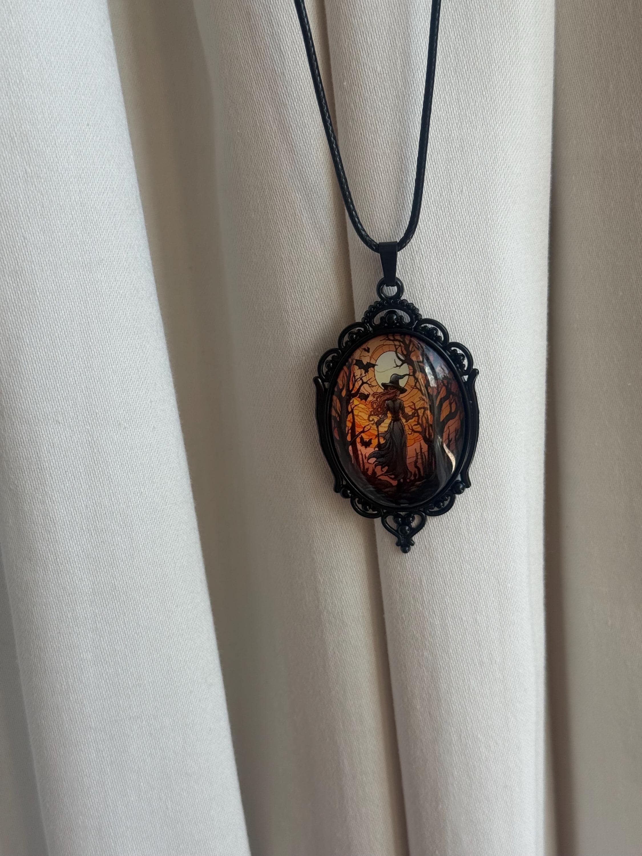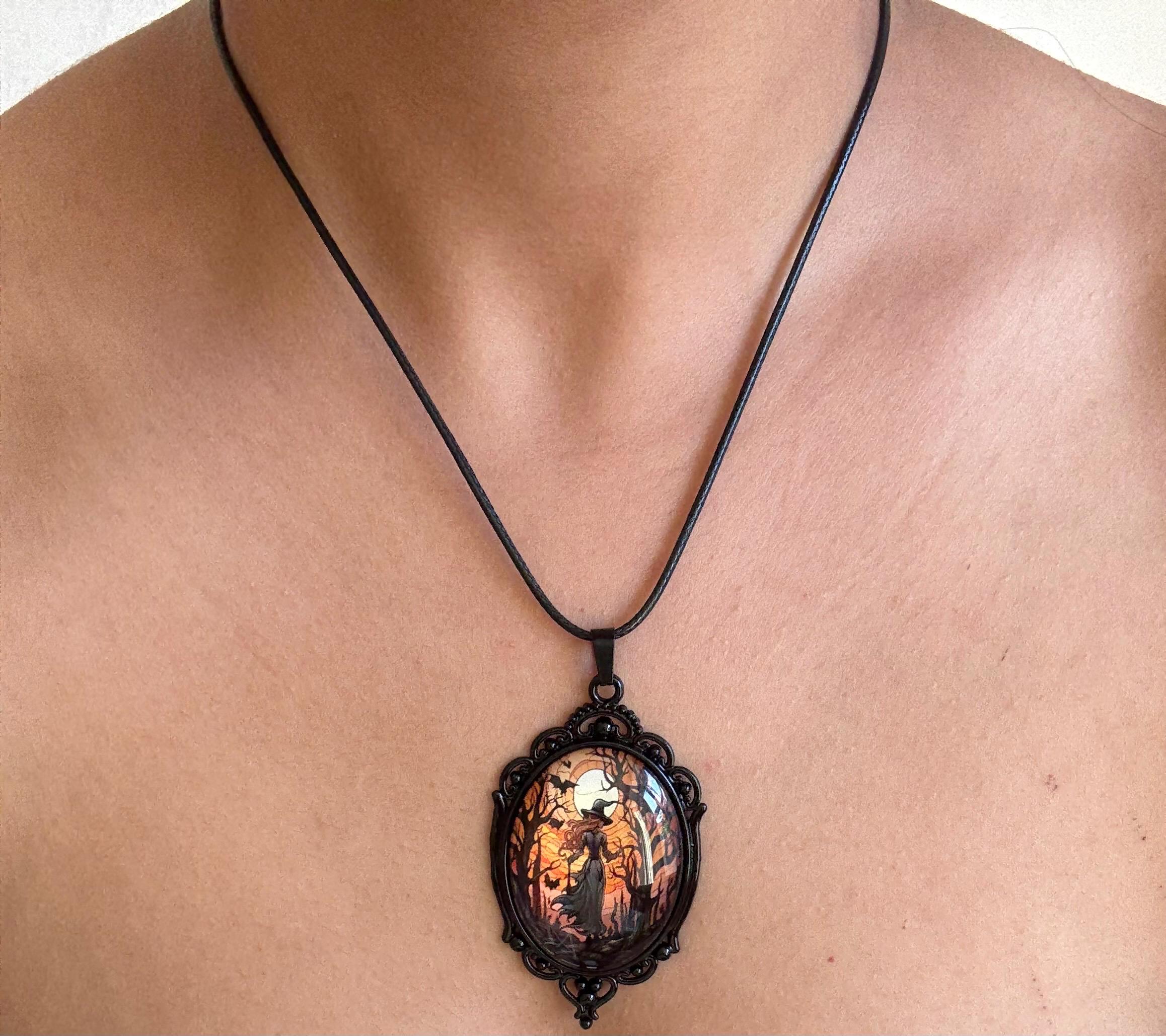 Key features include: - Vintage-style oval frame in matte black - Intricate witch silhouette scene set against a fiery autumn forest under a full moon - Adjustable black faux leather cord for comfortable wear - Lightweight, durable, and easy to style - Perfect gift for her, gothic jewellery lovers, or fantasy enthusiasts