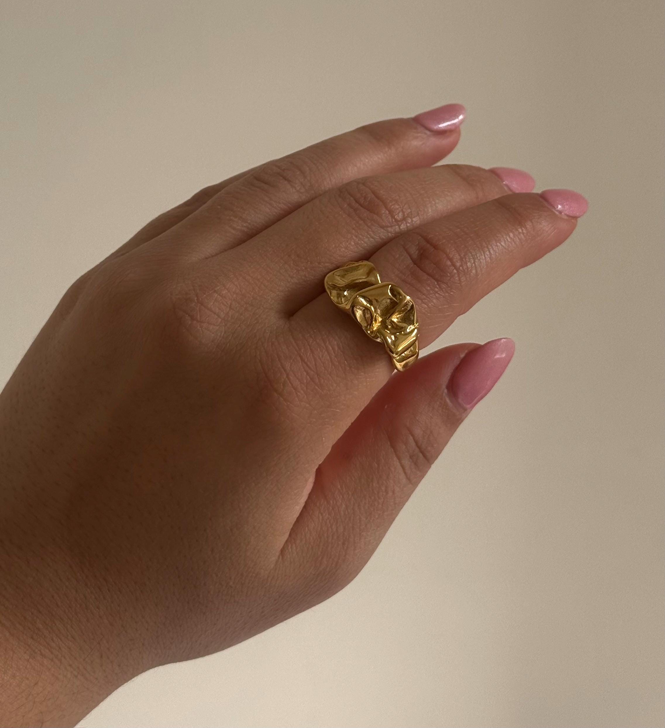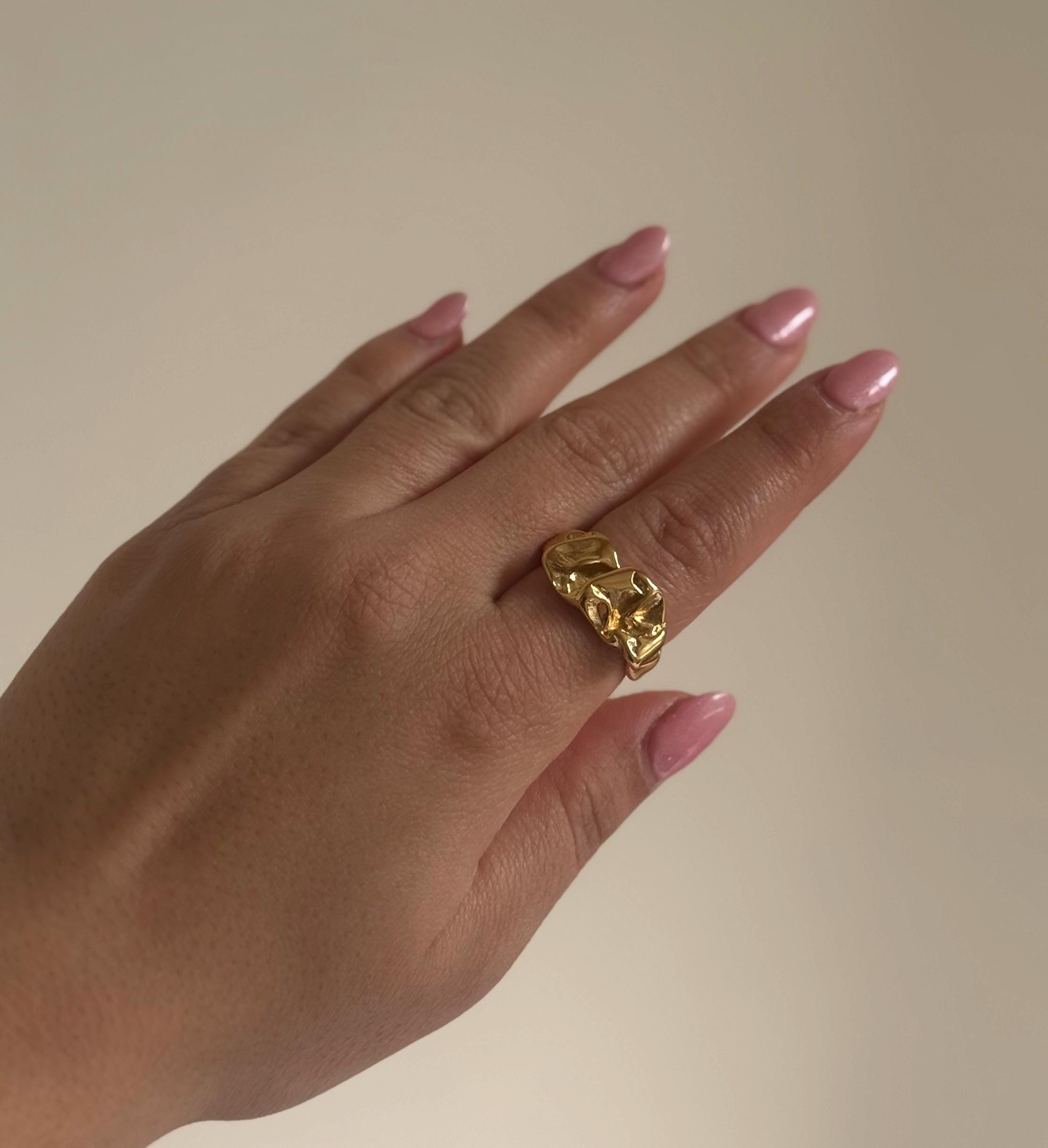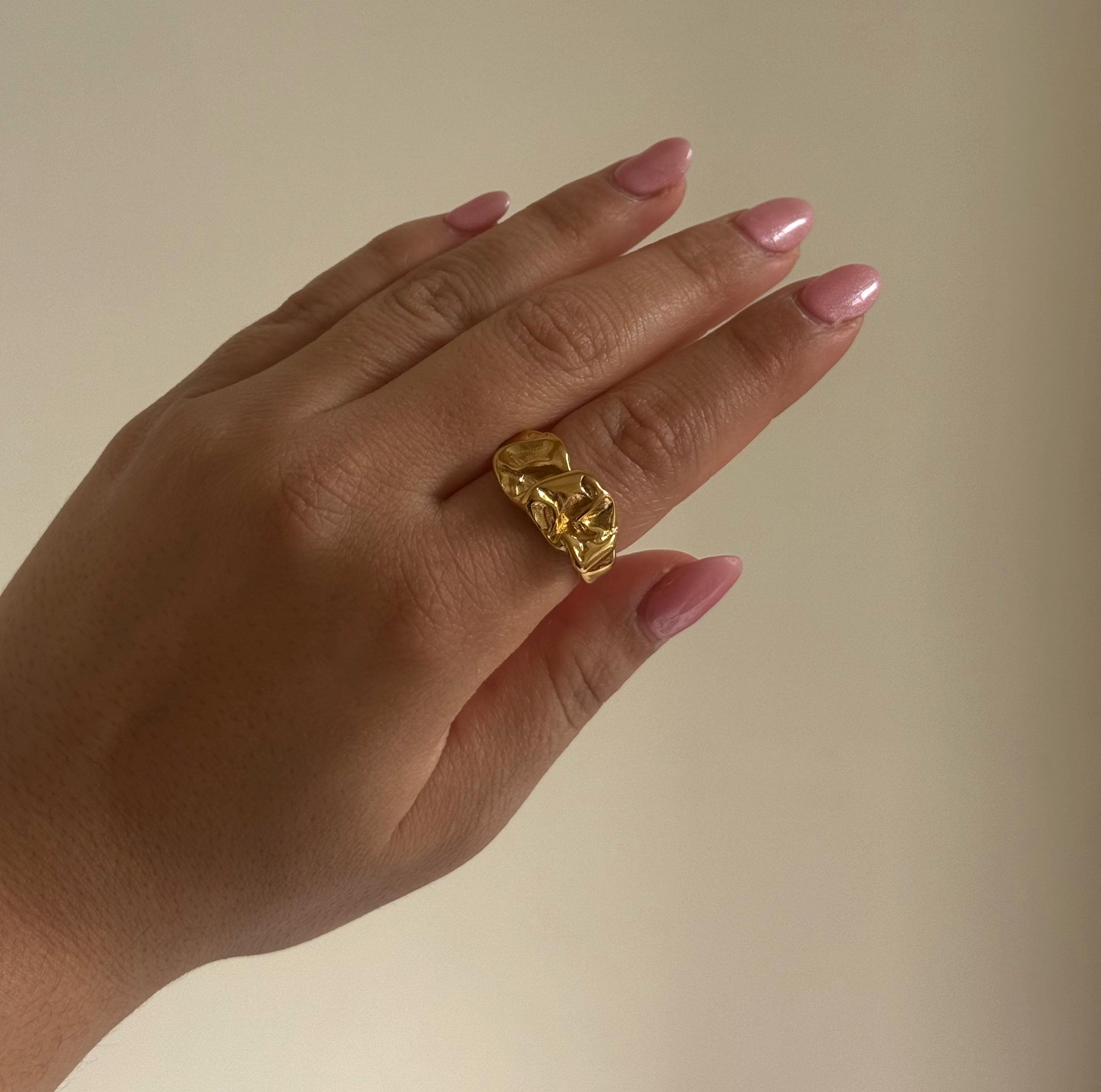Key features include: - Materials: Stainless steel with 18K gold plating - Design: Textured, sculptural open ring - Size: Adjustable for a perfect fit - Finish: High-shine, polished surface - Care: Avoid harsh chemicals to maintain its luster