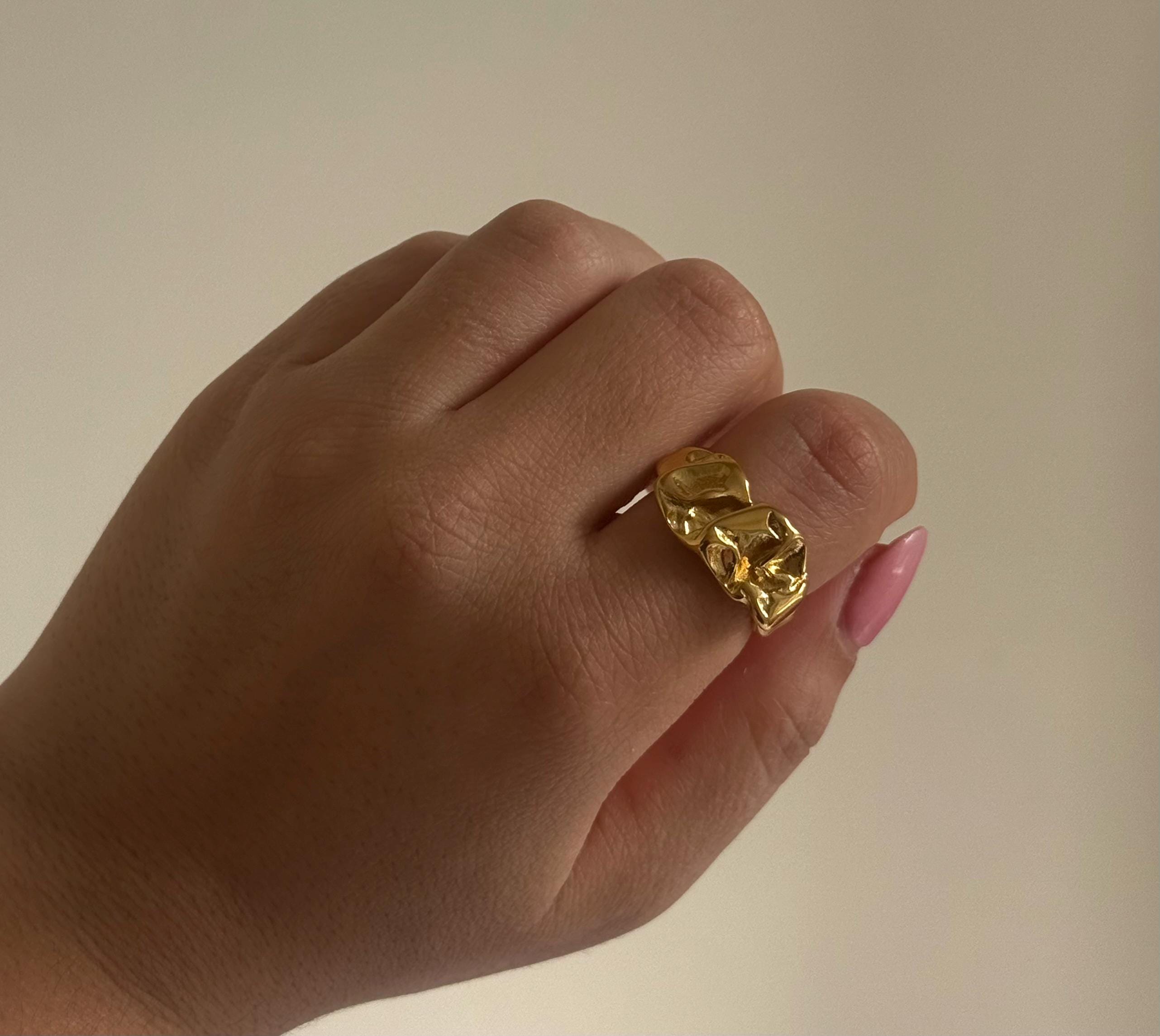 Discover the perfect blend of boldness and elegance with this Gold Ring, crafted from durable stainless steel and plated in stunning 18K gold. Featuring a unique textured sculptural design, this open adjustable ring is designed to elevate any outfit with its high-shine finish and contemporary style.