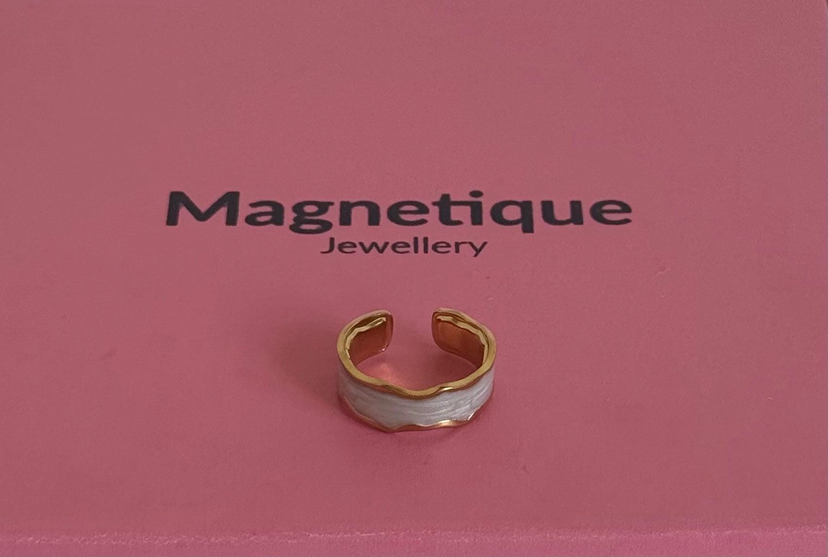 Key features: * Made from high-quality 304 stainless steel * Hypoallergenic and tarnish-resistant * White enamel inlay framed in a gold finish * Adjustable size for a comfortable fit * Minimalist yet eye-catching design * Ideal gift for women, jewelry lovers, or special occasions