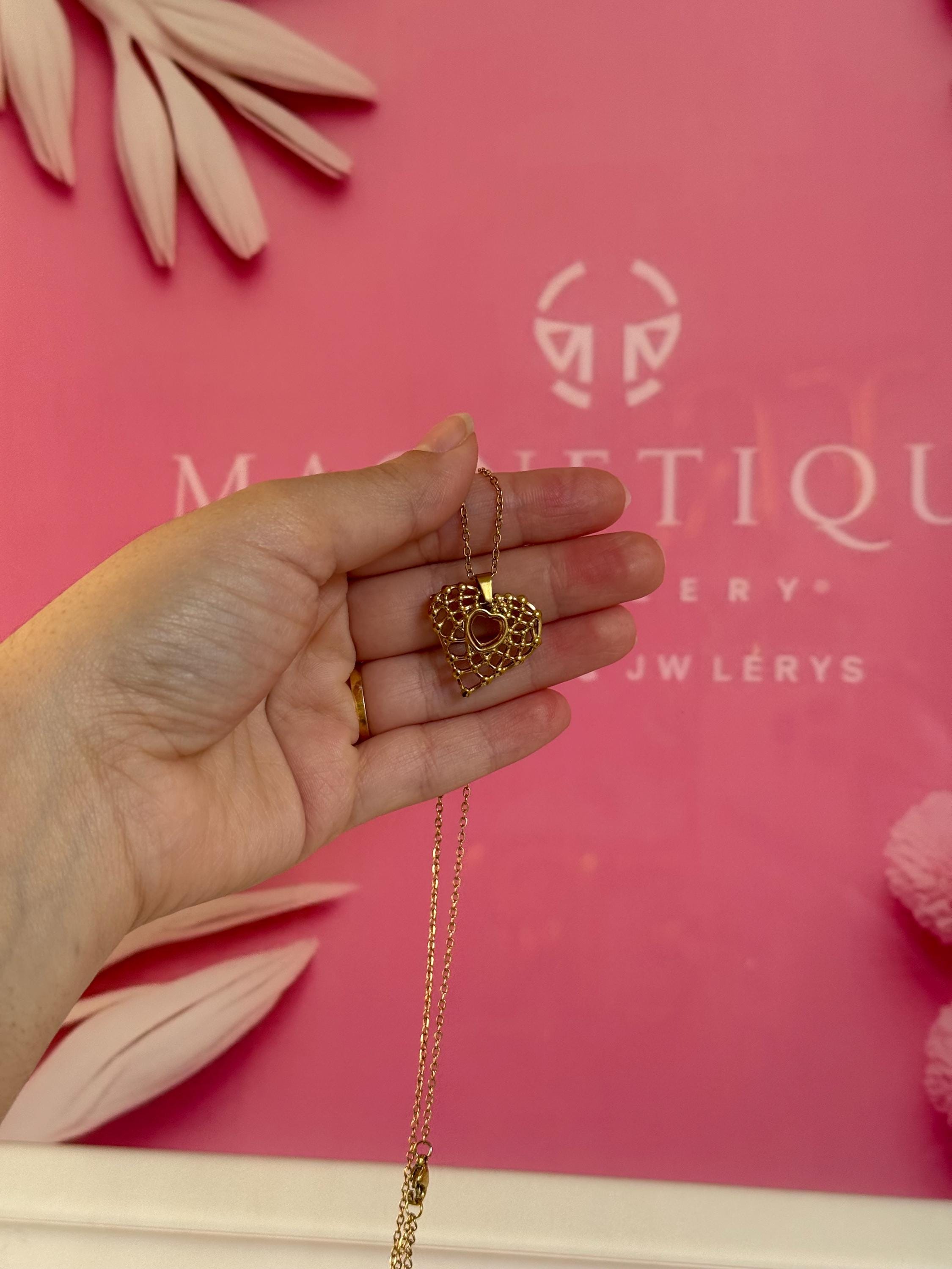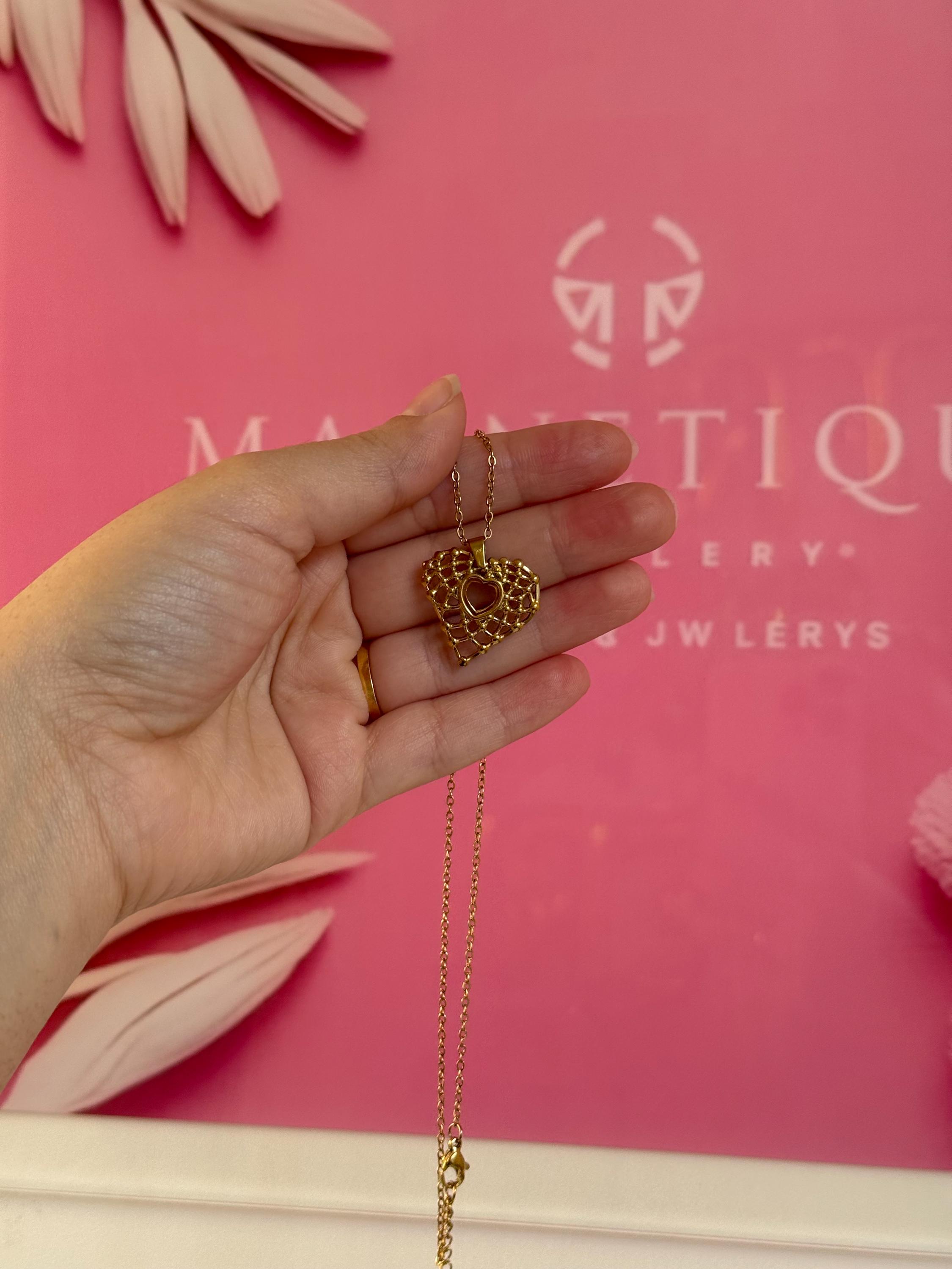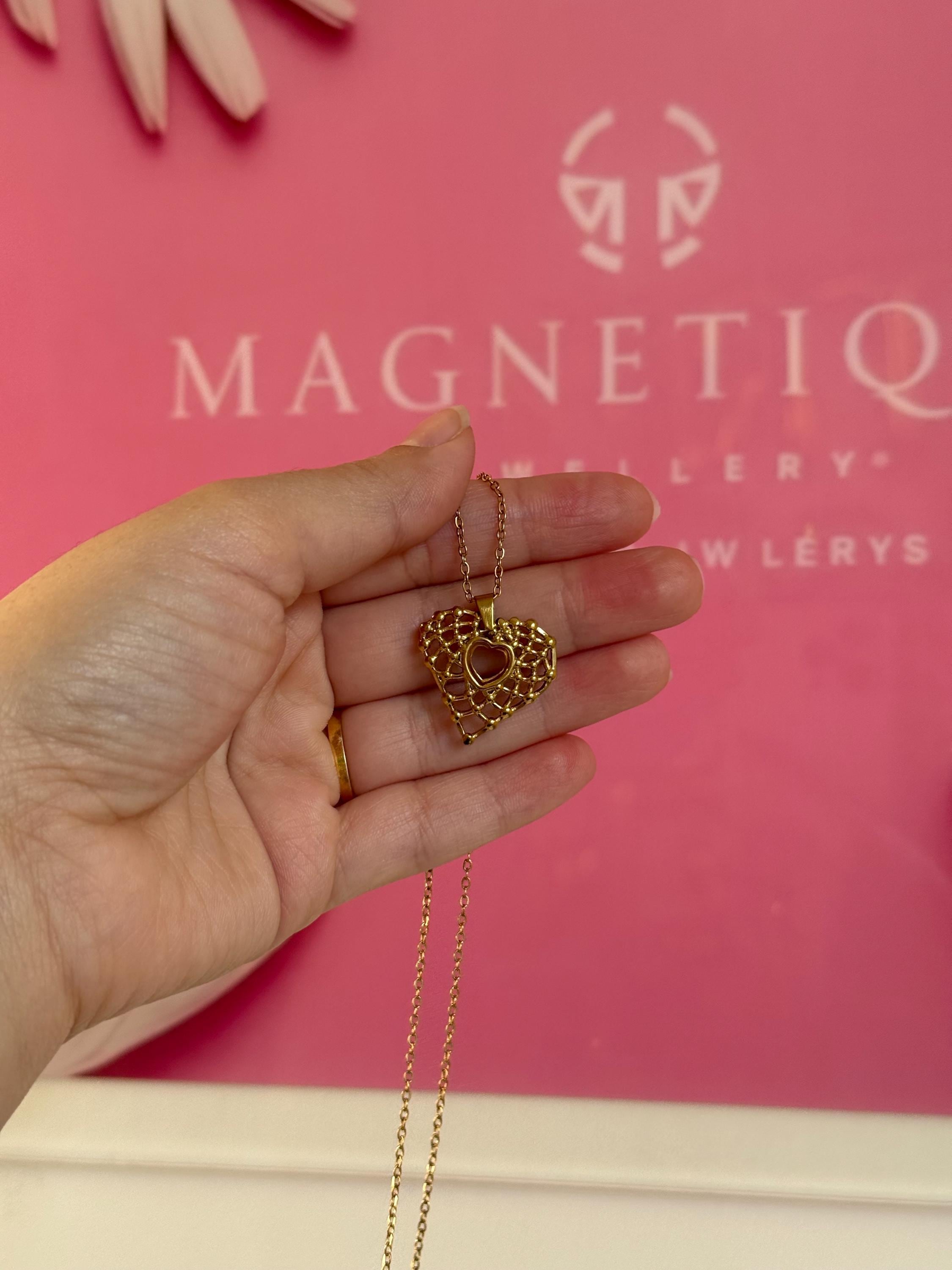 Discover timeless elegance with this Heart Pendant Gold Necklace from Magnetique Jewellery. Crafted from durable stainless steel with an 18k gold plating finish, this stunning piece is designed to add a touch of romance and sophistication to your everyday style. The intricate lattice-style heart pendant features a delicate hollow center, making it a versatile accessory perfect for layering or wearing solo for a subtle, feminine statement.