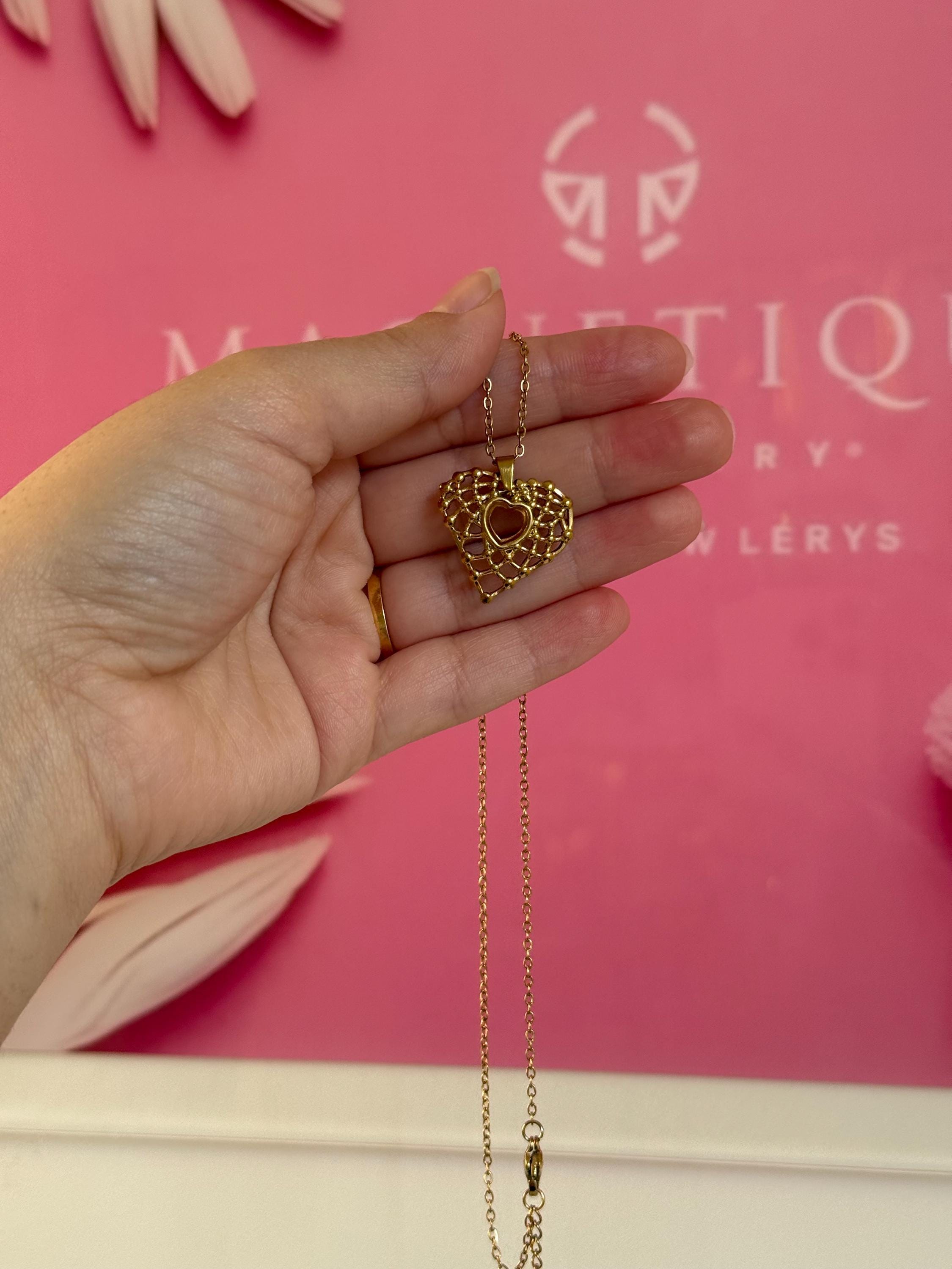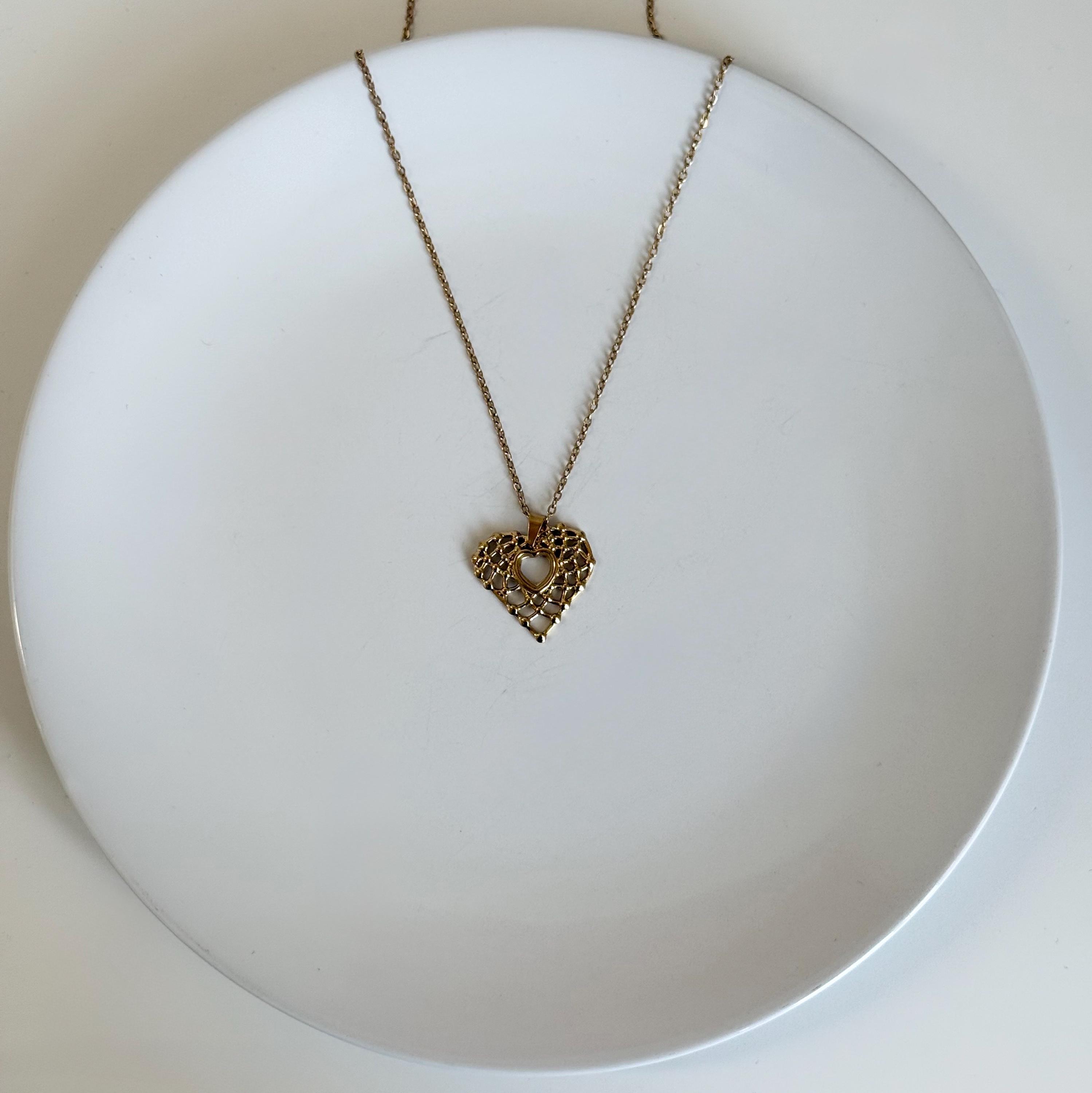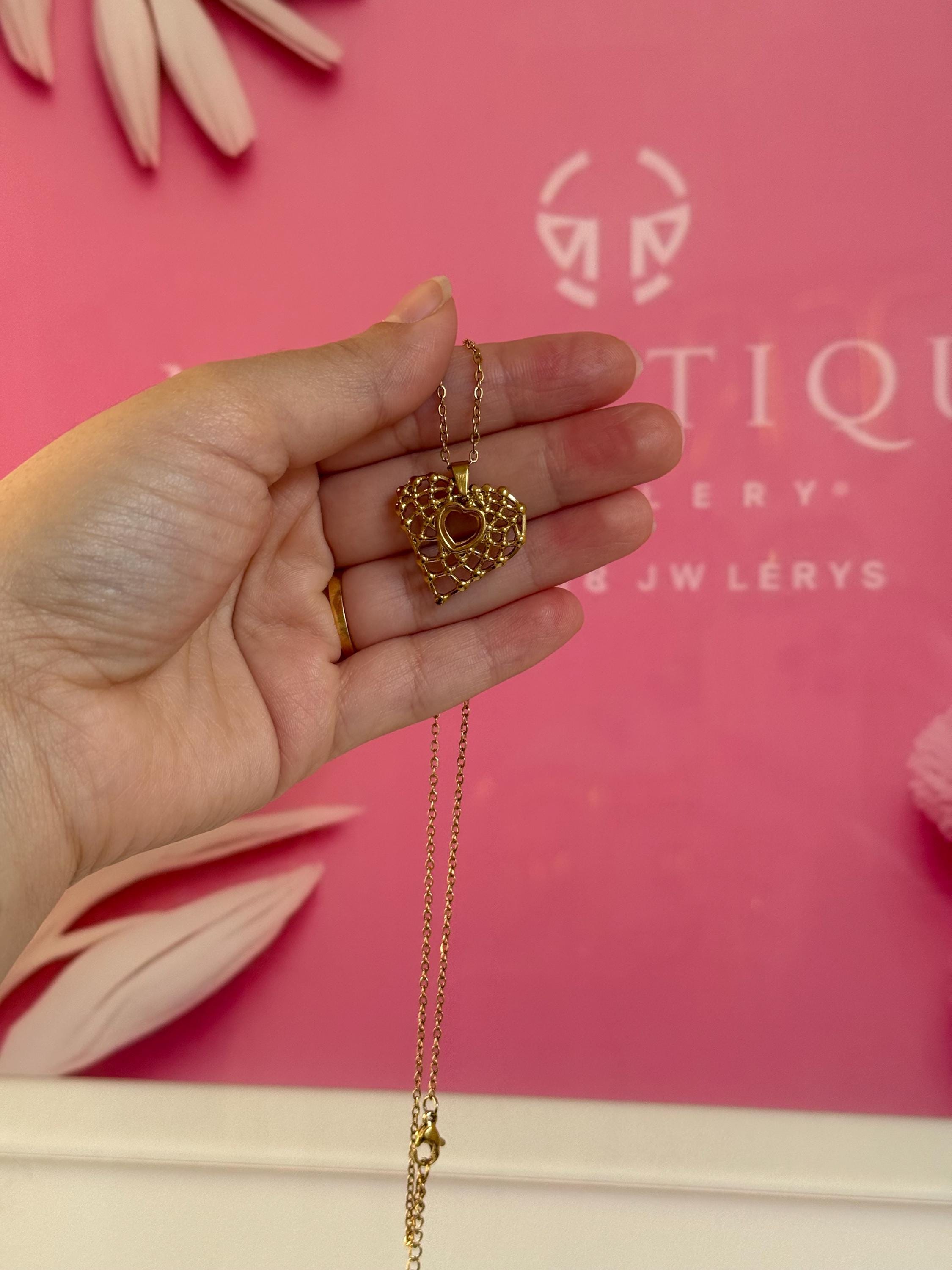 Key features: - Made from high-quality stainless steel with 18k gold plating - Heart-shaped pendant with intricate lattice design and hollow center - Lightweight, tarnish-resistant, and suitable for everyday wear - Adjustable chain length for versatile styling - Elegant and feminine design, perfect for layering or wearing alone