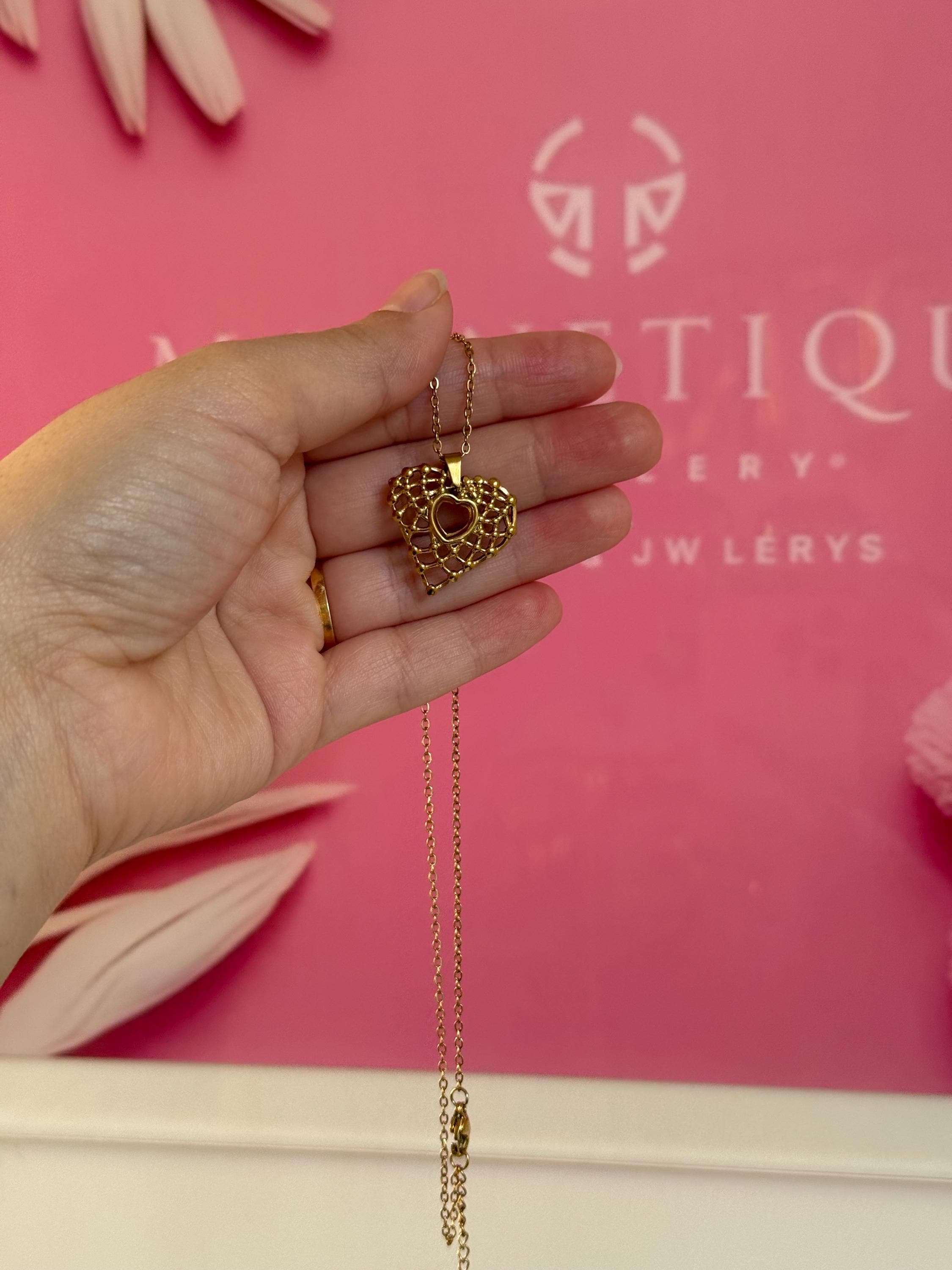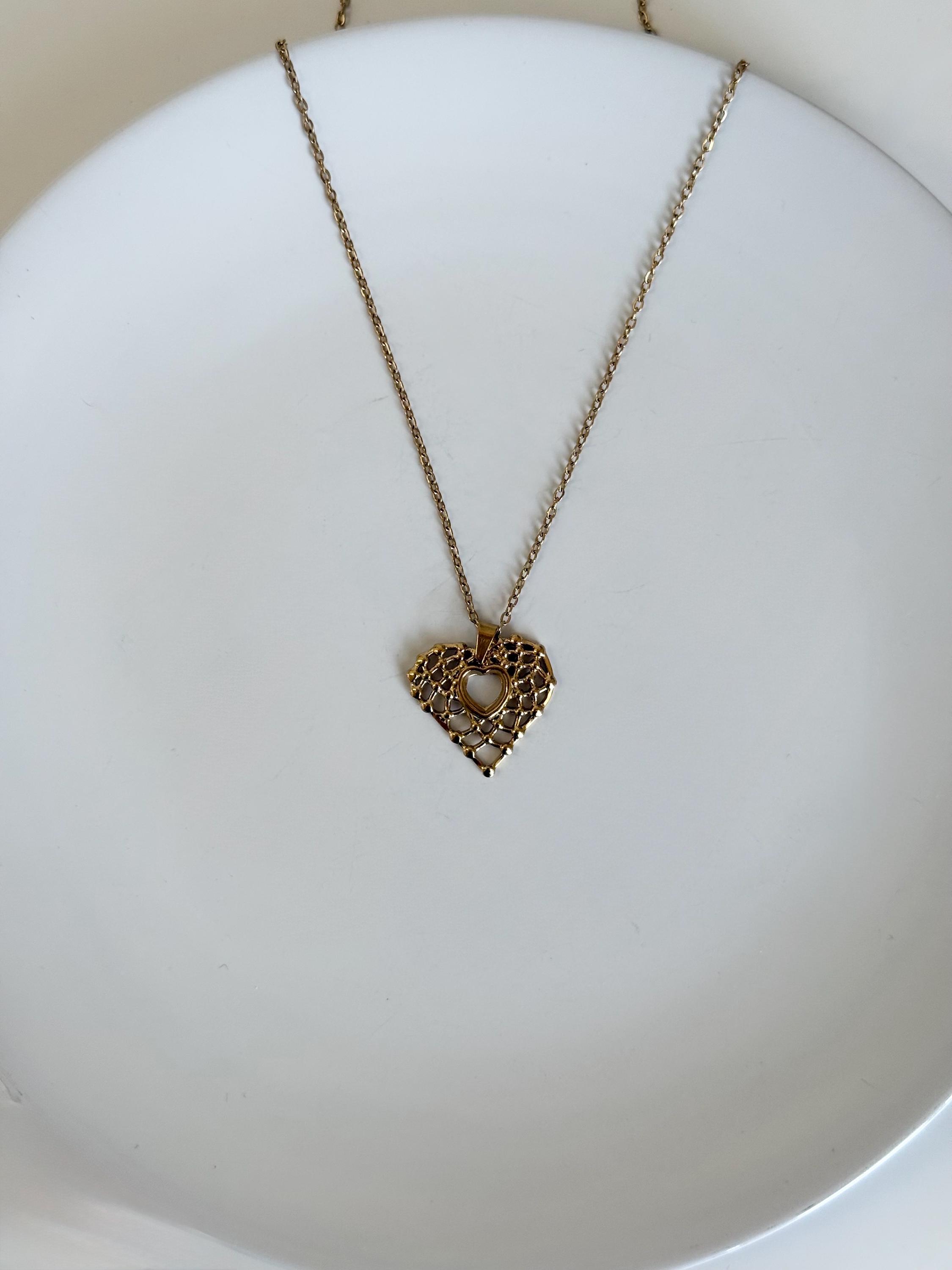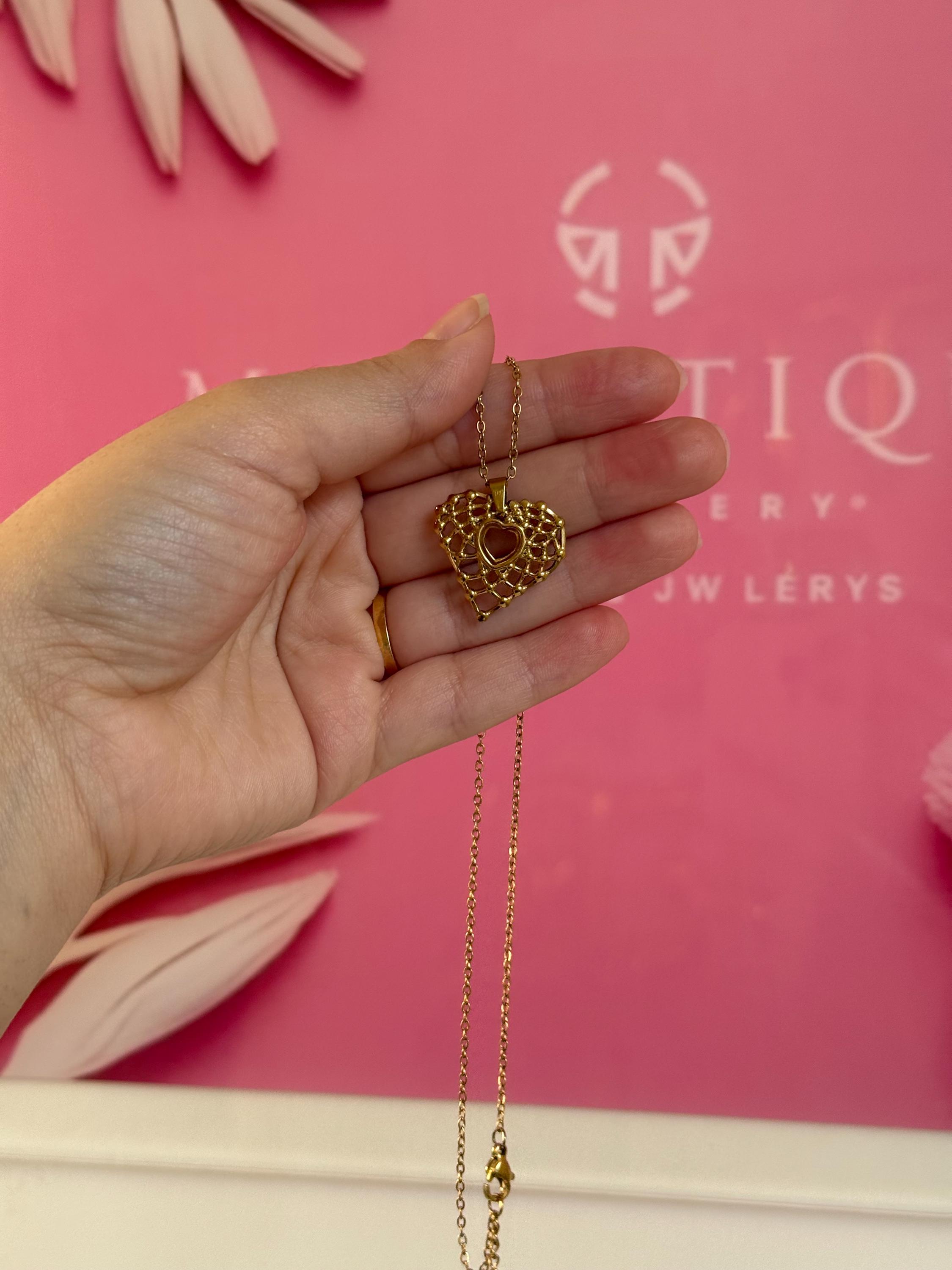 Key features: - Made from high-quality stainless steel with 18k gold plating - Heart-shaped pendant with intricate lattice design and hollow center - Lightweight, tarnish-resistant, and suitable for everyday wear - Adjustable chain length for versatile styling - Elegant and feminine design, perfect for layering or wearing alone