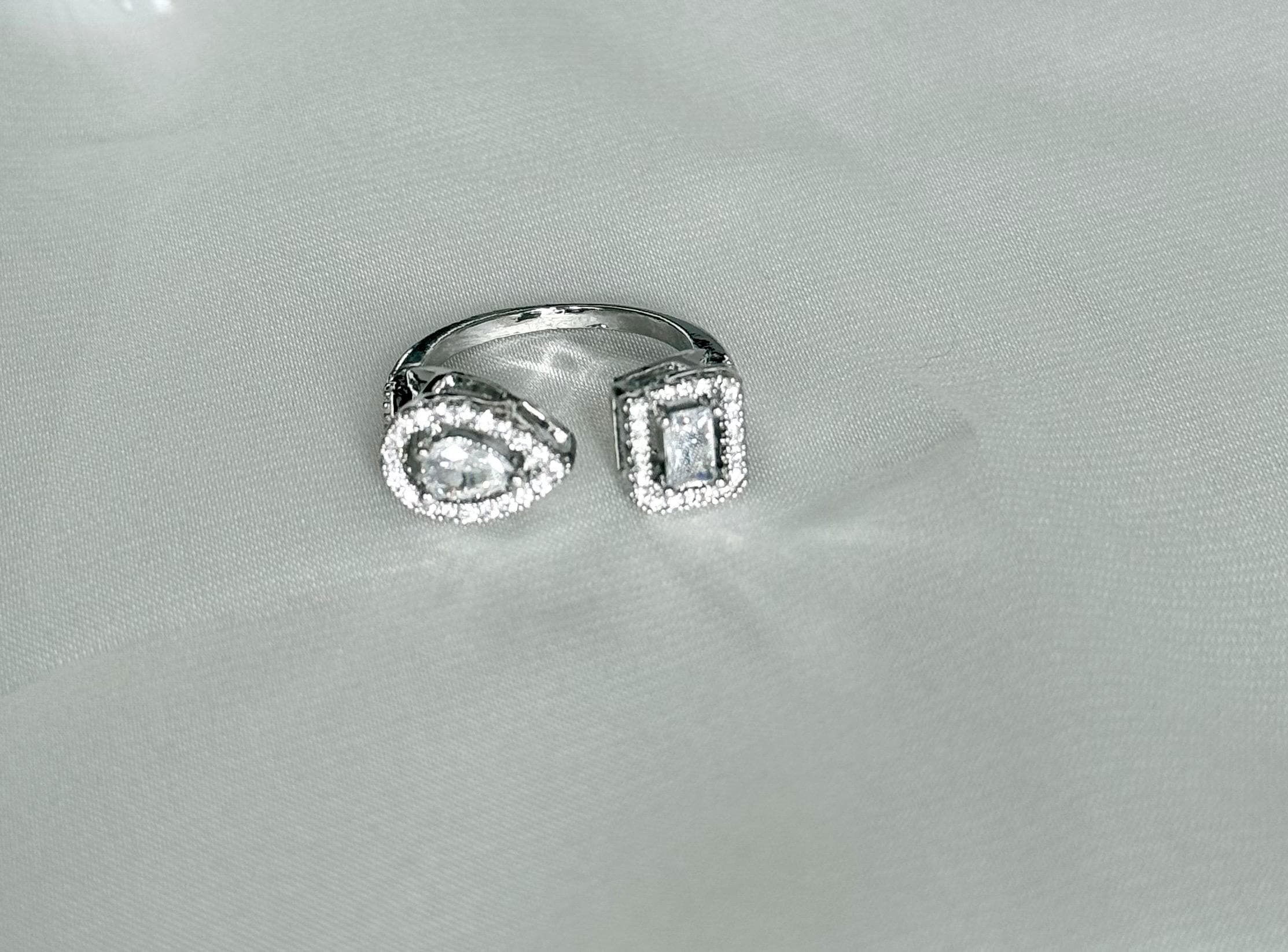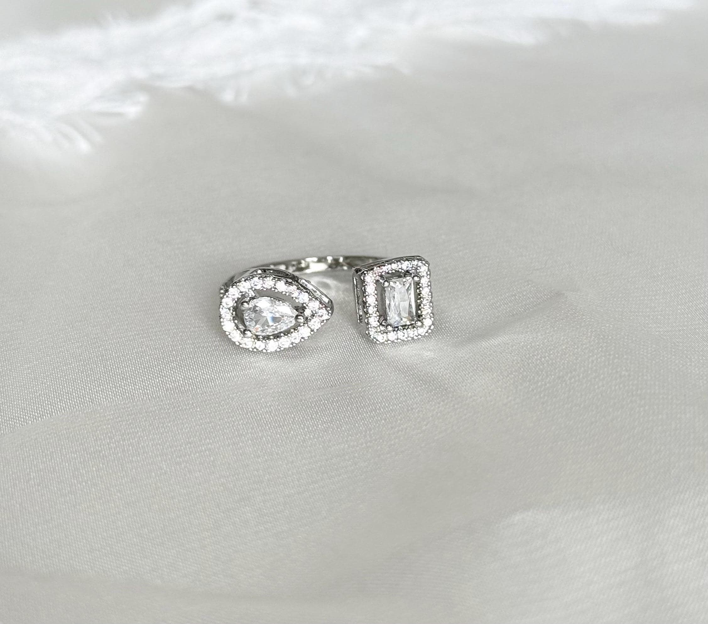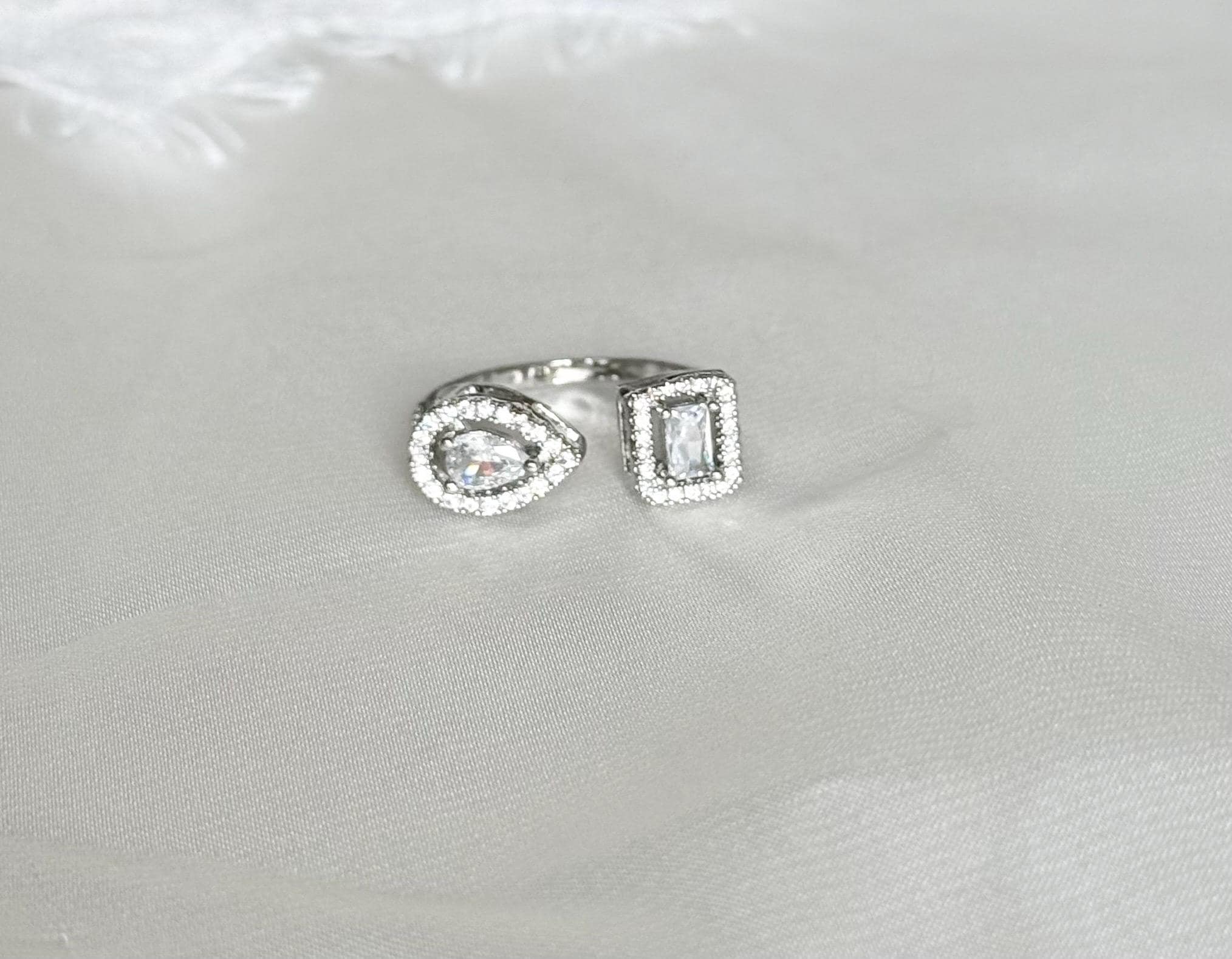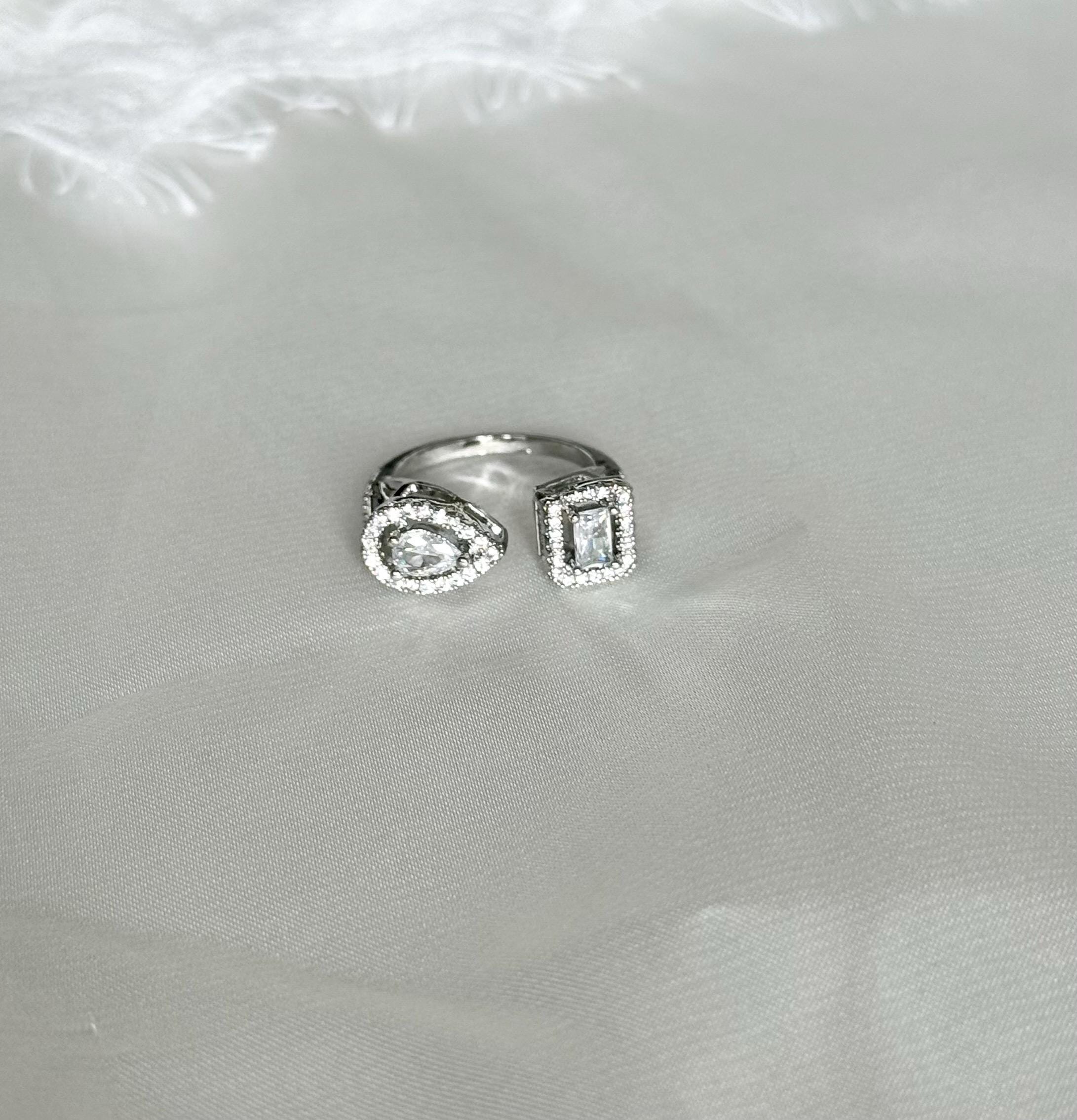Elevate your jewelry collection with this stunning cubic zirconia ring, a perfect blend of modern elegance and versatile style. Designed as an open adjustable ring, it features a captivating double-stone design with a pear-cut and an emerald-cut cubic zirconia, each beautifully framed by a sparkling halo of clear stones. The asymmetrical style creates a contemporary look that is both eye-catching and sophisticated, making it an ideal statement piece for everyday wear or special occasions.