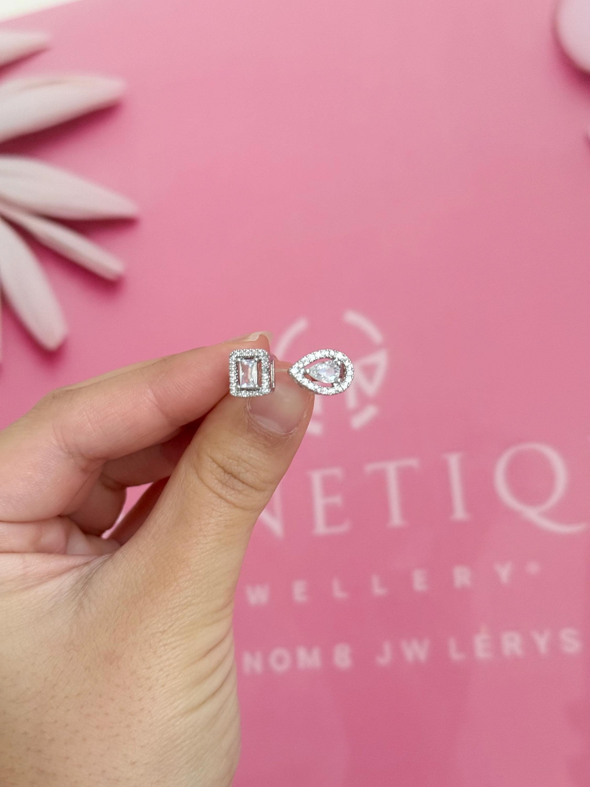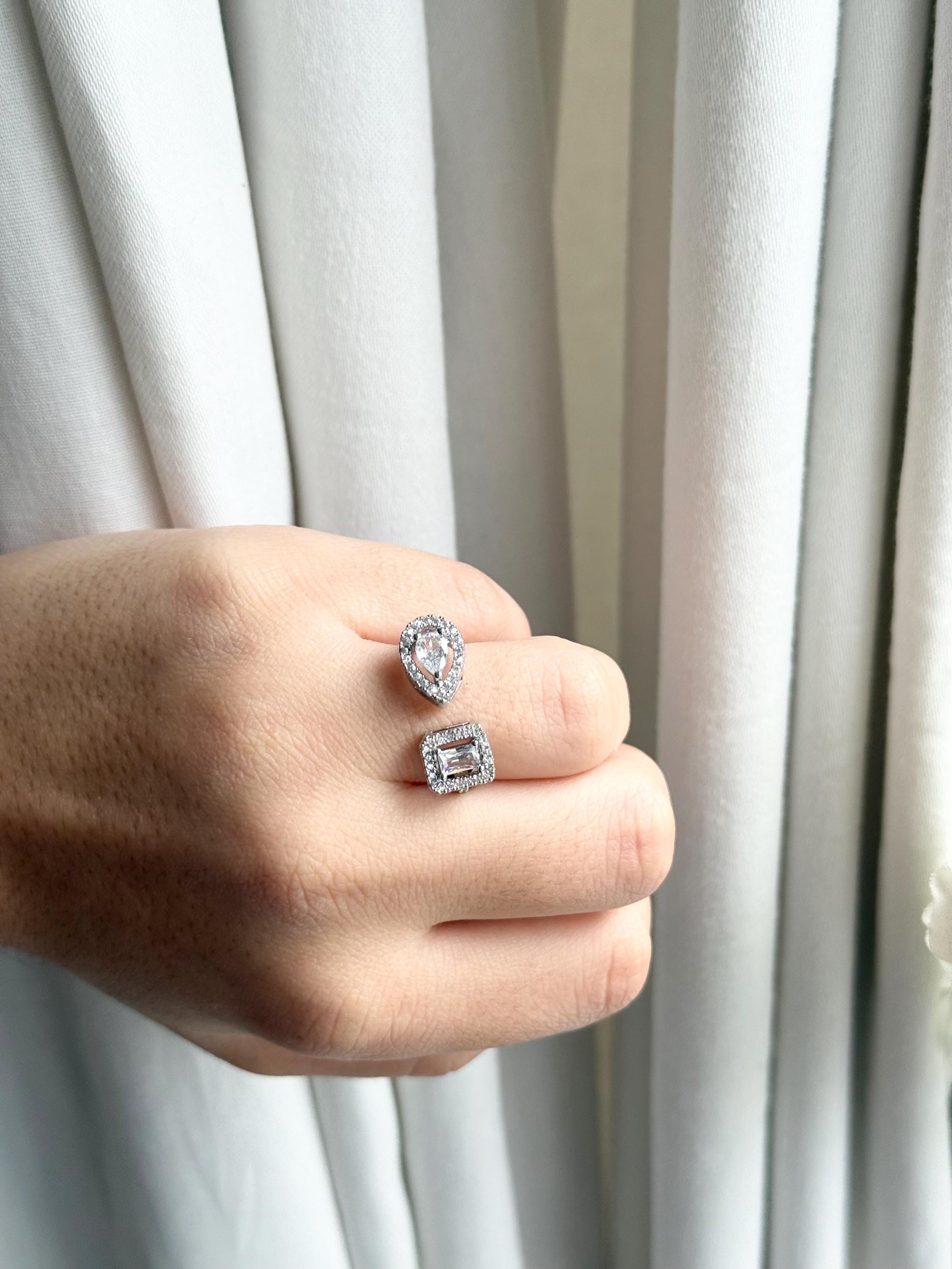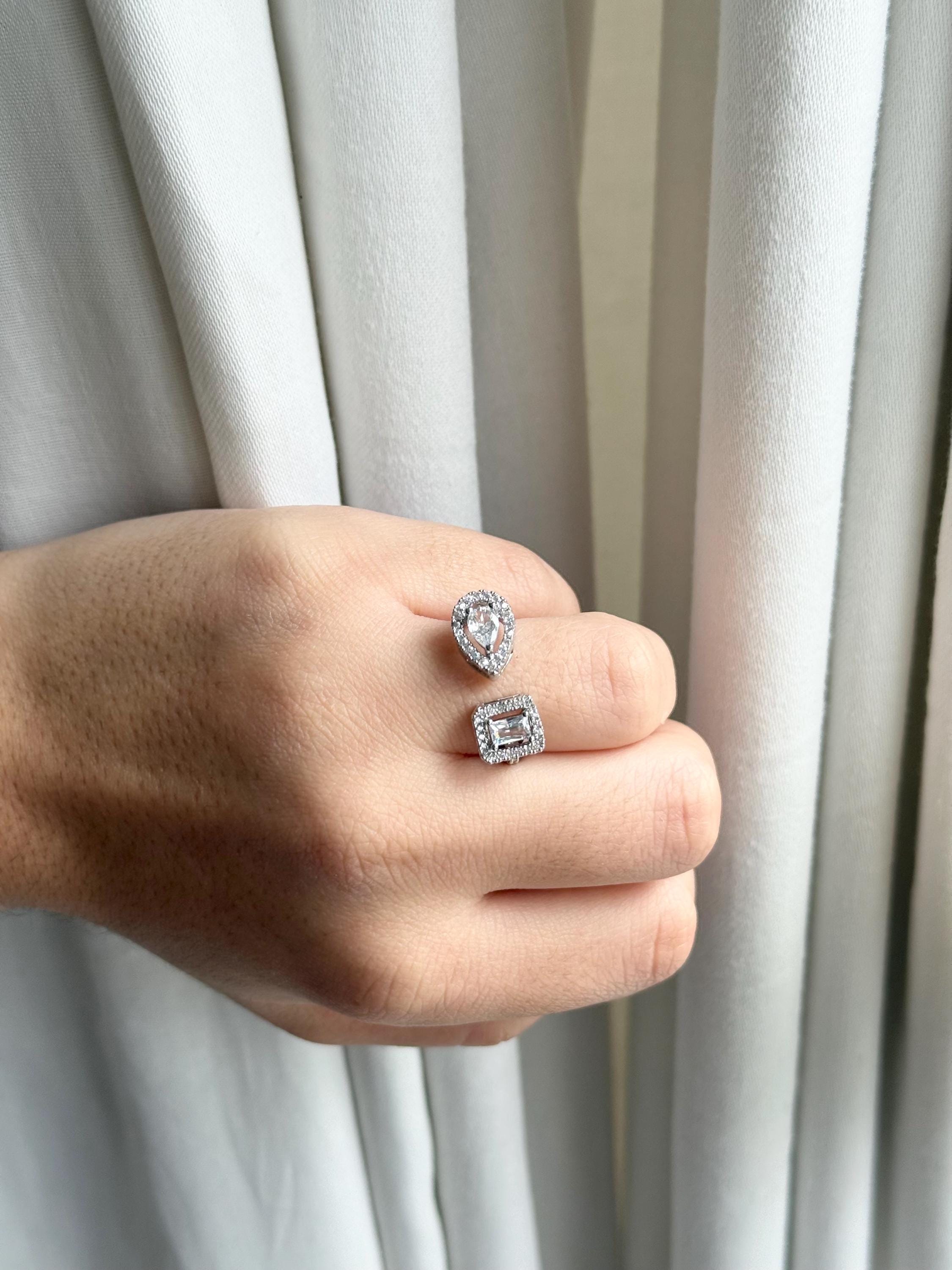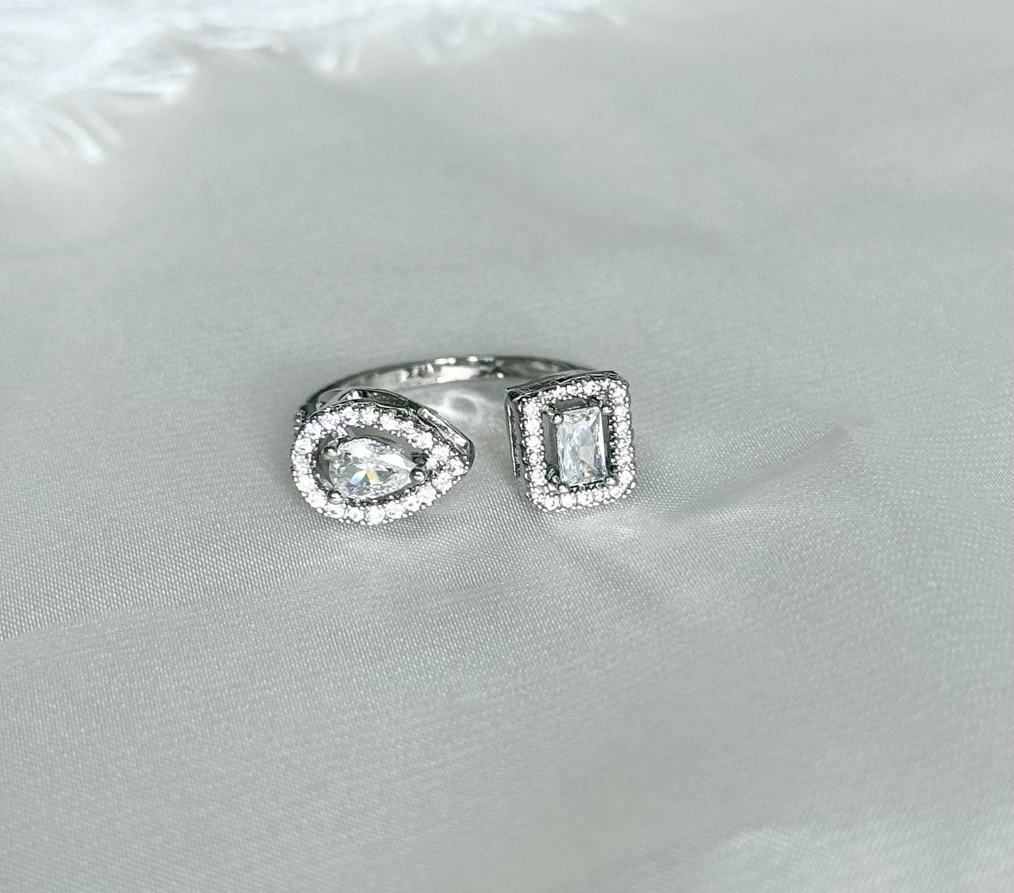 Elevate your jewelry collection with this stunning cubic zirconia ring, a perfect blend of modern elegance and versatile style. Designed as an open adjustable ring, it features a captivating double-stone design with a pear-cut and an emerald-cut cubic zirconia, each beautifully framed by a sparkling halo of clear stones. The asymmetrical style creates a contemporary look that is both eye-catching and sophisticated, making it an ideal statement piece for everyday wear or special occasions.