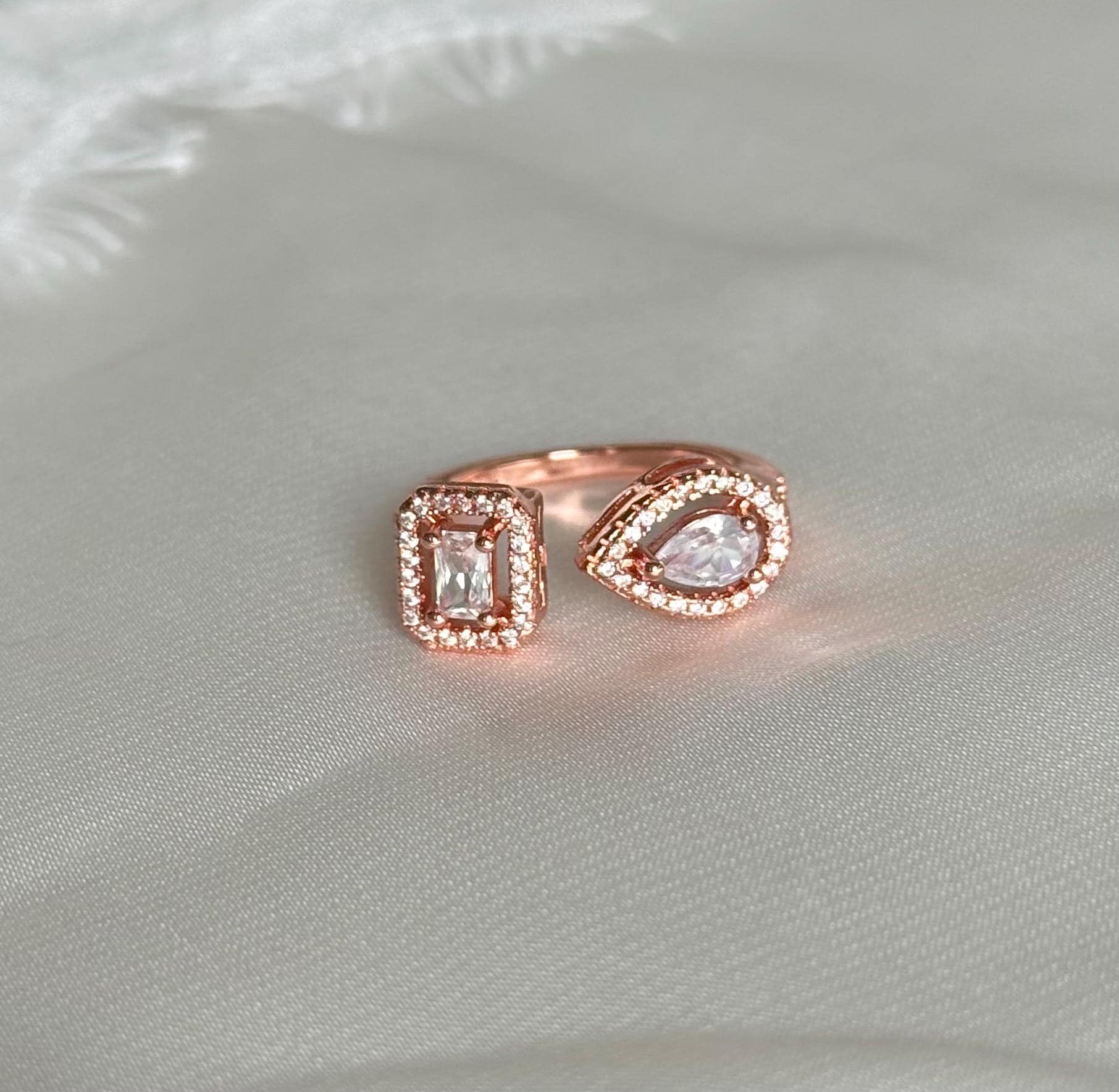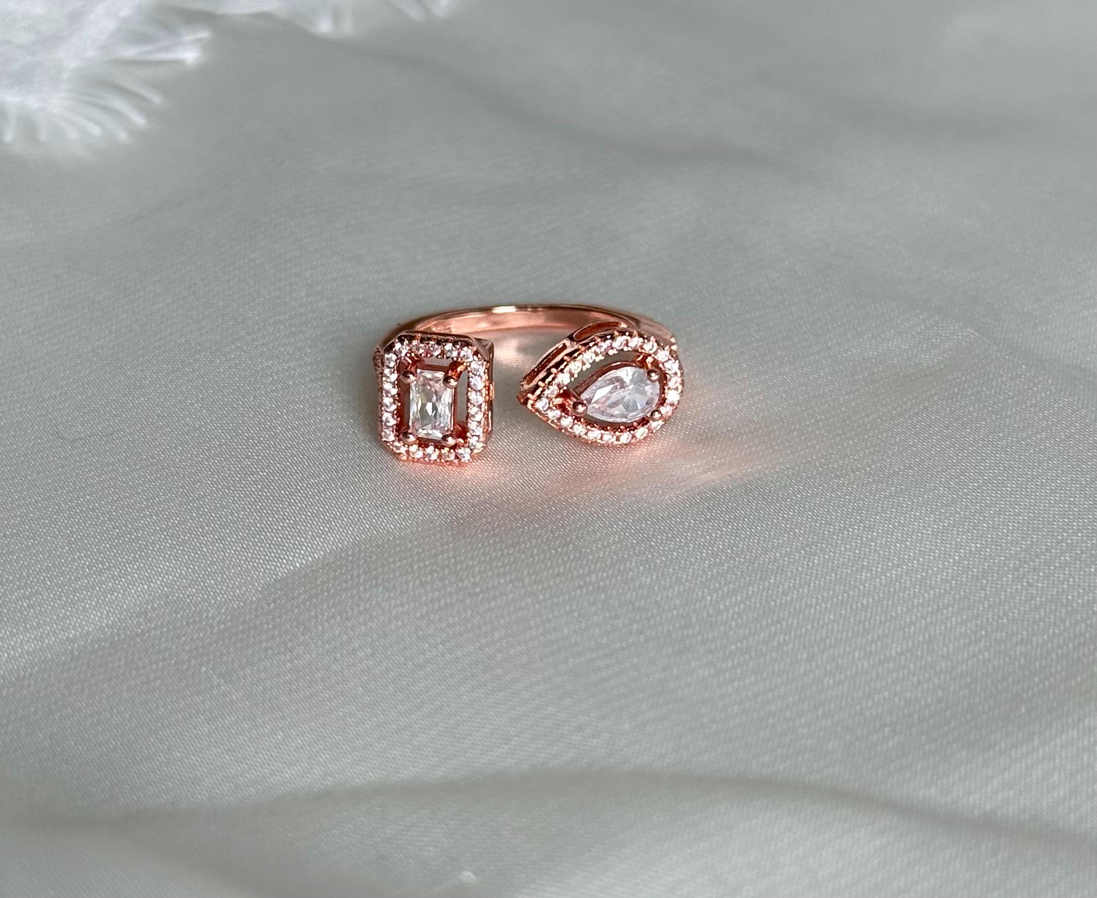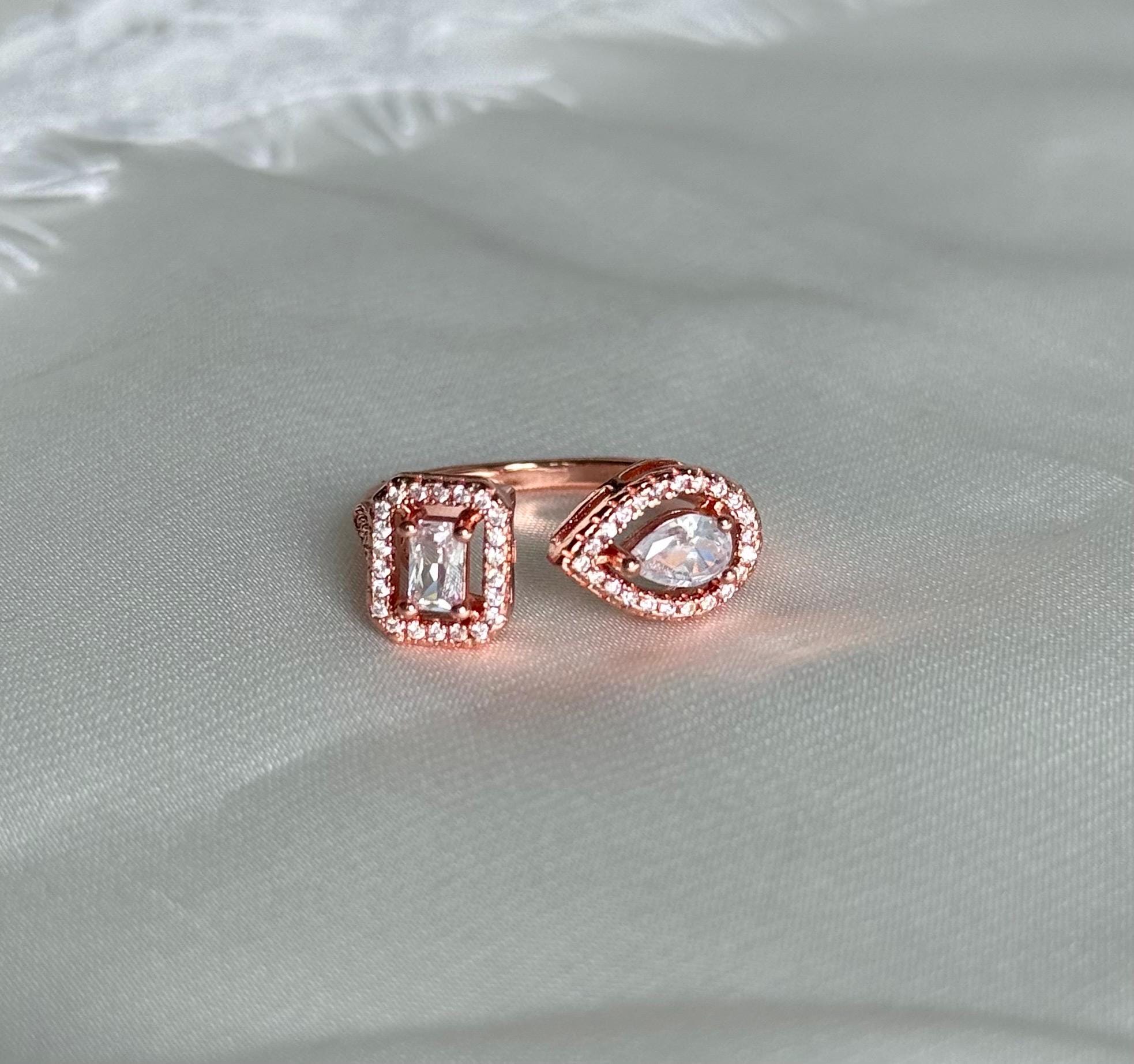 Key features: - Materials: High-quality cubic zirconia set in a silver-tone finish with rose gold accents - Design: Open, adjustable band for a comfortable fit - Stones: Pear-cut and emerald-cut cubic zirconia, surrounded by clear halos for extra sparkle - Dimensions: Perfect for stacking or wearing alone for a sleek, modern look - Care: Avoid contact with harsh chemicals; clean with a soft cloth to maintain brilliance