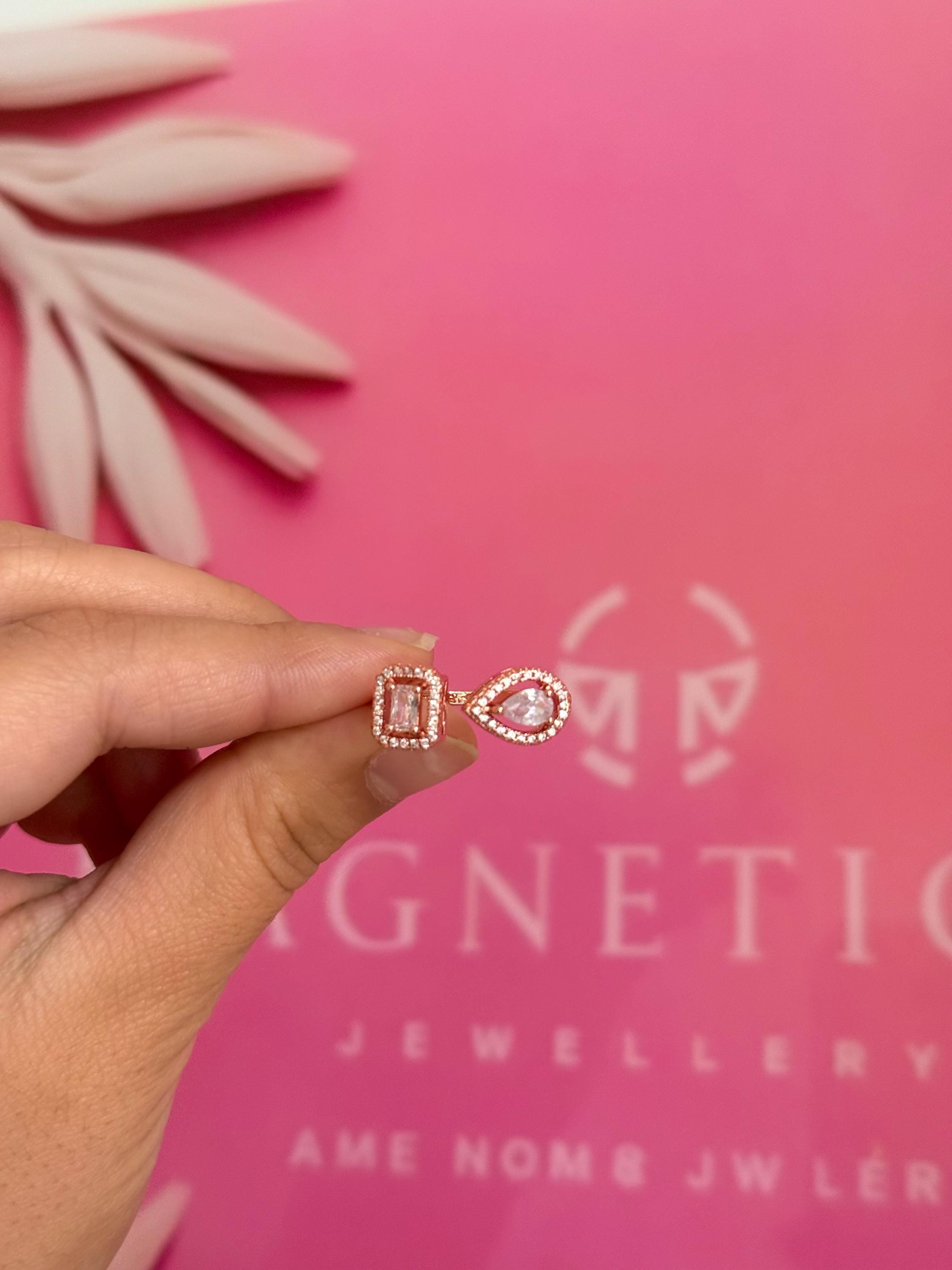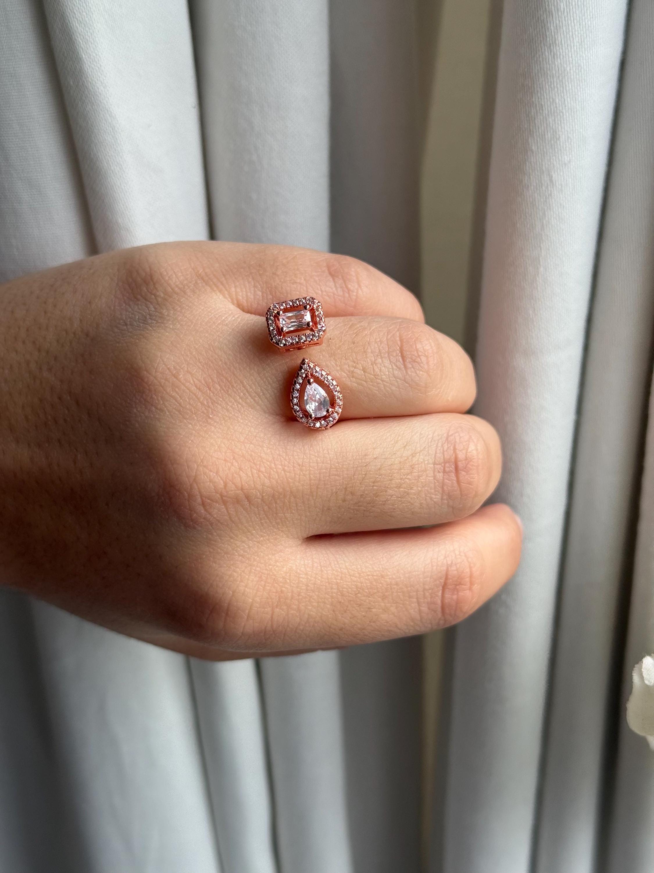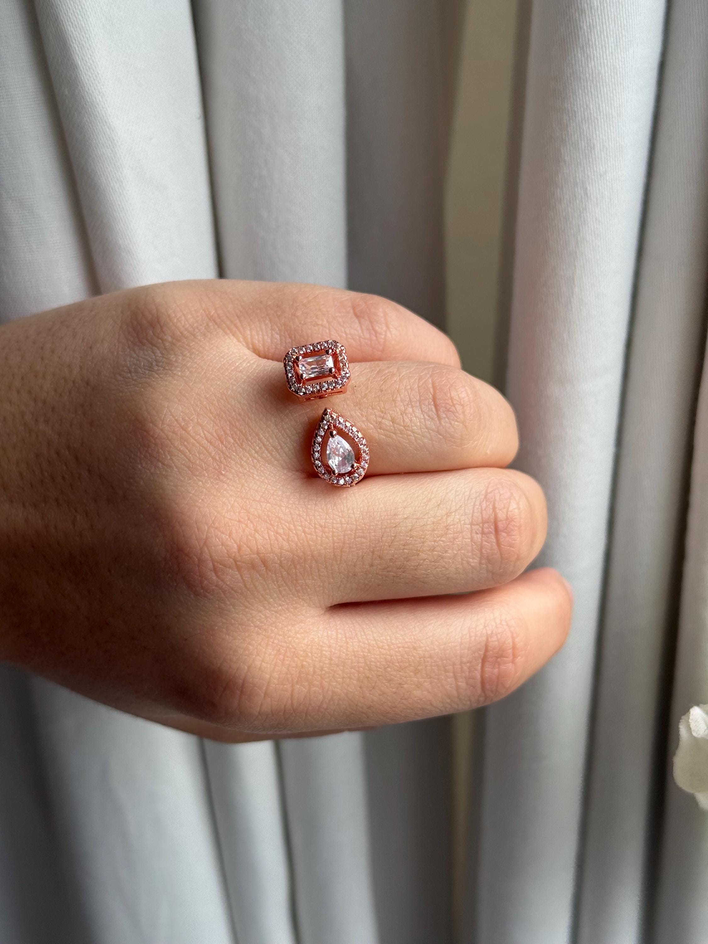Key features: - Materials: High-quality cubic zirconia set in a silver-tone finish with rose gold accents - Design: Open, adjustable band for a comfortable fit - Stones: Pear-cut and emerald-cut cubic zirconia, surrounded by clear halos for extra sparkle - Dimensions: Perfect for stacking or wearing alone for a sleek, modern look - Care: Avoid contact with harsh chemicals; clean with a soft cloth to maintain brilliance