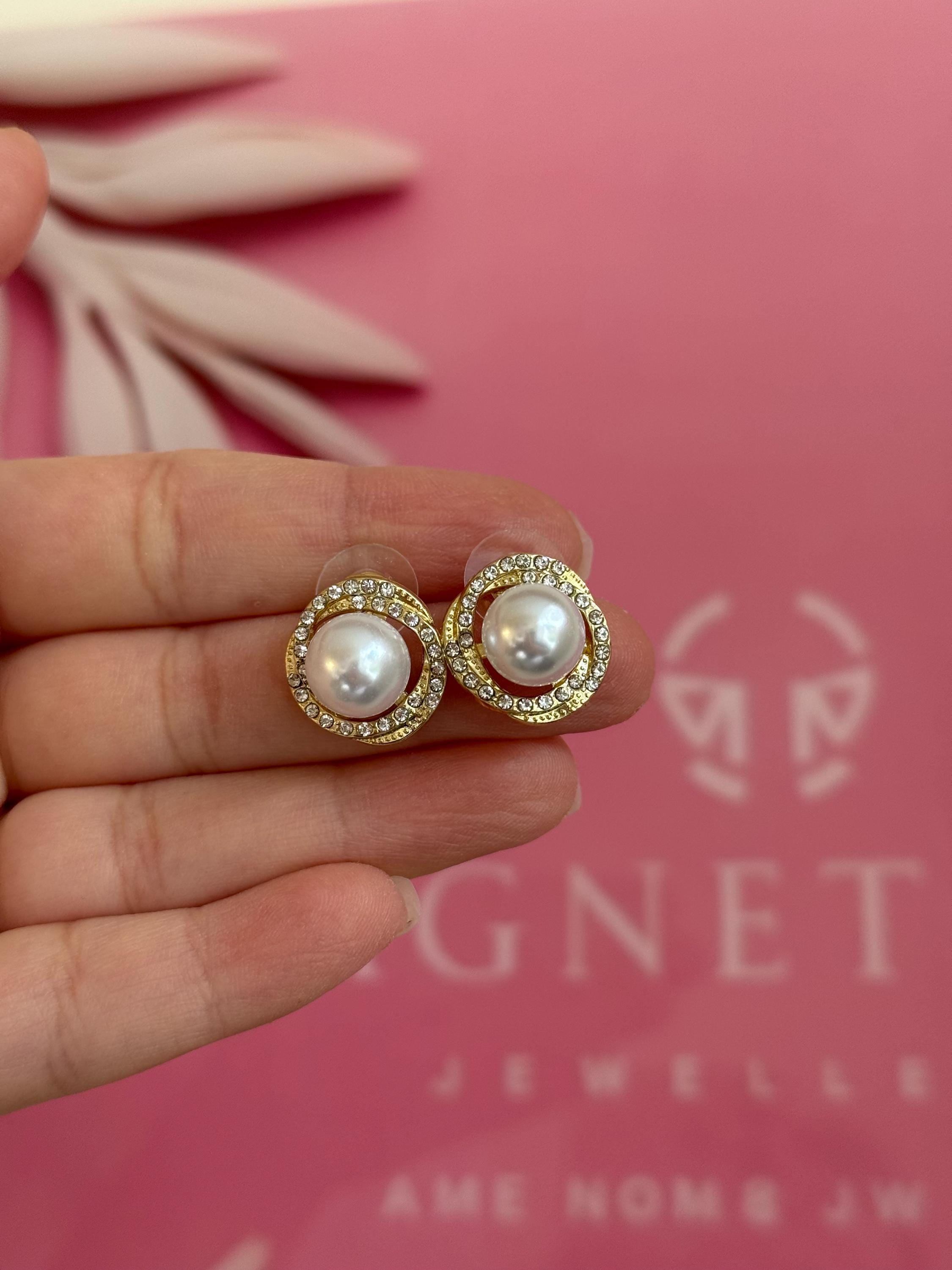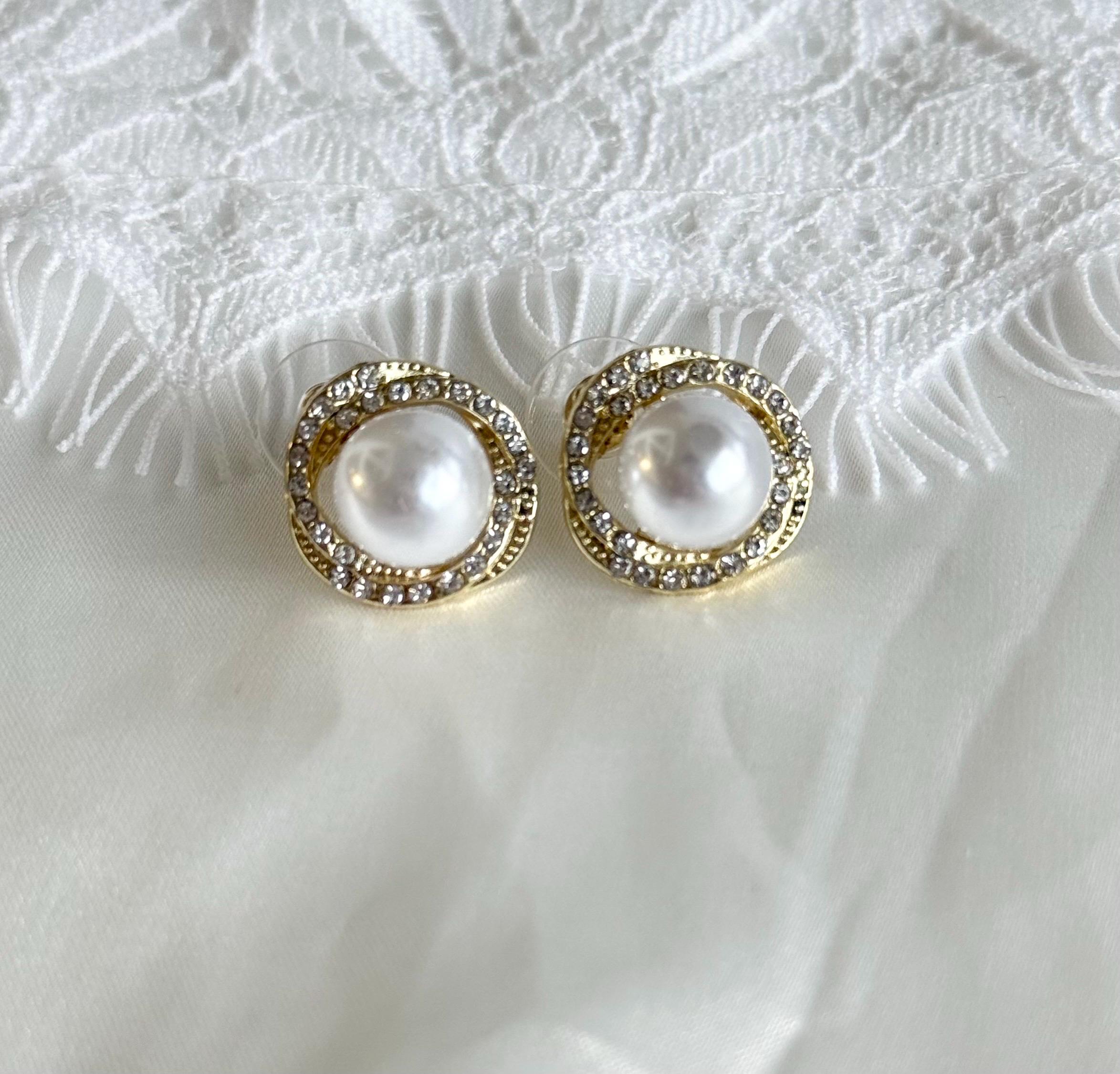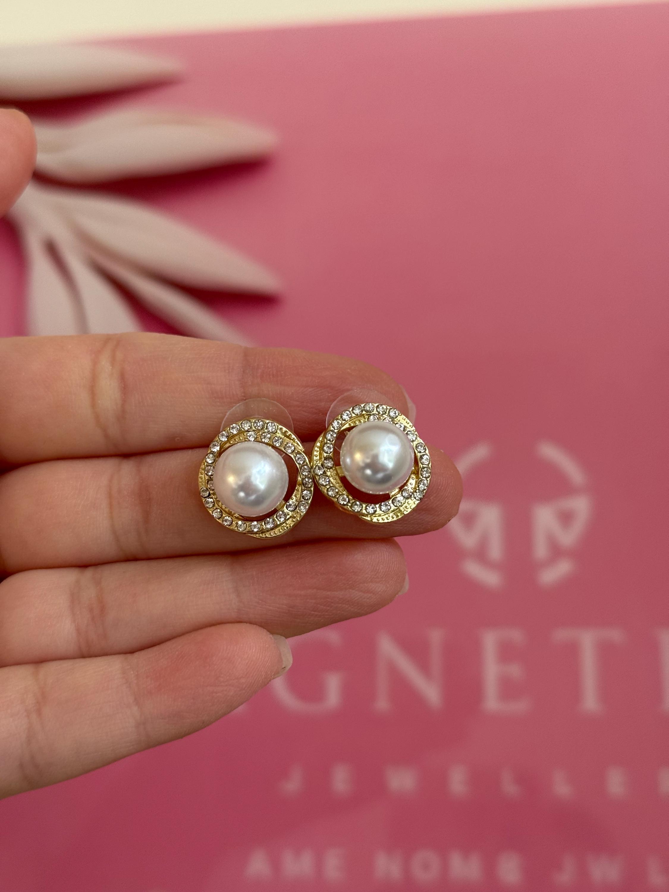 Add timeless elegance to your look with these gold halo pearl stud earrings, designed to elevate both everyday outfits and special occasions.