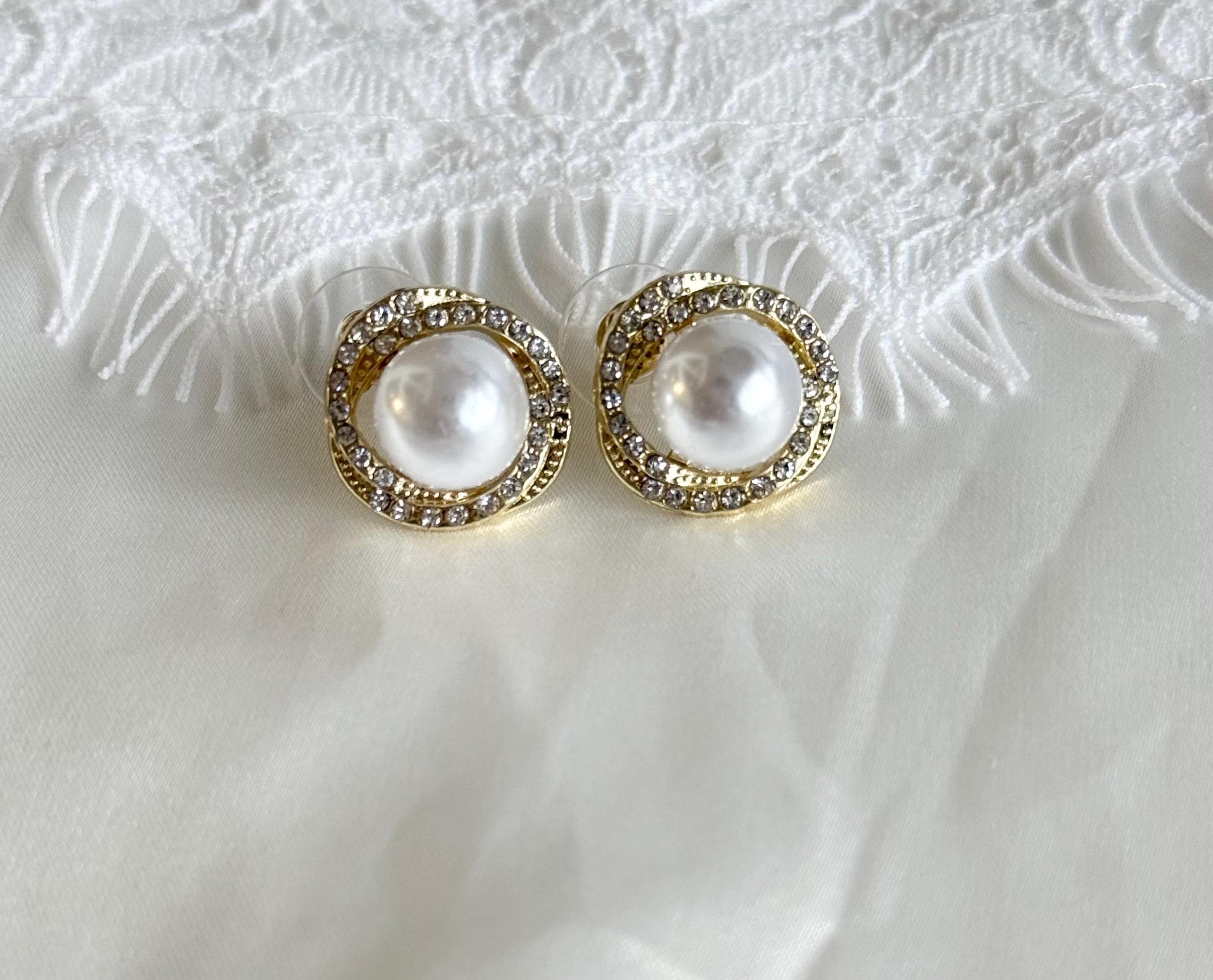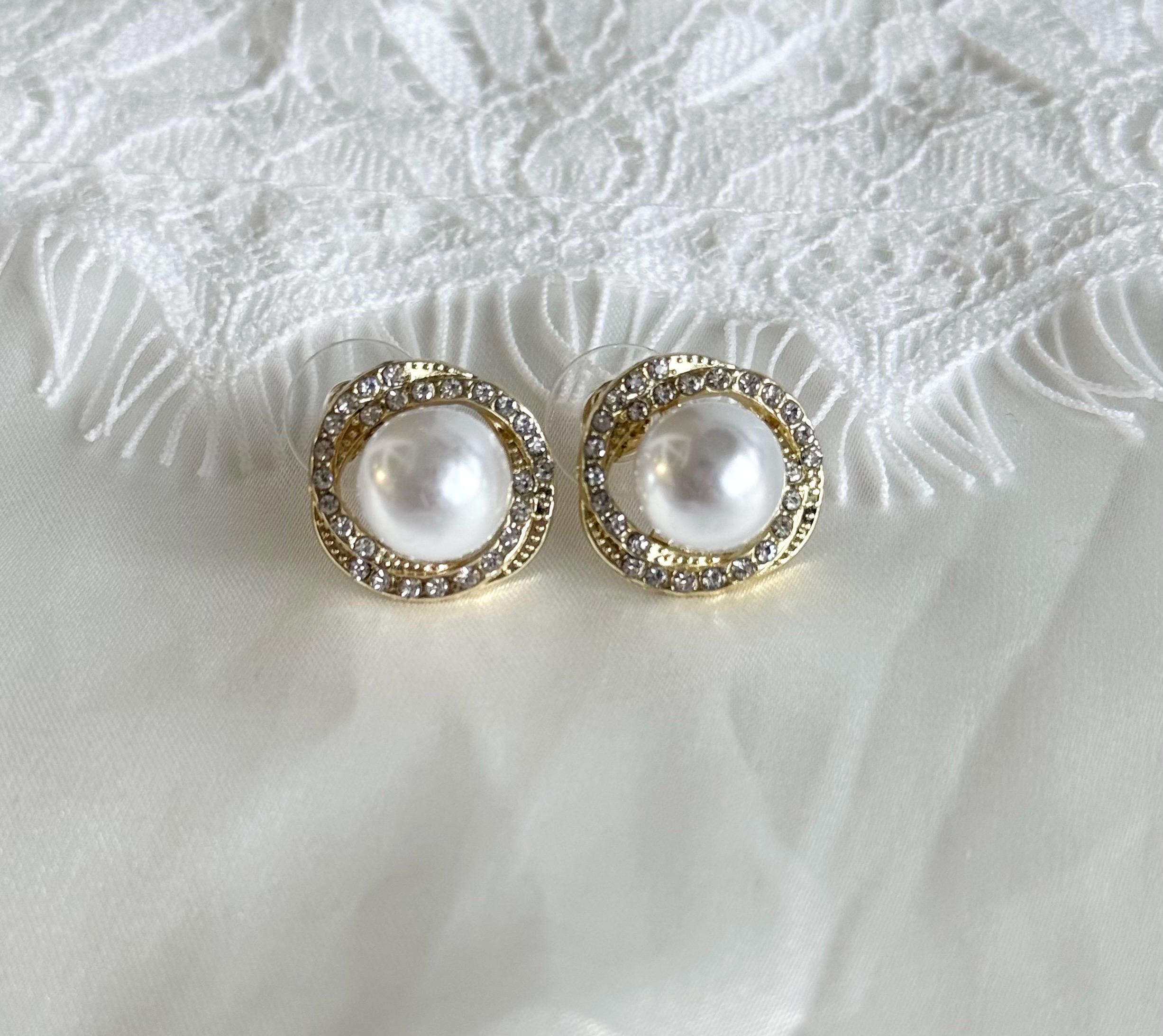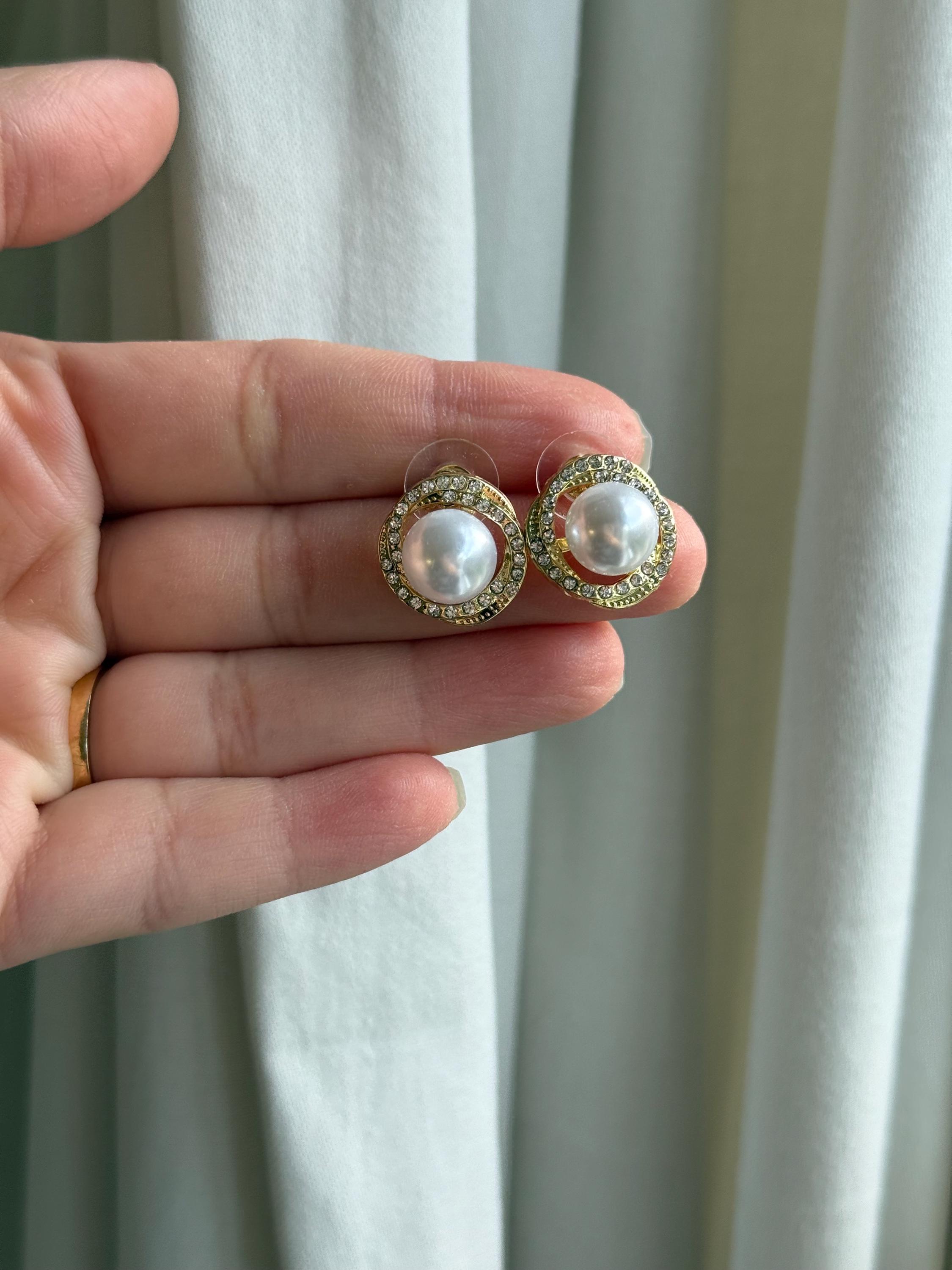 Each earring features a luminous faux pearl at the center, surrounded by a sparkling circle of clear crystals, set in a polished gold-tone finish. The classic halo design gives a luxurious, refined look inspired by vintage and bridal jewellery styles.