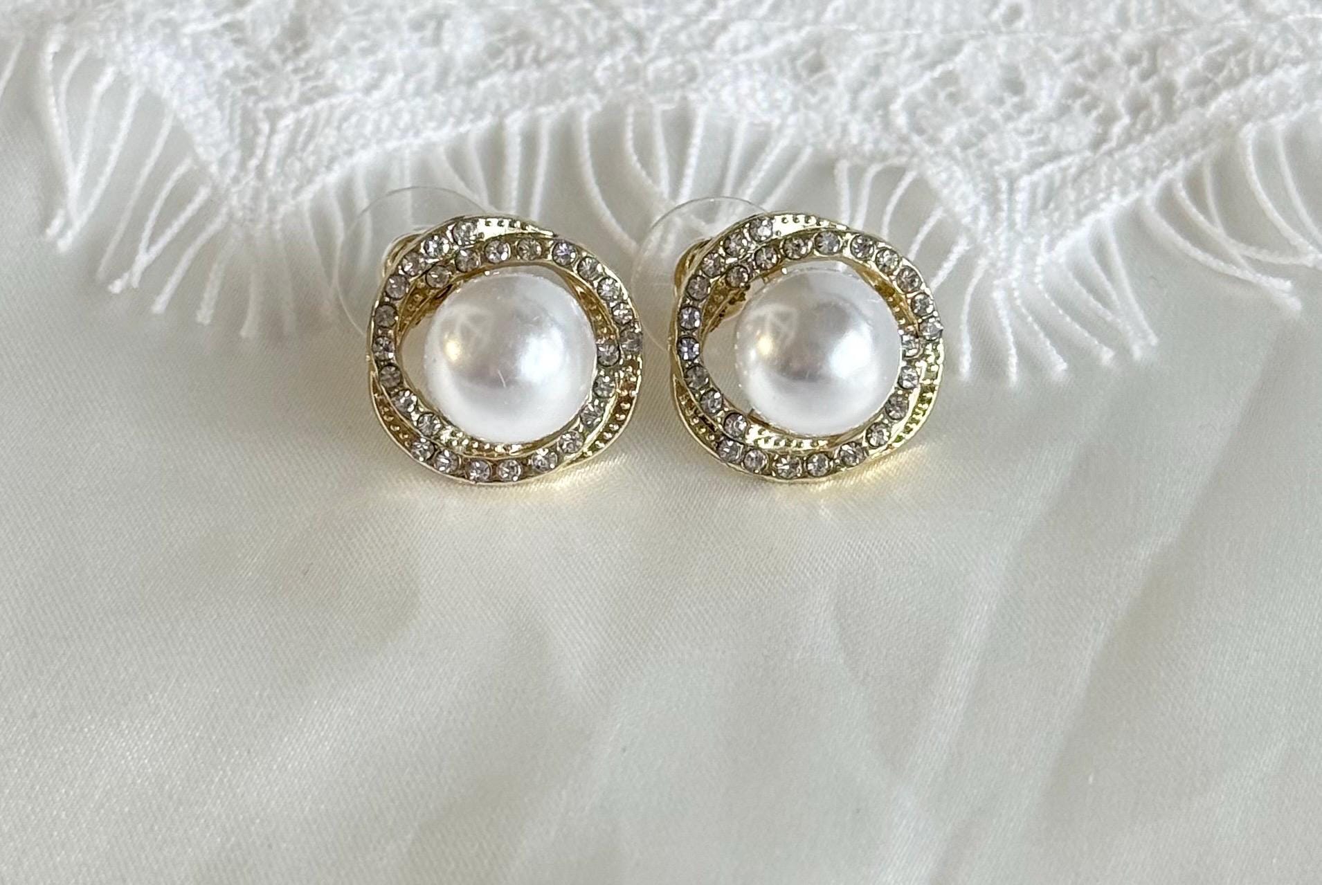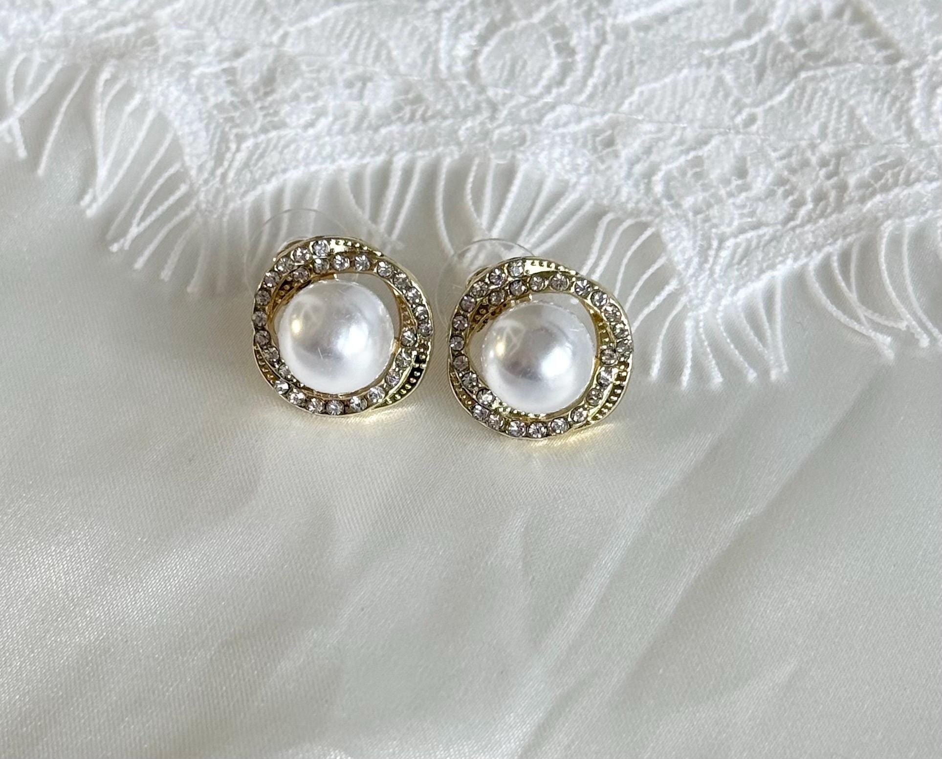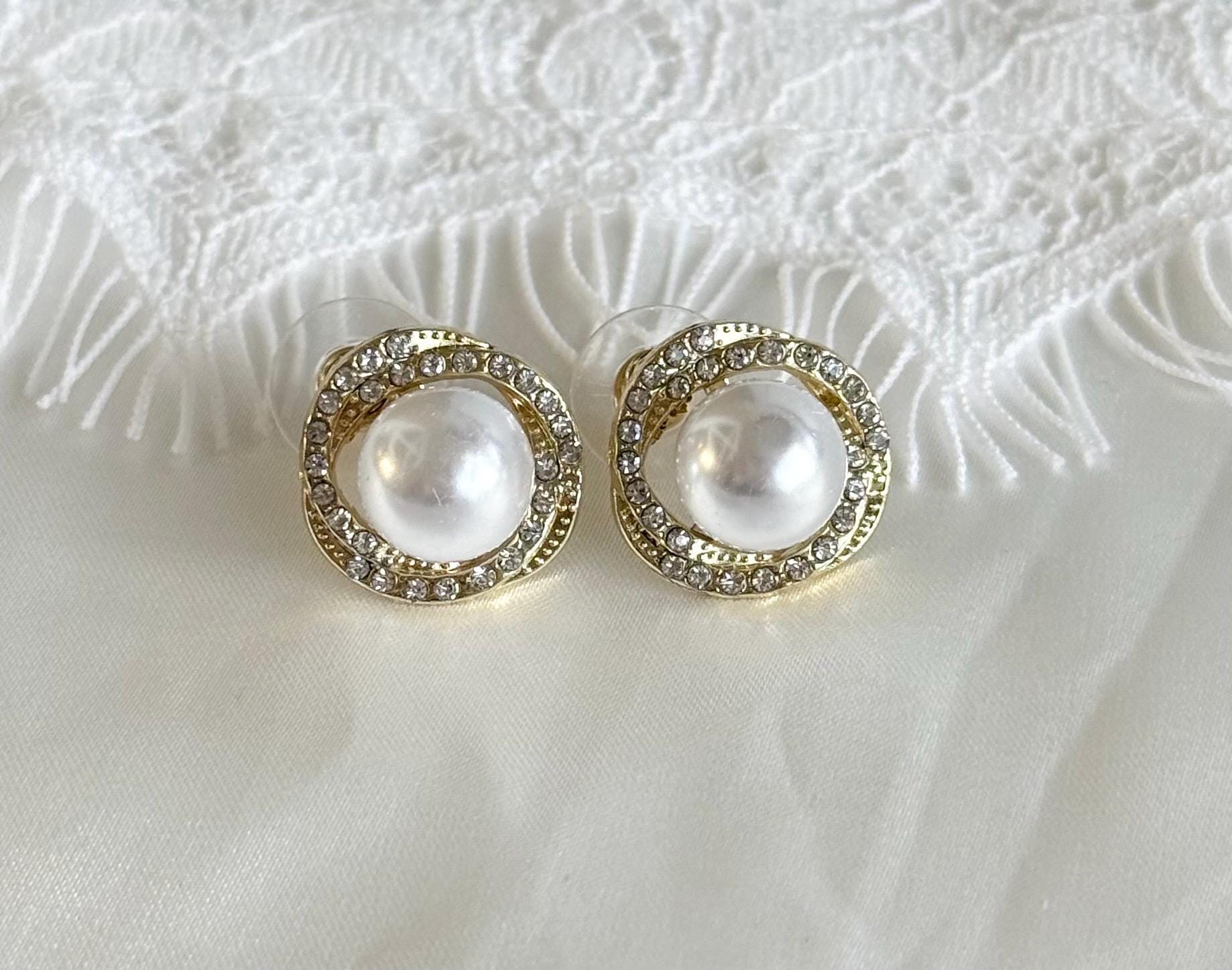 Each earring features a luminous faux pearl at the center, surrounded by a sparkling circle of clear crystals, set in a polished gold-tone finish. The classic halo design gives a luxurious, refined look inspired by vintage and bridal jewellery styles.