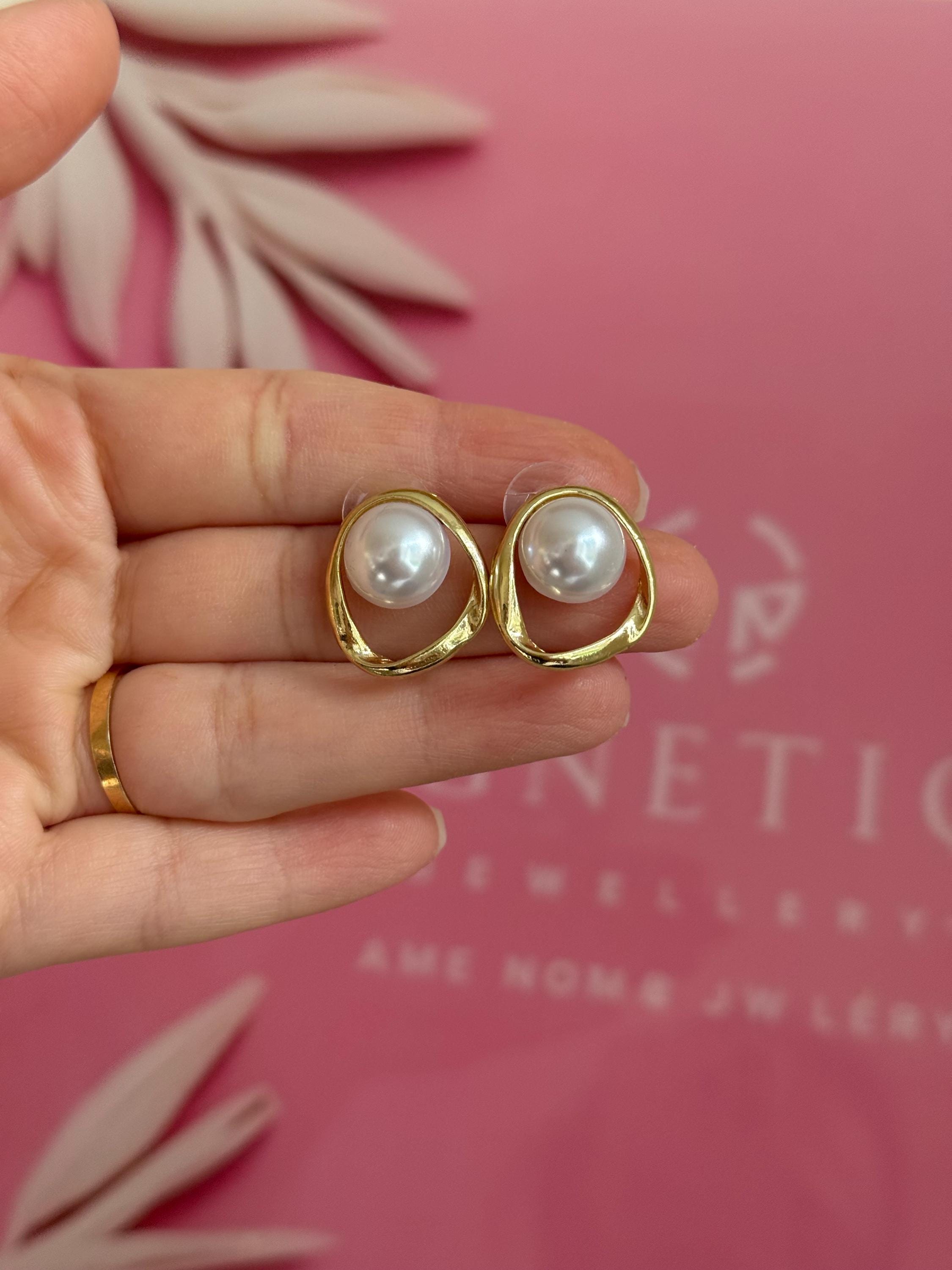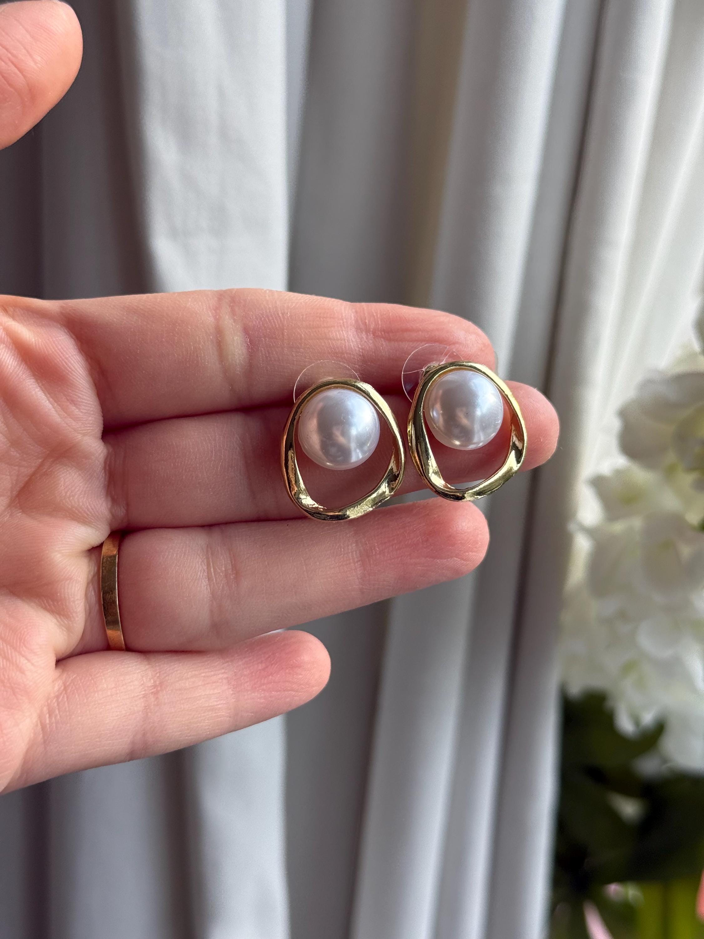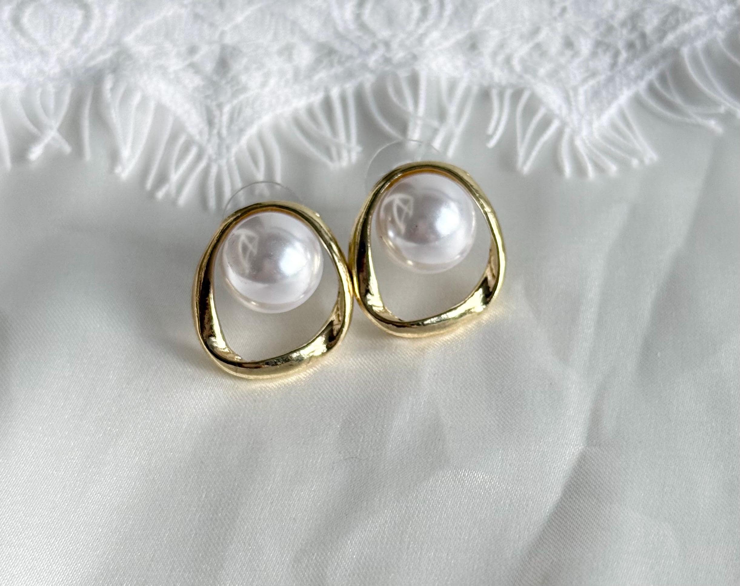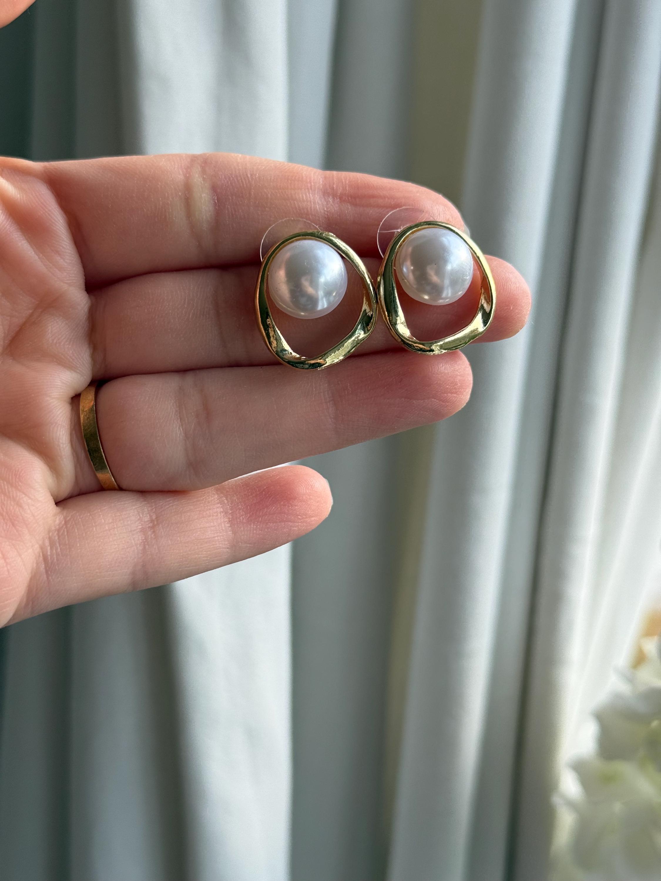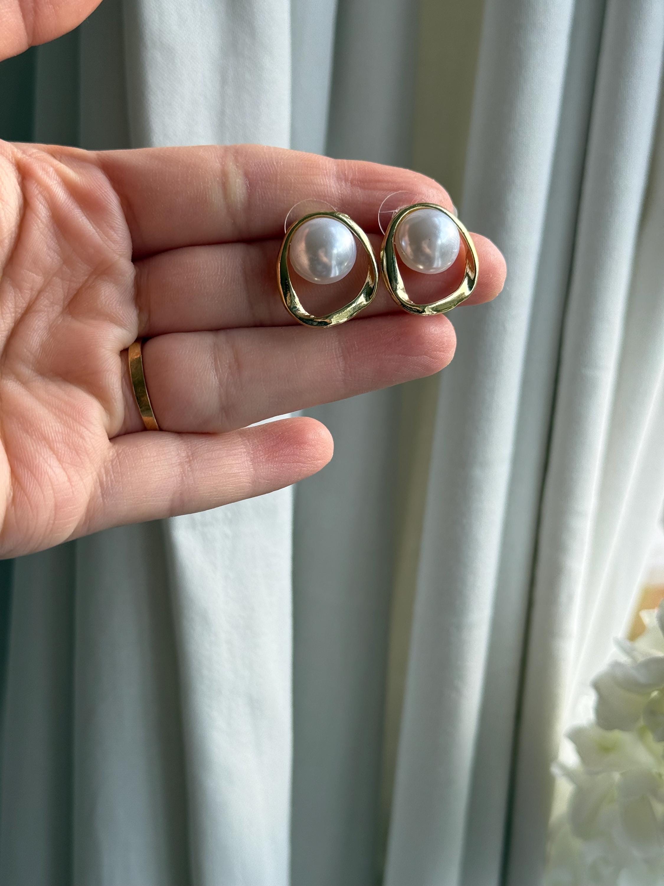 Each earring features a smooth cabochon faux pearl, bezel-set inside an organic open gold frame with a softly irregular shape. The result is a refined yet contemporary look that feels both minimal and luxurious.