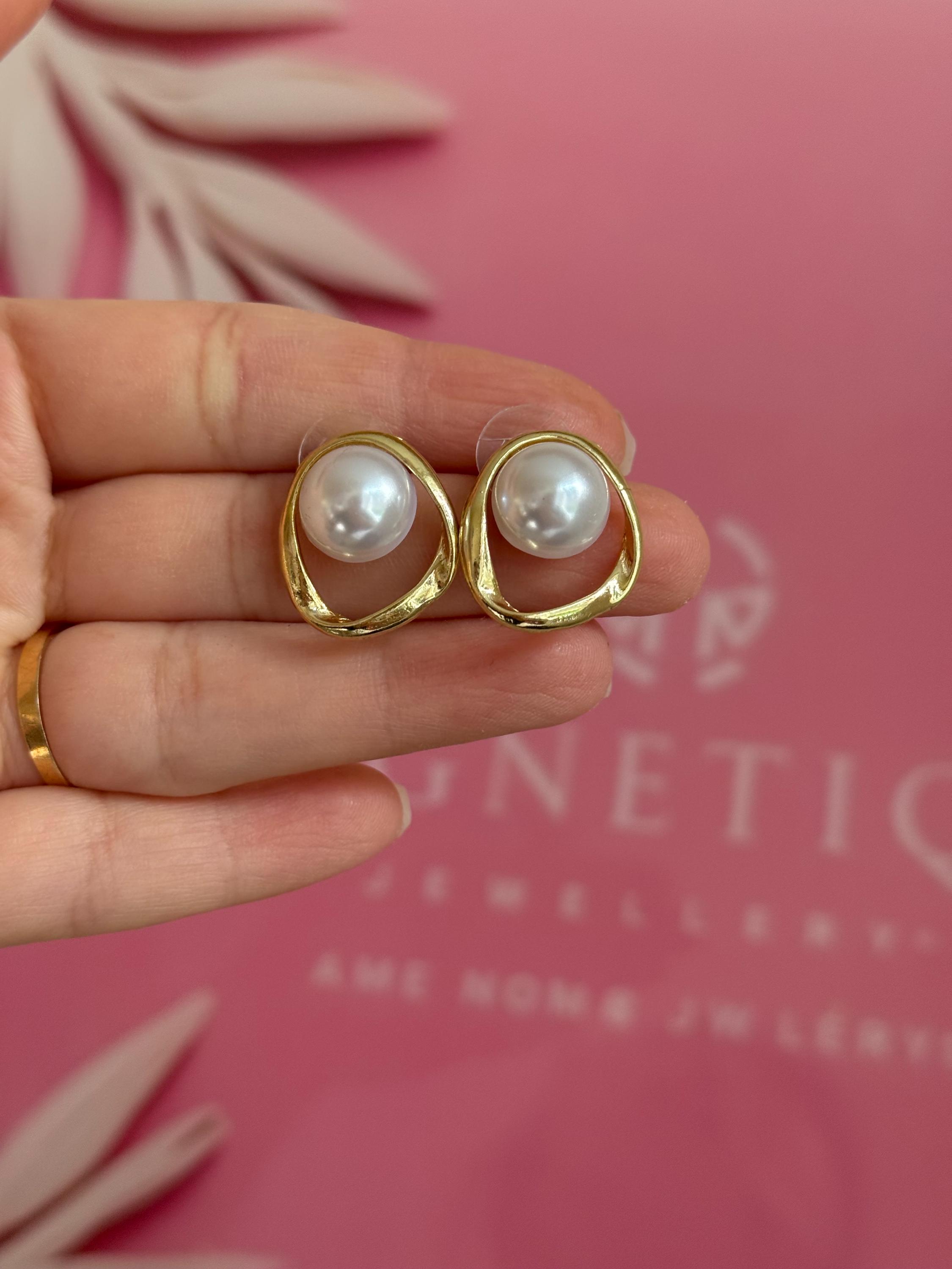 These elegant gold open-frame pearl stud earrings combine modern design with timeless beauty.
