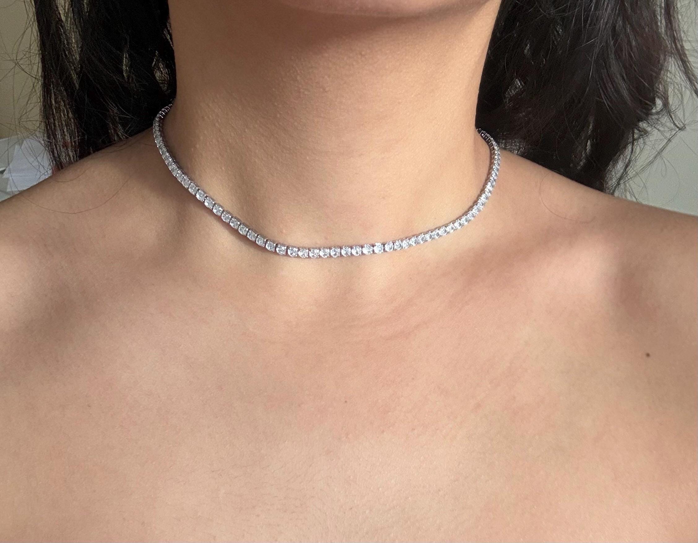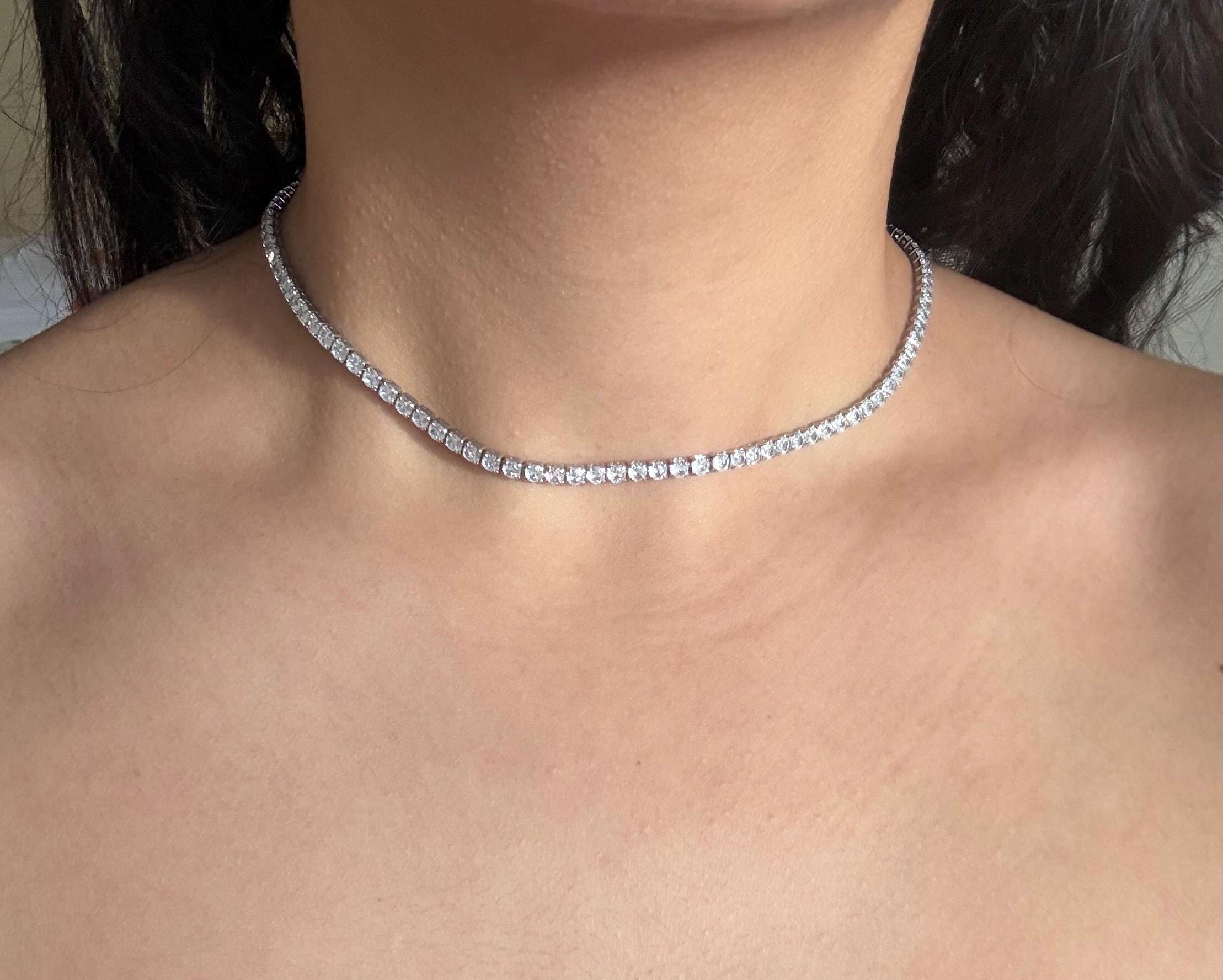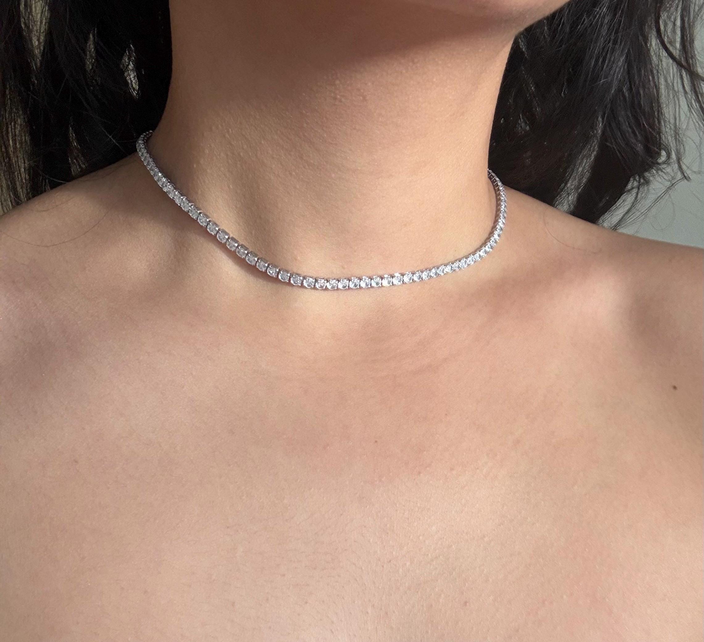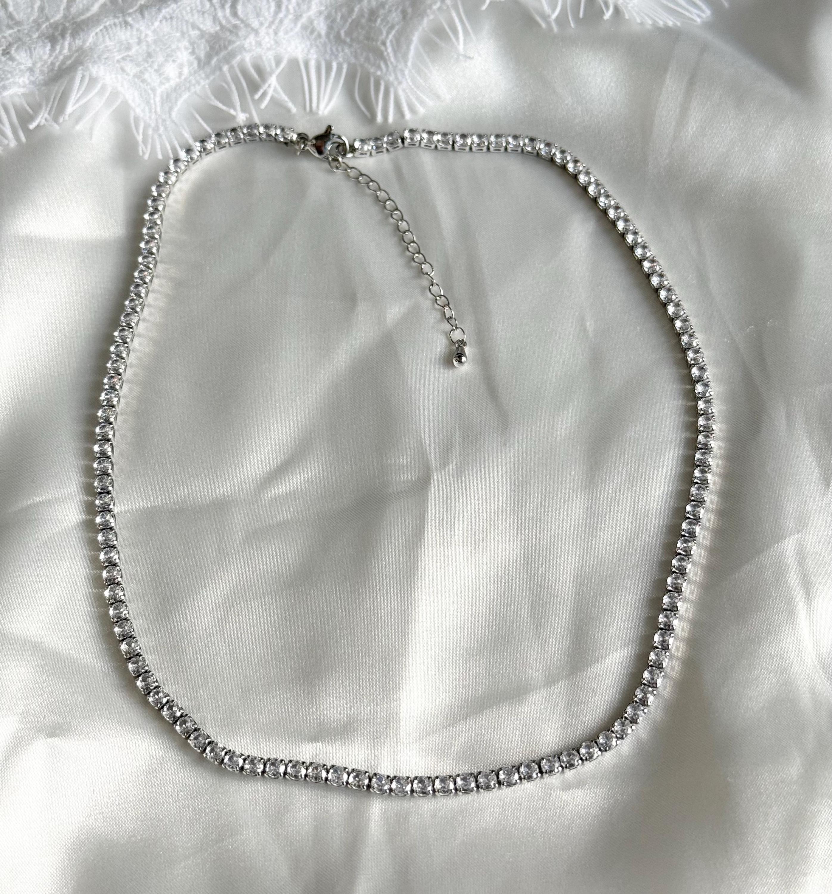 This silver crystal necklace features a sleek line of sparkling crystals, designed to sit delicately around the neck like a choker. Minimal, refined, and timeless, it adds just the right amount of shine to any look.