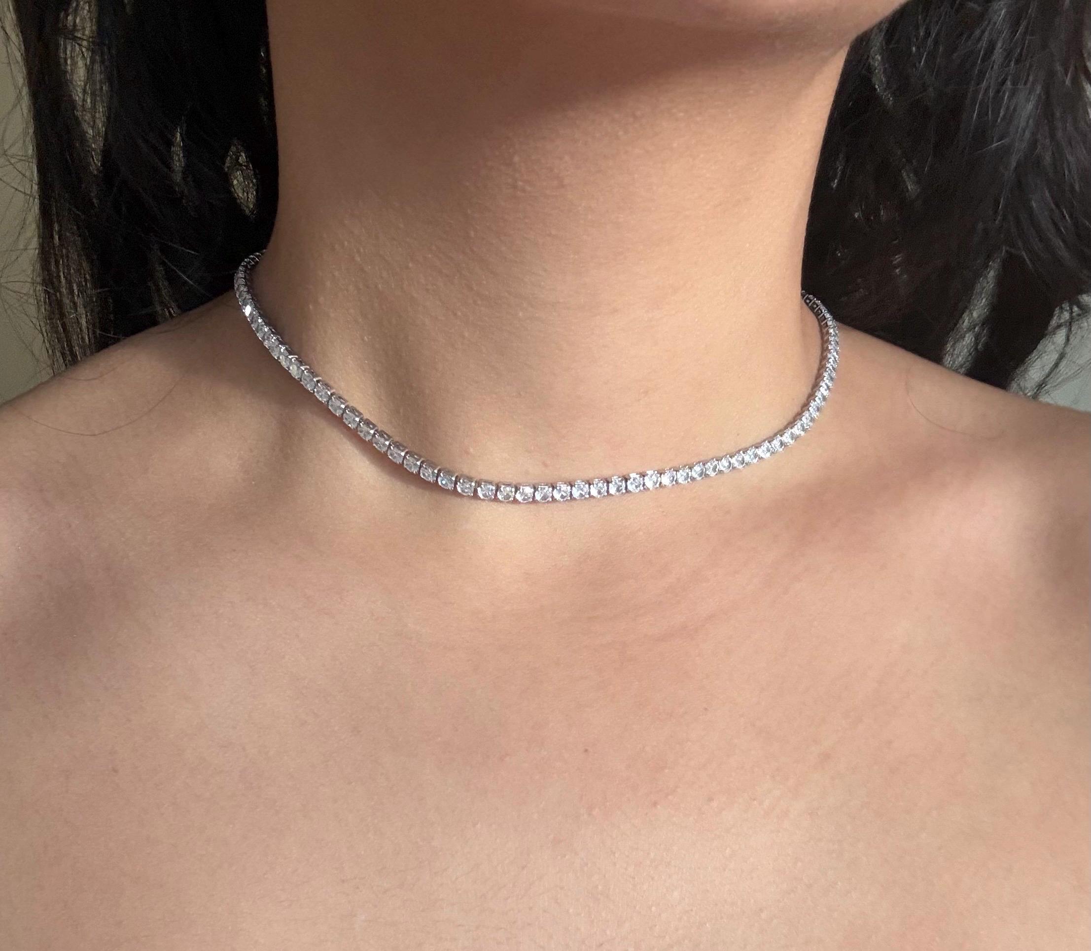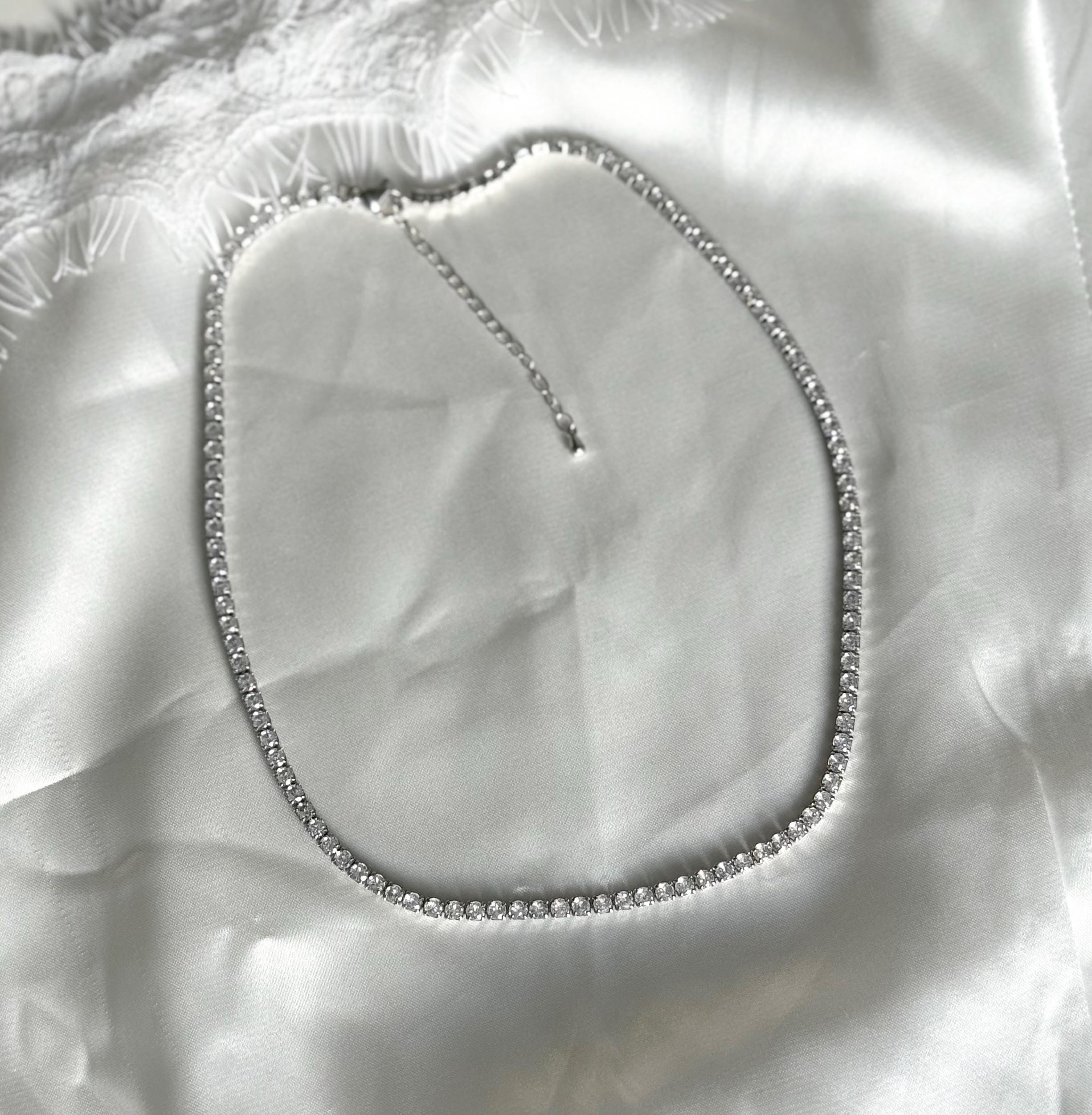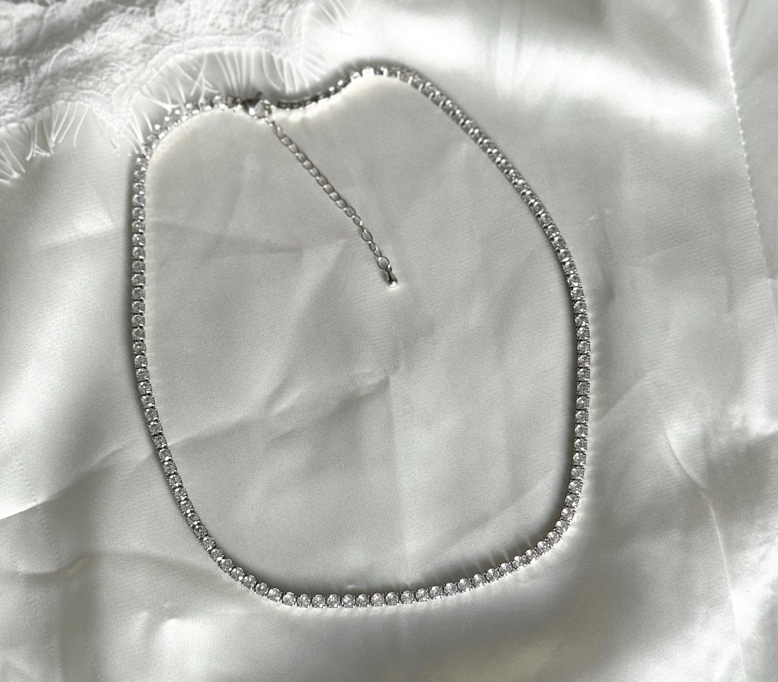 This silver crystal necklace features a sleek line of sparkling crystals, designed to sit delicately around the neck like a choker. Minimal, refined, and timeless, it adds just the right amount of shine to any look.