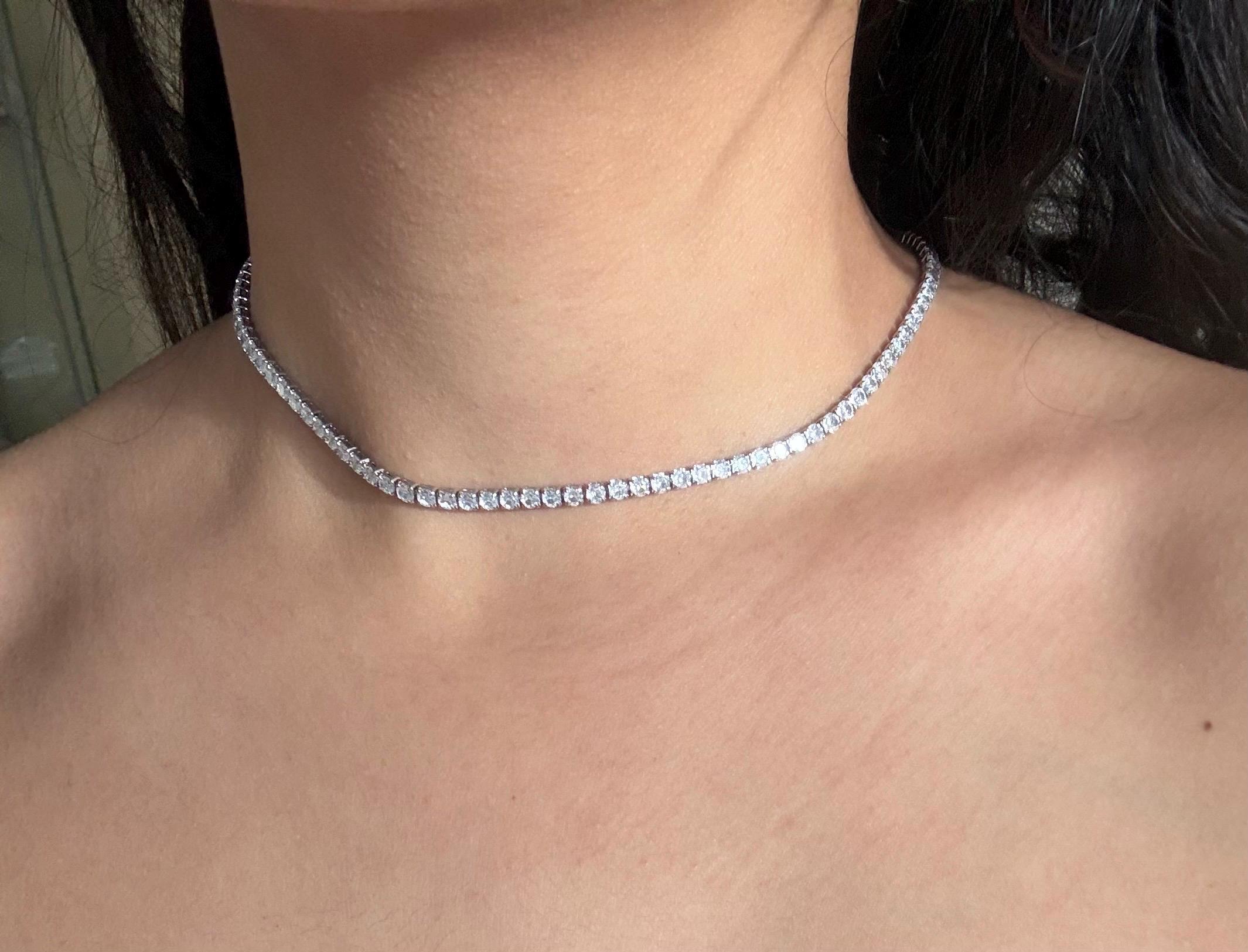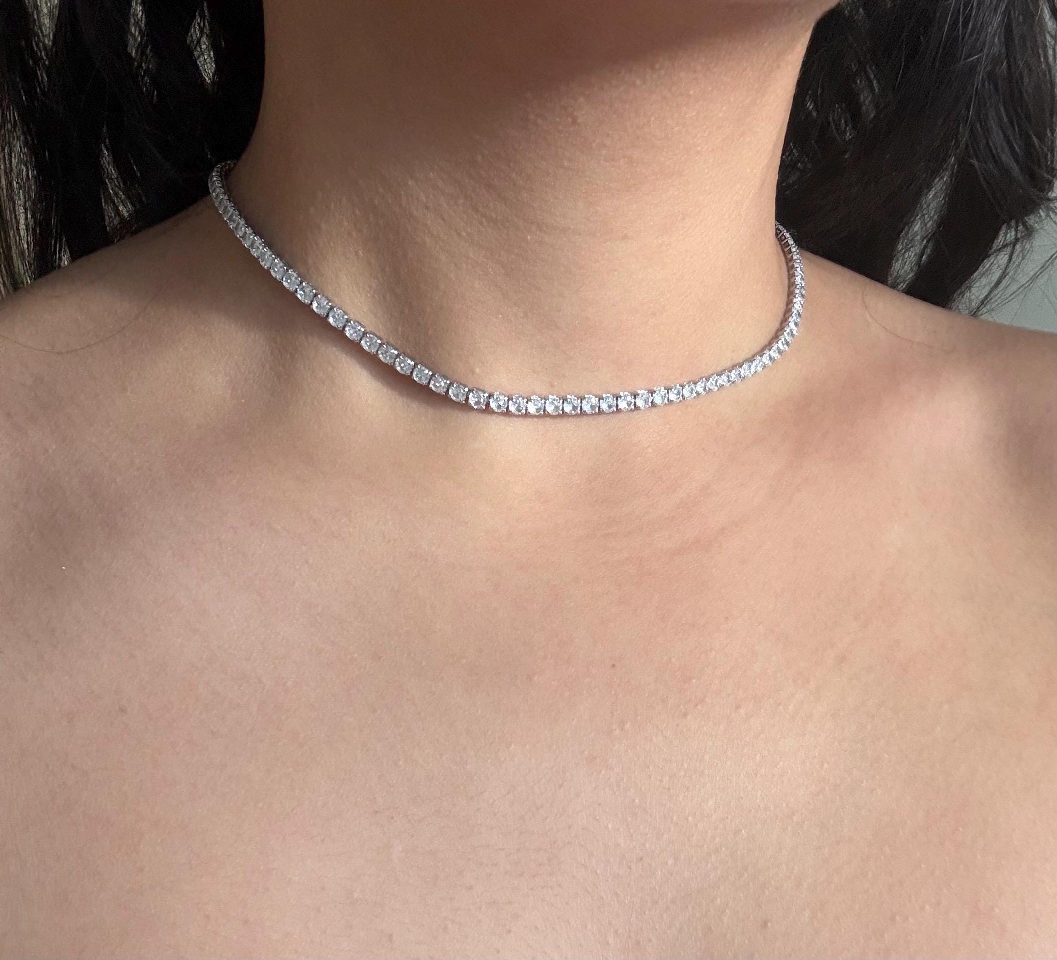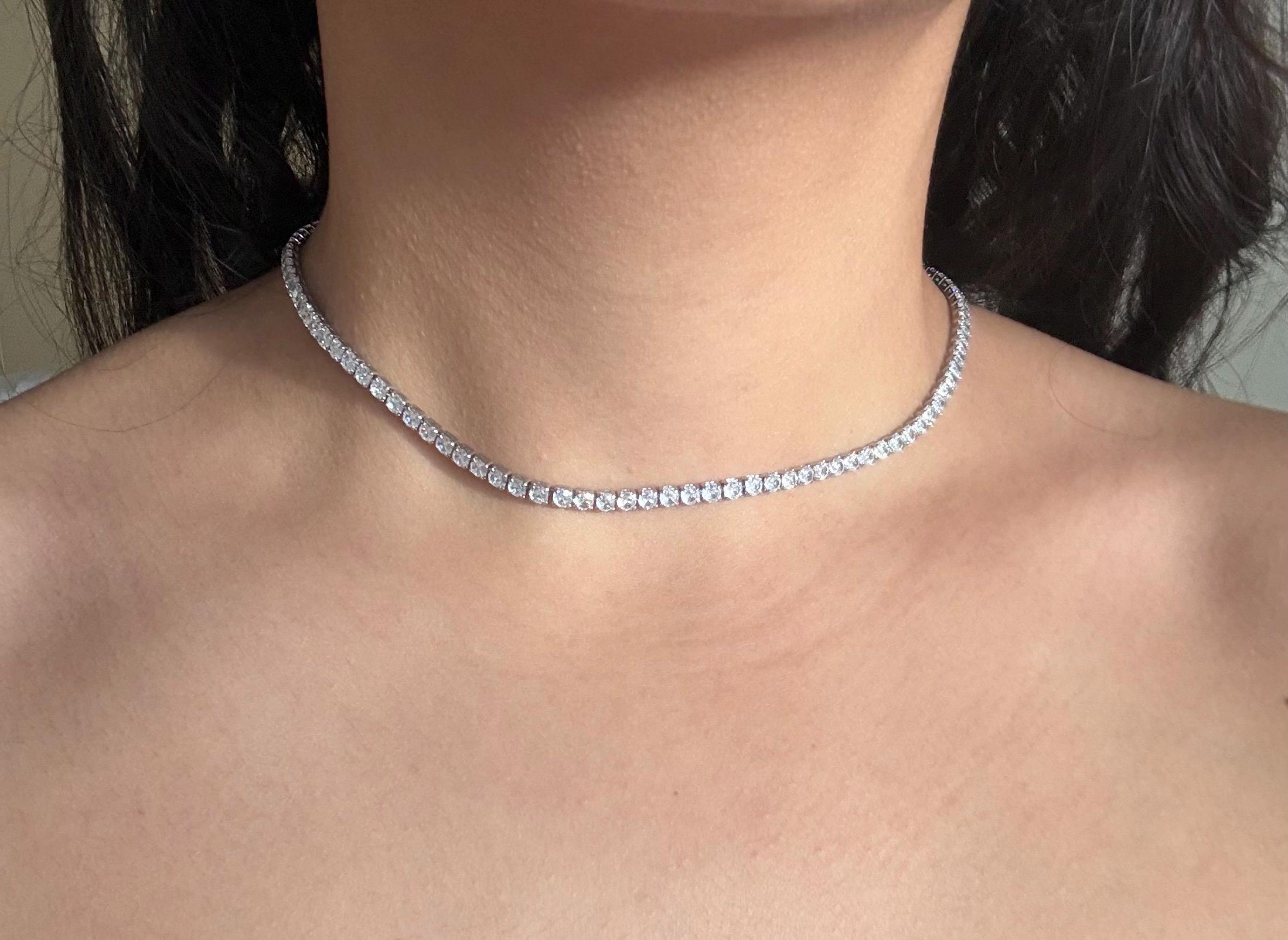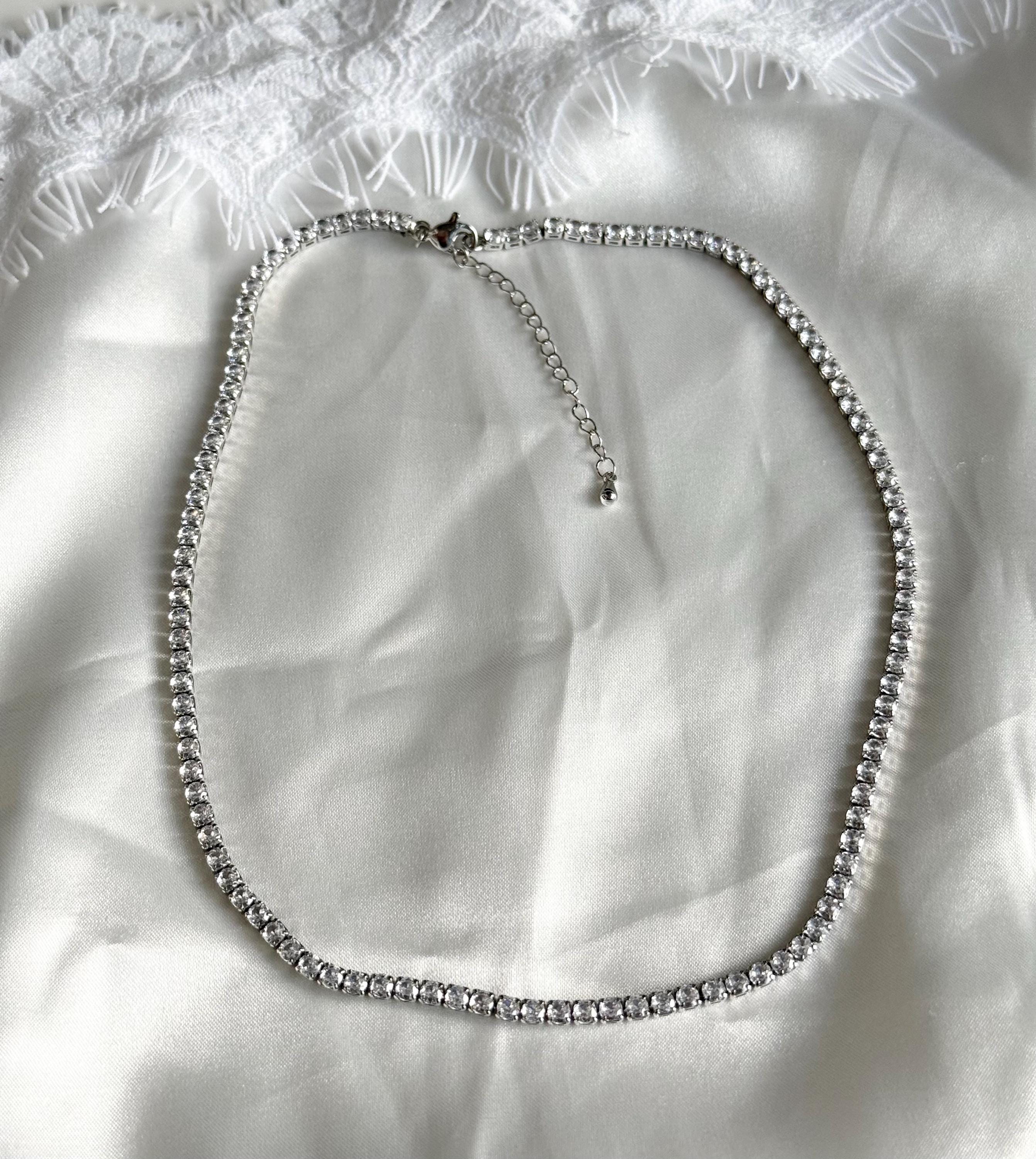 This silver crystal necklace features a sleek line of sparkling crystals, designed to sit delicately around the neck like a choker. Minimal, refined, and timeless, it adds just the right amount of shine to any look.