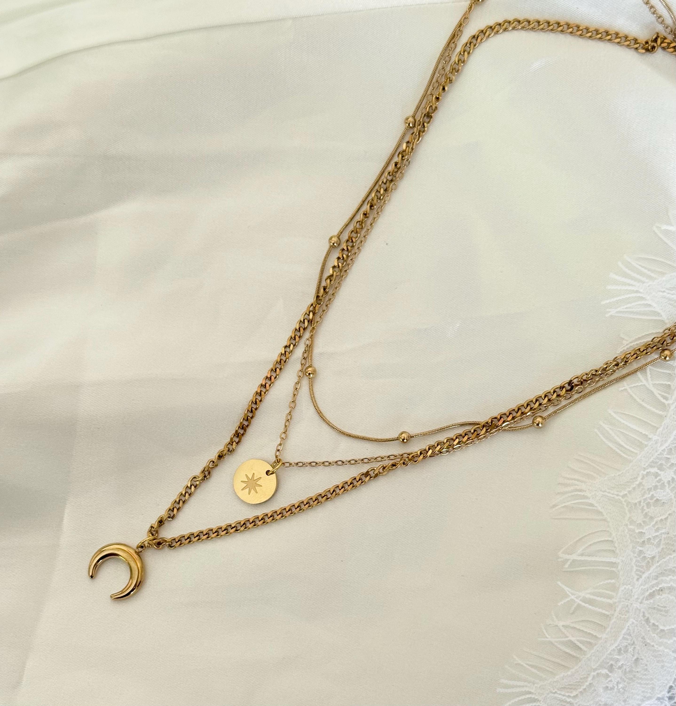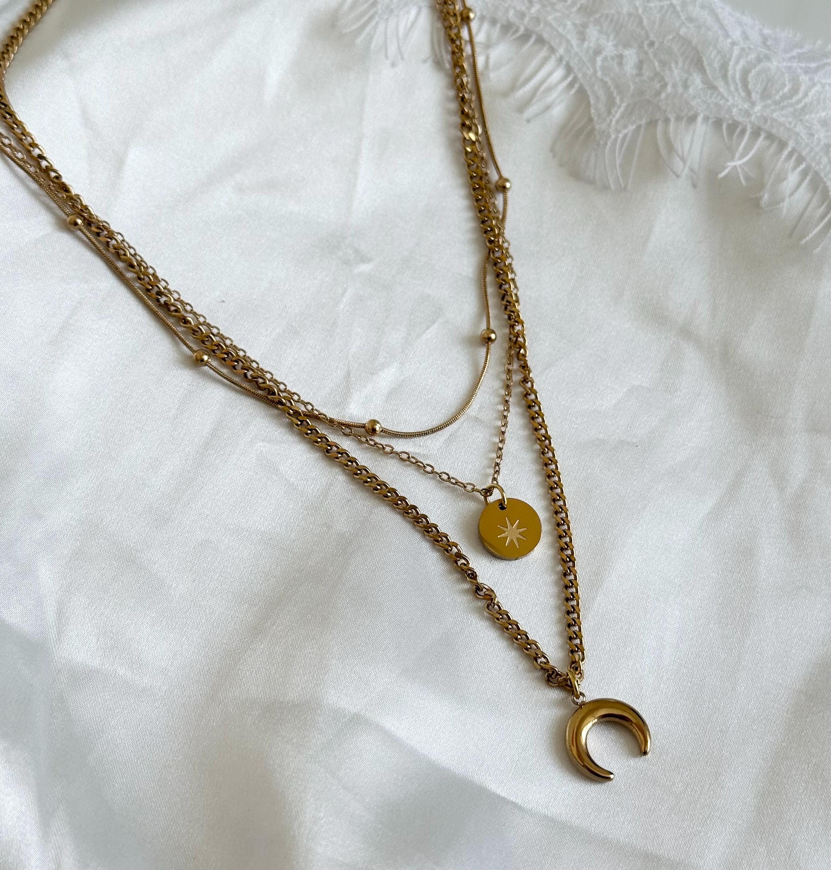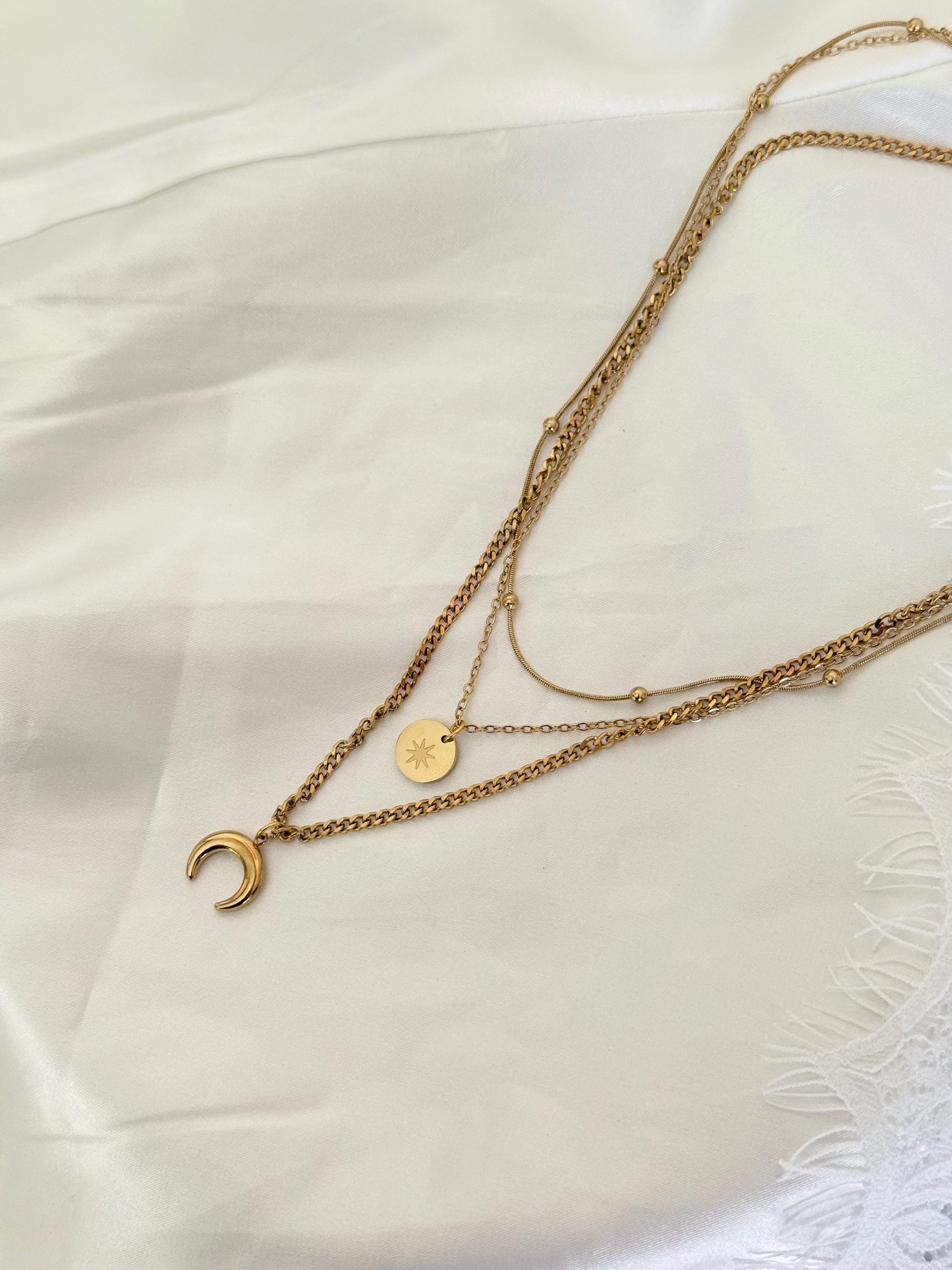 Key features include: * Made from premium titanium steel with gold-tone plating for durability and tarnish resistance * Layered design with delicate chains, a minimalist round charm, and a crescent moon pendant * Water-resistant and perfect for daily wear or special events * Length adjustable to suit your style and neckline * Lightweight and comfortable for all-day wear