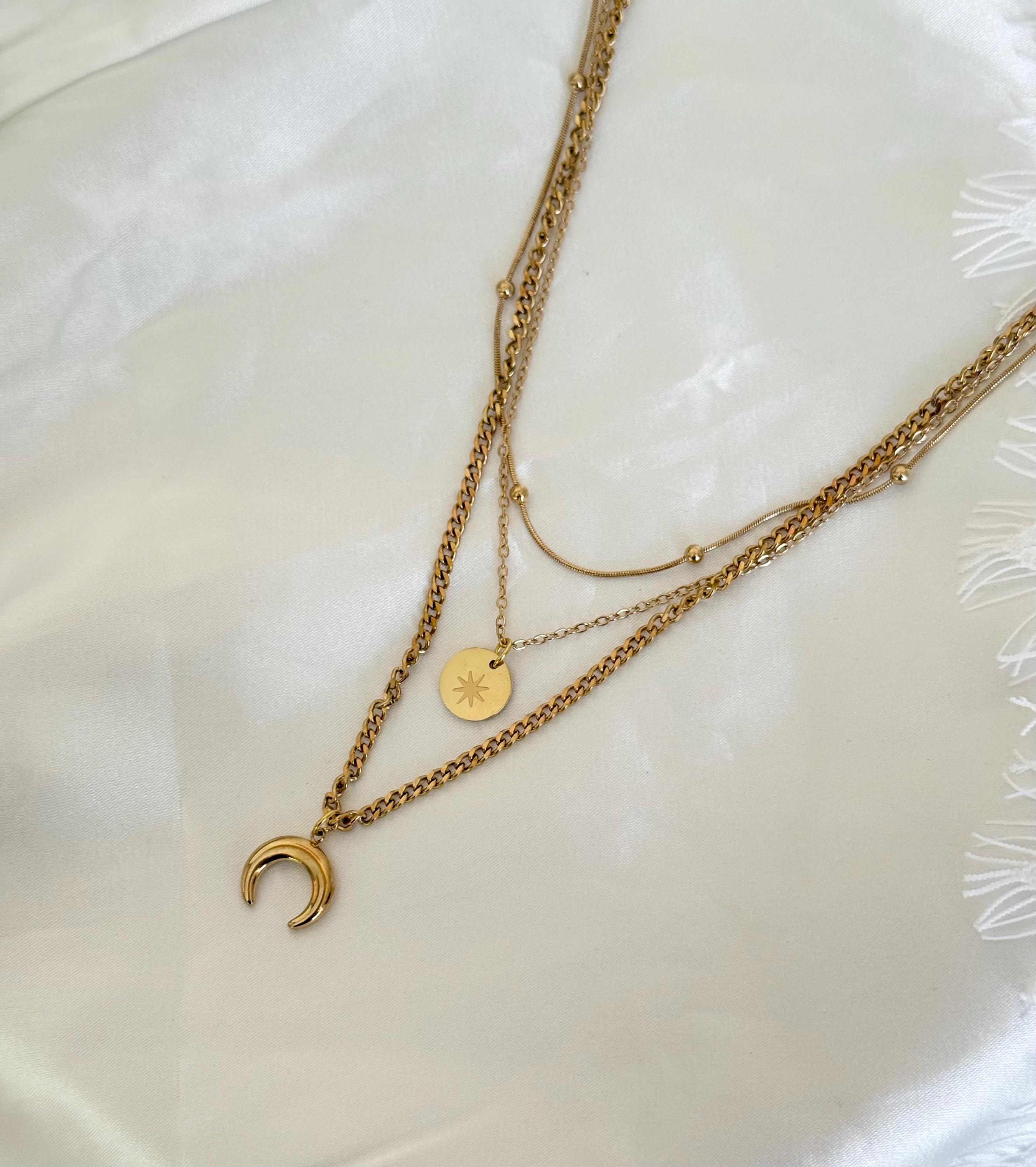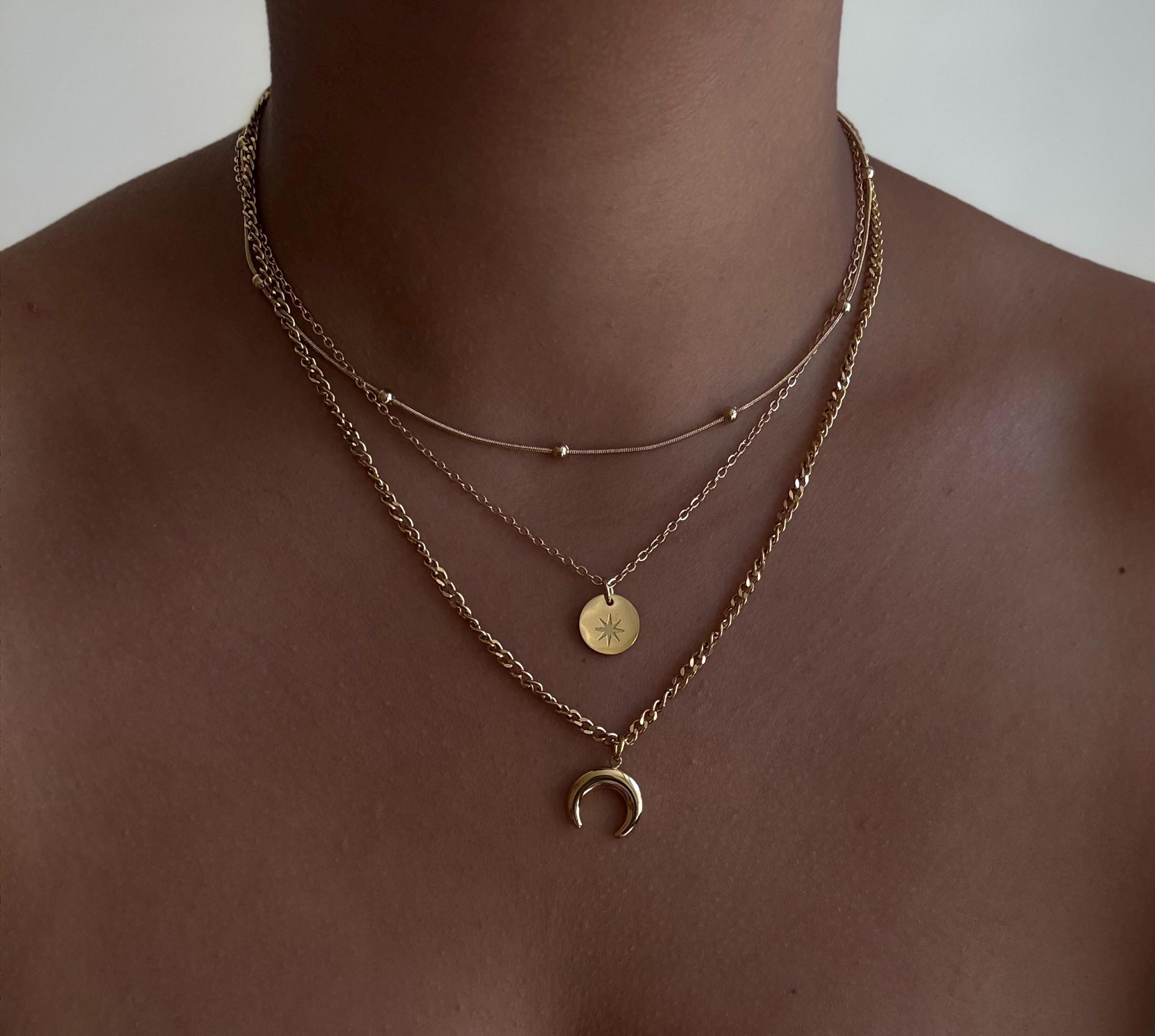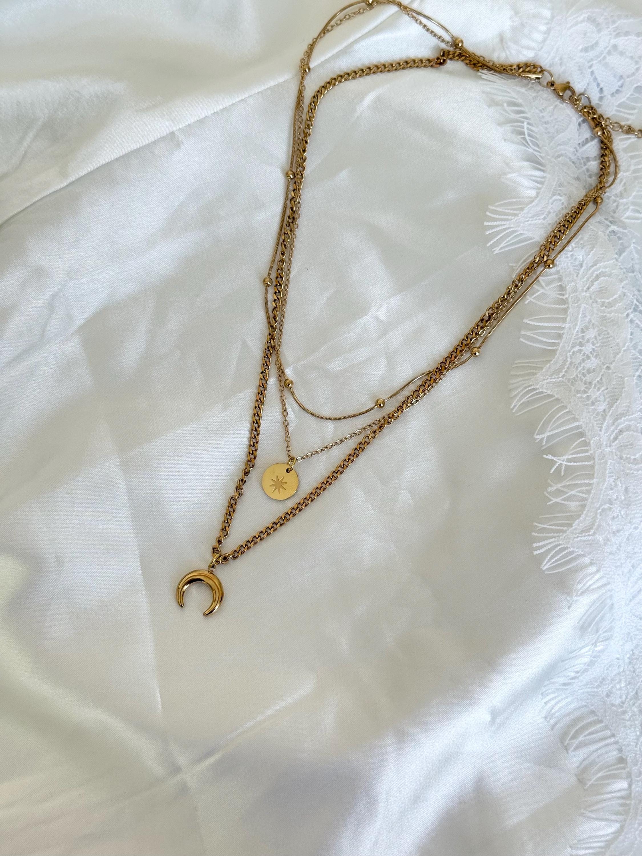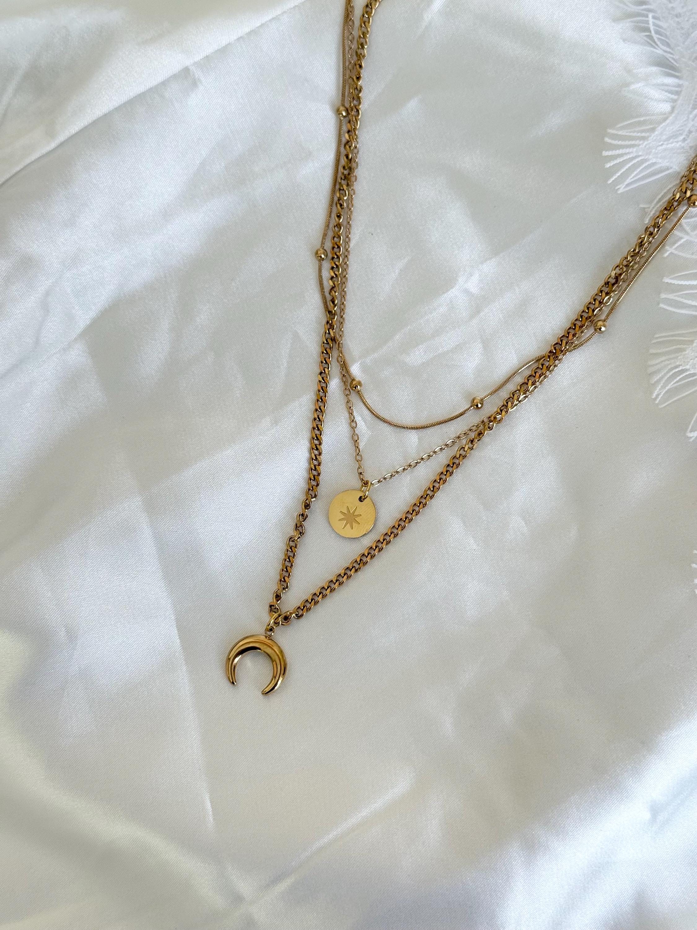 Key features include: * Made from premium titanium steel with gold-tone plating for durability and tarnish resistance * Layered design with delicate chains, a minimalist round charm, and a crescent moon pendant * Water-resistant and perfect for daily wear or special events * Length adjustable to suit your style and neckline * Lightweight and comfortable for all-day wear