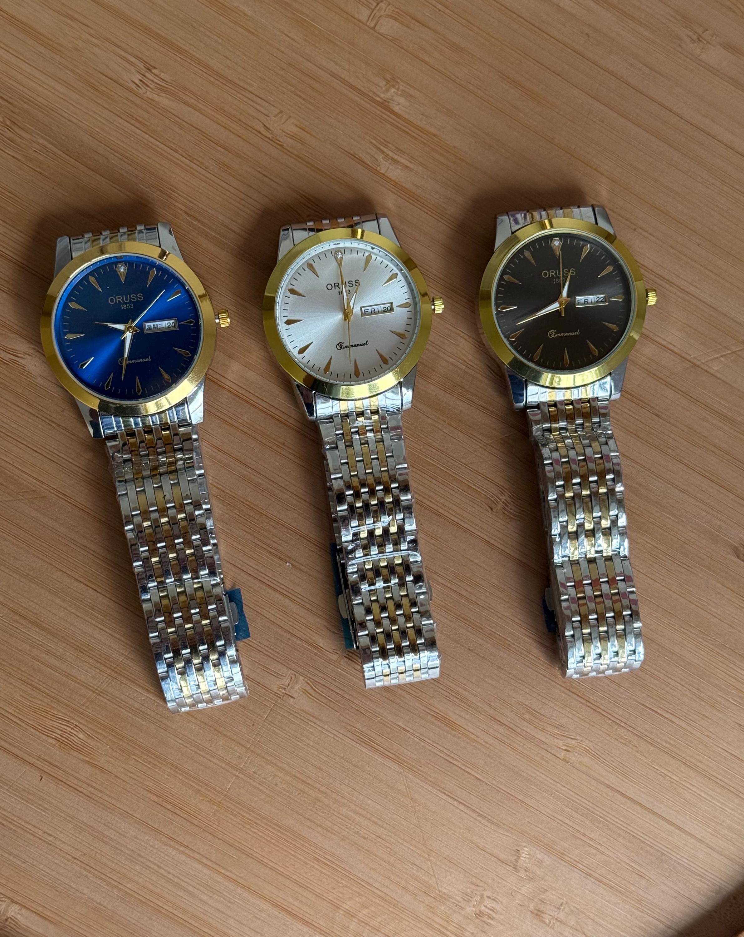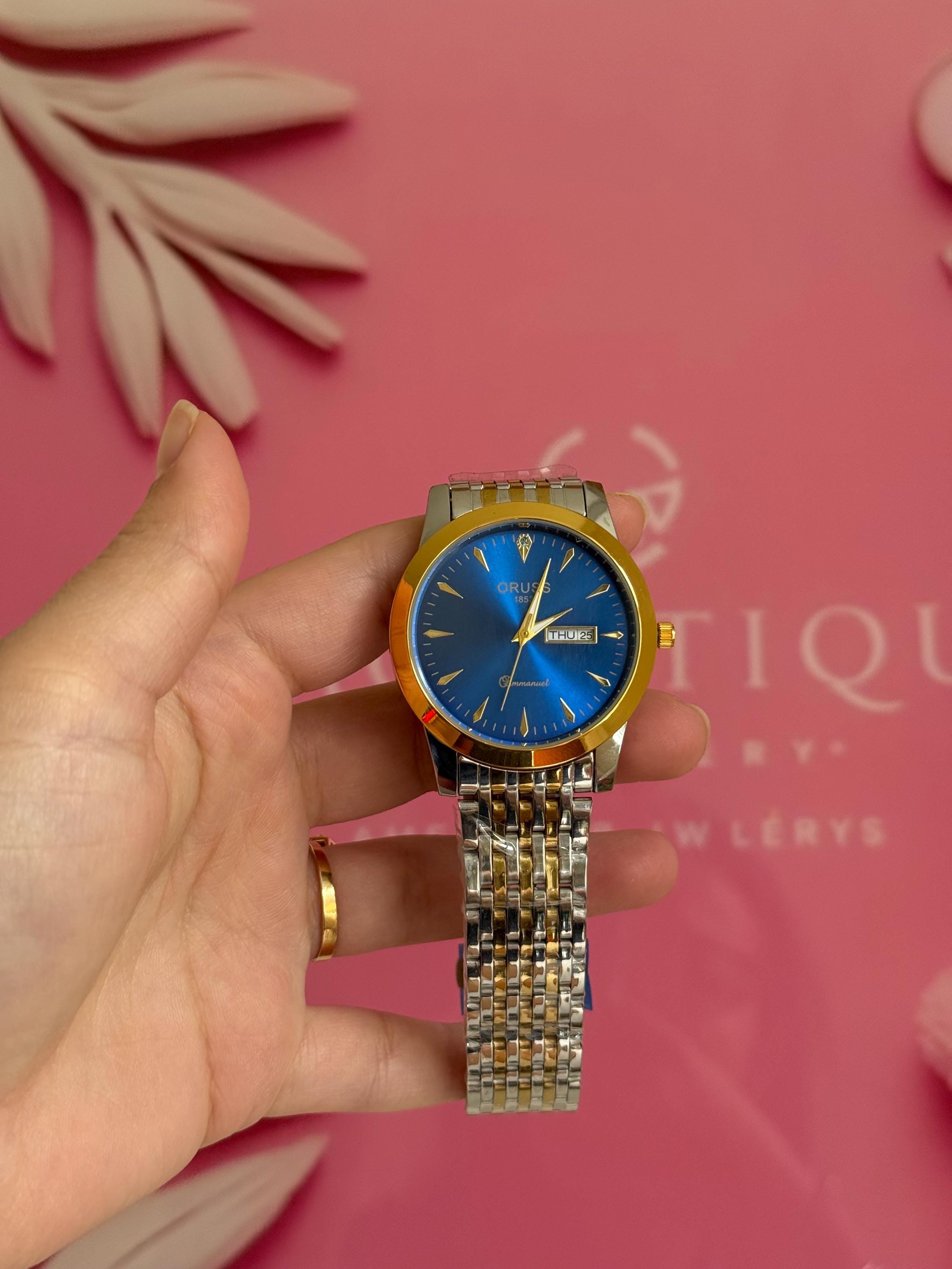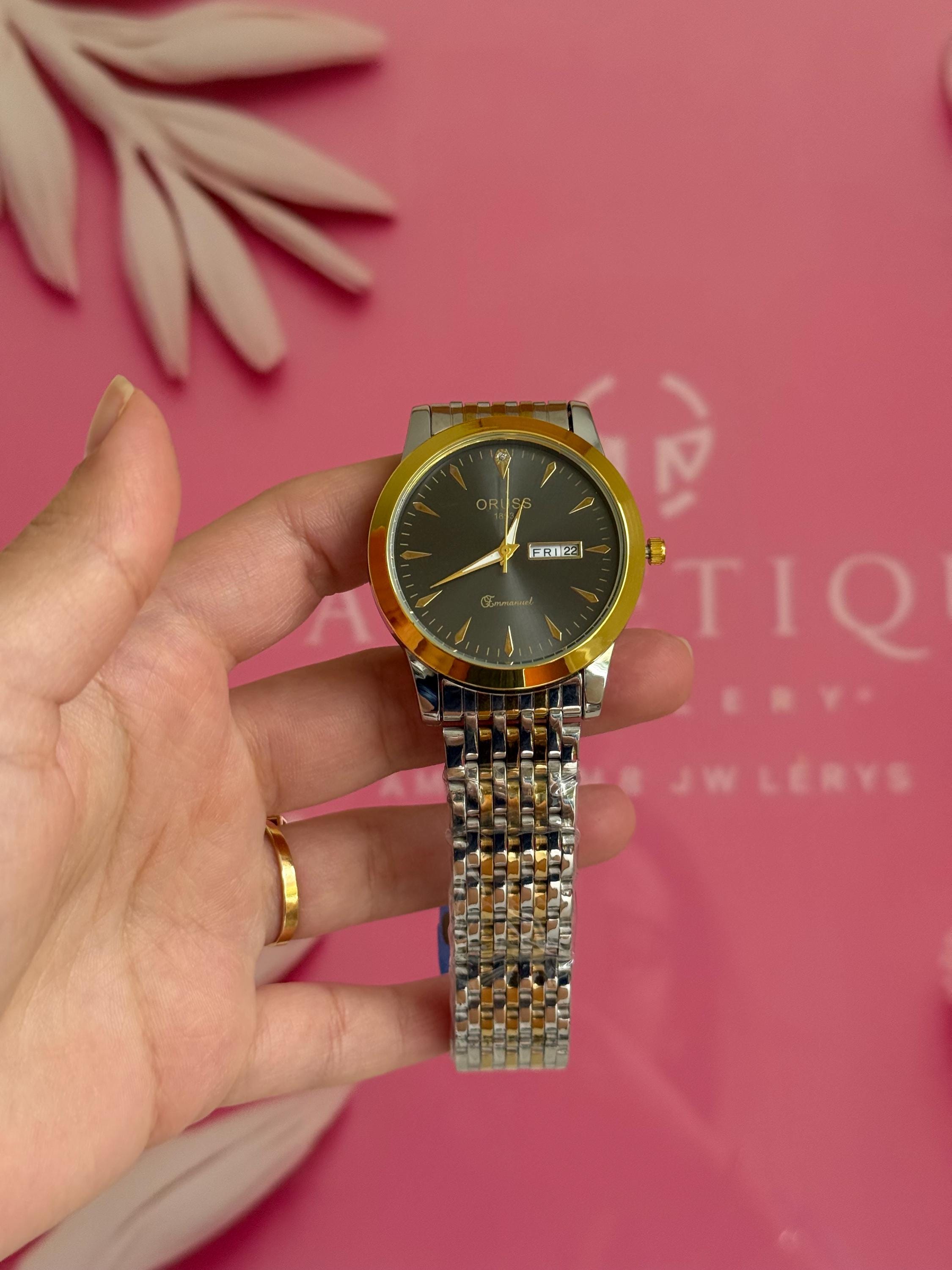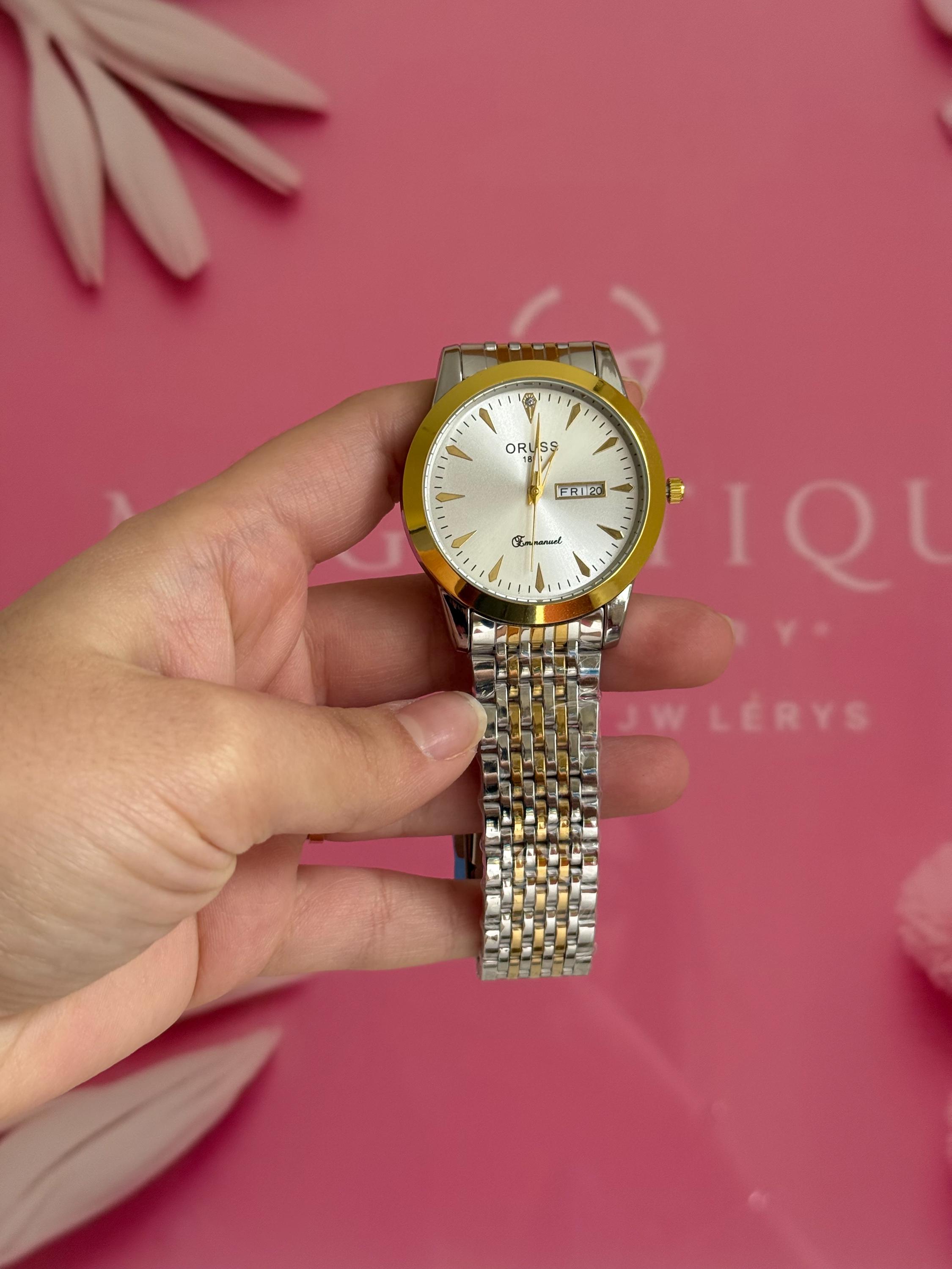 The refined round dial is designed with a sleek day and date display, making it as useful as it is stylish. Crafted from durable stainless steel with a polished silver and gold-tone finish, this watch offers versatility to complement casual, office, or luxury outfits.