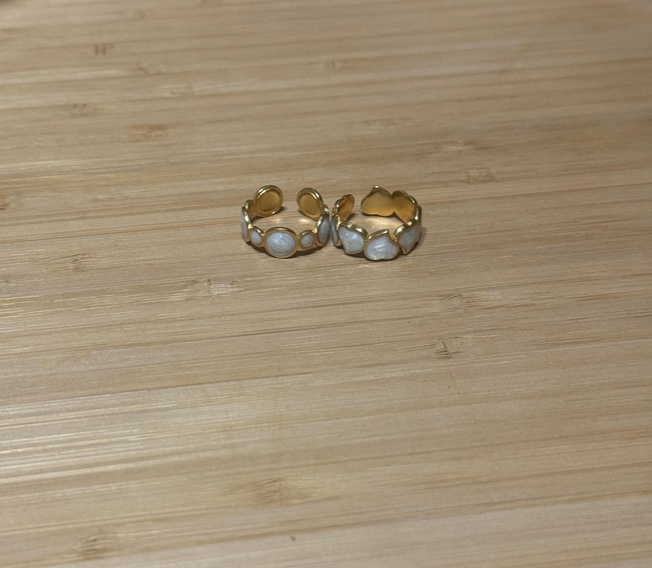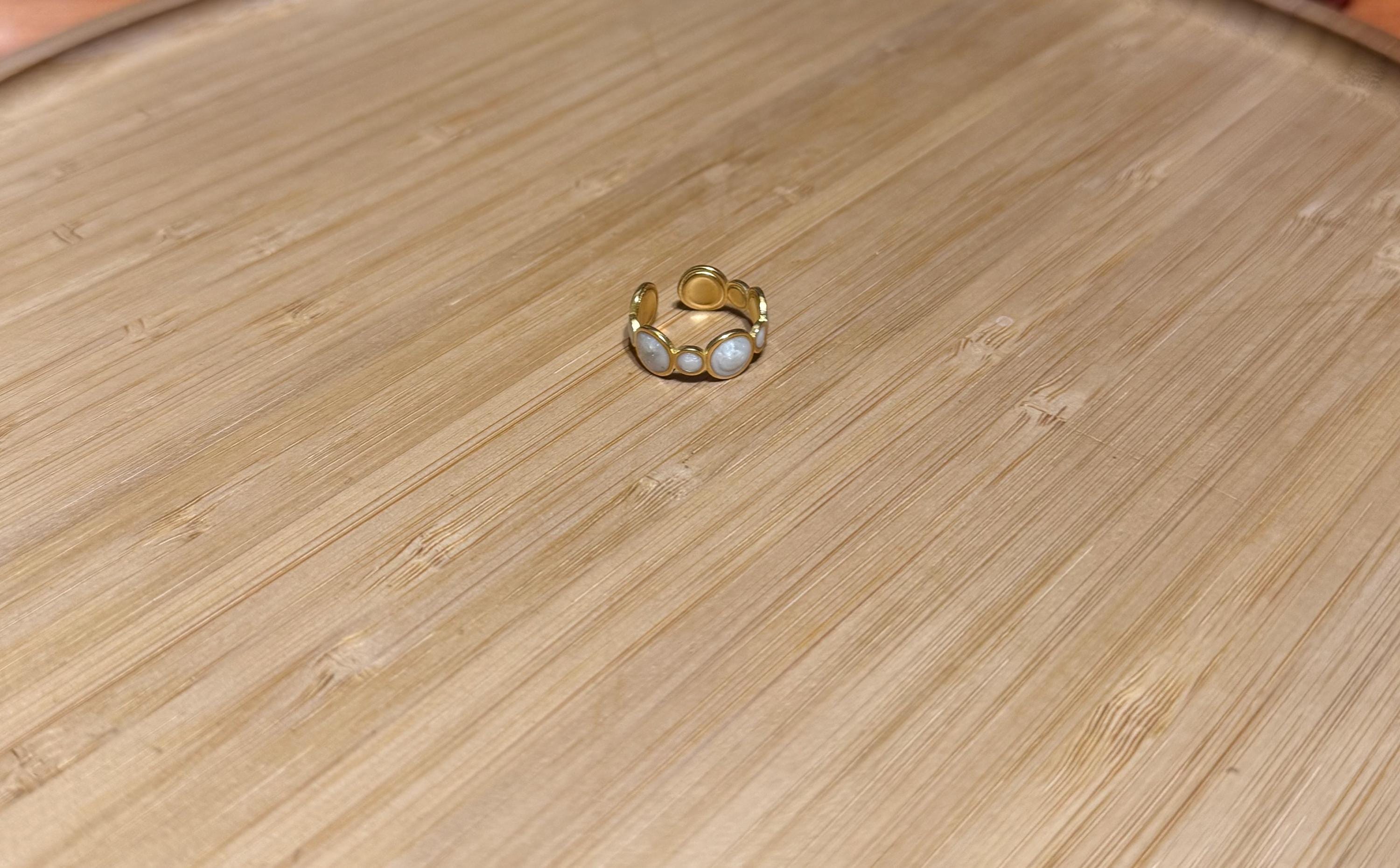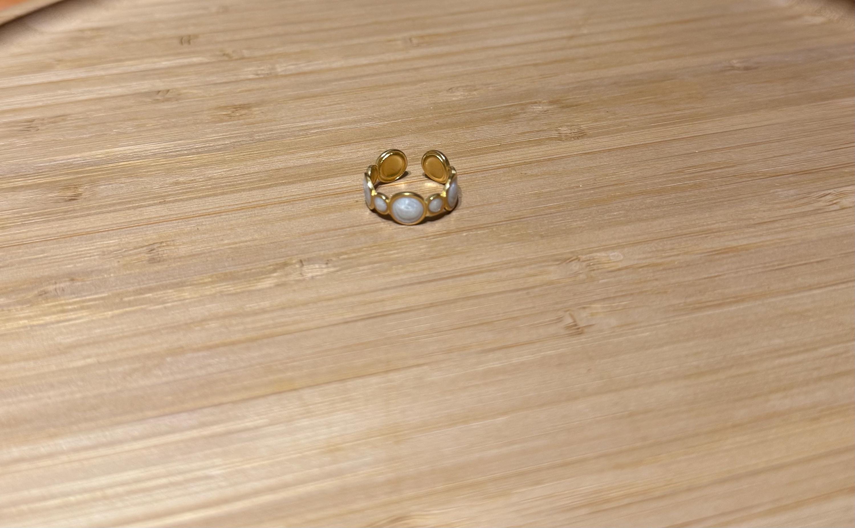 Key features: - Material: High-quality stainless steel with a polished gold-tone finish - Design: Open, adjustable ring with a smooth white inlay - Dimensions: Perfectly proportioned for everyday wear - Care: Clean with a soft cloth and avoid harsh chemicals to maintain its shine
