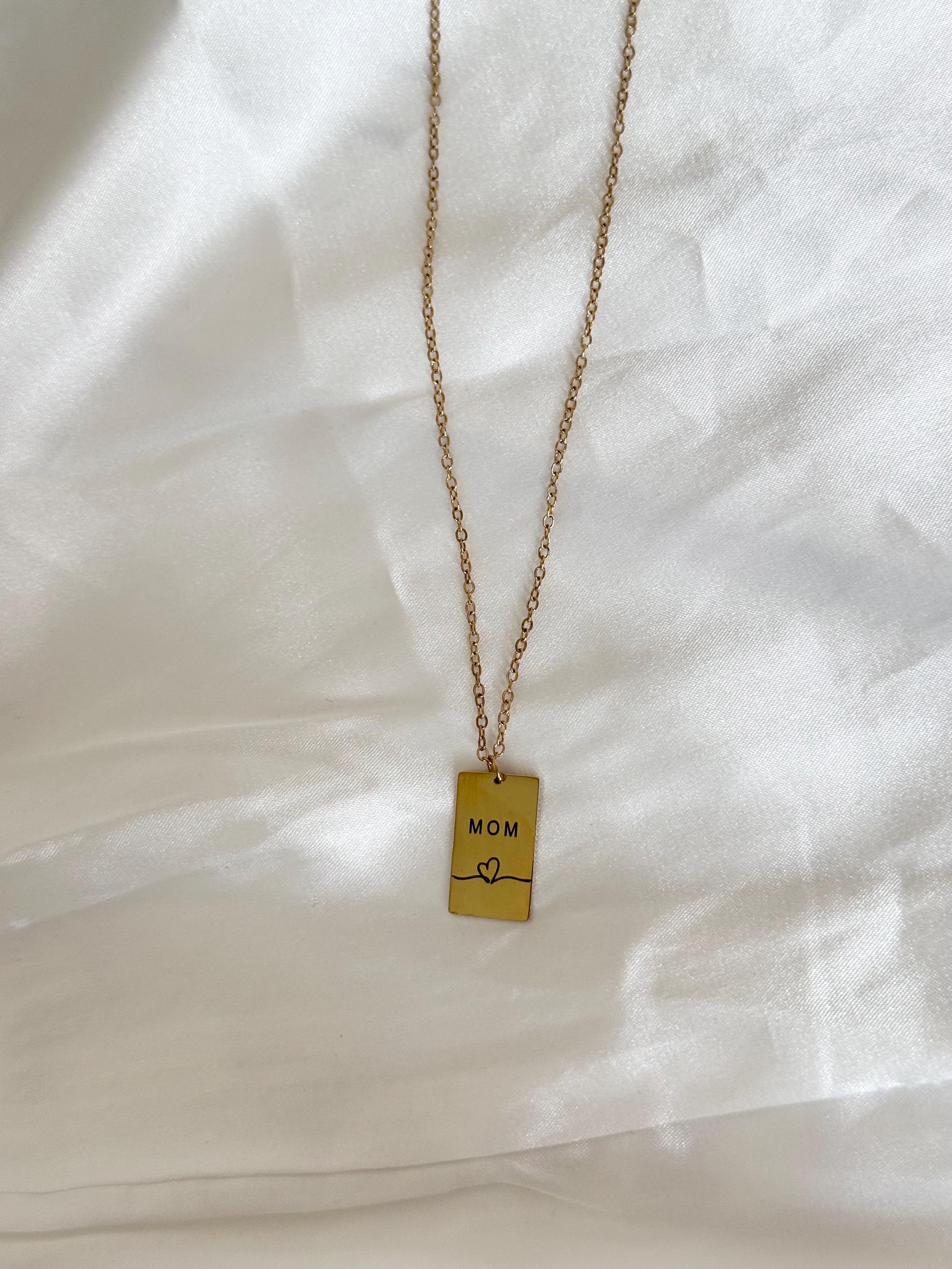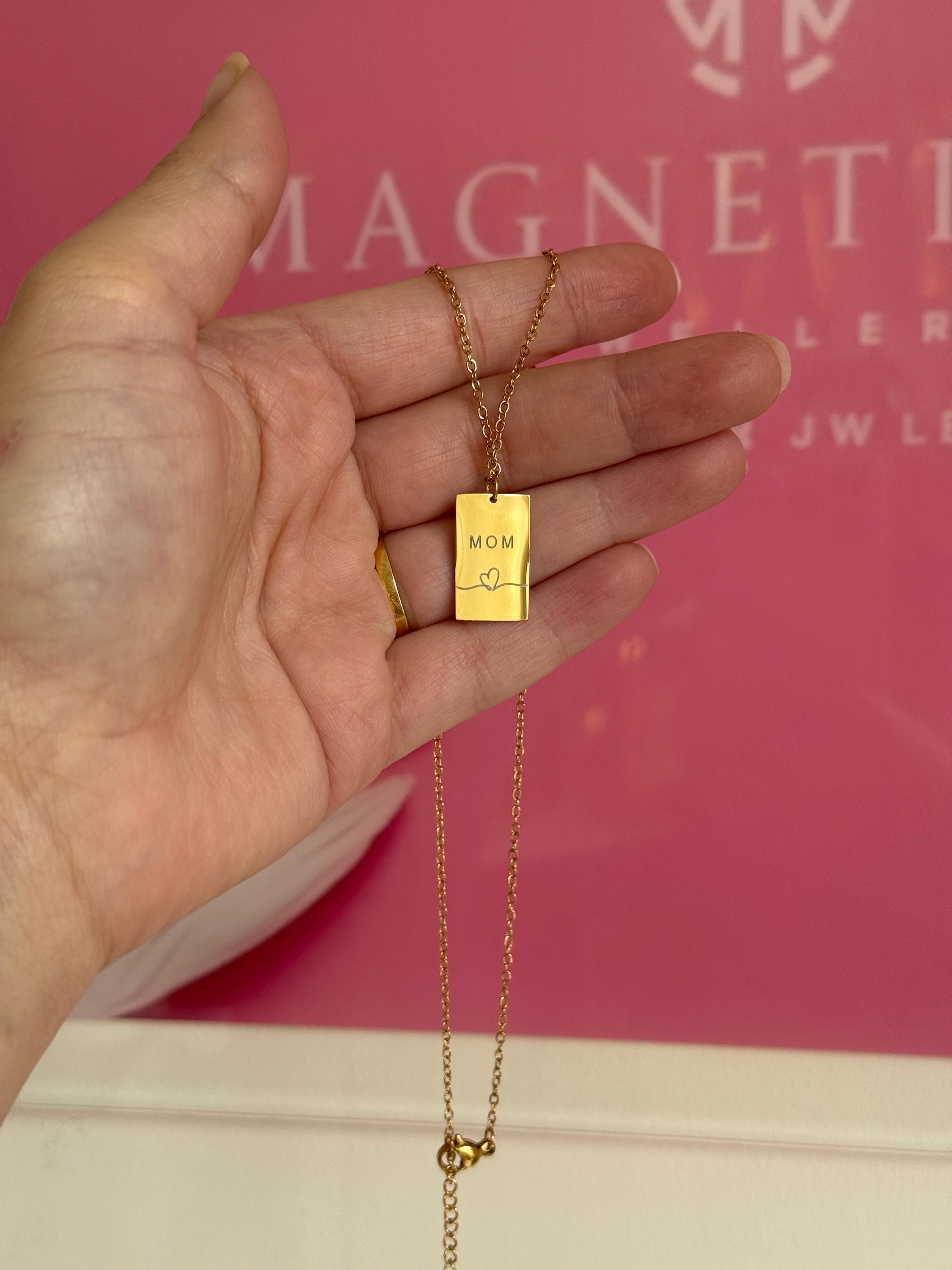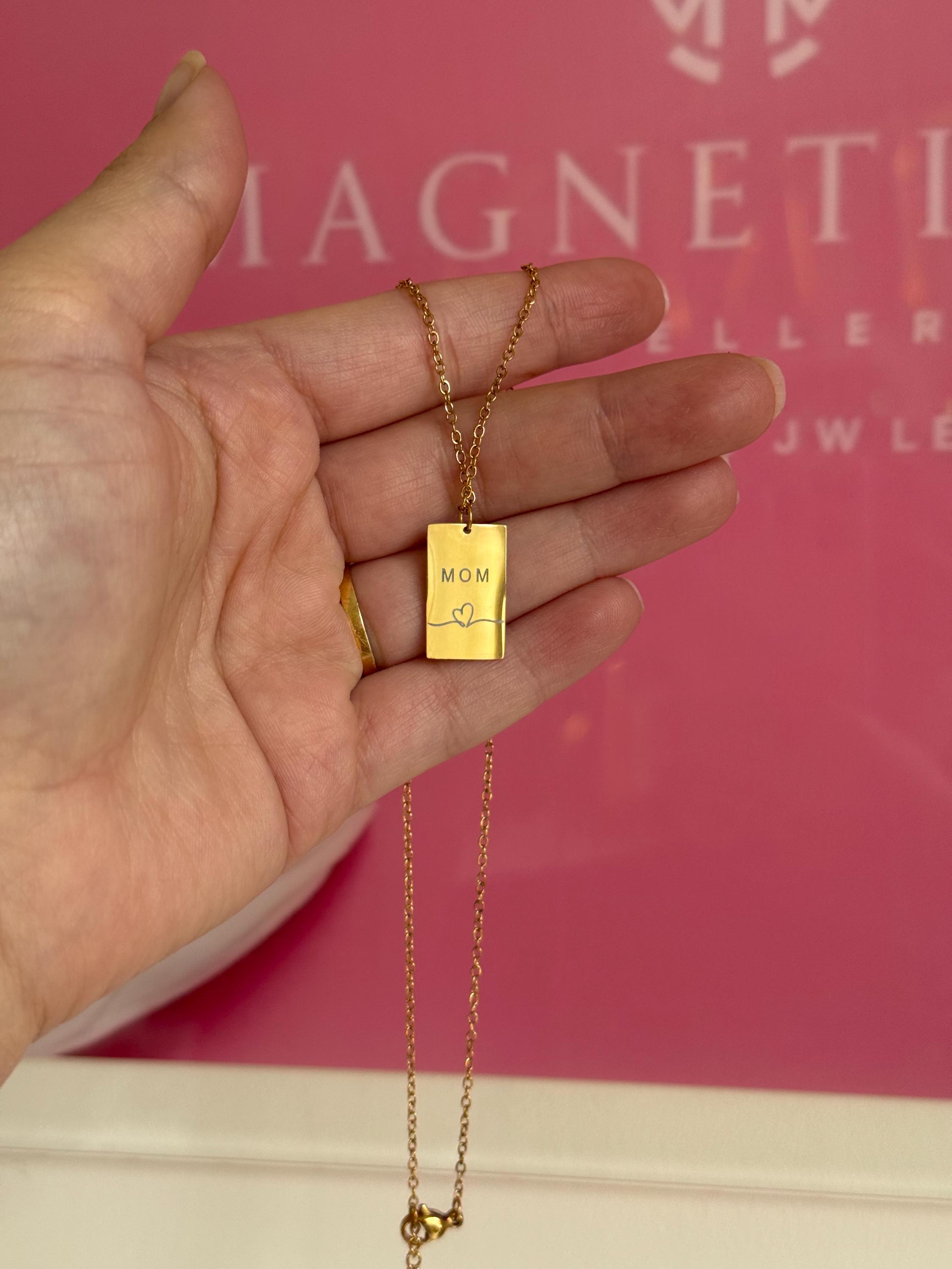 🌟 Details • Necklace type: Bar pendant necklace • Material: Stainless steel • Finish: Gold tone • Pendant design: “MOM” engraving with heart detail • Shape: Rectangle bar • Style: Minimalist, meaningful, everyday • Lightweight & comfortable • Secure clasp closure