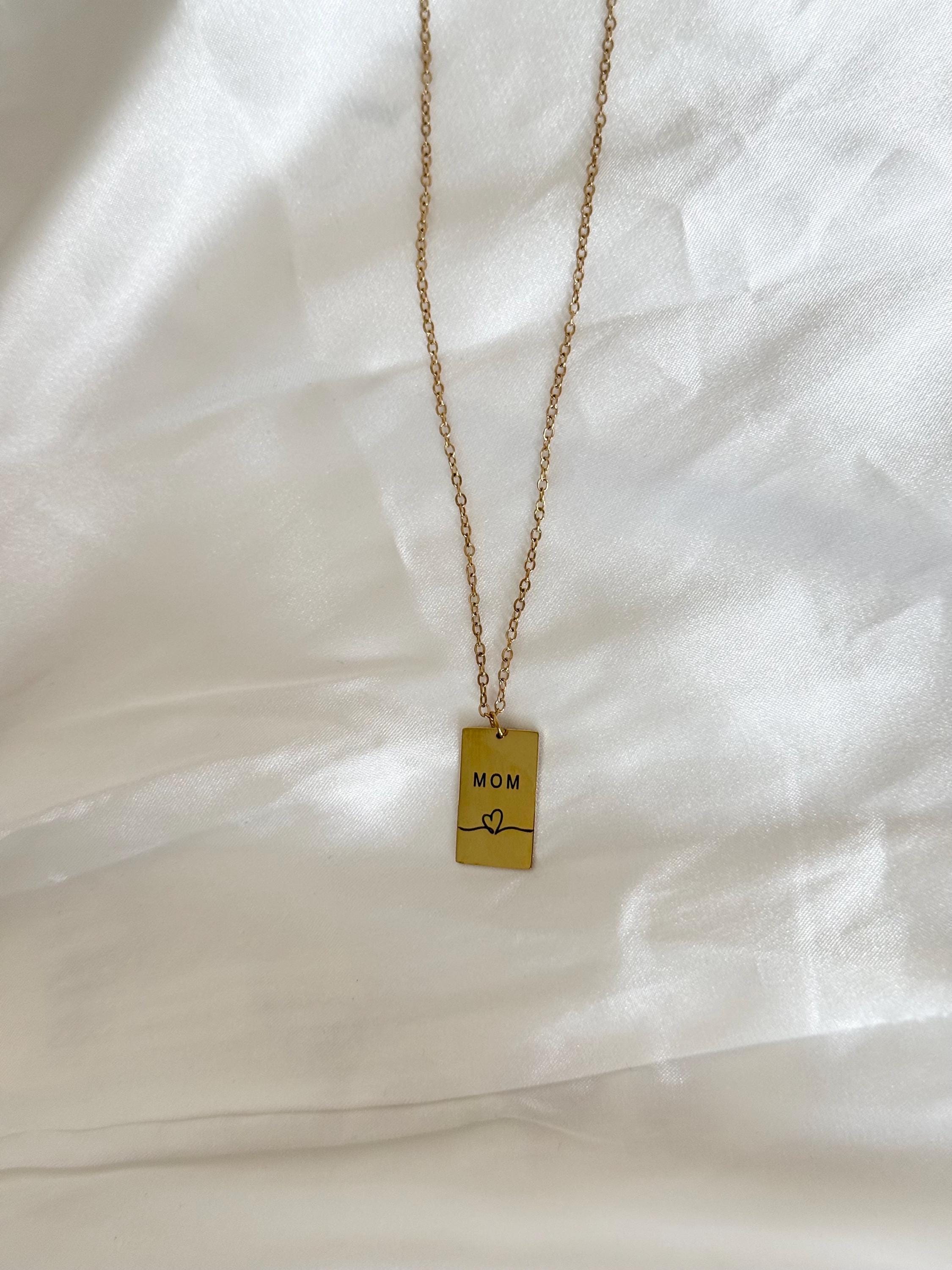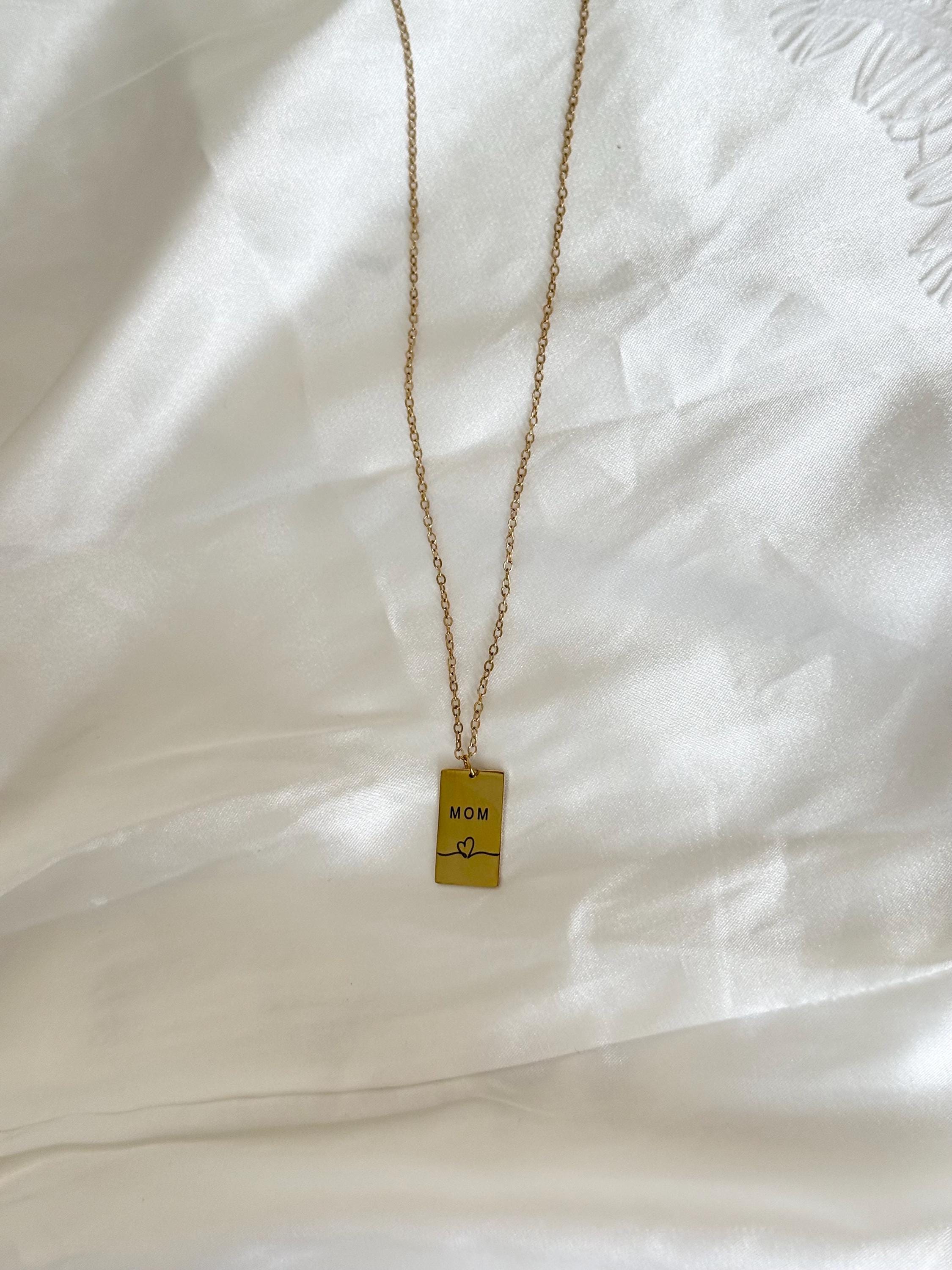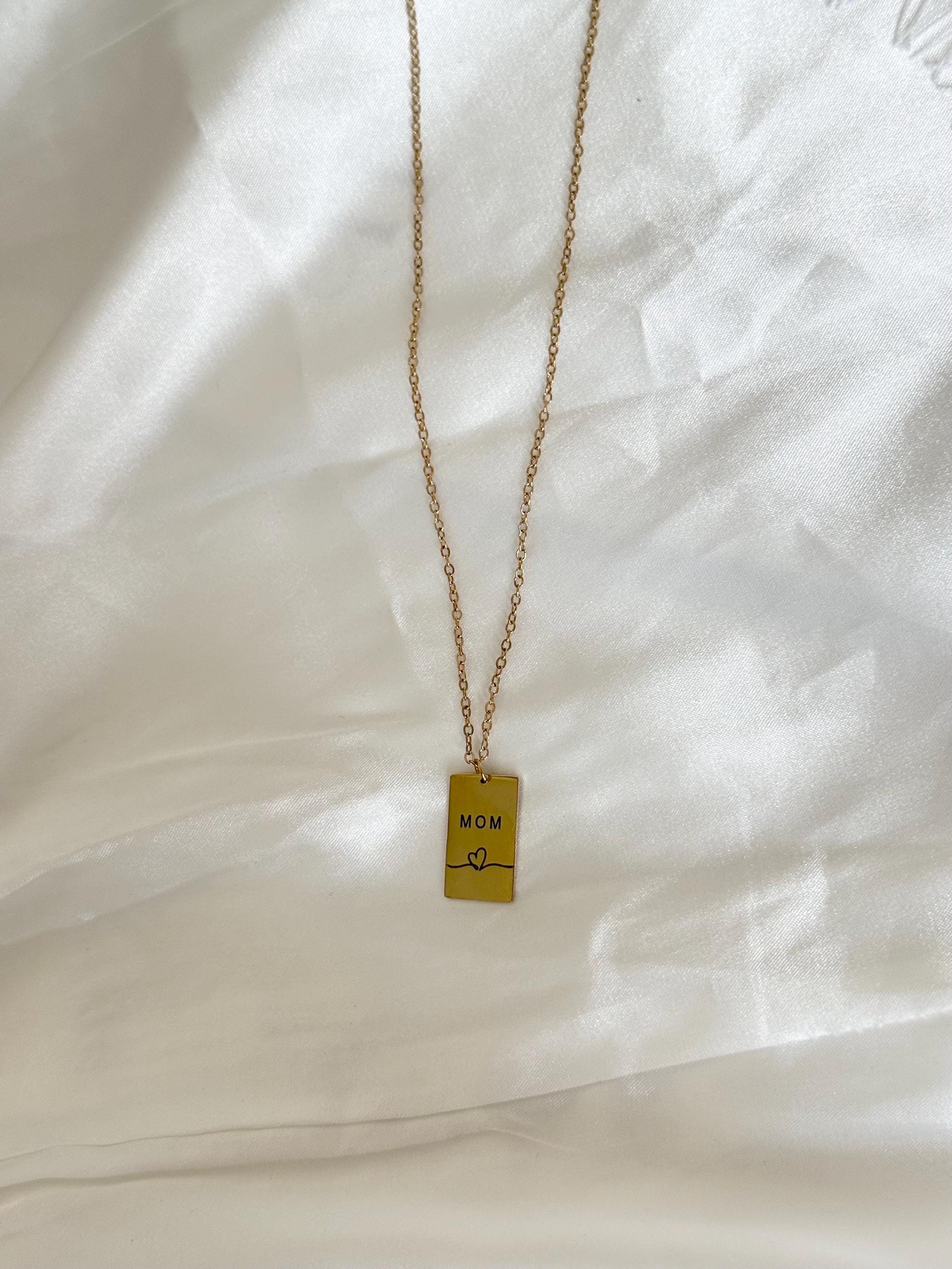 🌟 Details • Necklace type: Bar pendant necklace • Material: Stainless steel • Finish: Gold tone • Pendant design: “MOM” engraving with heart detail • Shape: Rectangle bar • Style: Minimalist, meaningful, everyday • Lightweight & comfortable • Secure clasp closure