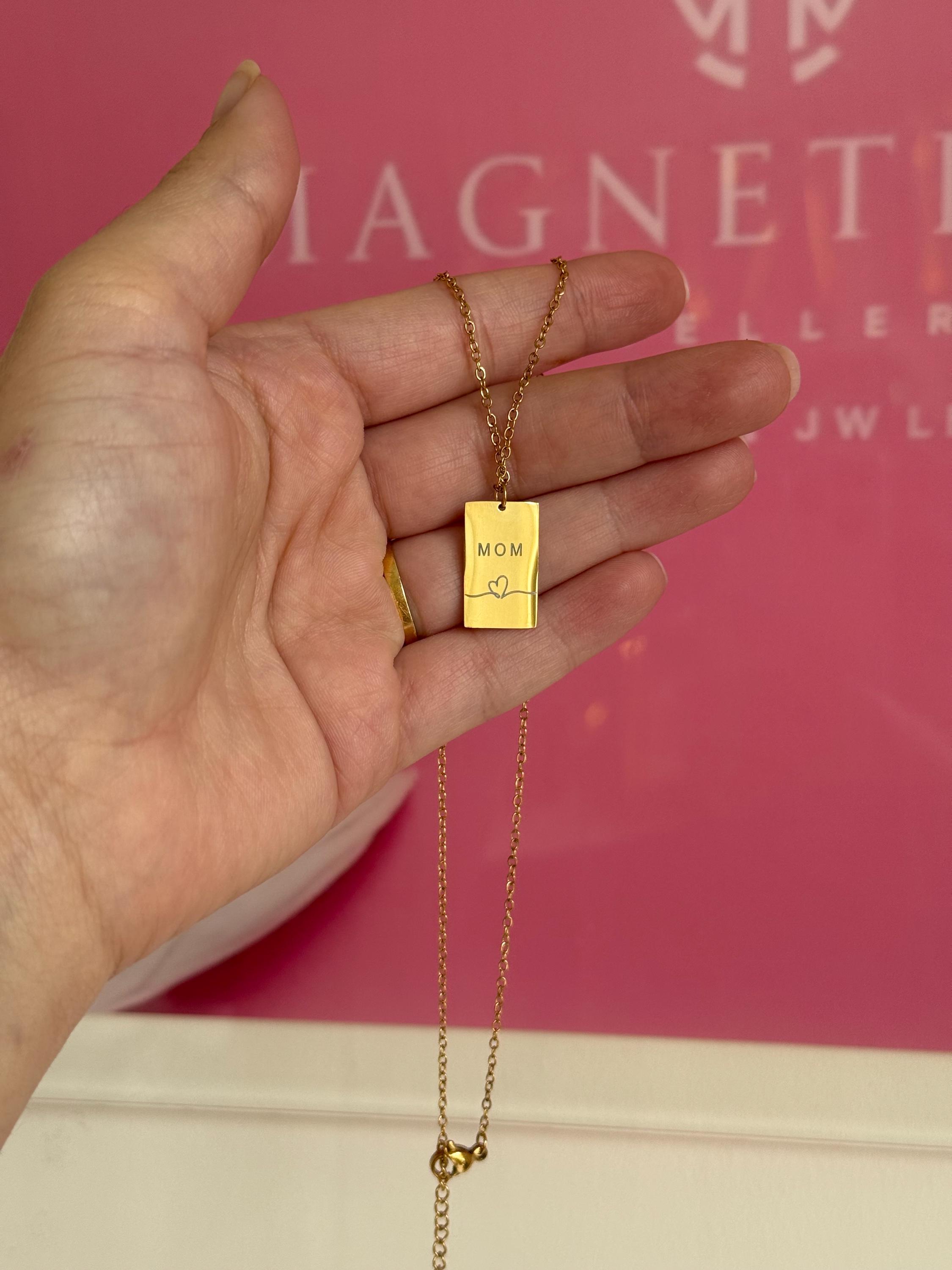 A meaningful and elegant necklace featuring a minimalist rectangular bar pendant engraved with the word “MOM” and a delicate heart detail. Simple yet full of emotion, this necklace is designed as a timeless symbol of love, appreciation, and motherhood.