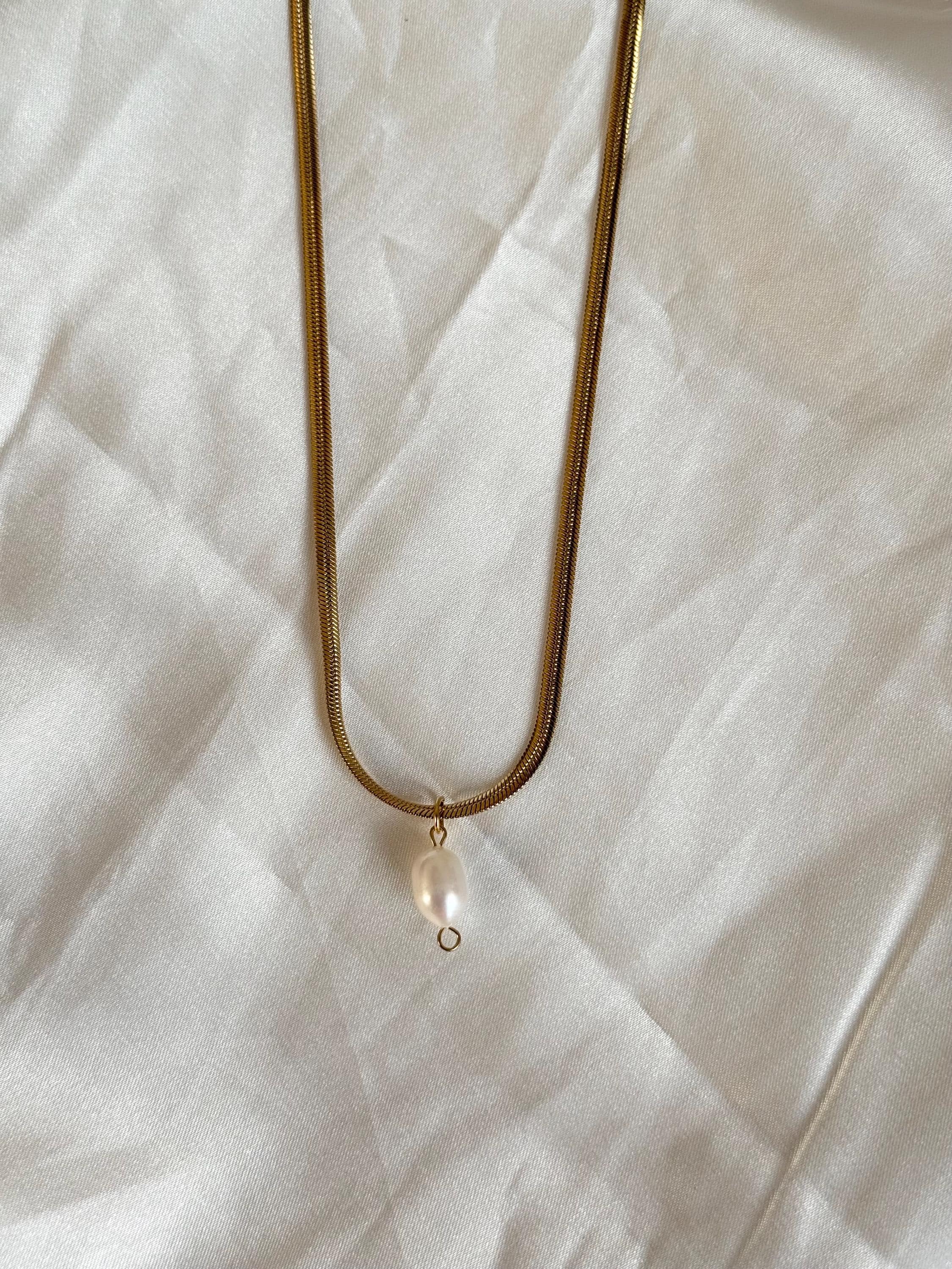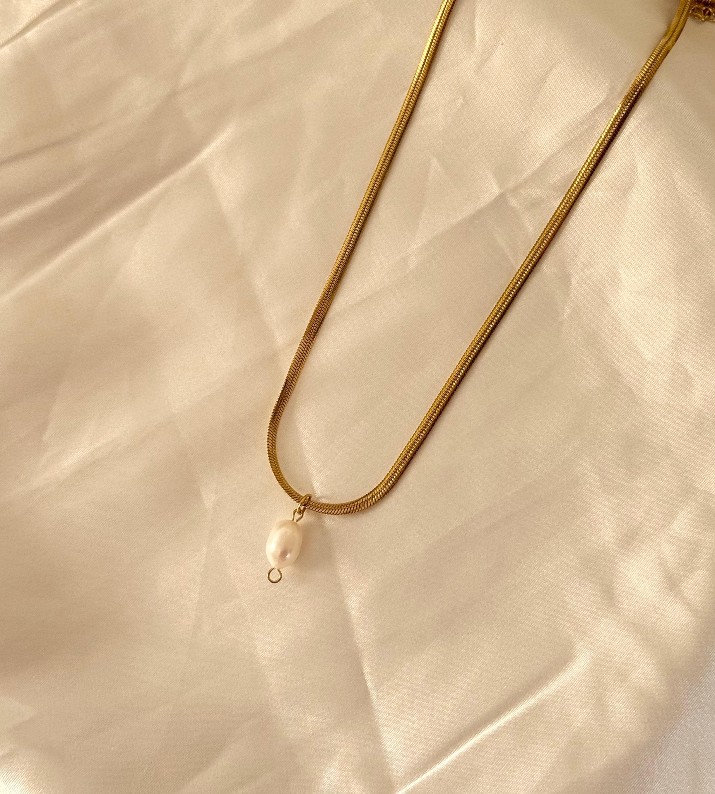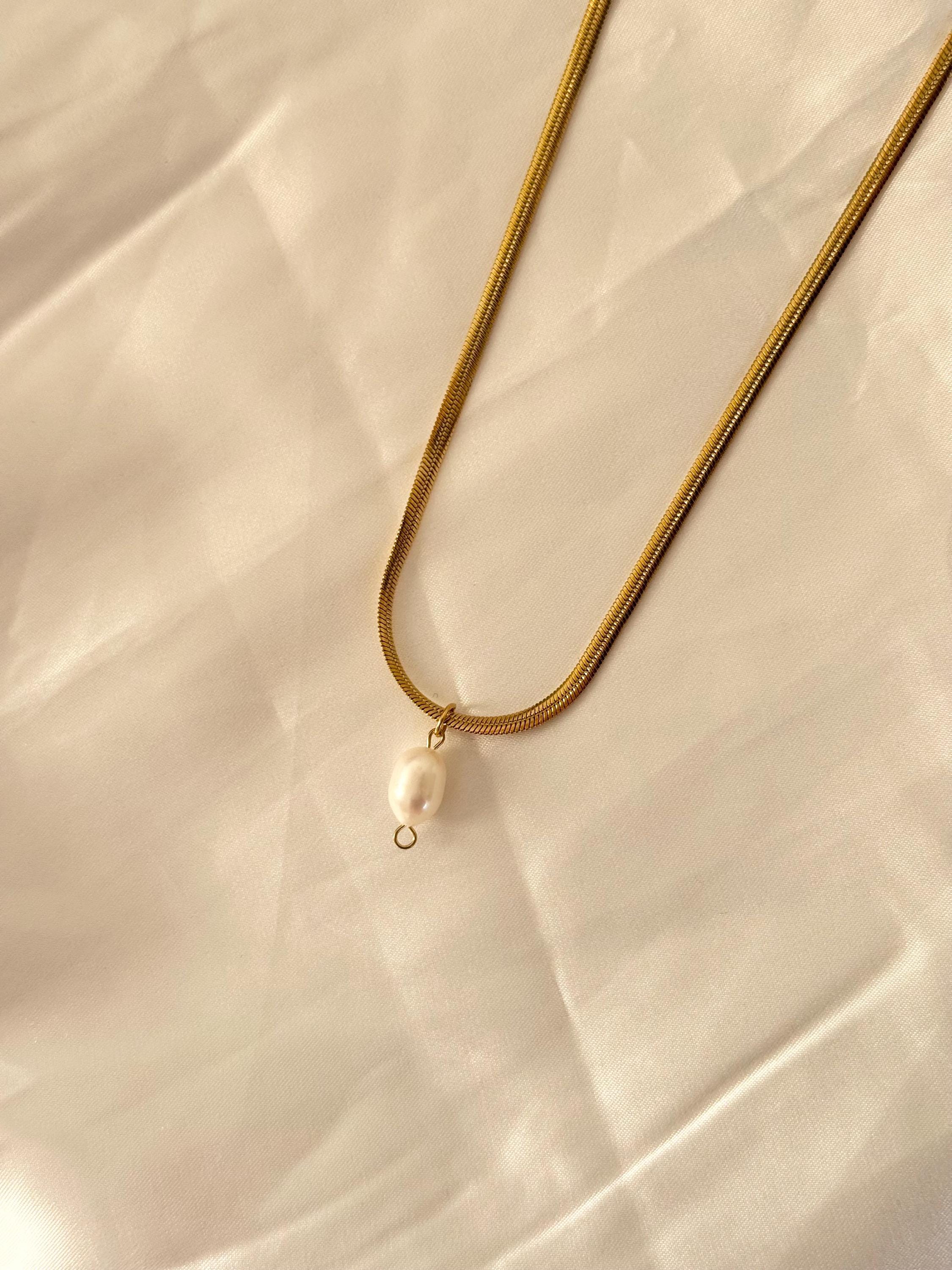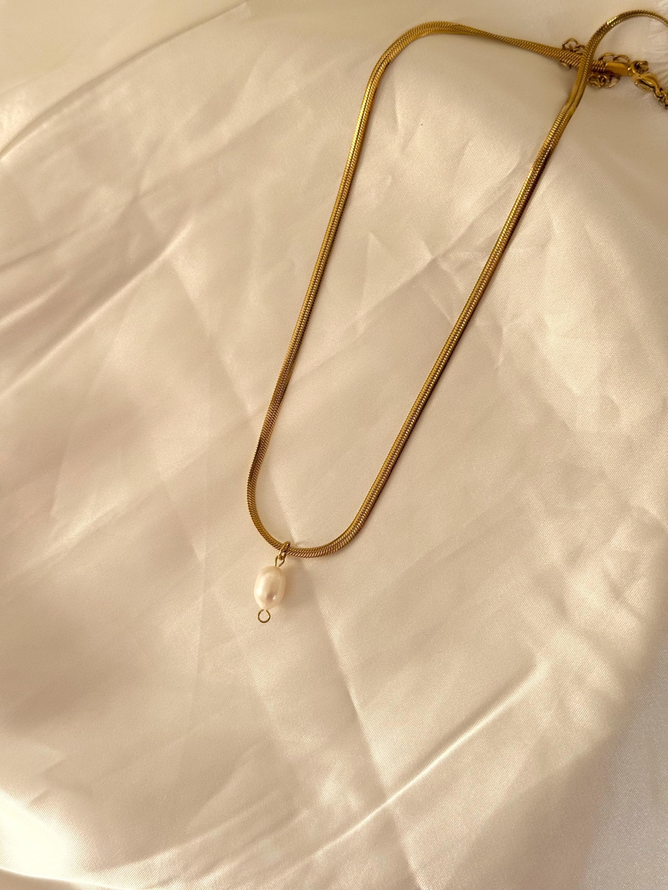 An elegant and timeless necklace featuring a smooth gold snake chain paired with a delicate pearl pendant. This minimalist design offers a refined and modern look, perfect for everyday wear or special occasions.