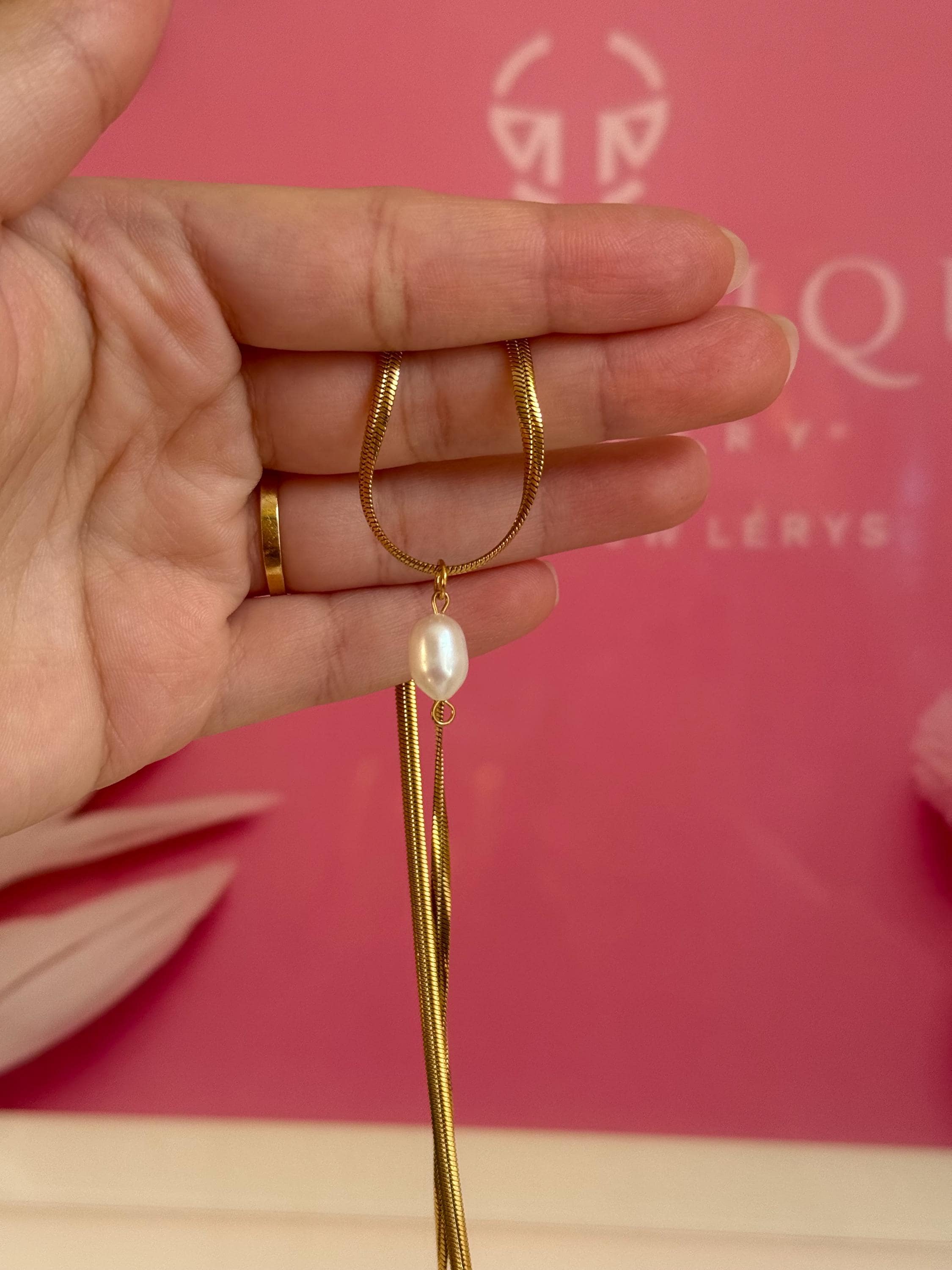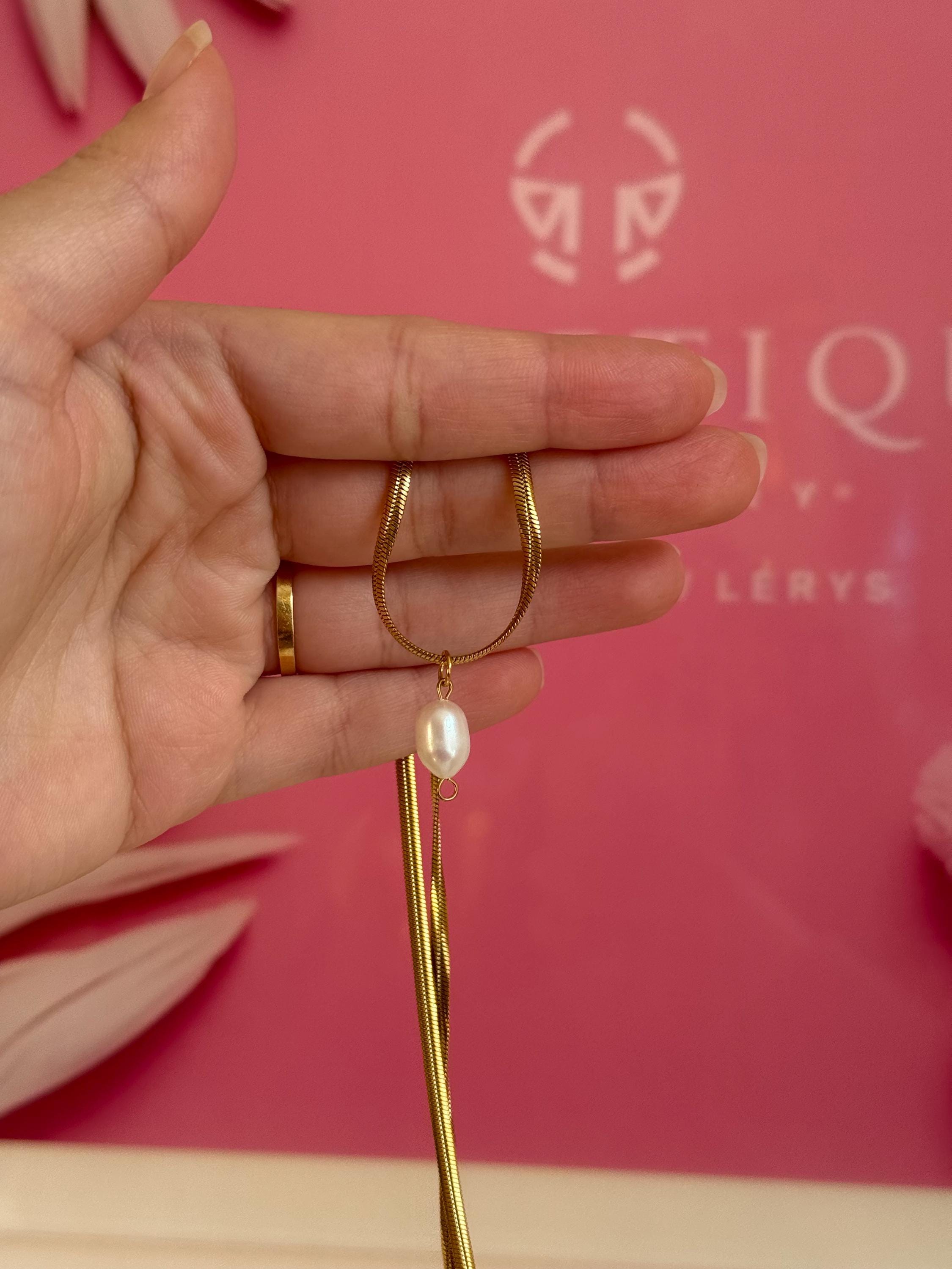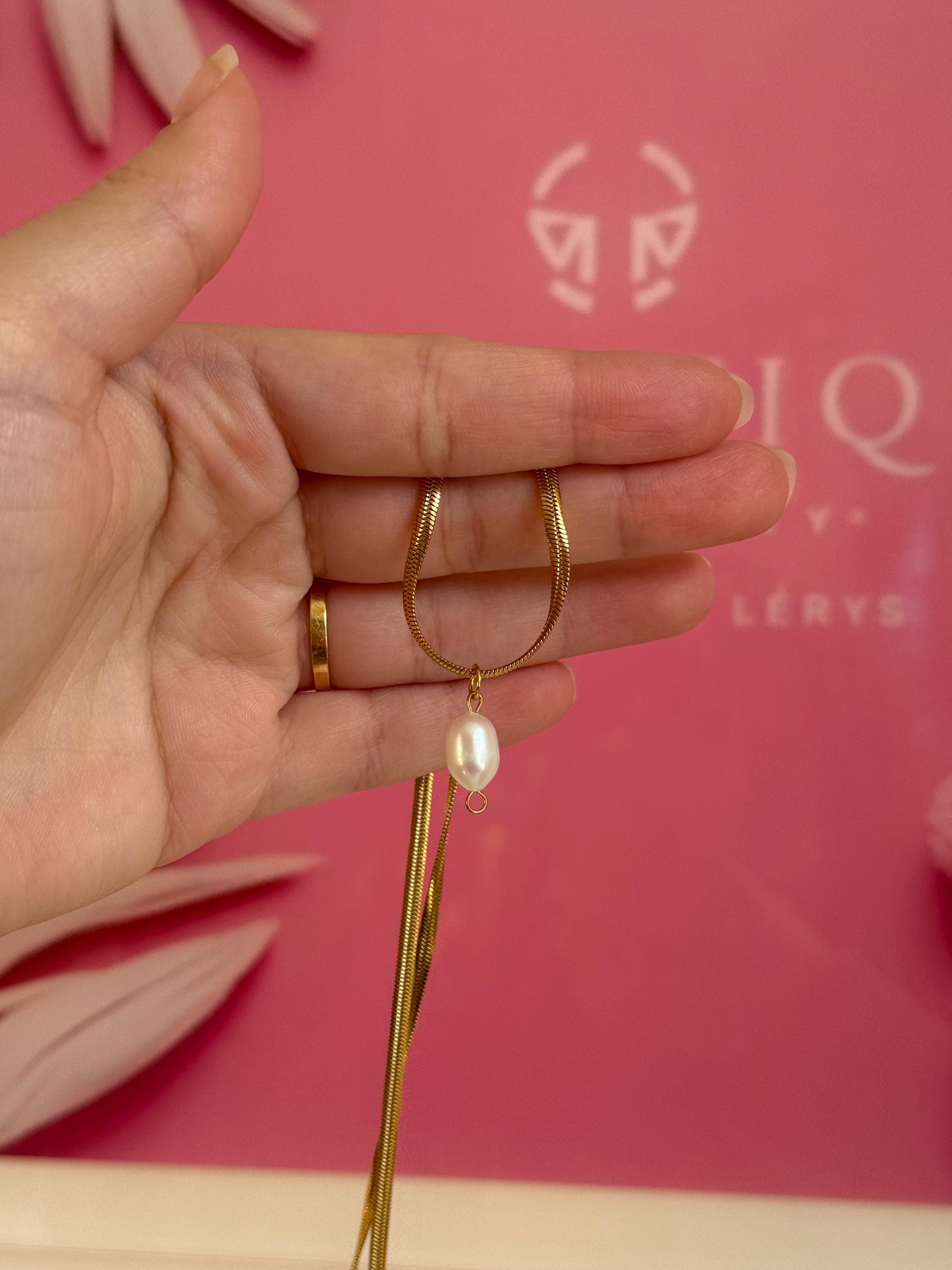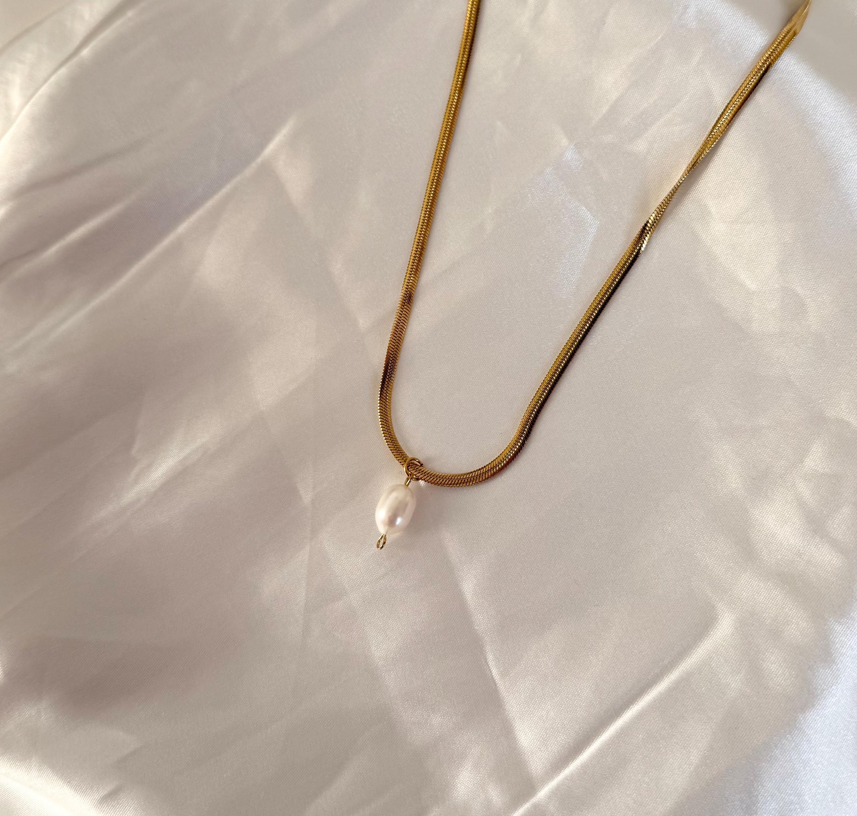 An elegant and timeless necklace featuring a smooth gold snake chain paired with a delicate pearl pendant. This minimalist design offers a refined and modern look, perfect for everyday wear or special occasions.