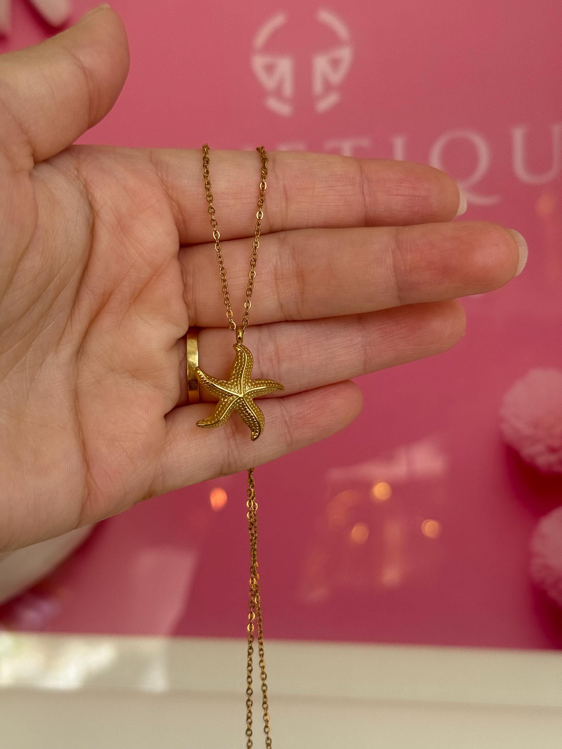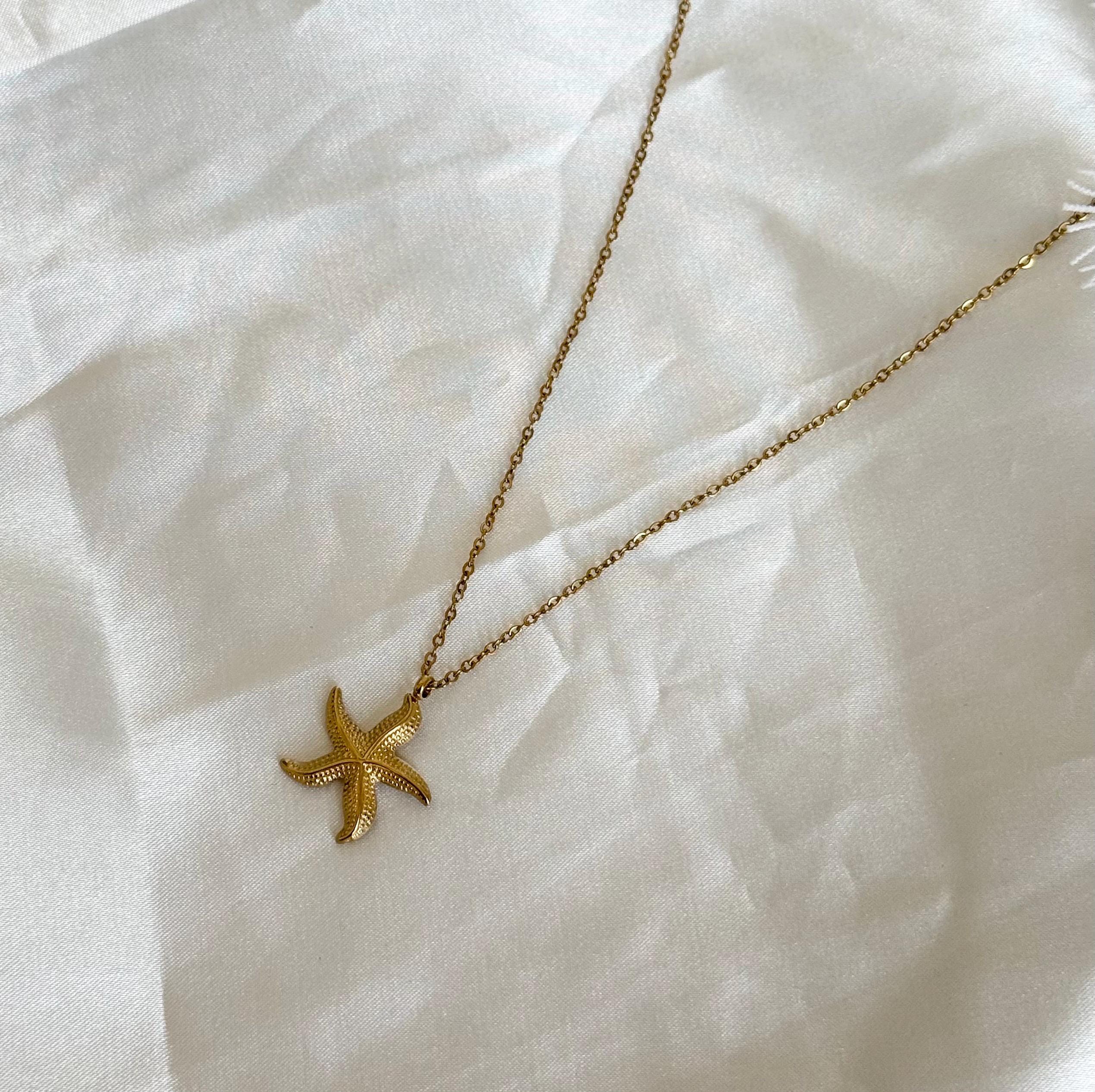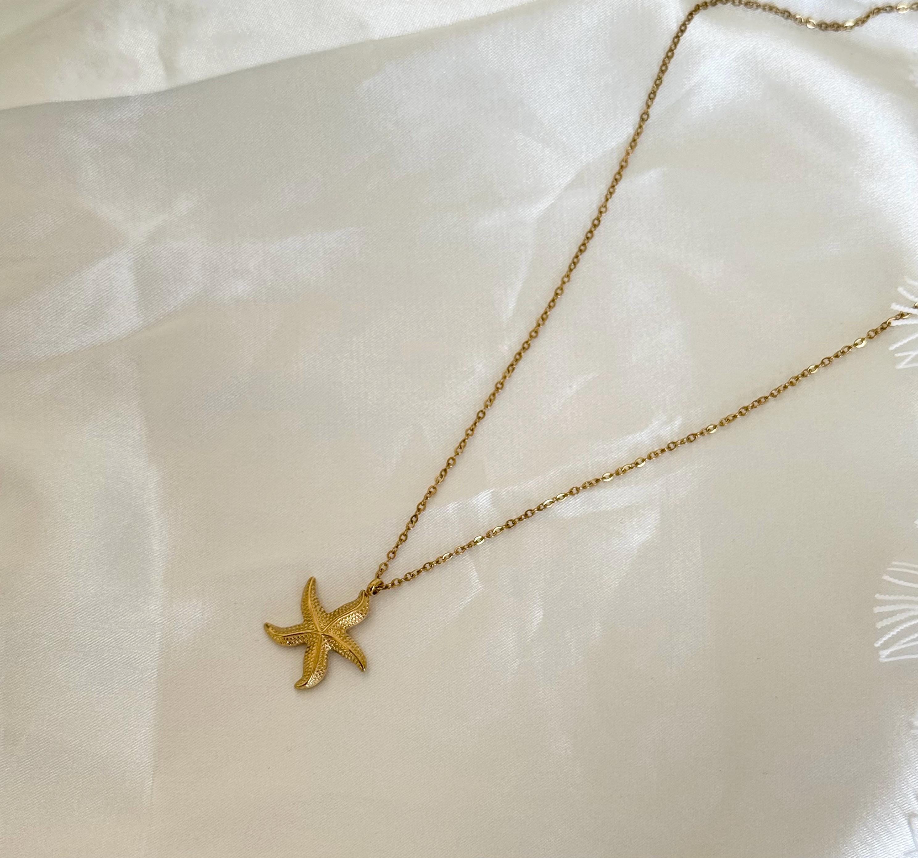 Details: • Material: Stainless steel • Color: Gold • Pendant shape: Starfish • Chain style: Fine link chain • Waterproof & tarnish resistant • Hypoallergenic • Suitable for everyday wear