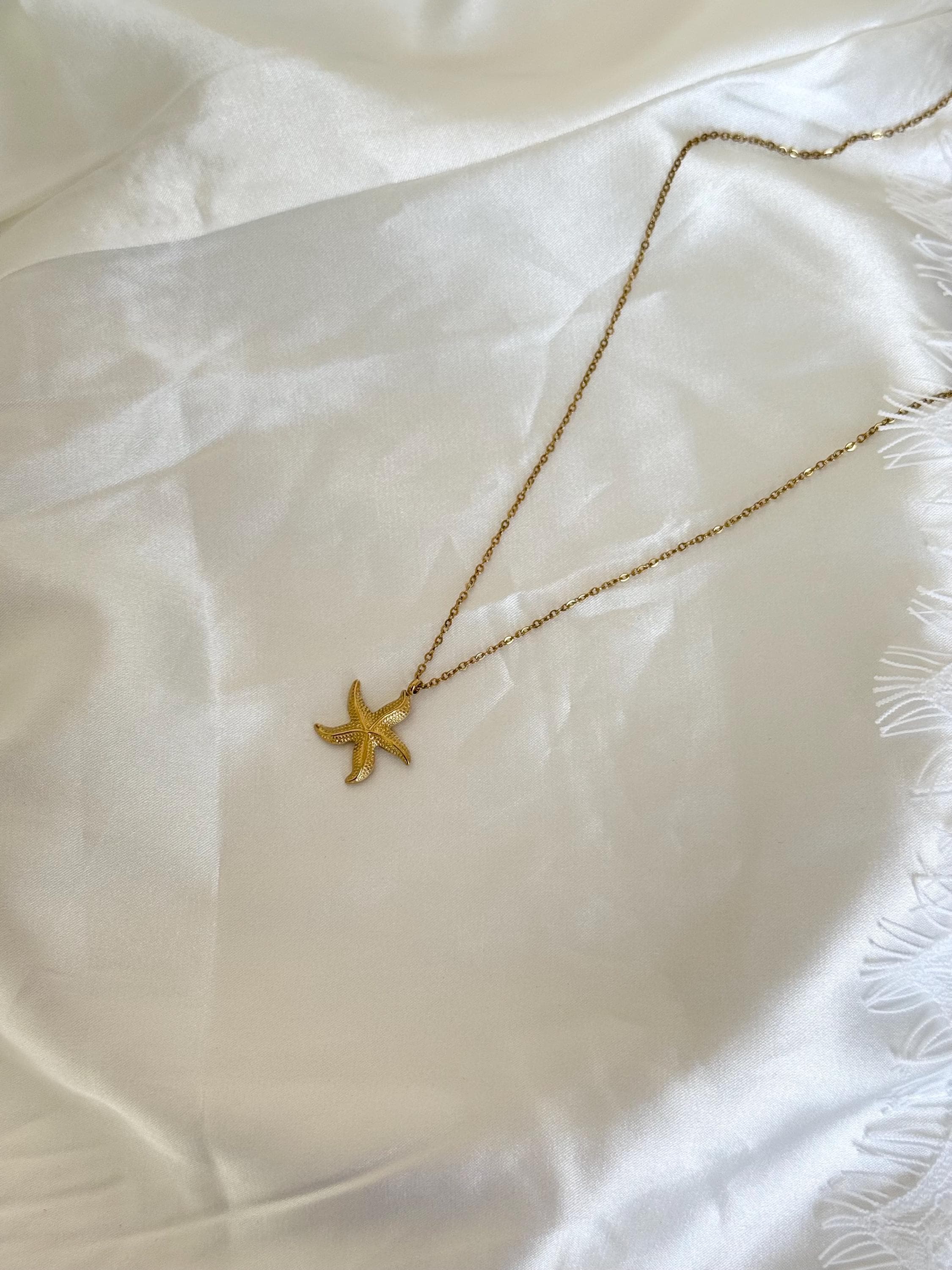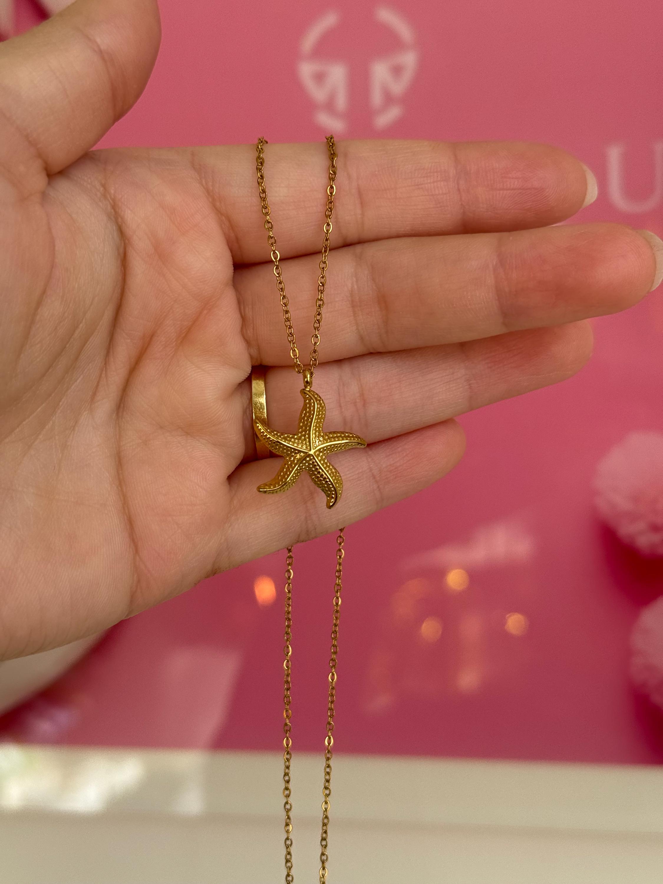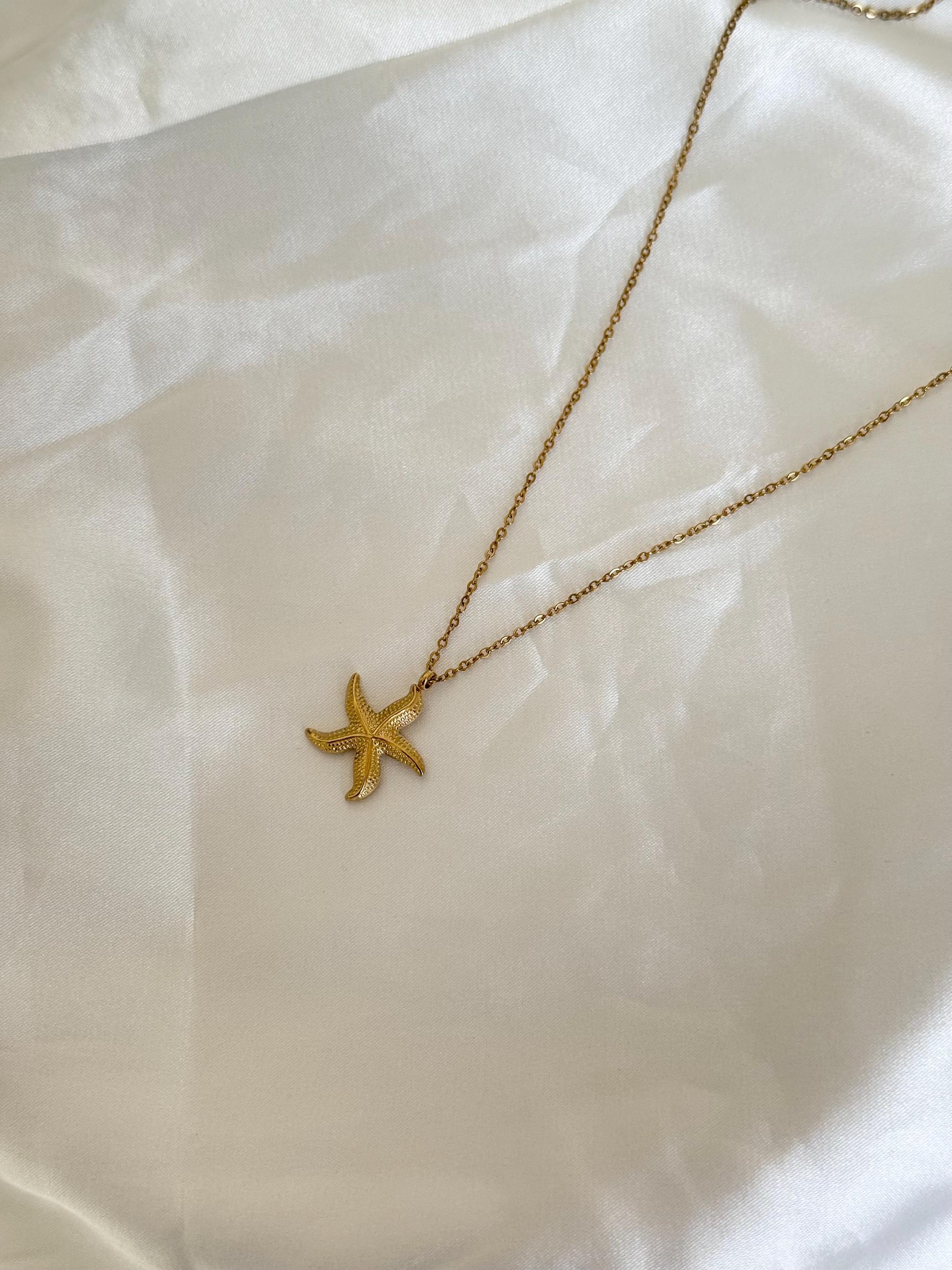 Details: • Material: Stainless steel • Color: Gold • Pendant shape: Starfish • Chain style: Fine link chain • Waterproof & tarnish resistant • Hypoallergenic • Suitable for everyday wear