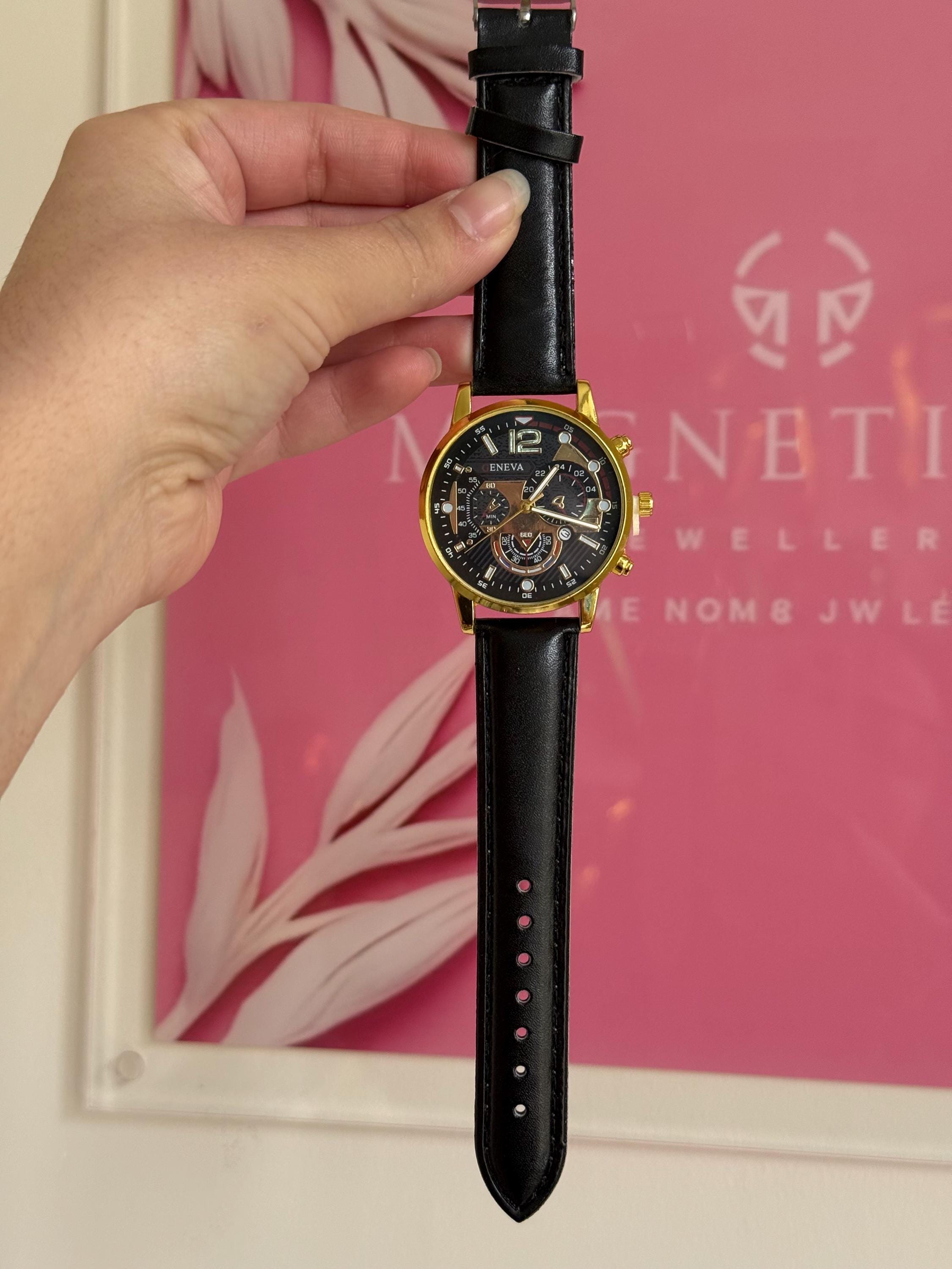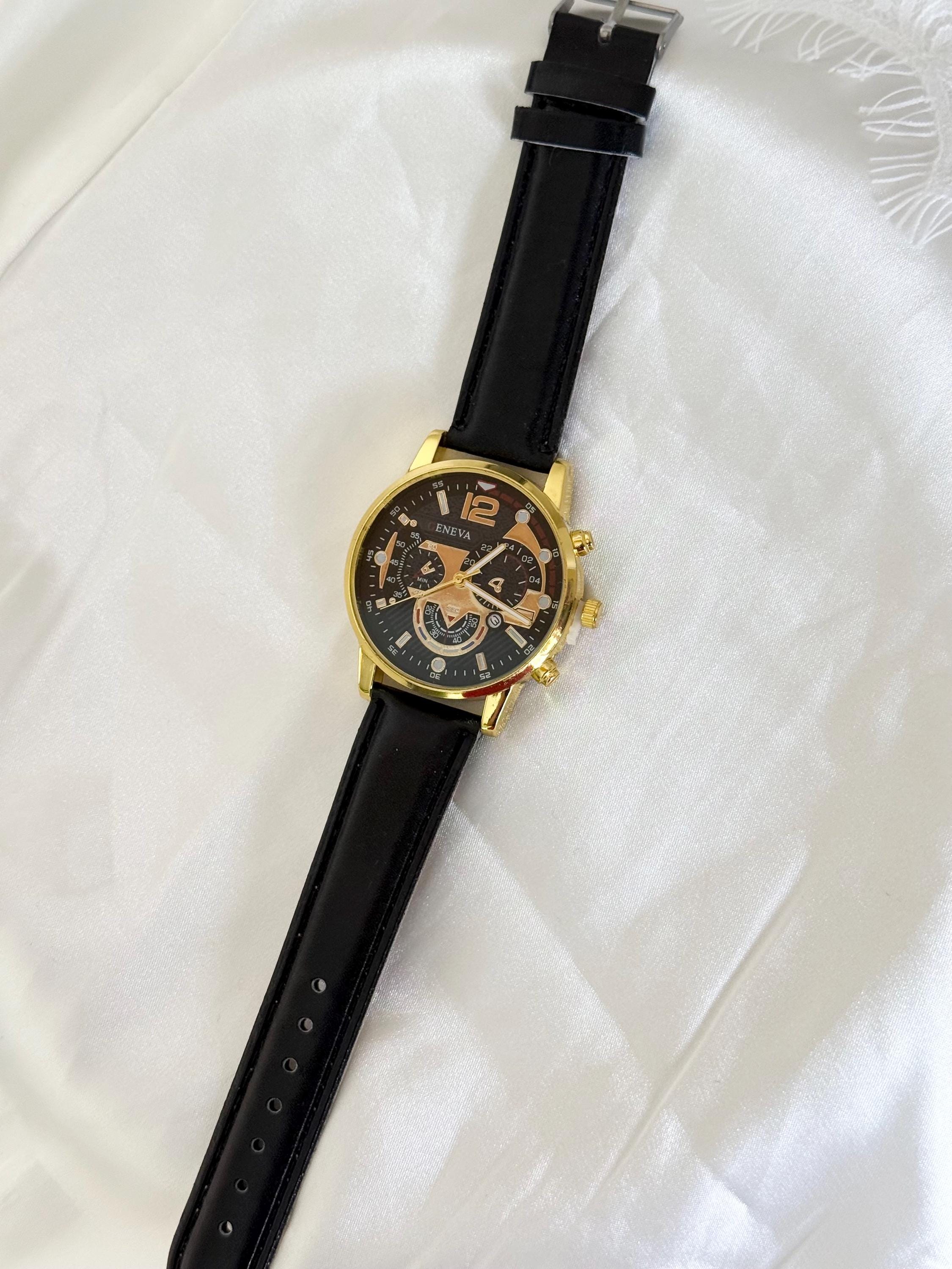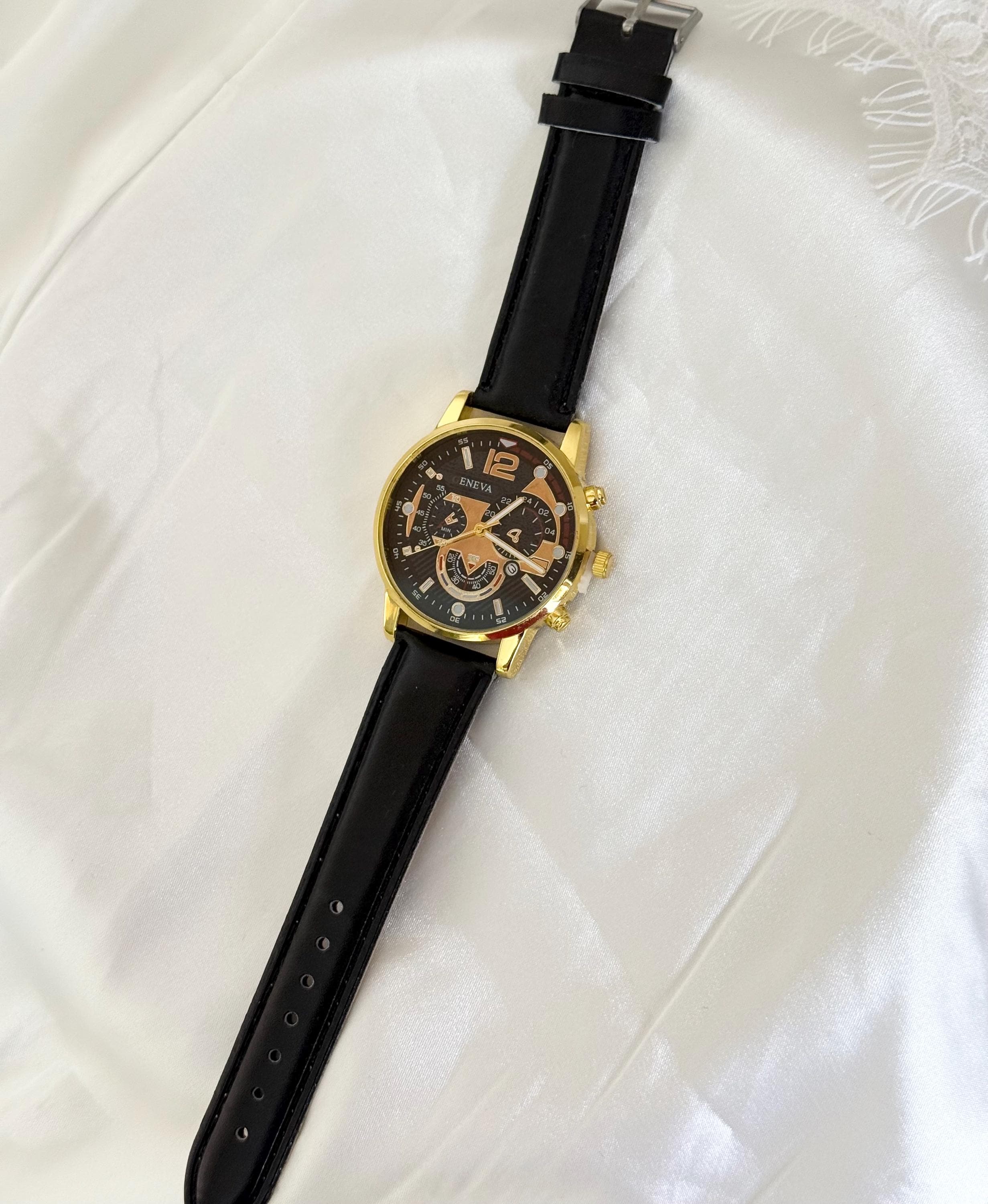 ✔ Quartz movement ✔ Gold tone alloy case ✔ Black dial ✔ Black leather strap ✔ Adjustable buckle closure ✔ Decorative subdials (non-functional) ✔ Lightweight & comfortable