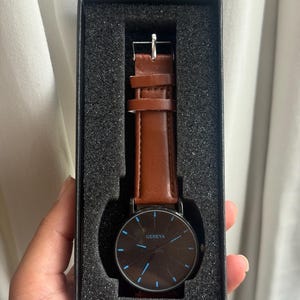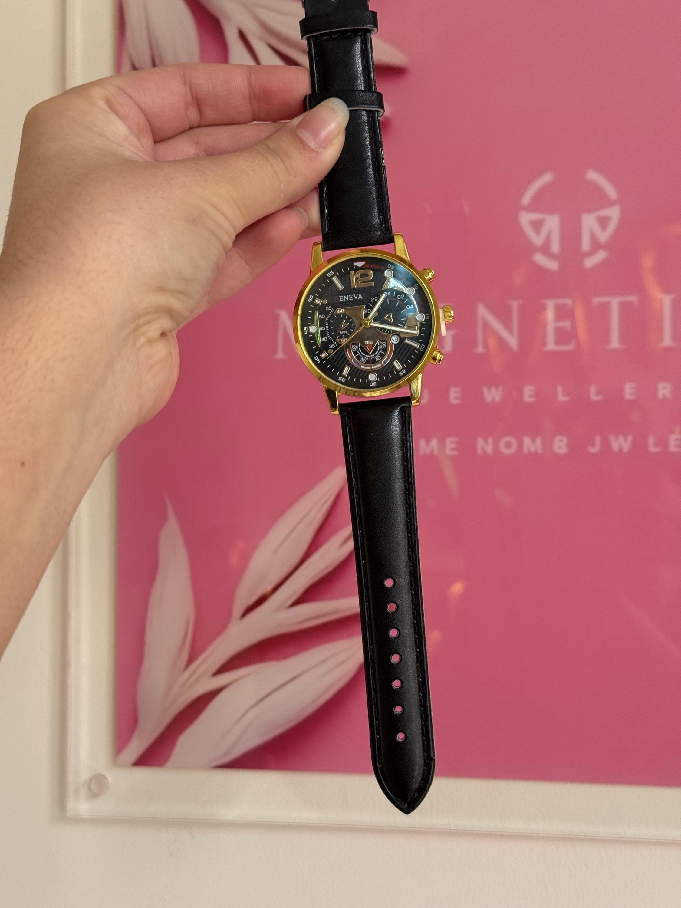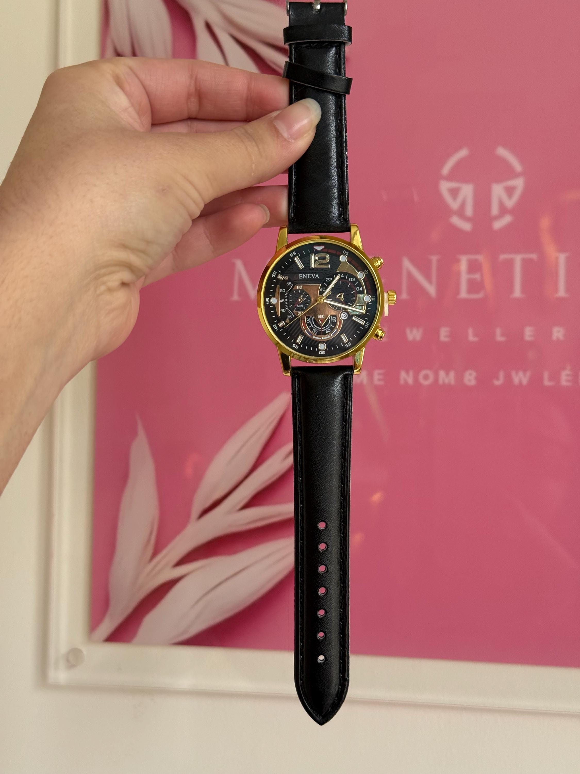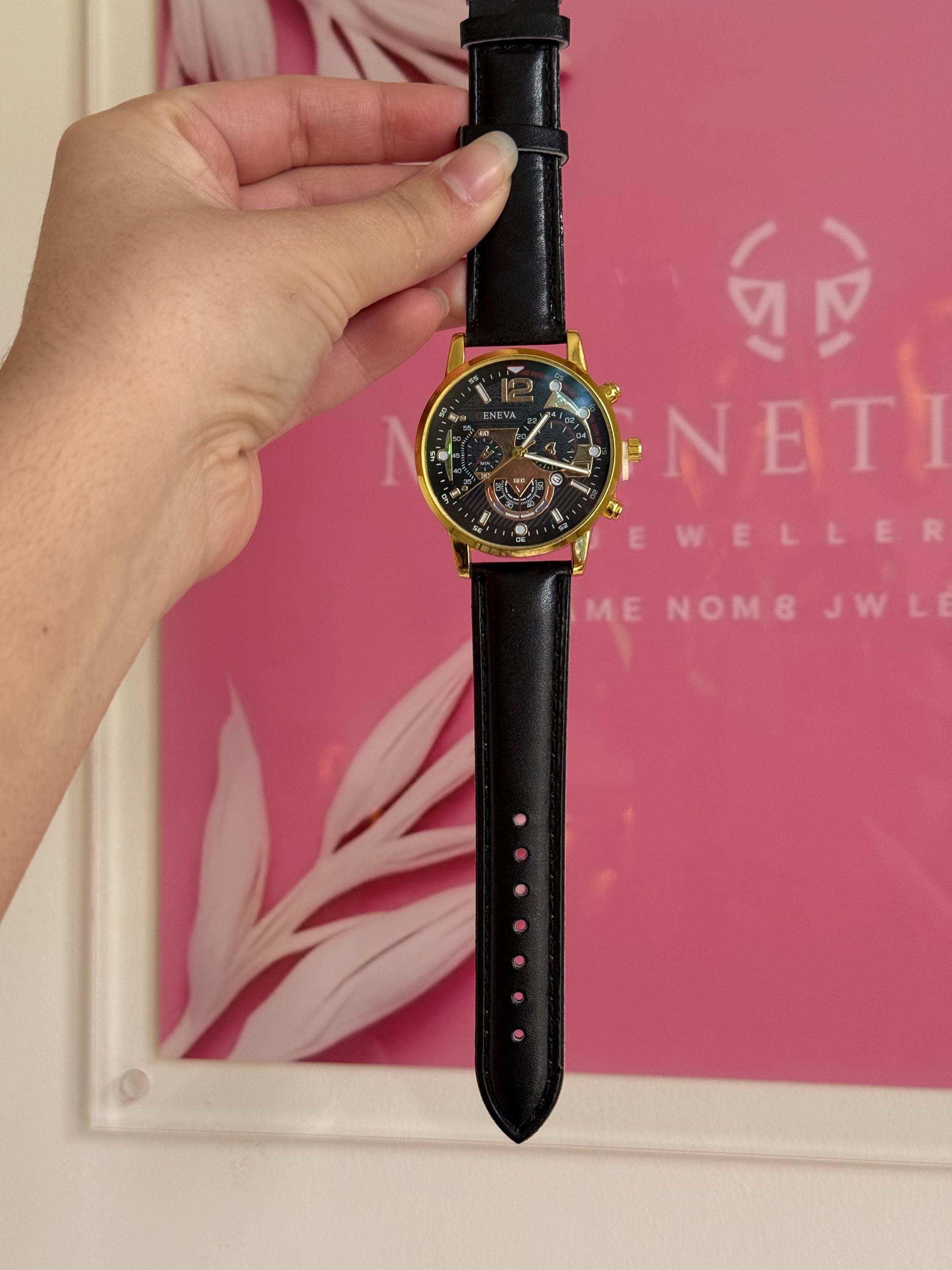 ✔ Quartz movement ✔ Gold tone alloy case ✔ Black dial ✔ Black leather strap ✔ Adjustable buckle closure ✔ Decorative subdials (non-functional) ✔ Lightweight & comfortable