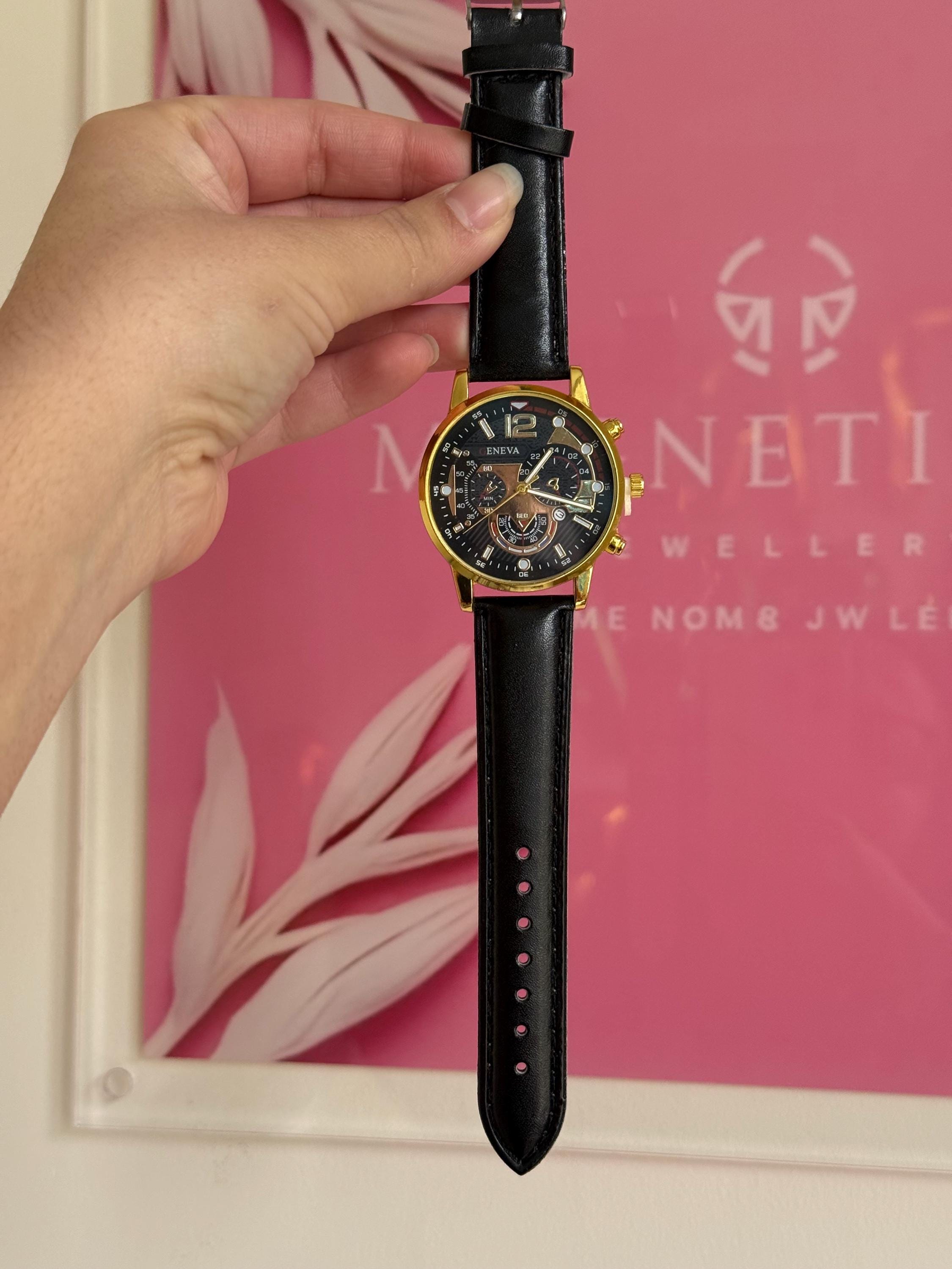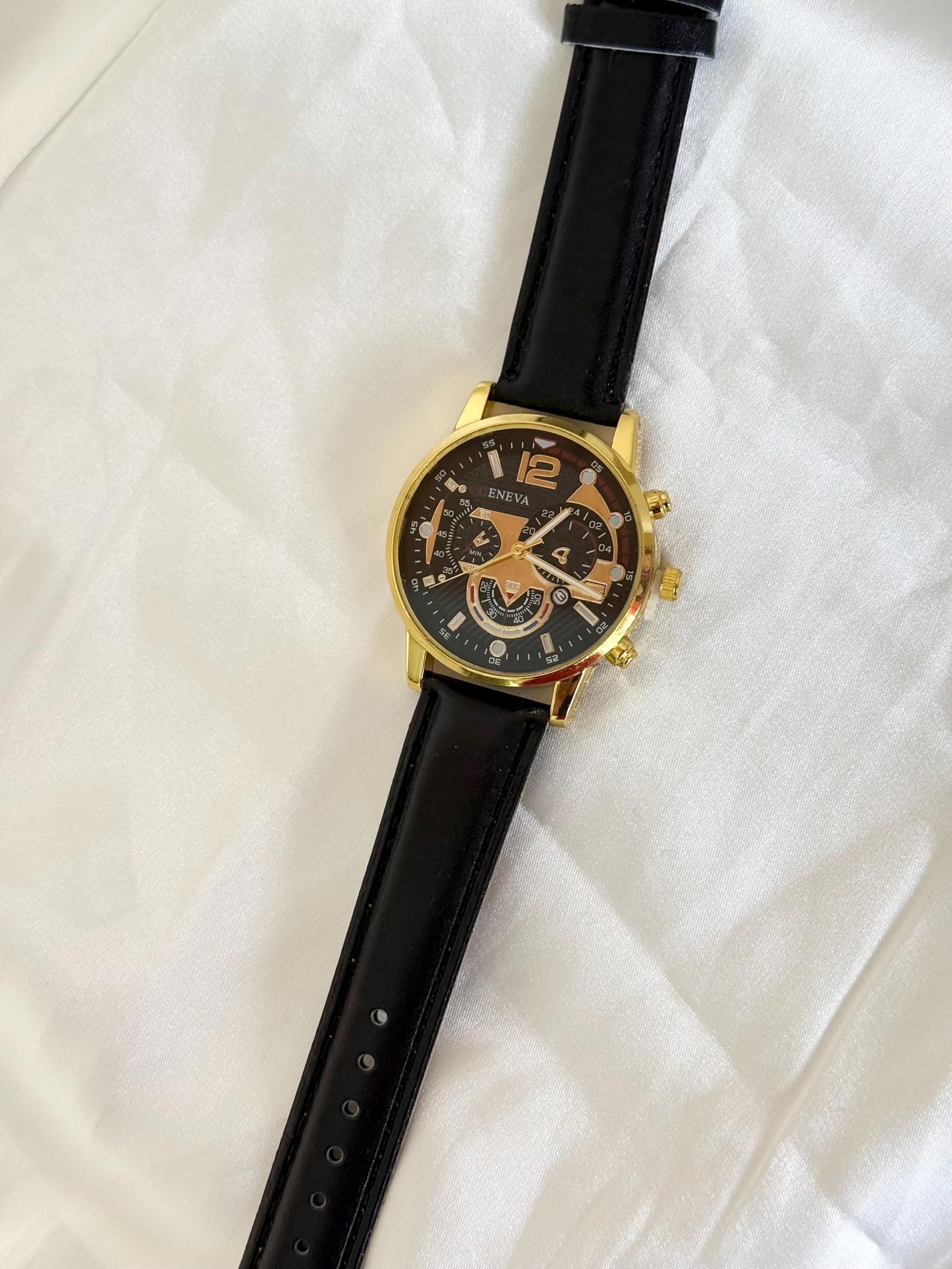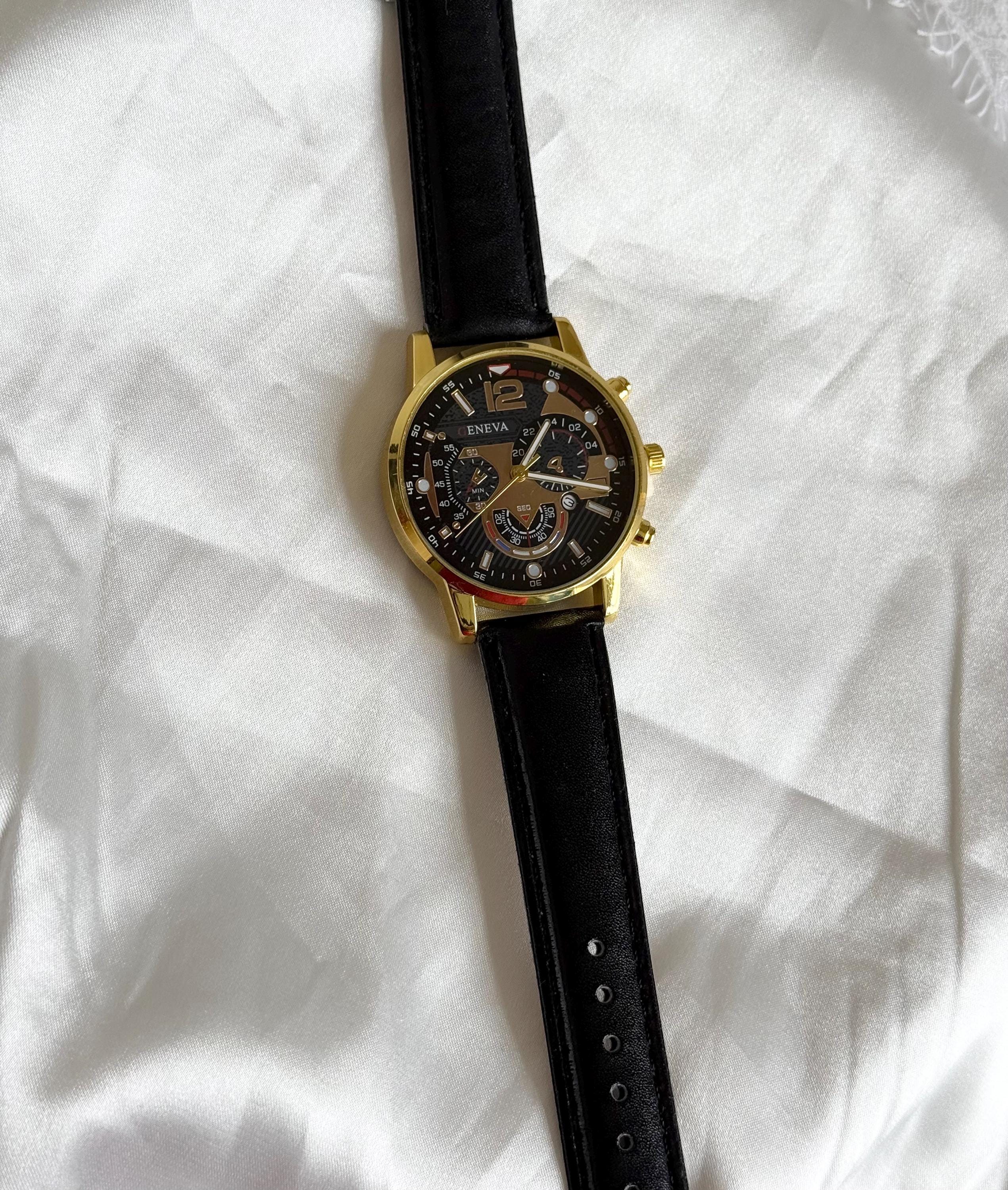 Men’s quartz watch featuring a gold tone case, black dial and classic black leather strap.✨ A timeless everyday accessory with bold chronograph-style detailing. The central hour, minute and second hands function normally, while the smaller subdials are decorative elements that enhance the sporty design.