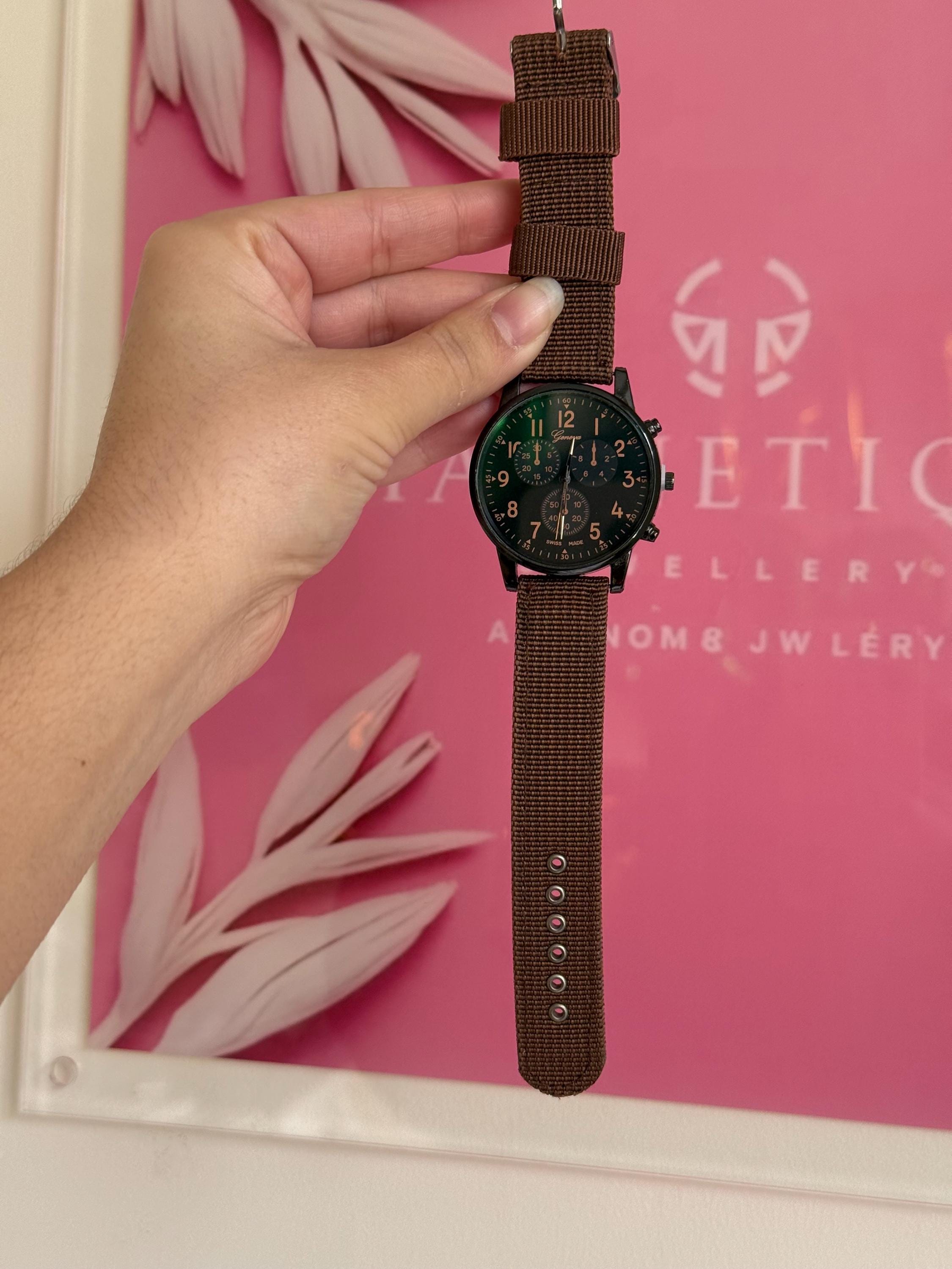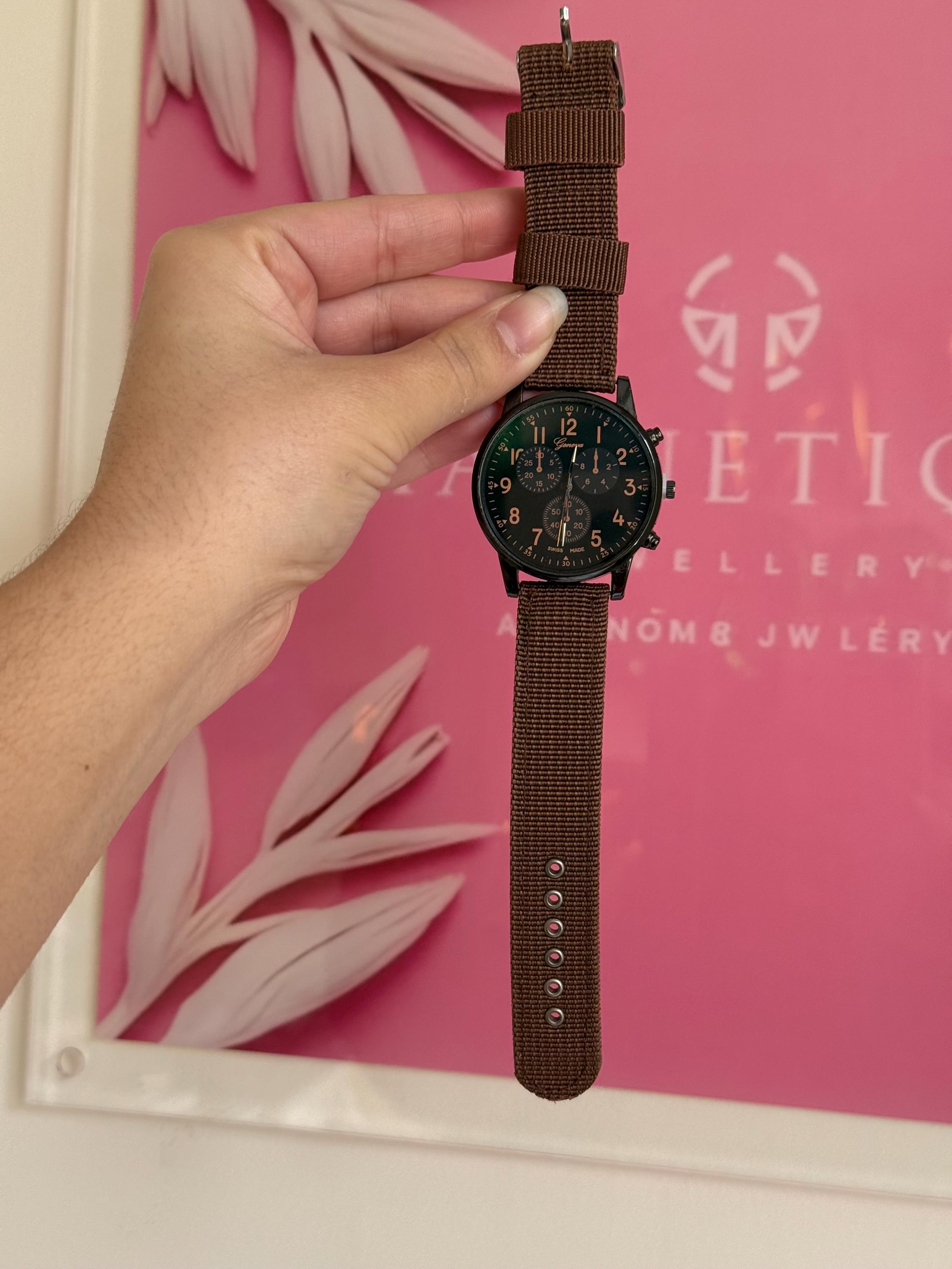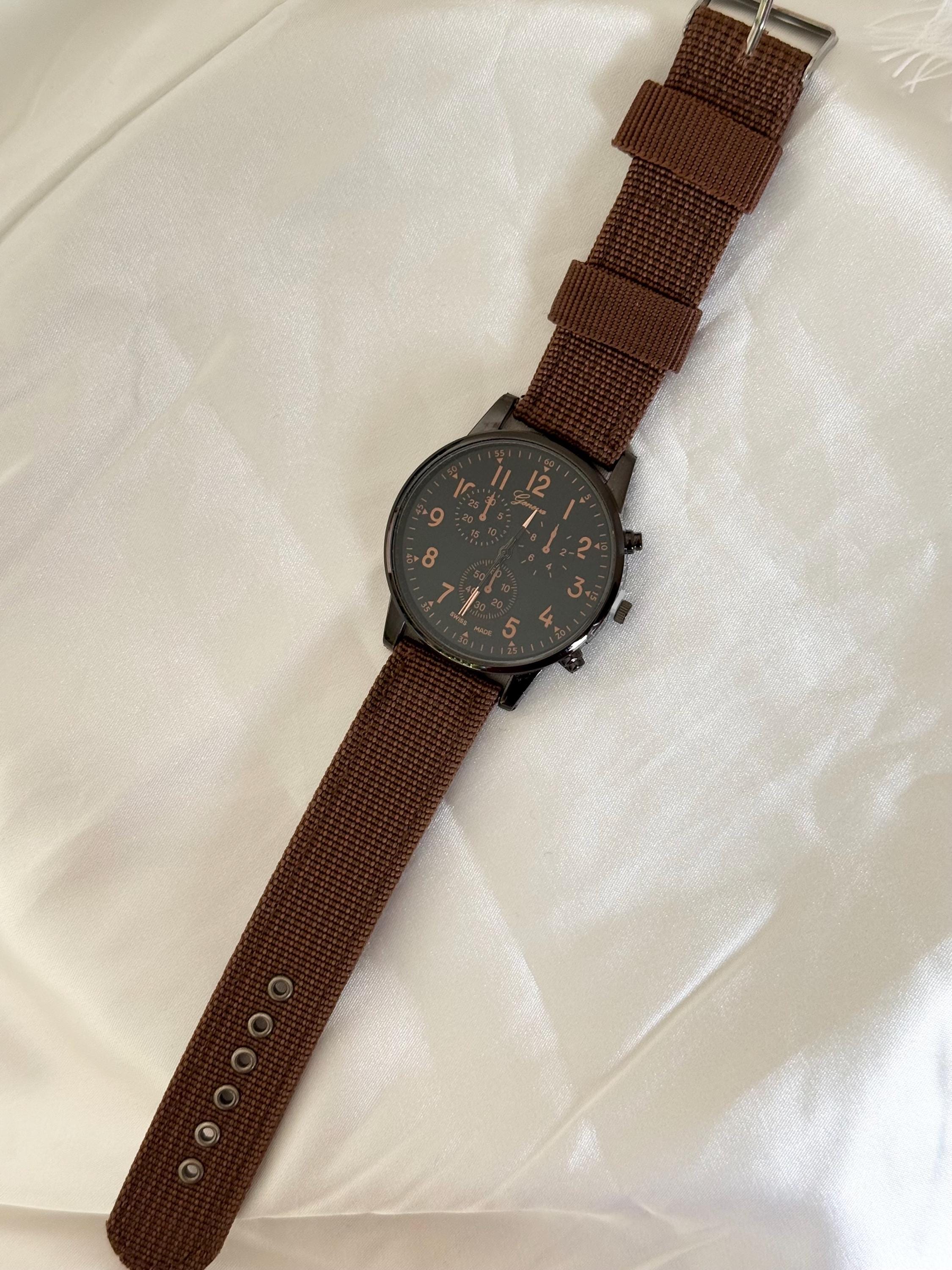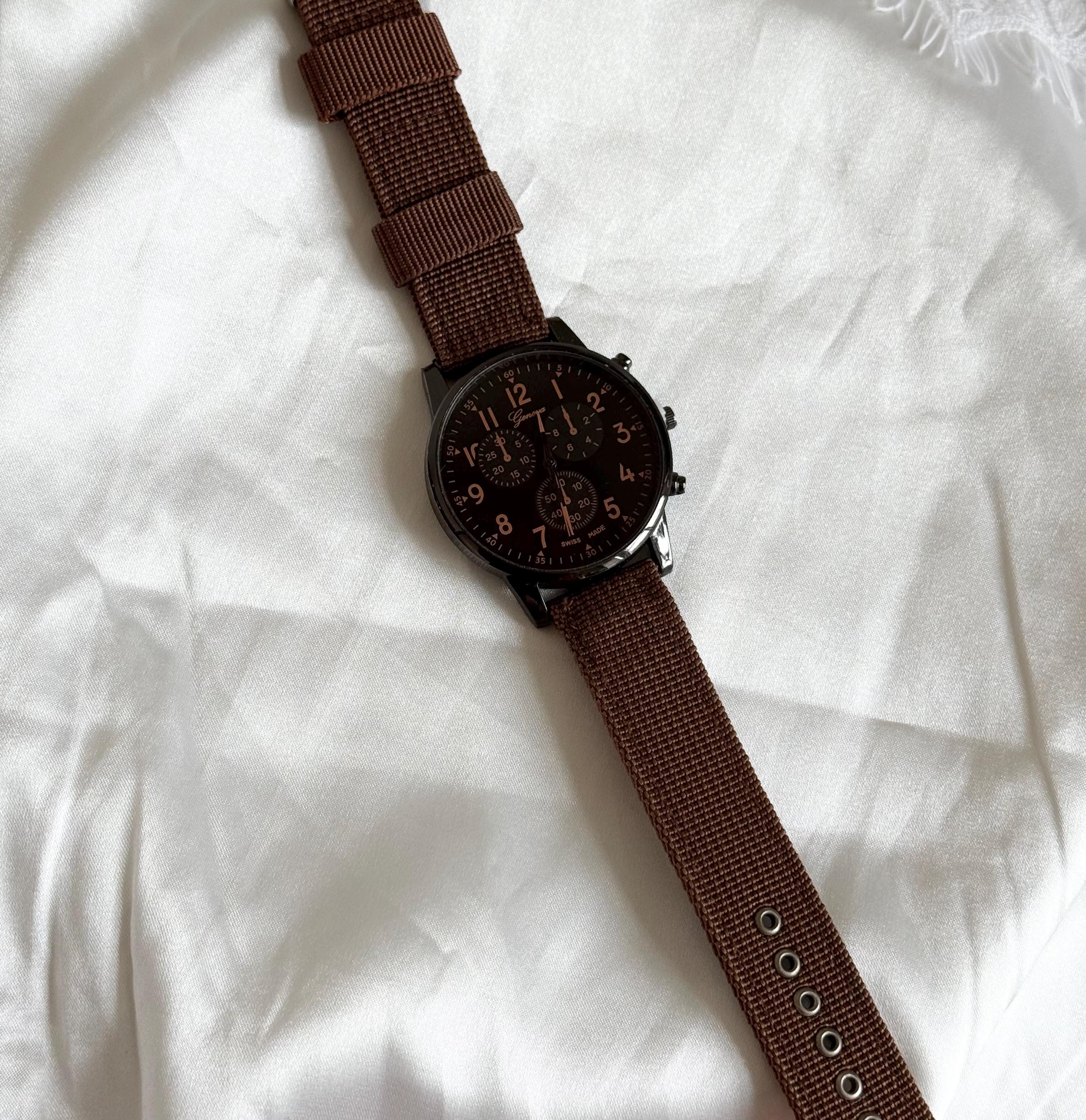 ✔ Quartz movement ✔ Black round dial ✔ Decorative subdials (non-functional) ✔ Brown adjustable nylon strap ✔ Lightweight & comfortable ✔ Casual / everyday style