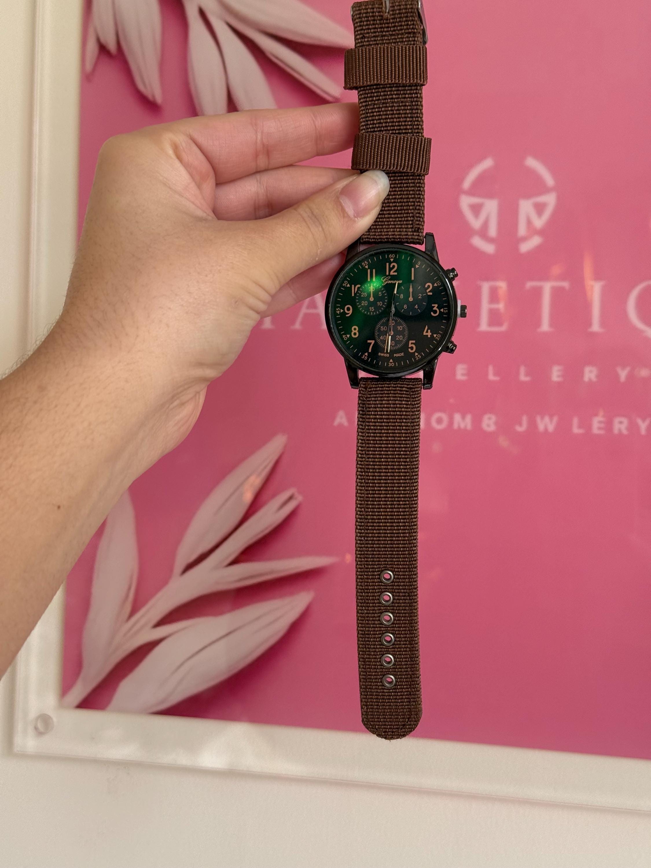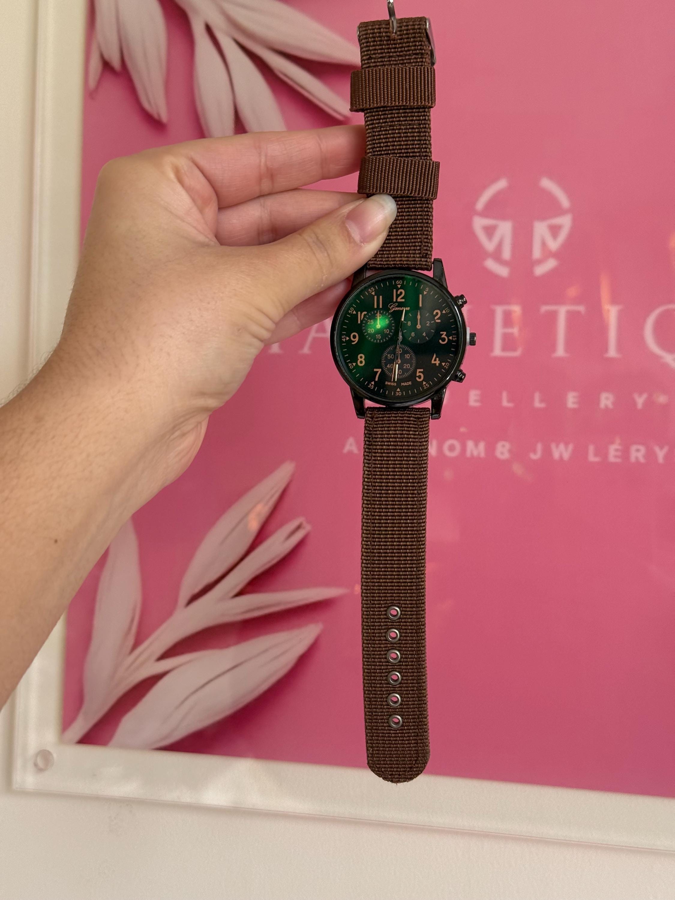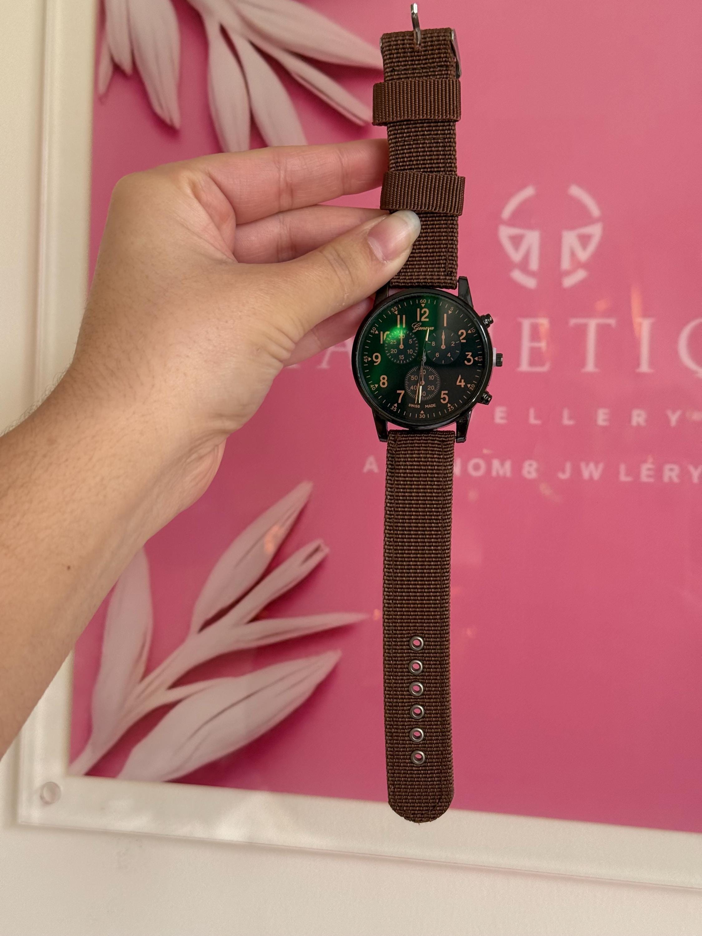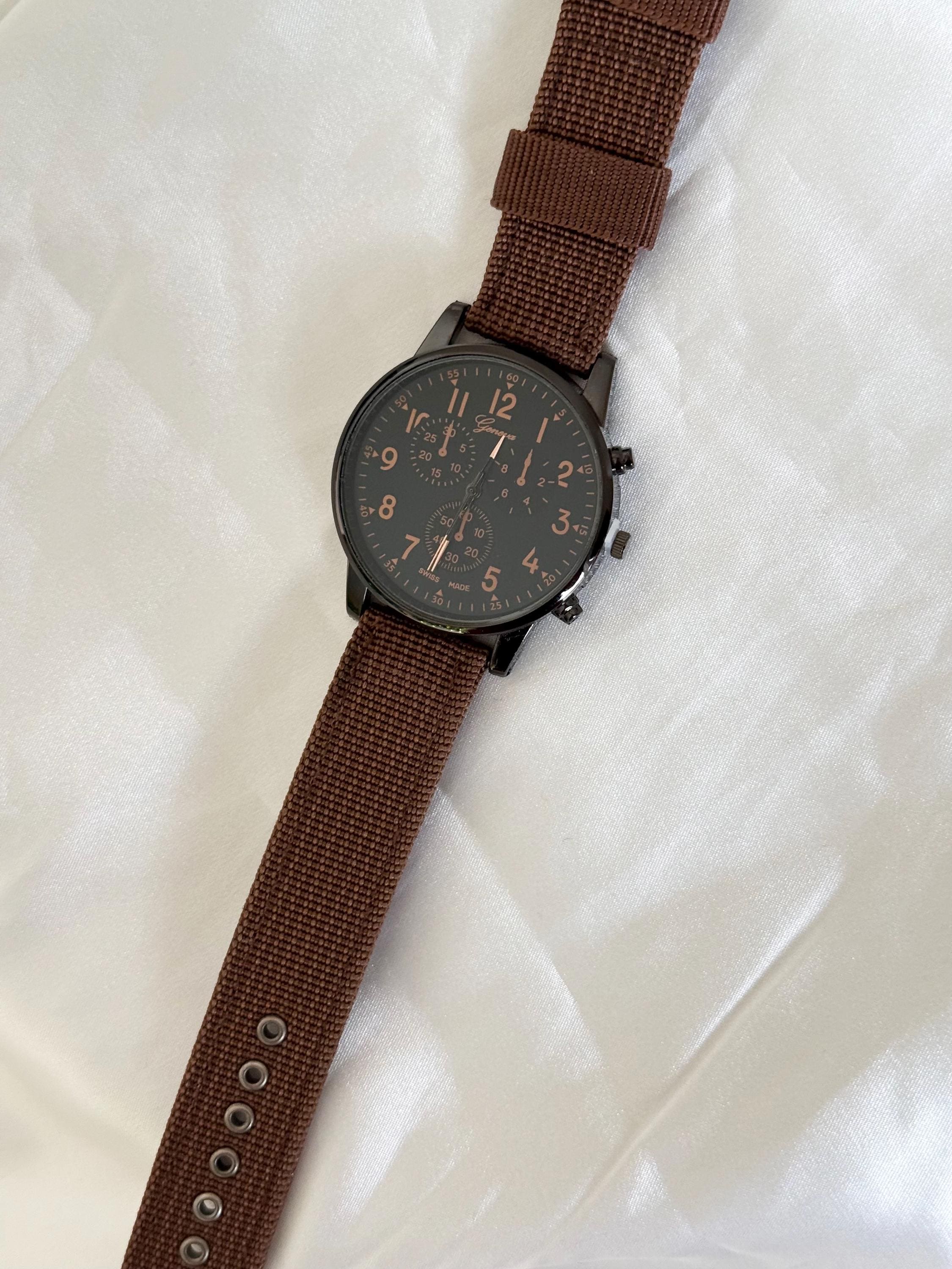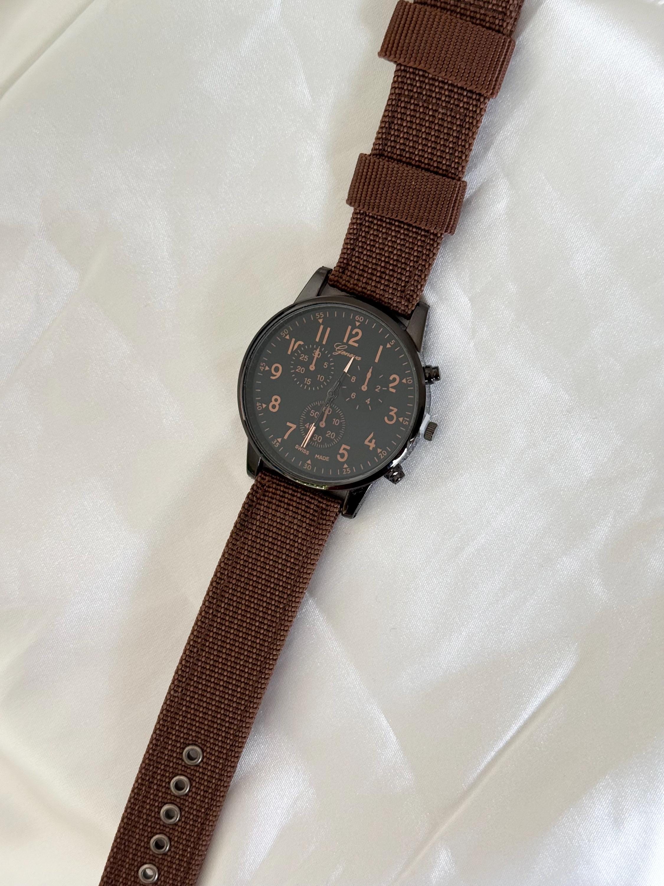 ✔ Quartz movement ✔ Black round dial ✔ Decorative subdials (non-functional) ✔ Brown adjustable nylon strap ✔ Lightweight & comfortable ✔ Casual / everyday style