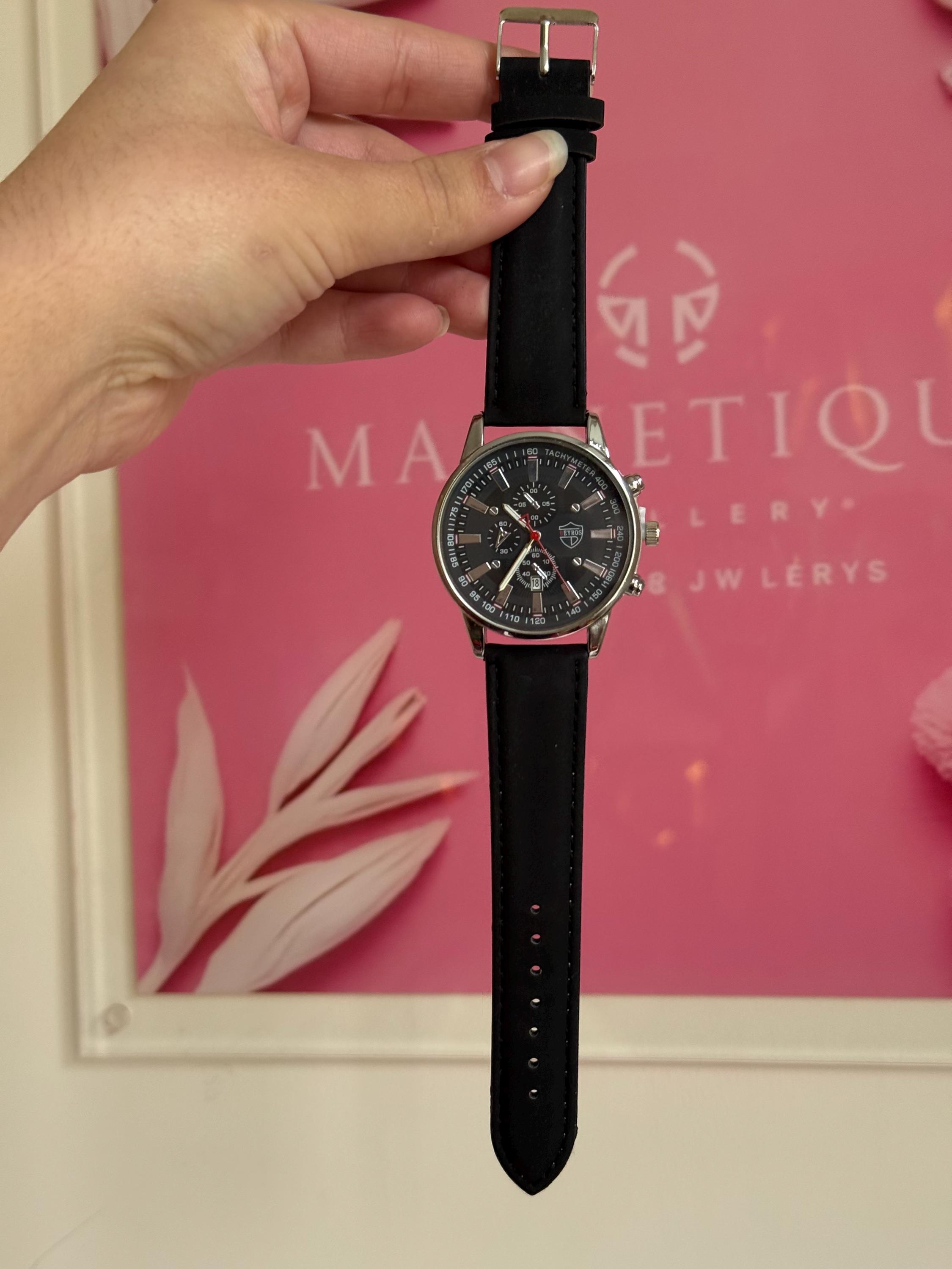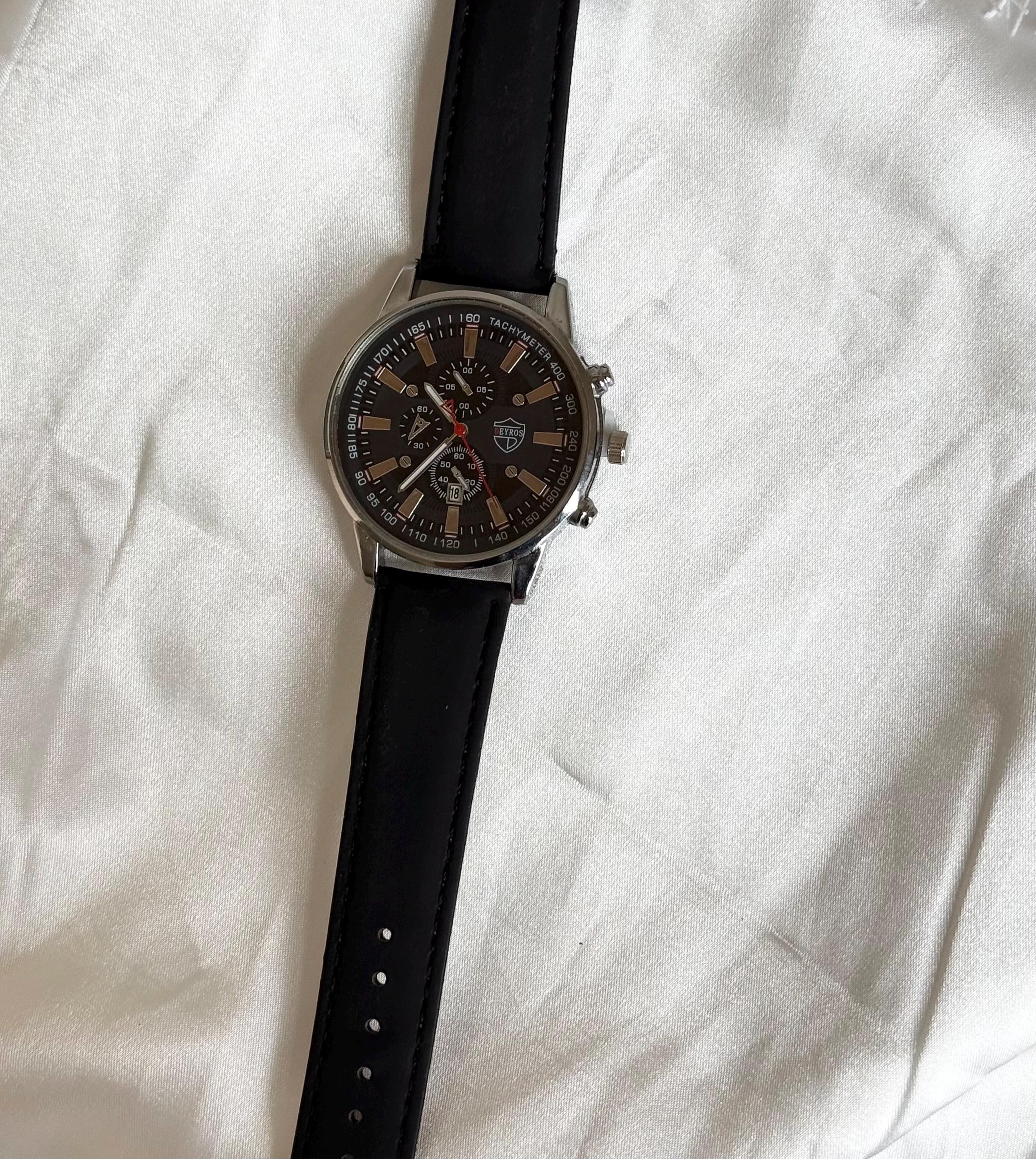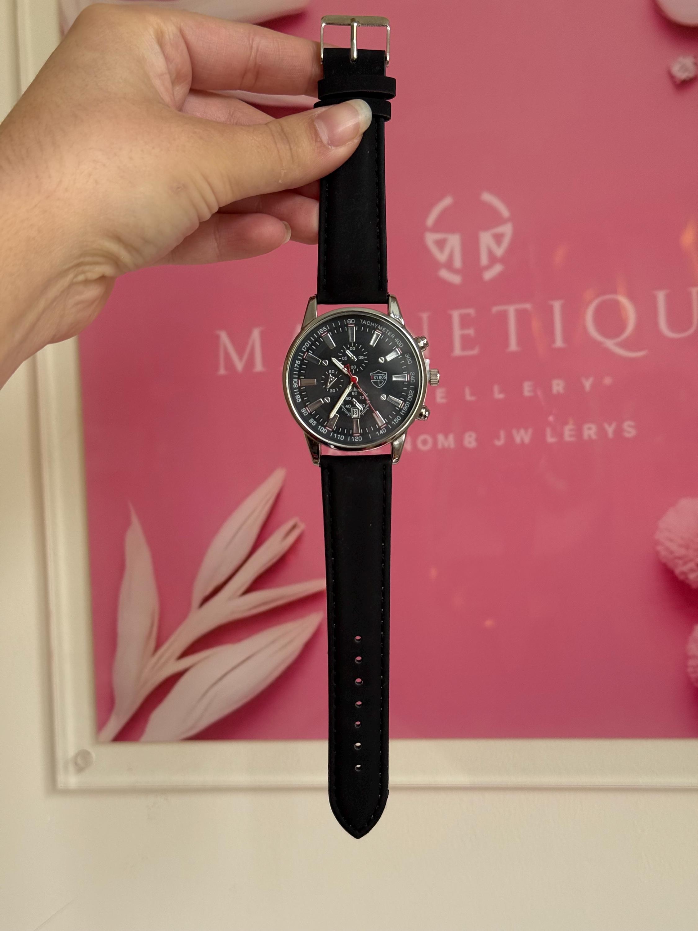 ✔ Quartz movement ✔ Silver tone alloy case ✔ Black dial ✔ Soft black suede strap ✔ Adjustable buckle closure ✔ Decorative subdials (non-functional) ✔ Comfortable everyday wear