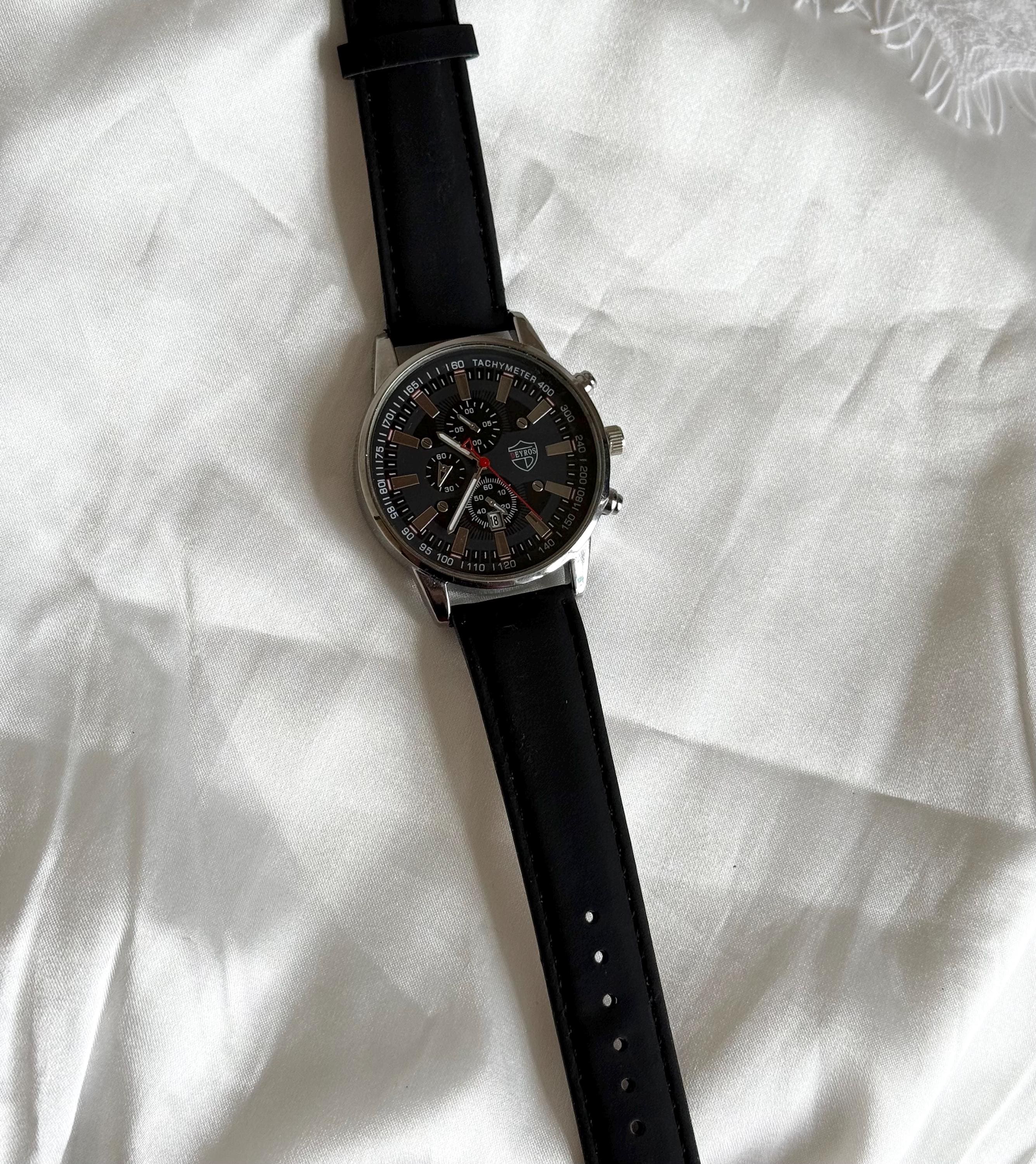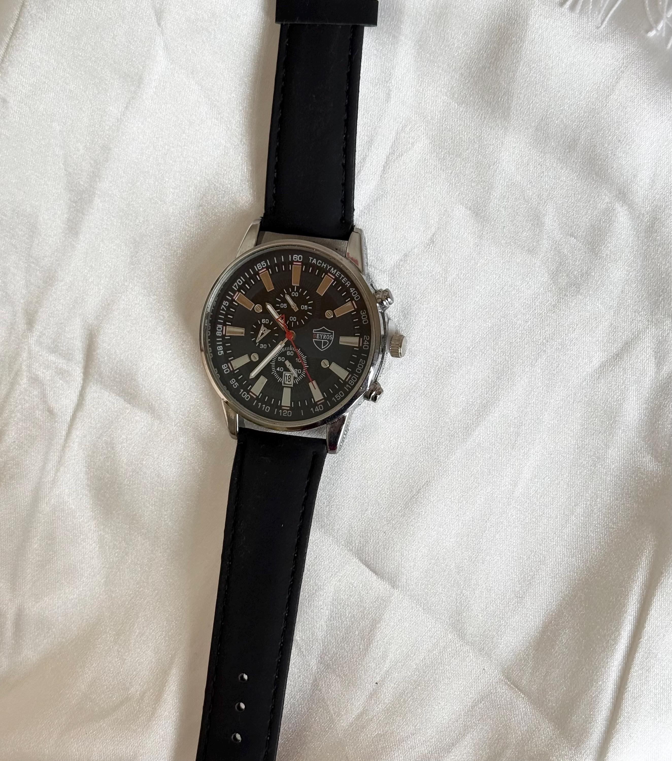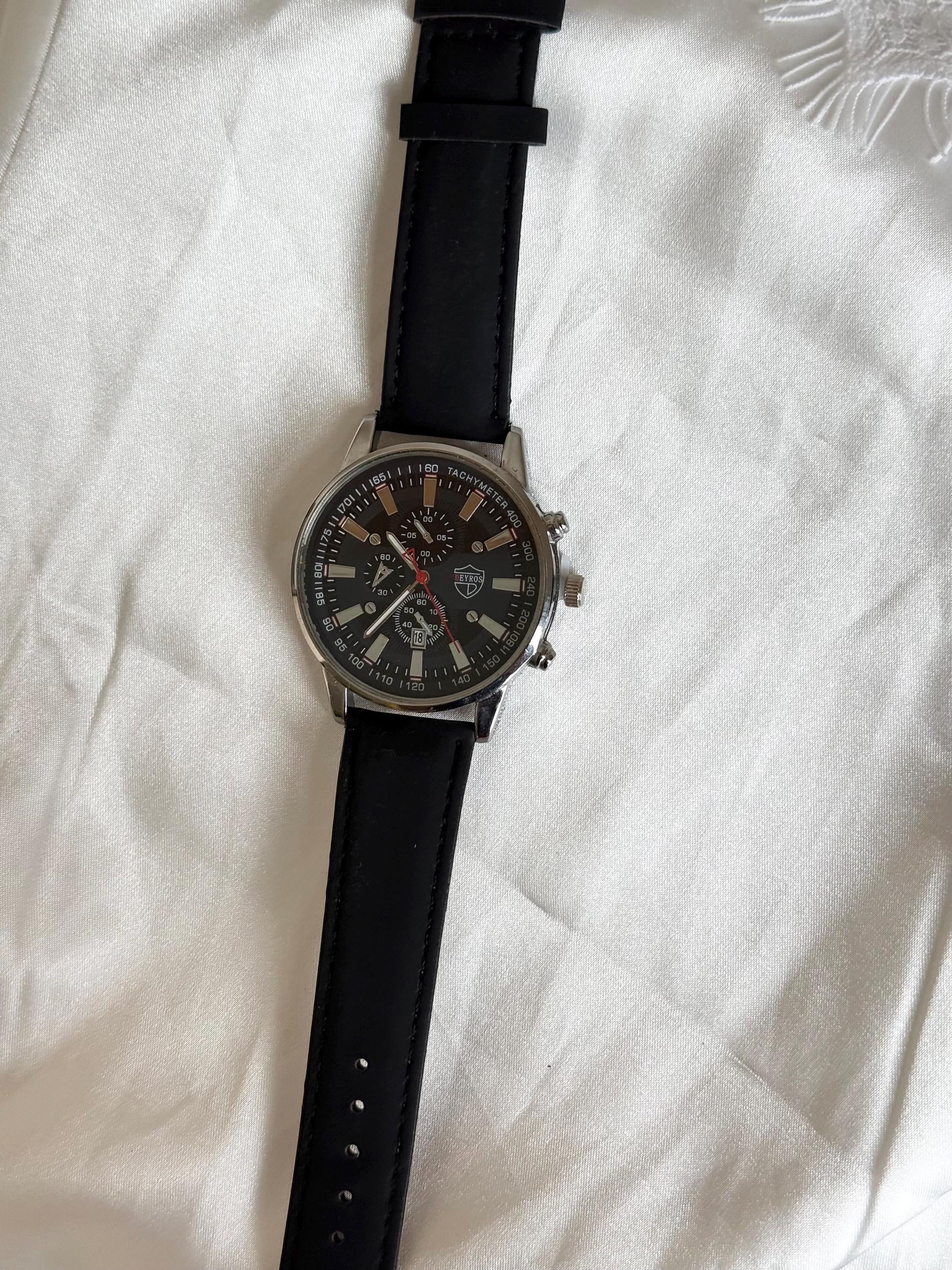 ✔ Quartz movement ✔ Silver tone alloy case ✔ Black dial ✔ Soft black suede strap ✔ Adjustable buckle closure ✔ Decorative subdials (non-functional) ✔ Comfortable everyday wear