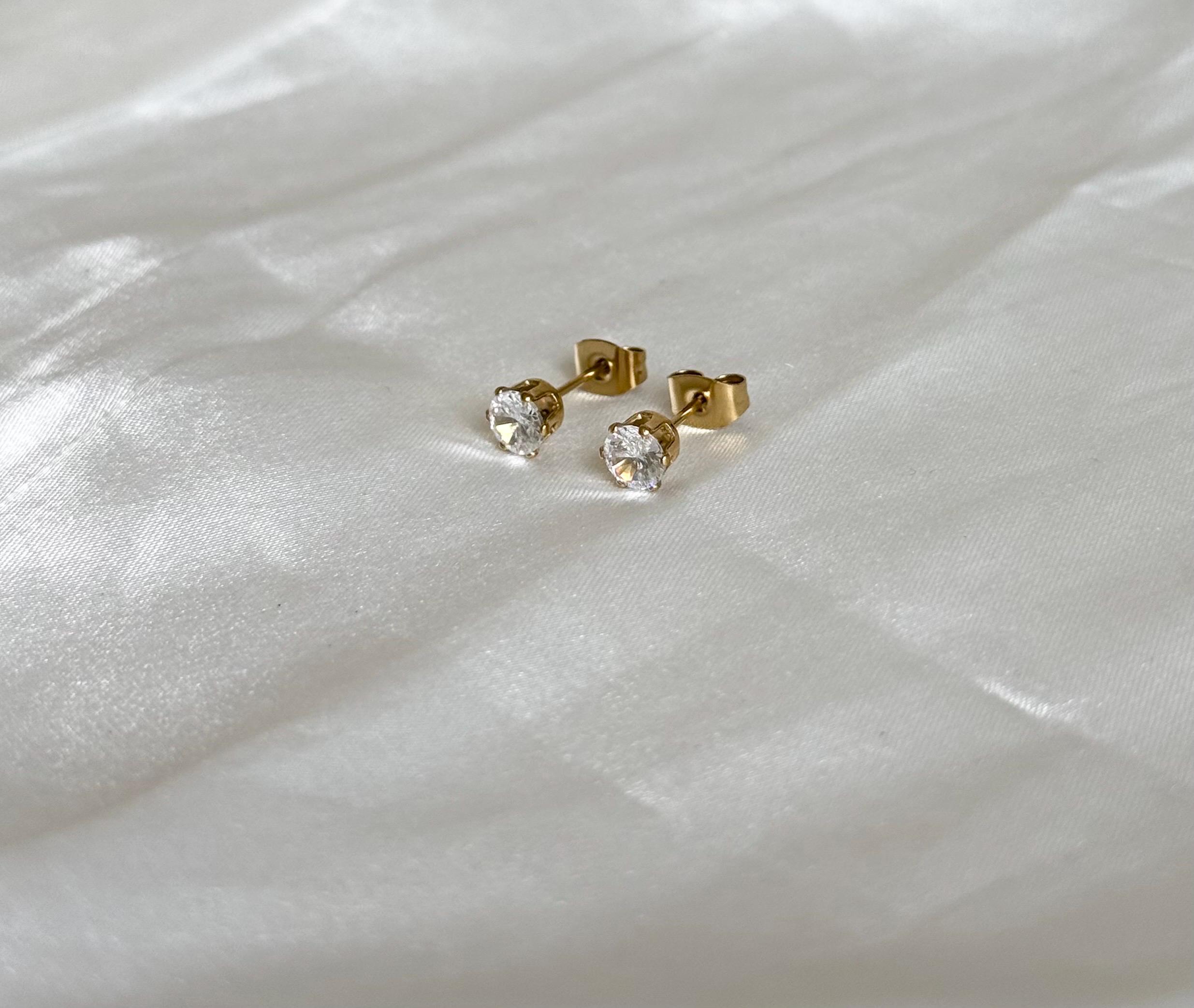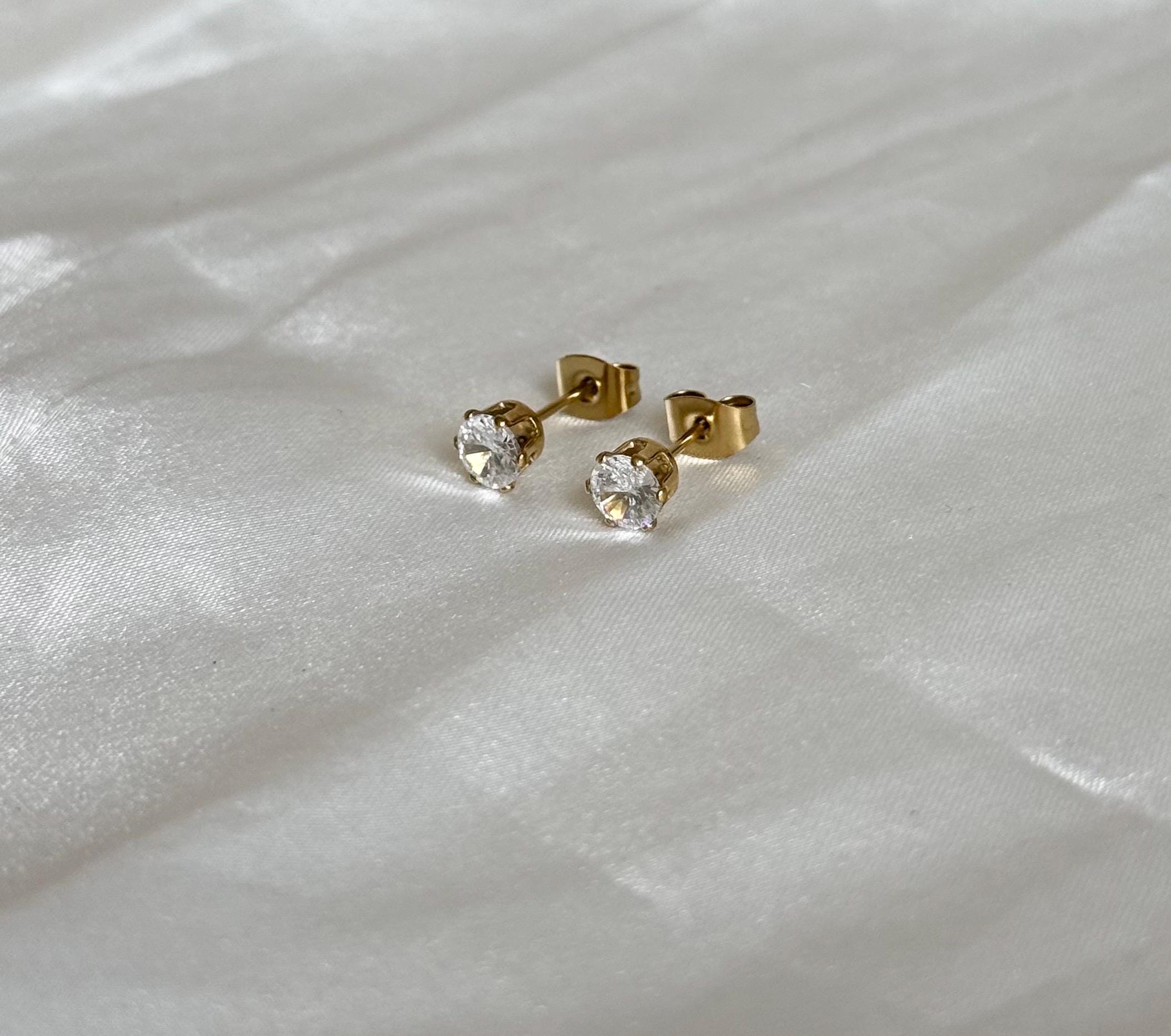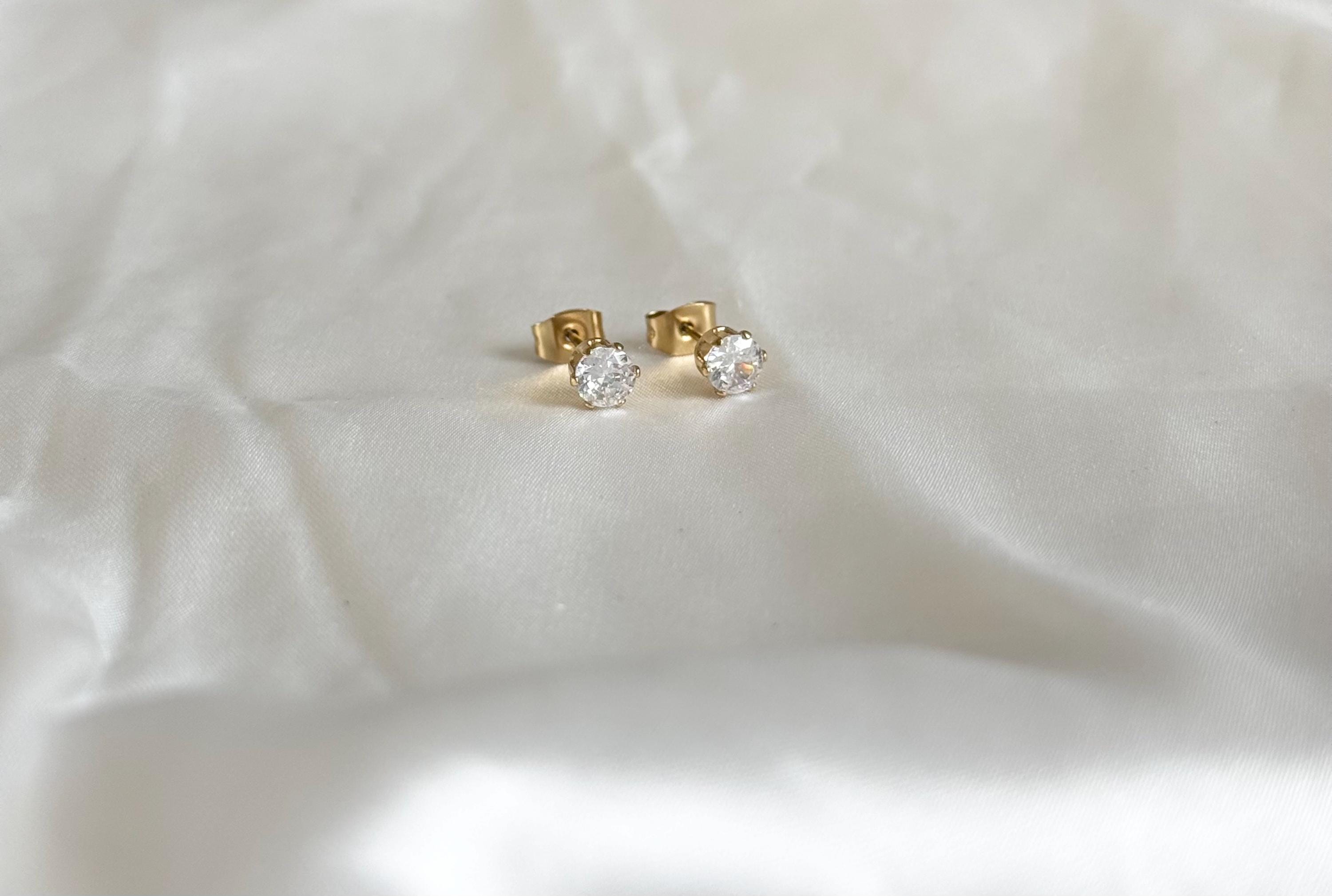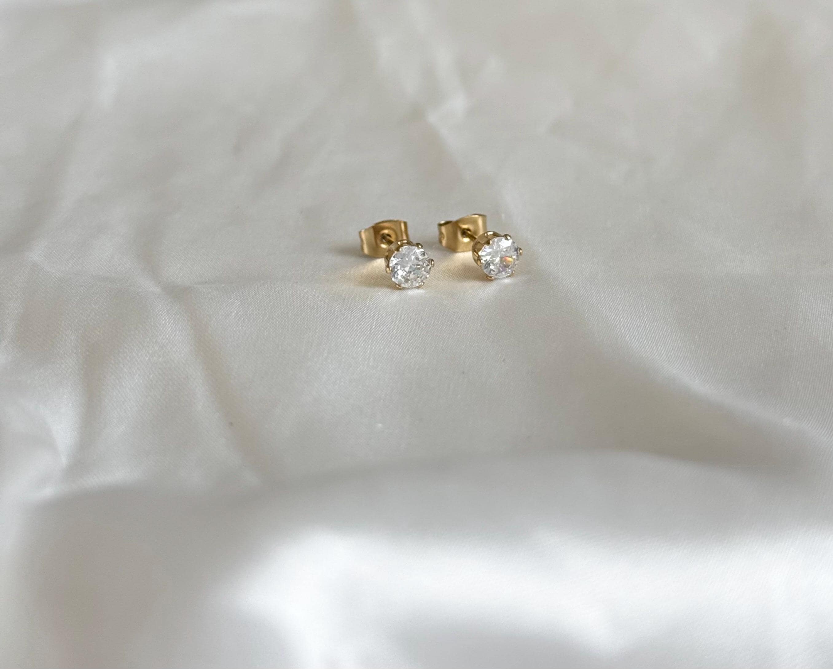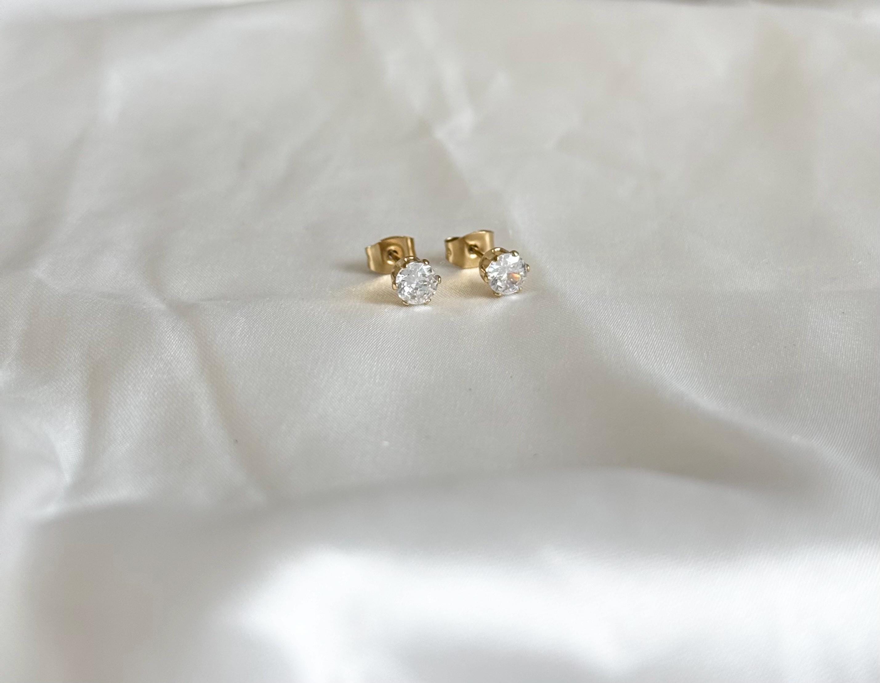 Add a touch of understated elegance to your everyday jewelry collection with these beautiful gold stud earrings featuring dazzling cubic zirconia stones. Crafted with a stainless steel base and finished in a warm gold tone, these minimalist round brilliant cut studs offer timeless sophistication in a small, dainty design perfect for daily wear or special occasions.