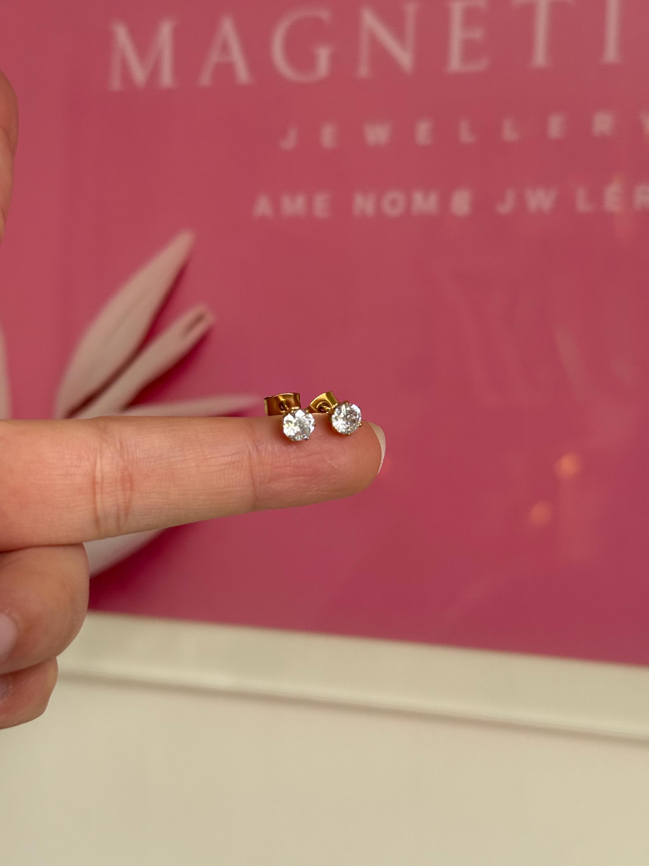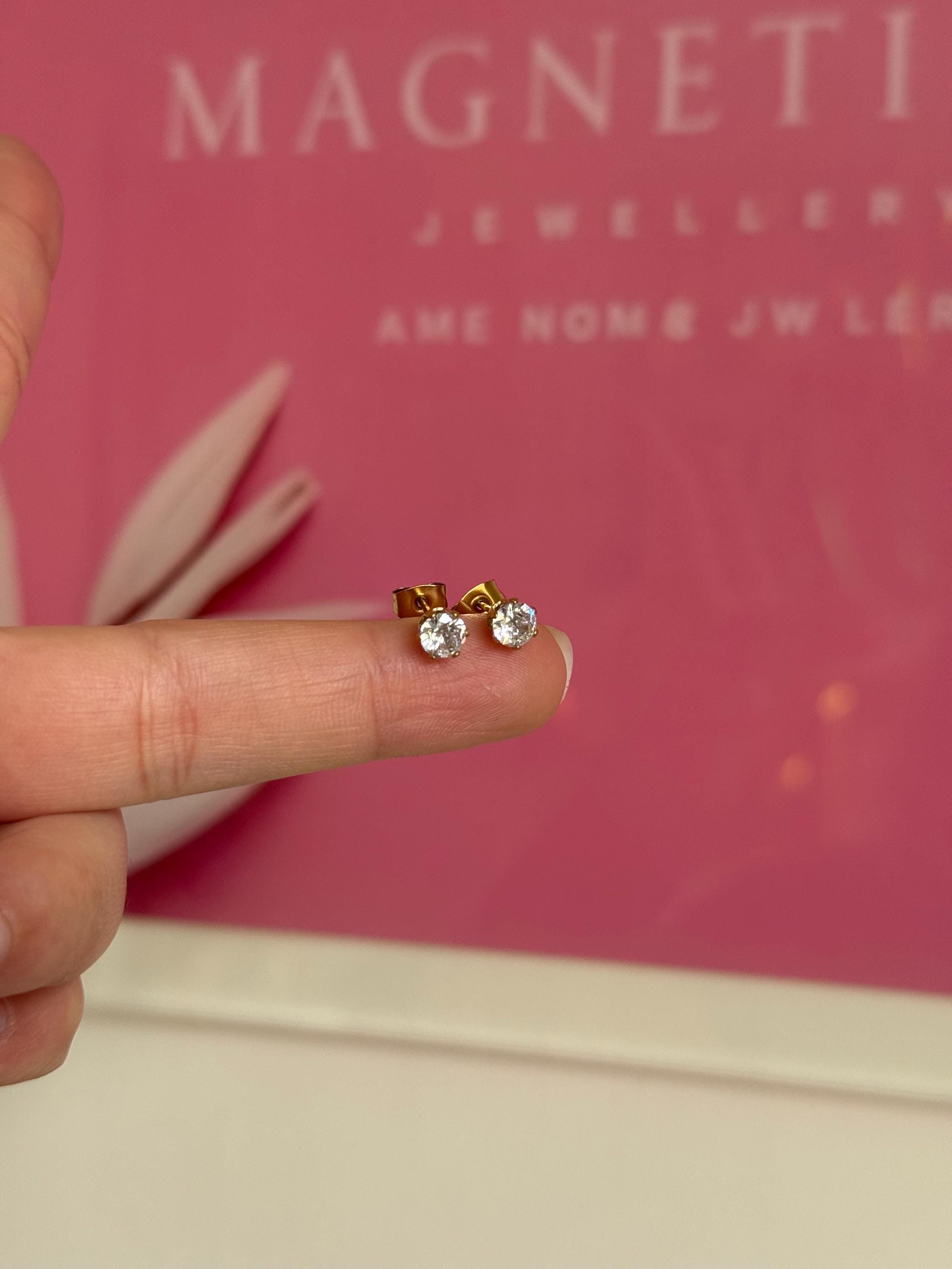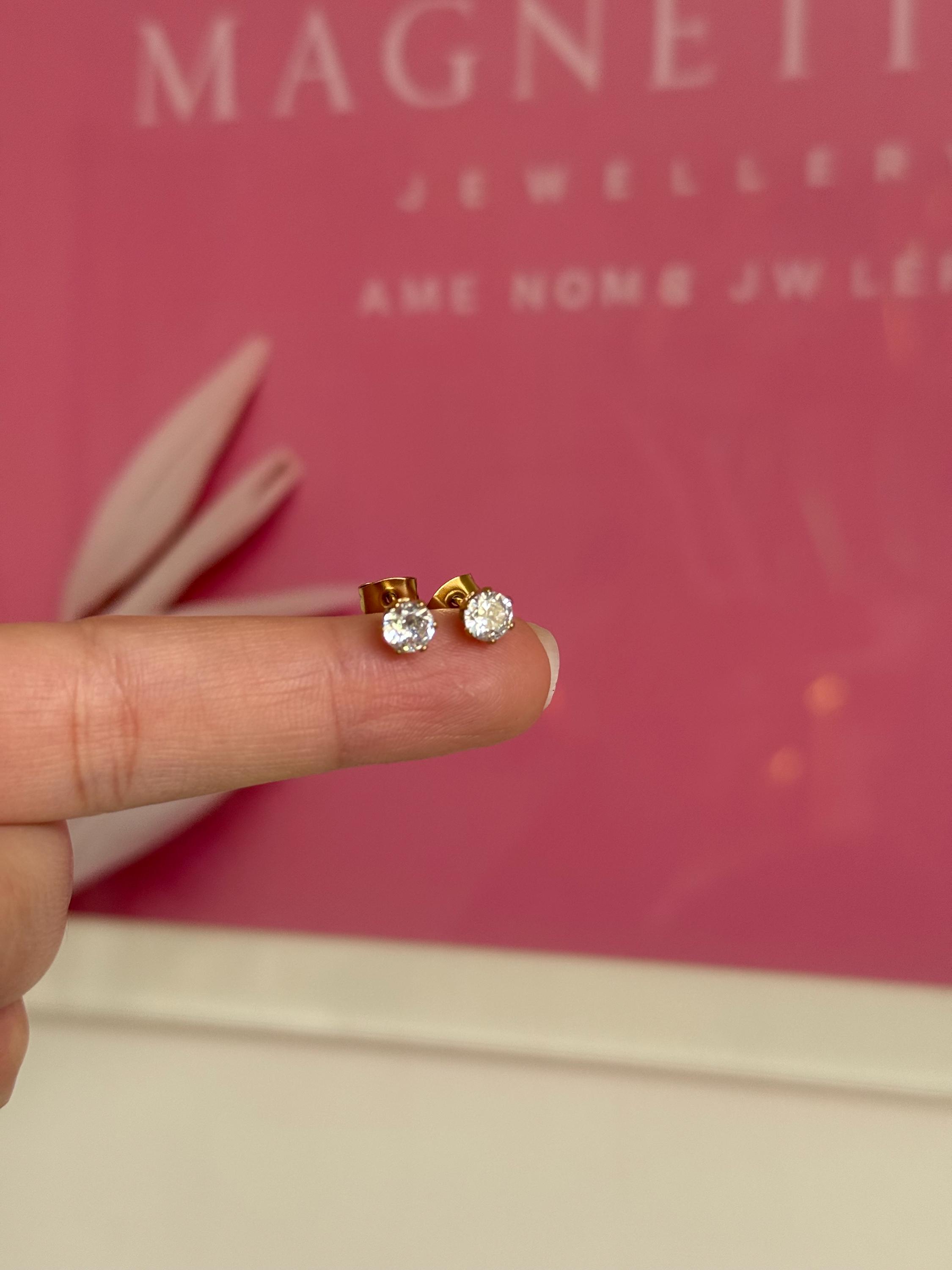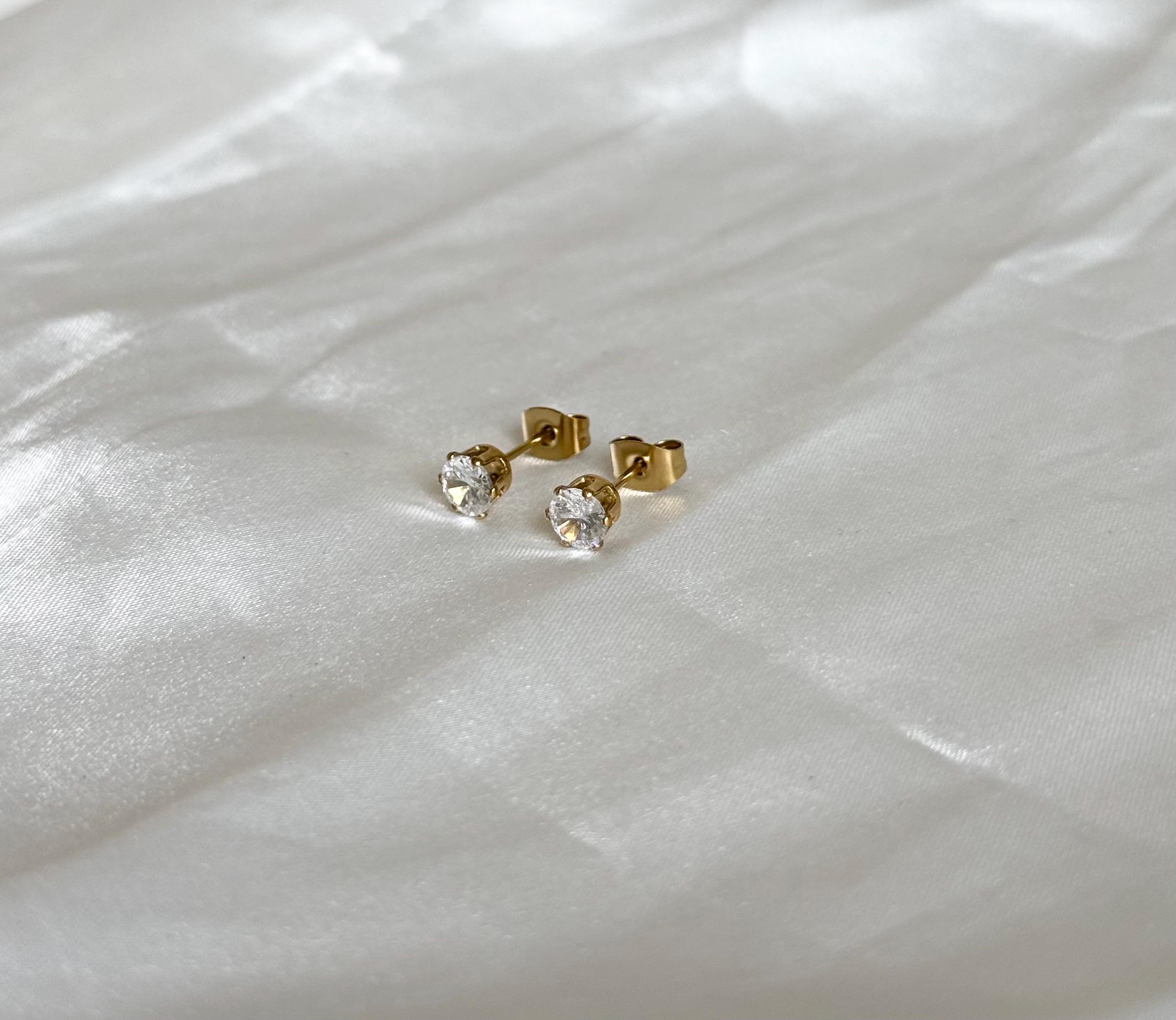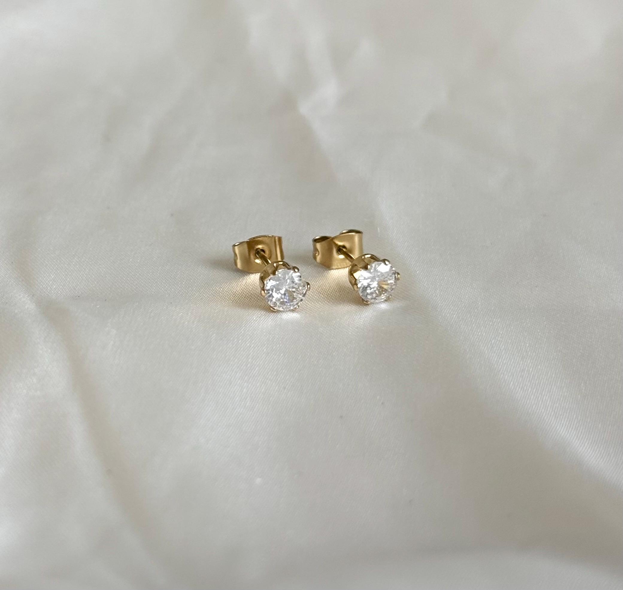 Add a touch of understated elegance to your everyday jewelry collection with these beautiful gold stud earrings featuring dazzling cubic zirconia stones. Crafted with a stainless steel base and finished in a warm gold tone, these minimalist round brilliant cut studs offer timeless sophistication in a small, dainty design perfect for daily wear or special occasions.
