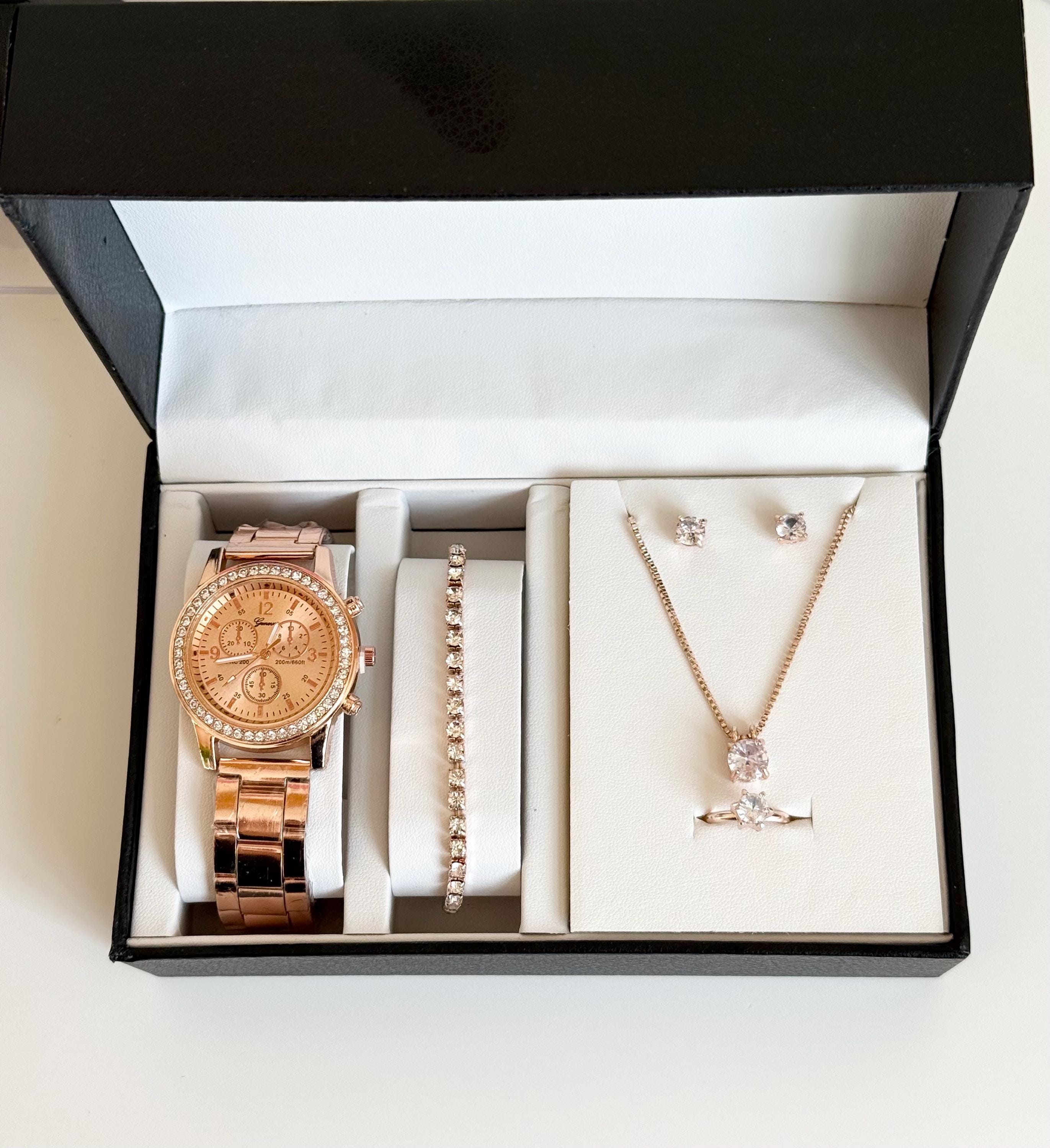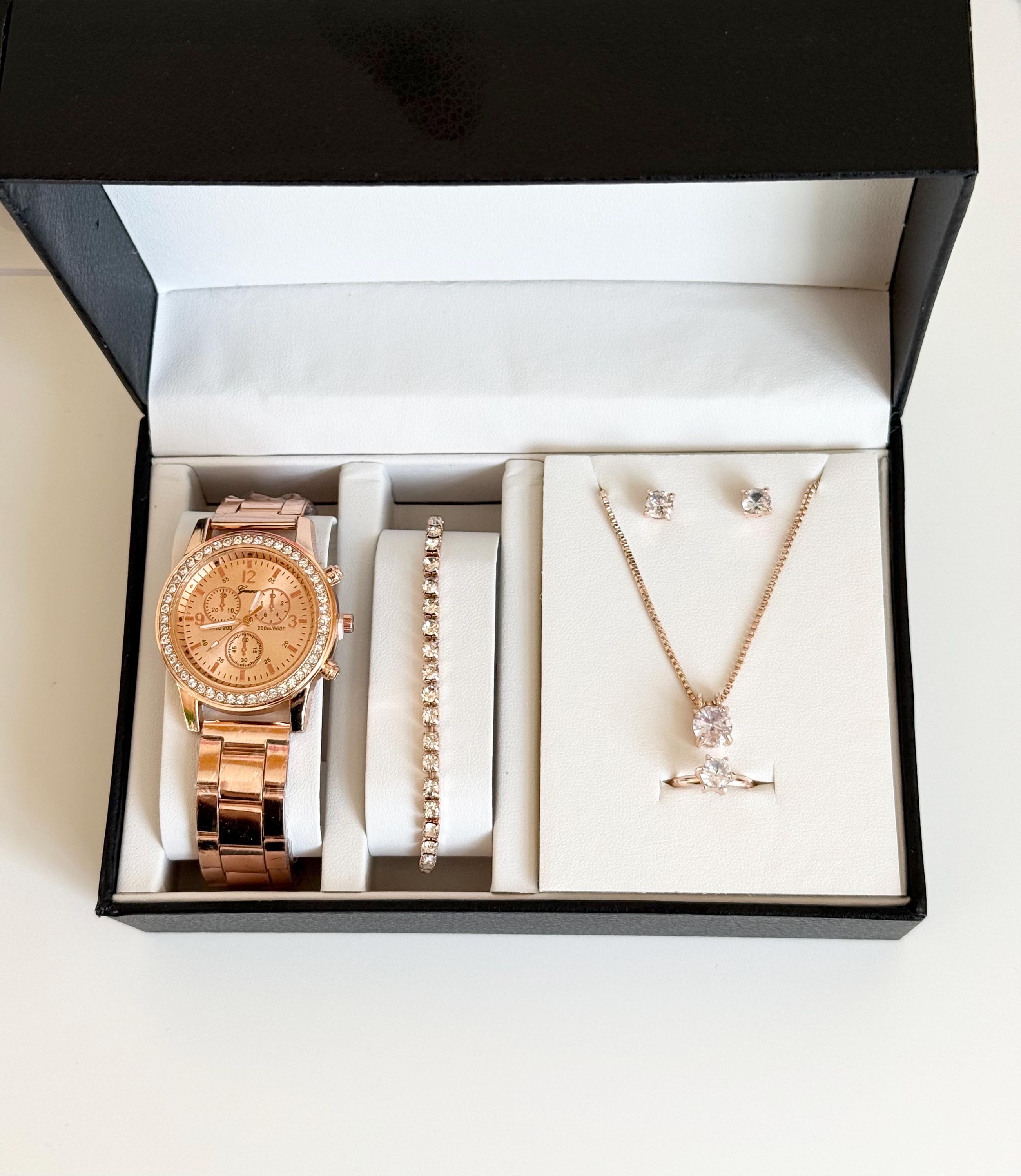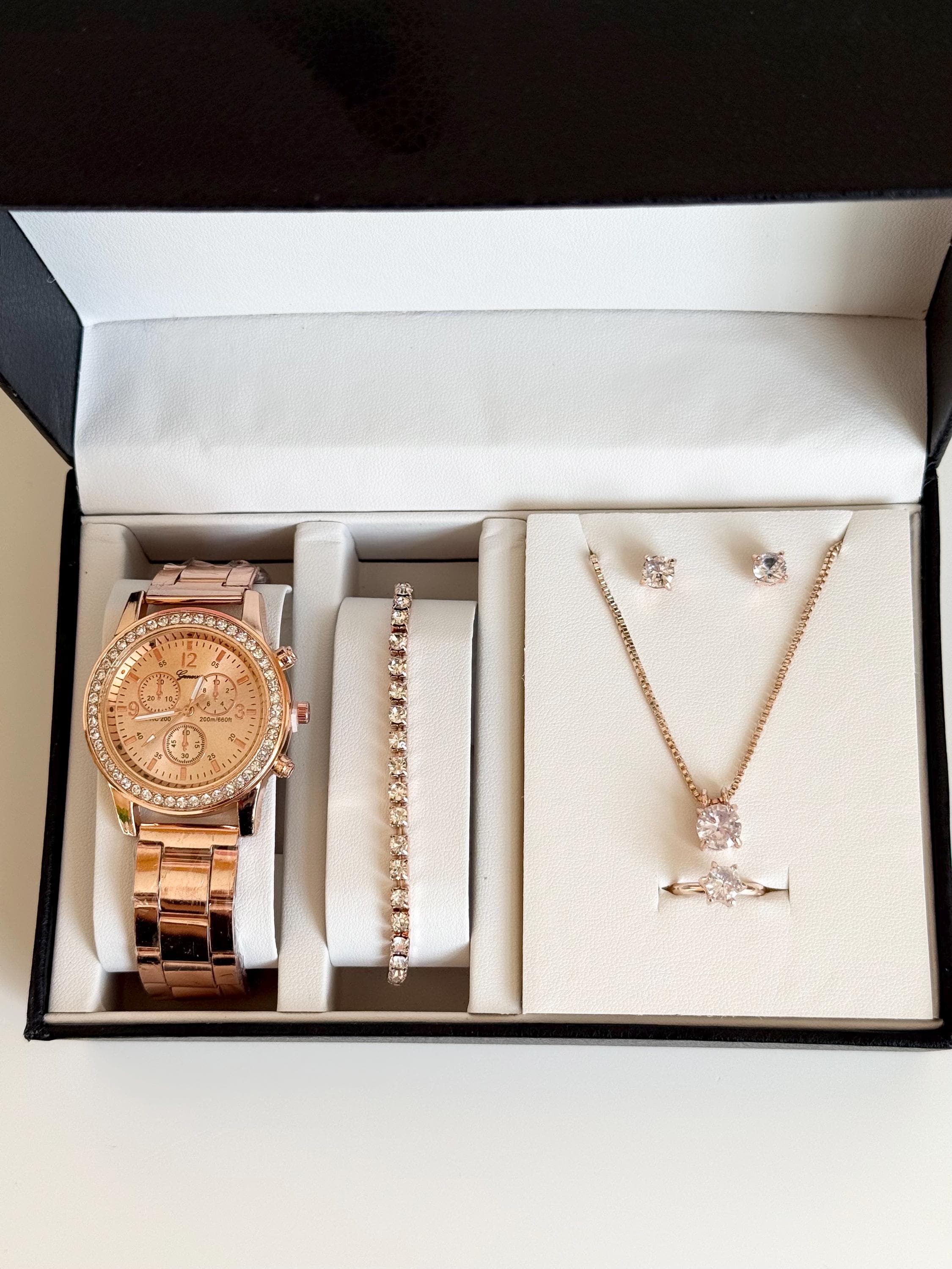 Key features: - Rose gold crystal watch with a chic and luxurious design - Elegant tennis bracelet with sparkling crystals - Delicate crystal pendant necklace on a fine chain - Matching crystal stud earrings for a polished look - Solitaire crystal ring that adds a touch of glamour - Presented in an elegant gift box, ready for gifting