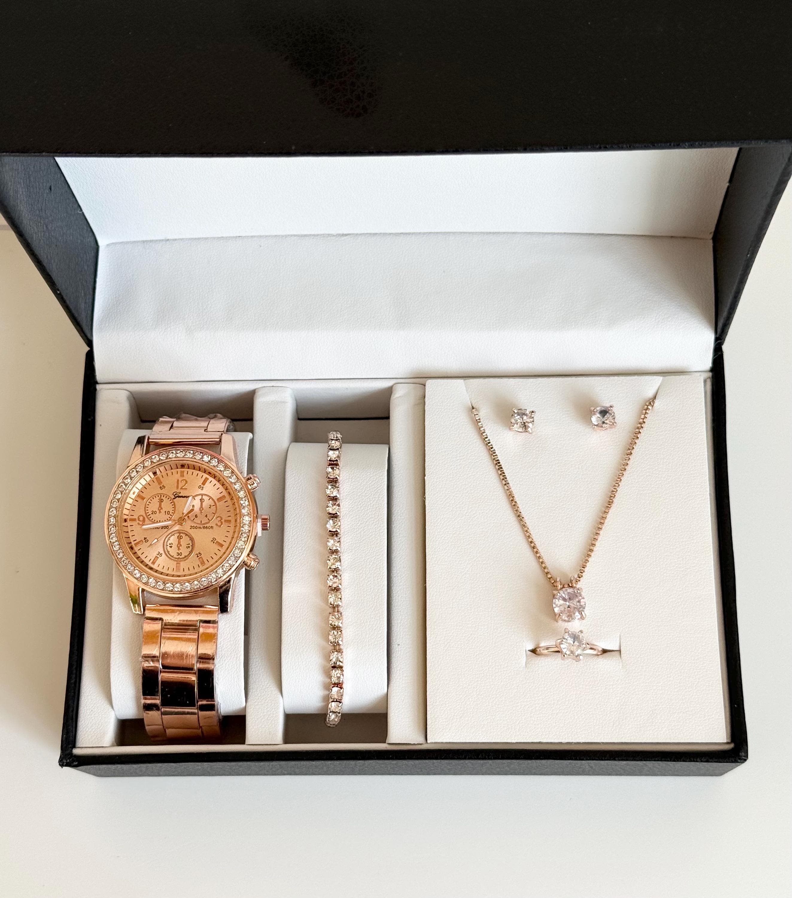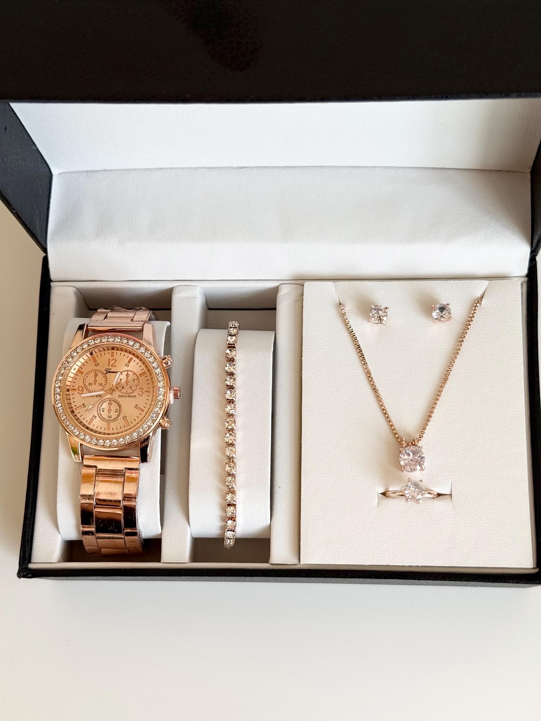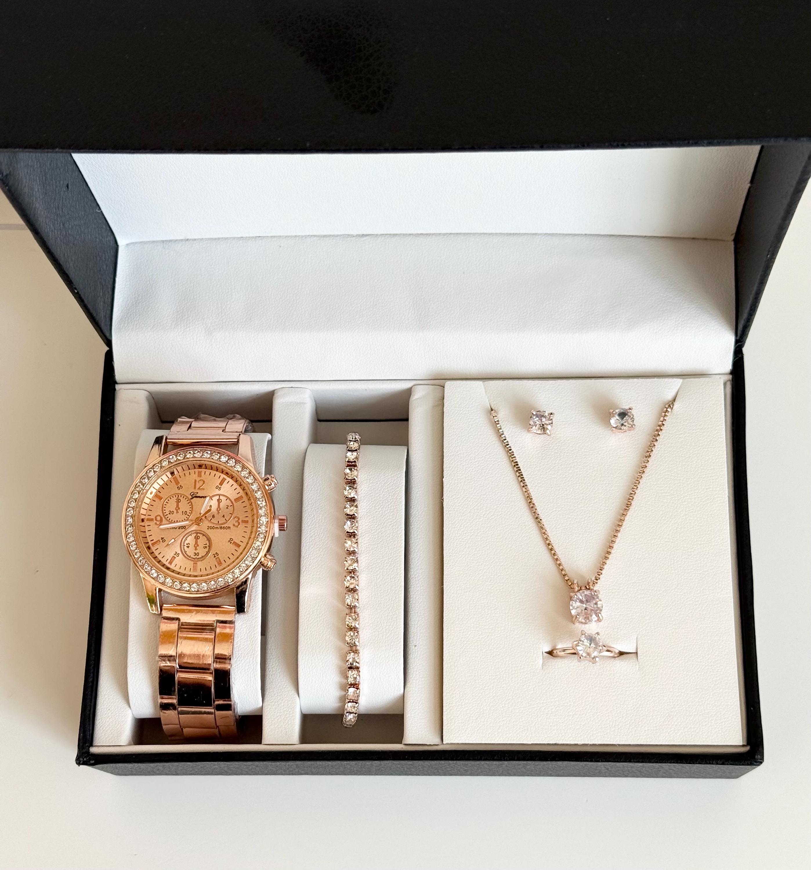 Key features: - Rose gold crystal watch with a chic and luxurious design - Elegant tennis bracelet with sparkling crystals - Delicate crystal pendant necklace on a fine chain - Matching crystal stud earrings for a polished look - Solitaire crystal ring that adds a touch of glamour - Presented in an elegant gift box, ready for gifting