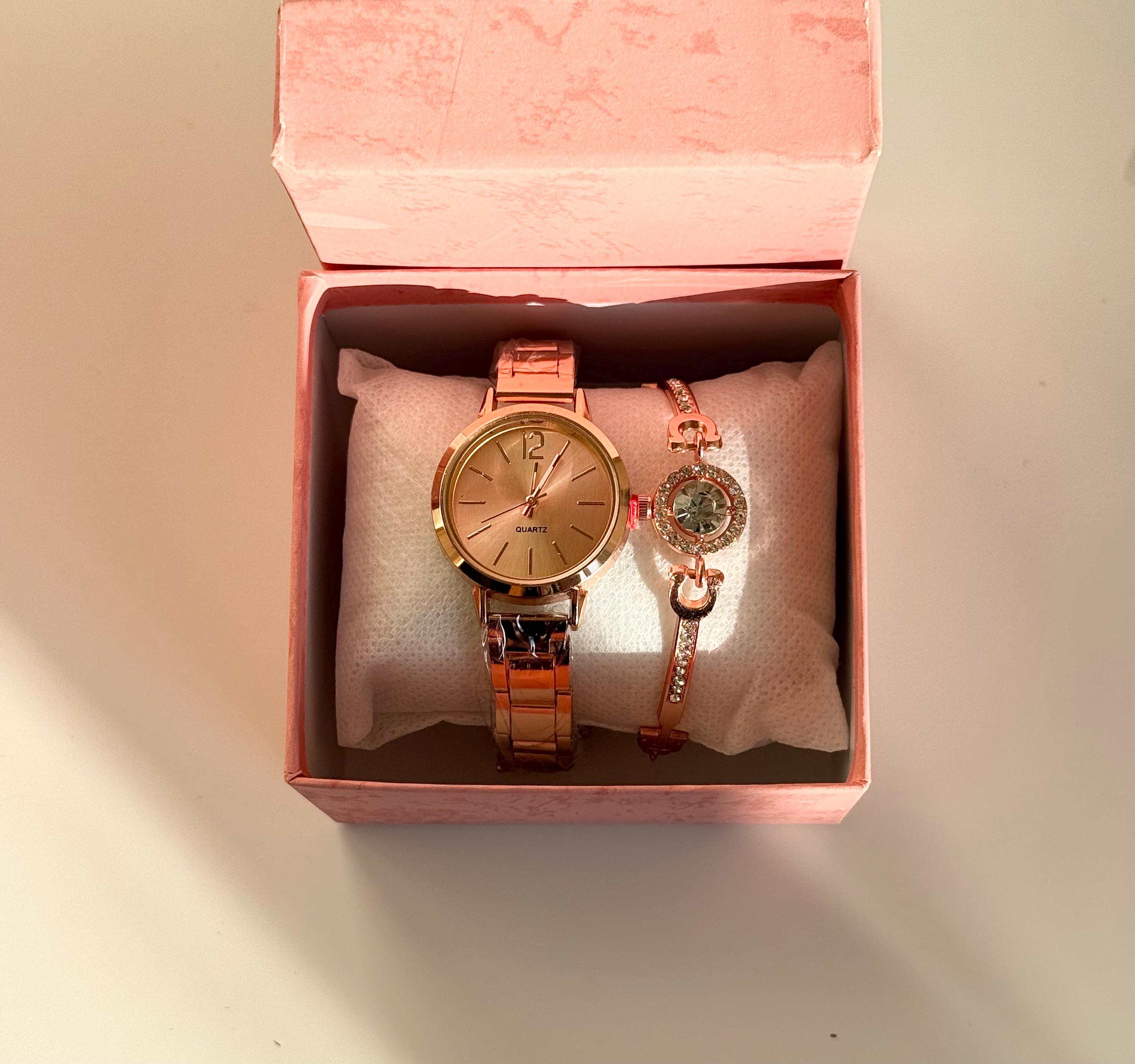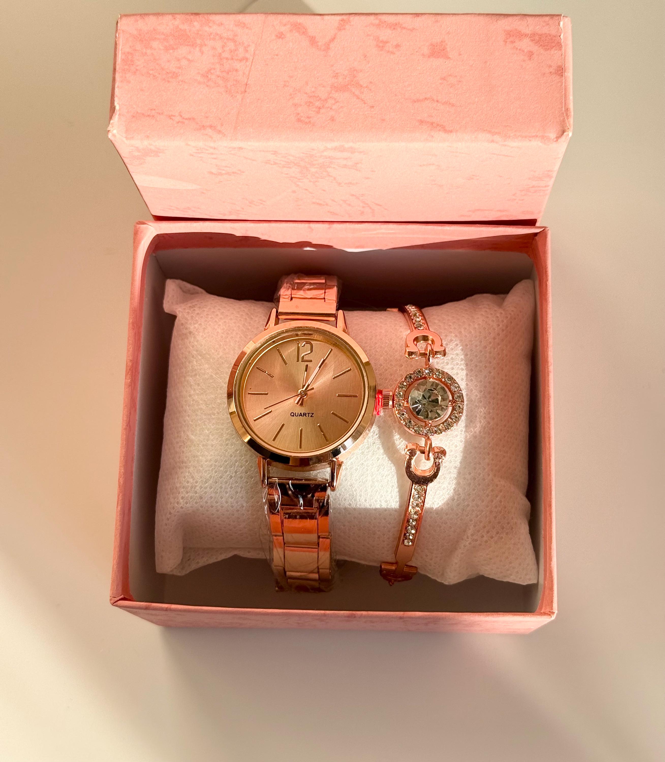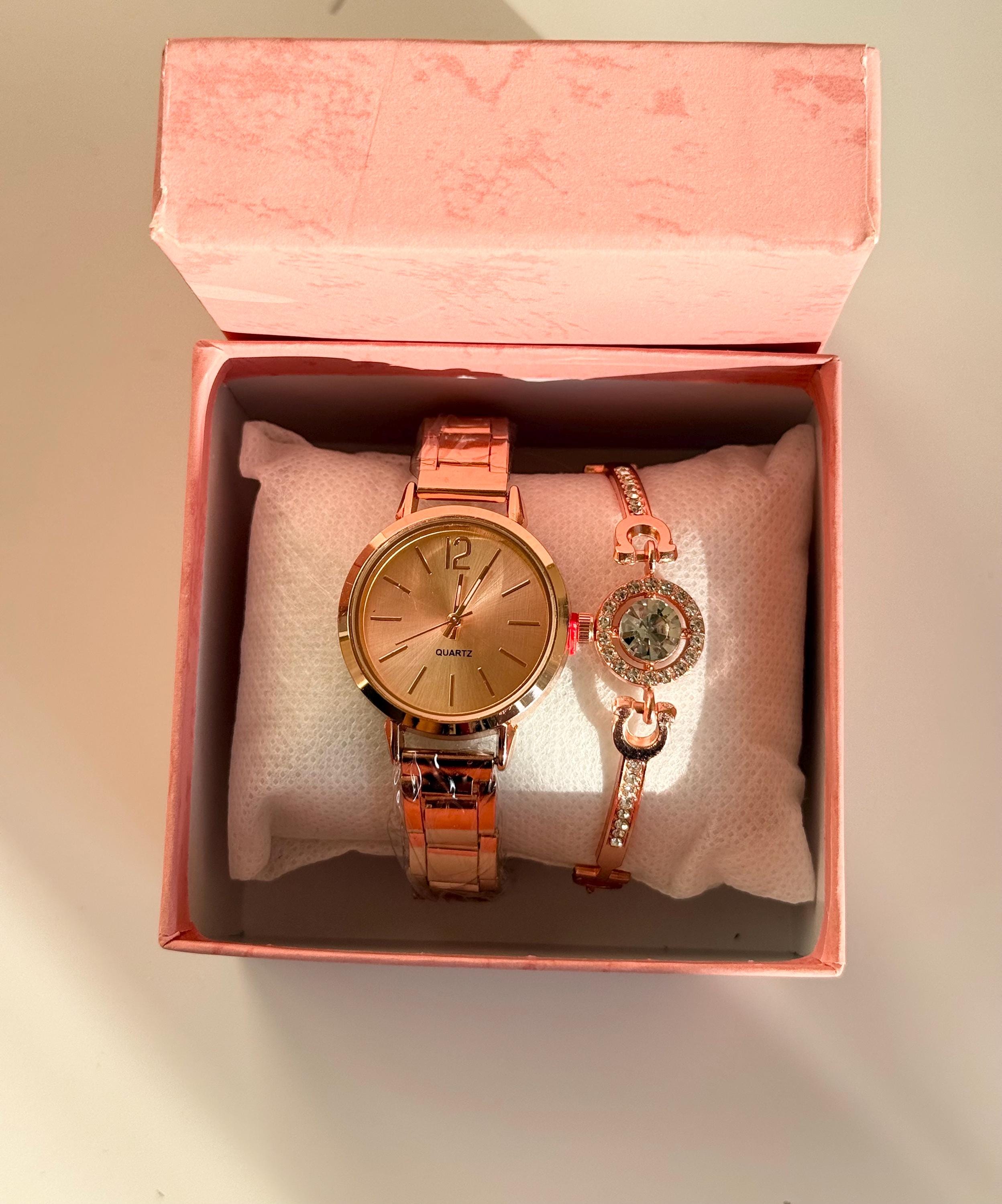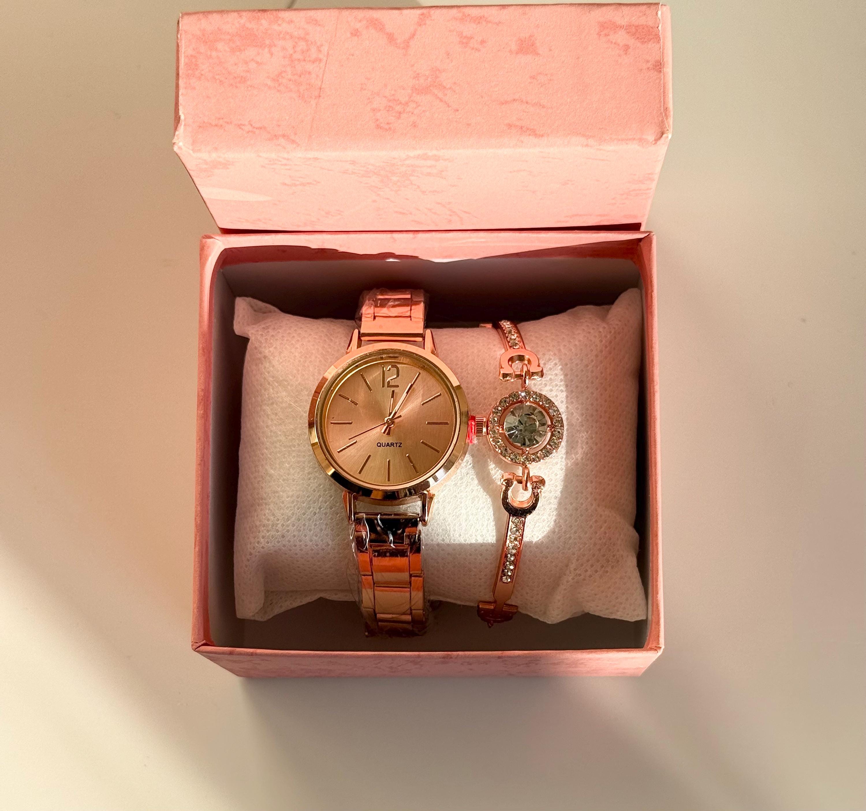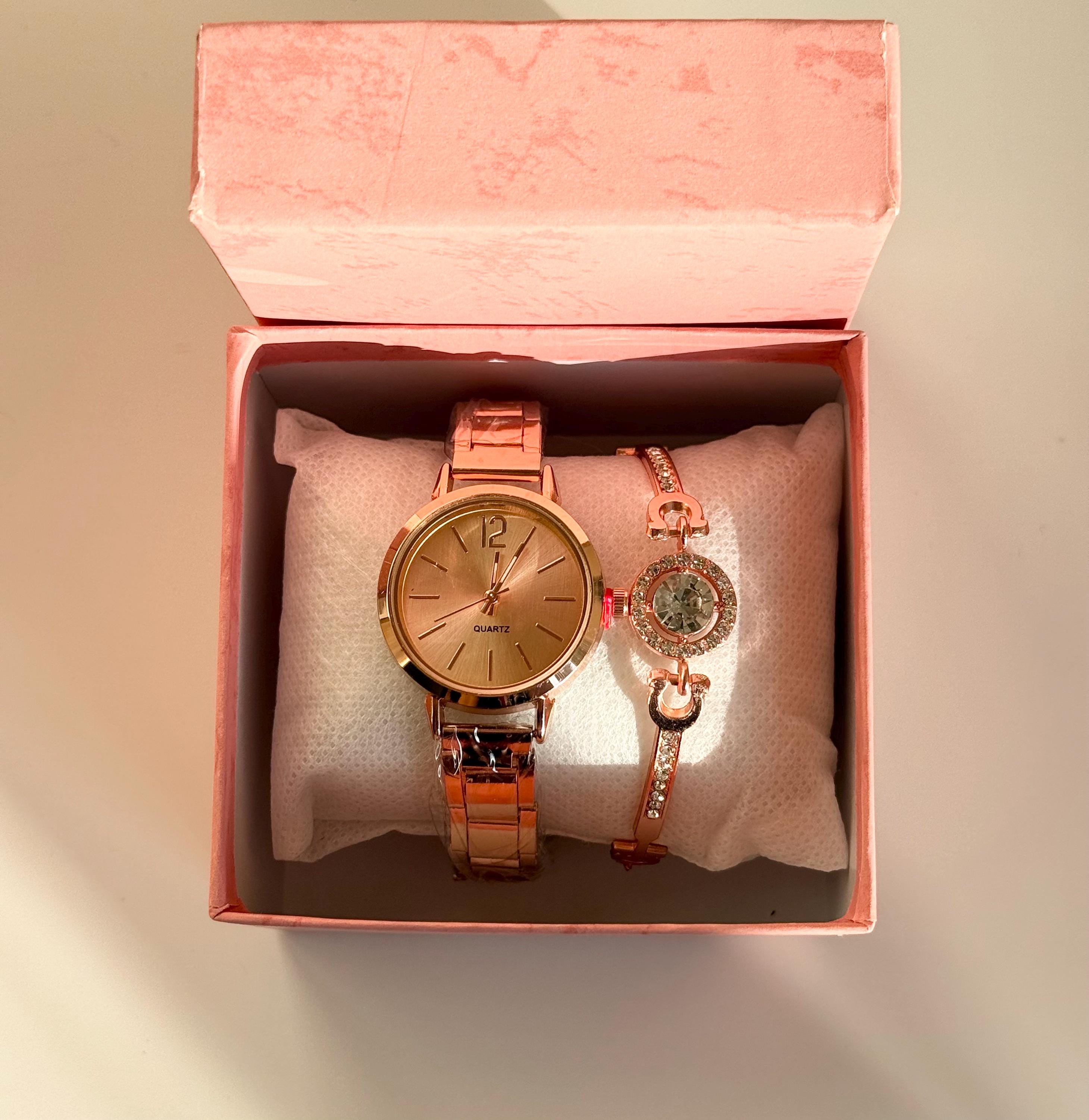 Rose Gold Watch and Bracelet Set for Her Elegant Crystal Gift Set Birthday Anniversary Women’s Gift Box✨ An elegant rose gold watch and matching crystal bracelet set presented in a beautiful pink gift box.